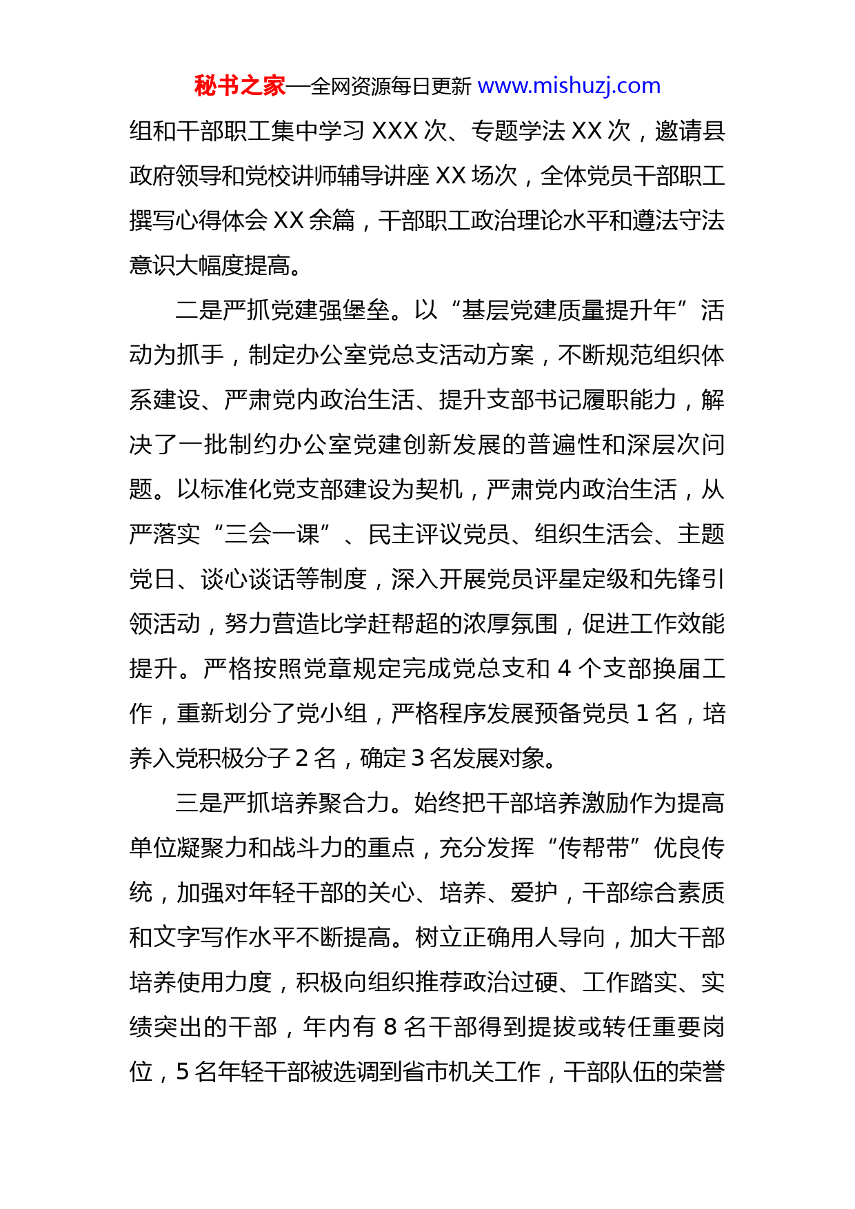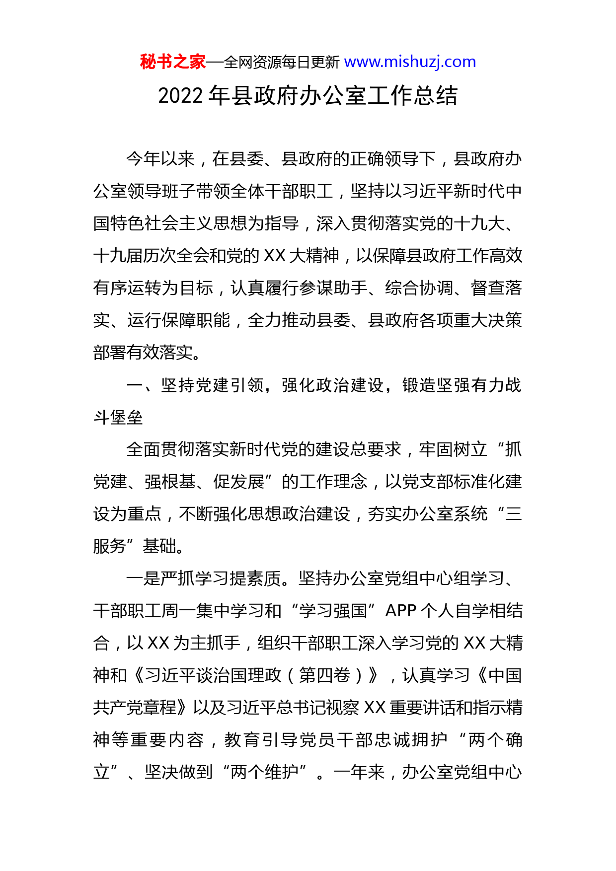 秘书之家—全网资源每日更新www.mishuzj.com2022年县政府办公室工作总结今年以来,在县委、县政府的正确领导下,县政府办公室领导班子带领全体干部职工,坚持以习近平新时代中国特色社会主义思想为指导,深入贯彻落实党的十九大、十九届历次全会和党的XX大精神,以保障县政府工作高效有序运转为目标,认真履行参谋助手、综合协调、督查落实、运行保障职能,全力推动县委、县政府各项重大决策部署有效落实。一、坚持党建引领,强化政治建设,锻造坚强有力战斗堡垒全面贯彻落实新时代党的建设总要求,牢固树立“抓党建、强根基、促发展”的工作理念,以党支部标准化建设为重点,不断强化思想政治建设,夯实办公室系统“三服务”基础。一是严抓学习提素质。坚持办公室党组中心组学习、干部职工周一集中学习和“学习强国”APP个人自学相结合,以XX为主抓手,组织干部职工深入学习党的XX大精神和《习近平谈治国理政(第四卷)》,认真学习《中国共产党章程》以及习近平总书记视察XX重要讲话和指示精神等重要内容,教育引导党员干部忠诚拥护“两个确立”、坚决做到“两个维护”。一年来,办公室党组中心秘书之家—全网资源每日更新www.mishuzj.com组和干部职工集中学习XXX次、专题学法XX次,邀请县政府领导和党校讲师辅导讲座XX场次,全体党员干部职工撰写心得体会XX余篇,干部职工政治理论水平和遵法守法意识大幅度提高。二是严抓党建强堡垒。以“基层党建质量提升年”活动为抓手,制定办公室党总支活动方案,不断规范组织体系建设、严肃党内政治生活、提升支部书记履职能力,解决了一批制约办公室党建创新发展的普遍性和深层次问题。以标准化党支部建设为契机,严肃党内政治生活,从严落实“三会一课”、民主评议党员、组织生活会、主题党日、谈心谈话等制度,深入开展党员评星定级和先锋引领活动,努力营造比学赶帮超的浓厚氛围,促进工作效能提升。严格按照党章规定完成党总支和4个支部换届工作,重新划分了党小组,严格程序发展预备党员1名,培养入党积极分子2名,确定3名发展对象。三是严抓培养聚合力。始终把干部培养激励作为提高单位凝聚力和战斗力的重点,充分发挥“传帮带”优良传统,加强对年轻干部的关心、培养、爱护,干部综合素质和文字写作水平不断提高。树立正确用人导向,加大干部培养使用力度,积极向组织推荐政治过硬、工作踏实、实绩突出的干部,年内有8名干部得到提拔或转任重要岗位,5名年轻干部被选调到省市机关工作,干部队伍的荣誉秘书之家—全网资源每日更新www.mishuzj.com感、凝聚力进一步增强。积极组织82名在职党员到社区报到,党员社区报到率达到100%。同时,认真落实意识形态责任制,年初与各股室和所属单位签订责任书,每季度开展分析研判,依托市民服务热线、政务督查系统和政府网站,对重大事件、重要情况、重要社情民意中的苗头性倾向性的问题,有针对性地进行科学引导,先后回复处置网络舆情600余件,有力维护了意识形态领域安全稳定。二、认真履职尽责,主动担当作为,发挥高效务实参谋作用(一)着力提升以文辅政水平。坚持把发挥参谋助手作用作为首要职责,以“参在点子上、谋在关键处”为目标,努力提高以文辅政能力水平。一是高质量起草文稿。牢固树立精品意识和效率意识,吃透上情、把握下情、了解外情,力求起草的文稿紧随上级政策、贴近领导思路、符合群众意愿。今年,立足加快项目建设、发展戈壁生态农业、壮大新能源产业、提升城市建管水平、全面保障改善民生等方面,深入调研,认真谋划,撰写领导讲话、总结汇报、督查通报、调研报告和上传下达的请示报告、通知、意见等文字材料2000余篇,为领导科学决策提供了有力参考。二是高效率运行公文。制定印发《进一步规范办文办会相关工作的实施细则》,严格规范行政公文审核流程,严控发文数量和发放范围,严守公文保密纪律,规范秘书之家—全网资源每日更新www.mishuzj.com管理各类文档。一年来,共收办处理各类文电XX件,制发县政府和办公室各类公文XX件,承办上级批示转办件XX件,有效保障了上级重大决策、重大事项全面落实。三是高水平编报信息。落实全员办信息机制,拓展信息来源,提高信息质量,着力在典型性、综合性、创新性、时效性上下功夫,全方位、多角度为政府决策提供信息服务,充分展示经济社会发展成效亮点,采编上报信息XX期,被省市采用156期。(二)全力保障政府高效运转。牢固树立“办公室工作无小事”的观念,严格按照“客观公正、实事求是”的办事原则,精心搞好协调联络、会议组织、后勤接待、督查督办等工作,确保县政府各项工作规范高效运行。一是规范务实办会。对各类会议实行计划管理,从细节着手,明确责任,分工协作,每次会议都做到提前介入、充分对接、制定预案,会中及时做好会务联络和记录,会后及时起草印发会议纪要和任务责任清单,先后精简高效承办了XX次政府全体会、XX次政府常务会、XX次政府党组会、7次县长办公会以及经济工作会、省市电视电话会等各类会议200余场次。二是周密协调办事。重大工作及时主动向领导请示汇报,注重加强纵向和横向联系沟通,保证了各项重大活动精心组织、衔接顺畅、有序推进。完成了政府领导参加的XX场次调研活动组织协调,做
