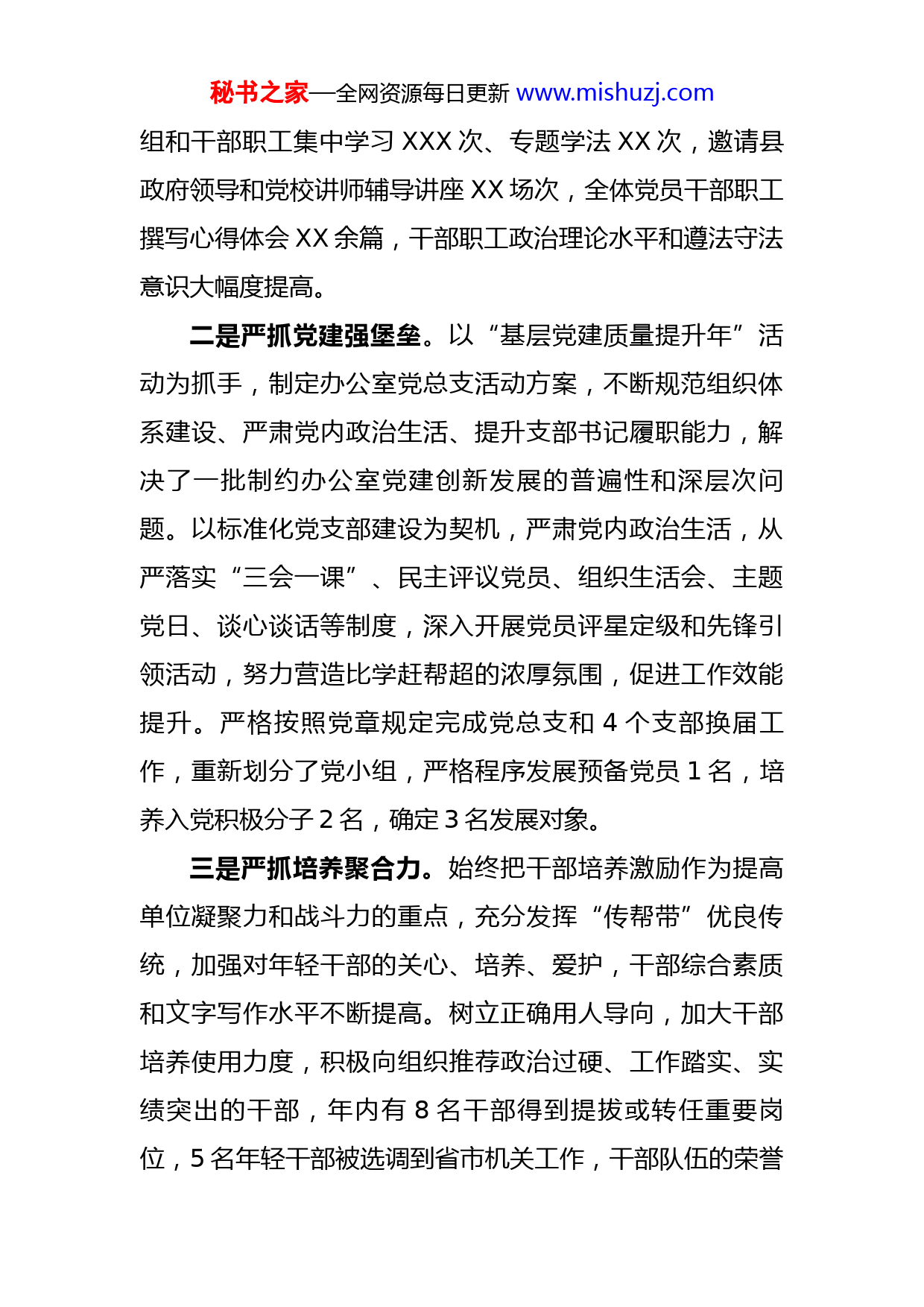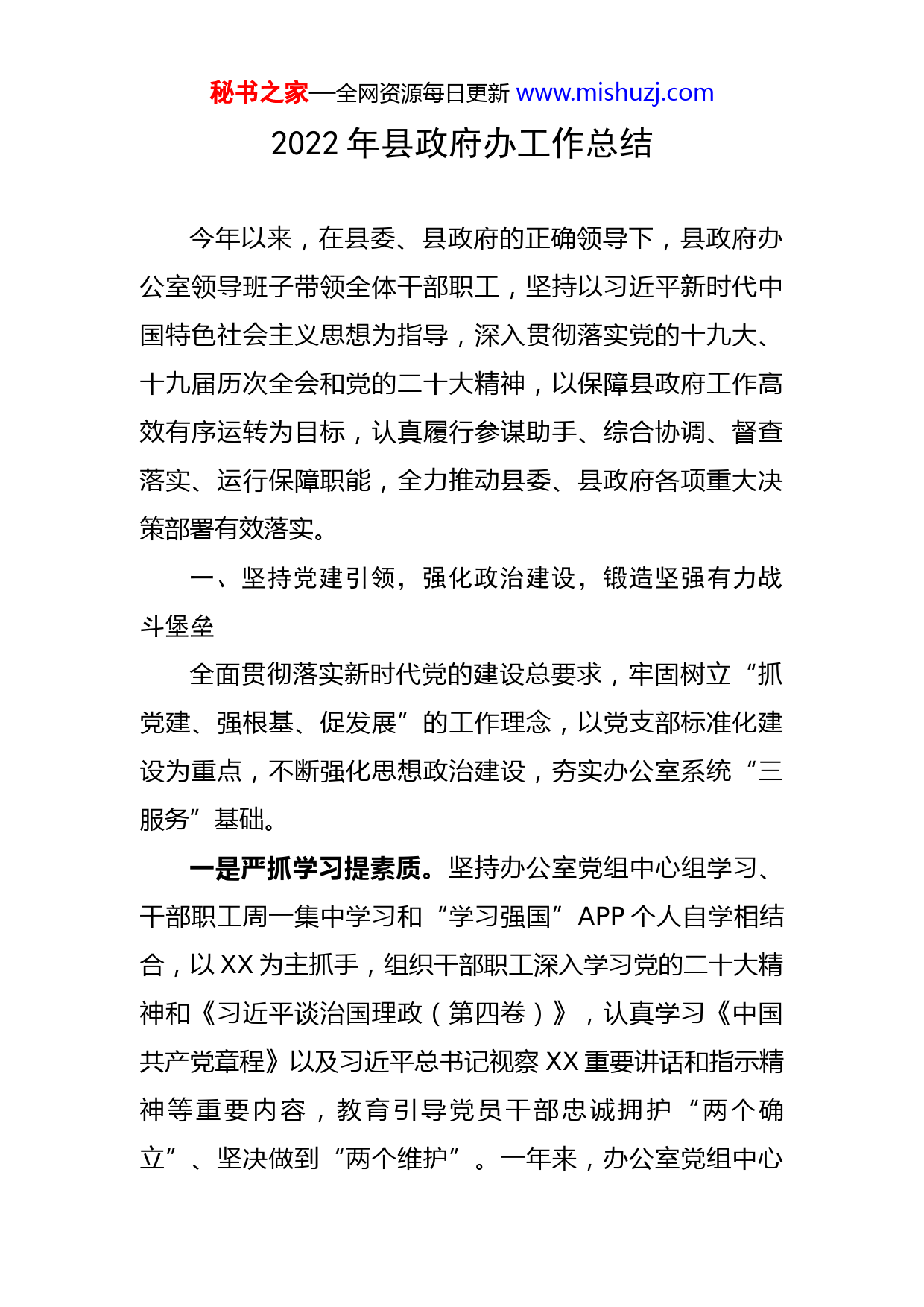 秘书之家—全网资源每日更新www.mishuzj.com2022年县政府办工作总结今年以来,在县委、县政府的正确领导下,县政府办公室领导班子带领全体干部职工,坚持以习近平新时代中国特色社会主义思想为指导,深入贯彻落实党的十九大、十九届历次全会和党的二十大精神,以保障县政府工作高效有序运转为目标,认真履行参谋助手、综合协调、督查落实、运行保障职能,全力推动县委、县政府各项重大决策部署有效落实。一、坚持党建引领,强化政治建设,锻造坚强有力战斗堡垒全面贯彻落实新时代党的建设总要求,牢固树立“抓党建、强根基、促发展”的工作理念,以党支部标准化建设为重点,不断强化思想政治建设,夯实办公室系统“三服务”基础。一是严抓学习提素质。坚持办公室党组中心组学习、干部职工周一集中学习和“学习强国”APP个人自学相结合,以XX为主抓手,组织干部职工深入学习党的二十大精神和《习近平谈治国理政(第四卷)》,认真学习《中国共产党章程》以及习近平总书记视察XX重要讲话和指示精神等重要内容,教育引导党员干部忠诚拥护“两个确立”、坚决做到“两个维护”。一年来,办公室党组中心秘书之家—全网资源每日更新www.mishuzj.com组和干部职工集中学习XXX次、专题学法XX次,邀请县政府领导和党校讲师辅导讲座XX场次,全体党员干部职工撰写心得体会XX余篇,干部职工政治理论水平和遵法守法意识大幅度提高。二是严抓党建强堡垒。以“基层党建质量提升年”活动为抓手,制定办公室党总支活动方案,不断规范组织体系建设、严肃党内政治生活、提升支部书记履职能力,解决了一批制约办公室党建创新发展的普遍性和深层次问题。以标准化党支部建设为契机,严肃党内政治生活,从严落实“三会一课”、民主评议党员、组织生活会、主题党日、谈心谈话等制度,深入开展党员评星定级和先锋引领活动,努力营造比学赶帮超的浓厚氛围,促进工作效能提升。严格按照党章规定完成党总支和4个支部换届工作,重新划分了党小组,严格程序发展预备党员1名,培养入党积极分子2名,确定3名发展对象。三是严抓培养聚合力。始终把干部培养激励作为提高单位凝聚力和战斗力的重点,充分发挥“传帮带”优良传统,加强对年轻干部的关心、培养、爱护,干部综合素质和文字写作水平不断提高。树立正确用人导向,加大干部培养使用力度,积极向组织推荐政治过硬、工作踏实、实绩突出的干部,年内有8名干部得到提拔或转任重要岗位,5名年轻干部被选调到省市机关工作,干部队伍的荣誉秘书之家—全网资源每日更新www.mishuzj.com感、凝聚力进一步增强。积极组织82名在职党员到社区报到,党员社区报到率达到100%。同时,认真落实意识形态责任制,年初与各股室和所属单位签订责任书,每季度开展分析研判,依托市民服务热线、政务督查系统和政府网站,对重大事件、重要情况、重要社情民意中的苗头性倾向性的问题,有针对性地进行科学引导,先后回复处置网络舆情600余件,有力维护了意识形态领域安全稳定。二、认真履职尽责,主动担当作为,发挥高效务实参谋作用(一)着力提升以文辅政水平。坚持把发挥参谋助手作用作为首要职责,以“参在点子上、谋在关键处”为目标,努力提高以文辅政能力水平。一是高质量起草文稿。牢固树立精品意识和效率意识,吃透上情、把握下情、了解外情,力求起草的文稿紧随上级政策、贴近领导思路、符合群众意愿。今年,立足加快项目建设、发展戈壁生态农业、壮大新能源产业、提升城市建管水平、全面保障改善民生等方面,深入调研,认真谋划,撰写领导讲话、总结汇报、督查通报、调研报告和上传下达的请示报告、通知、意见等文字材料2000余篇,为领导科学决策提供了有力参考。二是高效率运行公文。制定印发《进一步规范办文办会相关工作的实施细则》,严格规范行政公文审核流程,严控发文数量和发放范围,严守公文保密纪律,规范秘书之家—全网资源每日更新www.mishuzj.com管理各类文档。一年来,共收办处理各类文电XX件,制发县政府和办公室各类公文XX件,承办上级批示转办件XX件,有效保障了上级重大决策、重大事项全面落实。三是高水平编报信息。落实全员办信息机制,拓展信息来源,提高信息质量,着力在典型性、综合性、创新性、时效性上下功夫,全方位、多角度为政府决策提供信息服务,充分展示经济社会发展成效亮点,采编上报信息XX期,被省市采用156期。(二)全力保障政府高效运转。牢固树立“办公室工作无小事”的观念,严格按照“客观公正、实事求是”的办事原则,精心搞好协调联络、会议组织、后勤接待、督查督办等工作,确保县政府各项工作规范高效运行。一是规范务实办会。对各类会议实行计划管理,从细节着手,明确责任,分工协作,每次会议都做到提前介入、充分对接、制定预案,会中及时做好会务联络和记录,会后及时起草印发会议纪要和任务责任清单,先后精简高效承办了XX次政府全体会、XX次政府常务会、XX次政府党组会、7次县长办公会以及经济工作会、省市电视电话会等各类会议200余场次。二是周密协调办事。重大工作及时主动向领导请示汇报,注重加强纵向和横向联系沟通,保证了各项重大活动精心组织、衔接顺畅、有序推进。完成了政府领导参加的XX场次调研活动组织协调,
