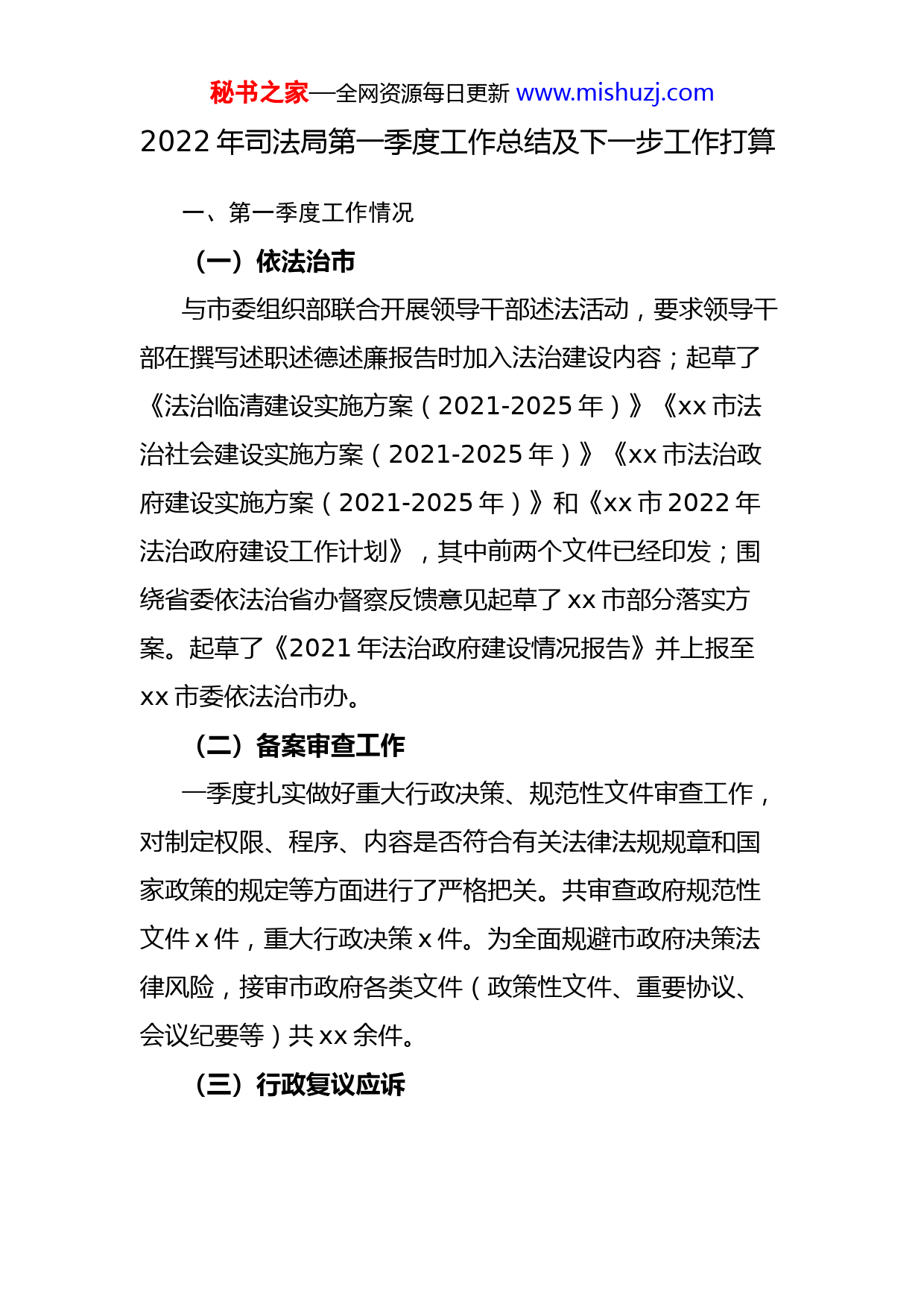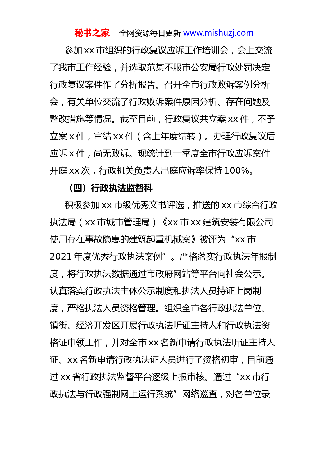 秘书之家—全网资源每日更新www.mishuzj.com2022年司法局第一季度工作总结及下一步工作打算一、第一季度工作情况(一)依法治市与市委组织部联合开展领导干部述法活动,要求领导干部在撰写述职述德述廉报告时加入法治建设内容;起草了《法治临清建设实施方案(2021-2025年)》《xx市法治社会建设实施方案(2021-2025年)》《xx市法治政府建设实施方案(2021-2025年)》和《xx市2022年法治政府建设工作计划》,其中前两个文件已经印发;围绕省委依法治省办督察反馈意见起草了xx市部分落实方案。起草了《2021年法治政府建设情况报告》并上报至xx市委依法治市办。(二)备案审查工作一季度扎实做好重大行政决策、规范性文件审查工作,对制定权限、程序、内容是否符合有关法律法规规章和国家政策的规定等方面进行了严格把关。共审查政府规范性文件x件,重大行政决策x件。为全面规避市政府决策法律风险,接审市政府各类文件(政策性文件、重要协议、会议纪要等)共xx余件。(三)行政复议应诉秘书之家—全网资源每日更新www.mishuzj.com参加xx市组织的行政复议应诉工作培训会,会上交流了我市工作经验,并选取范某不服市公安局行政处罚决定行政复议案件作了分析报告。召开全市行政败诉案例分析会,有关单位交流了行政败诉案件原因分析、存在问题及整改措施等情况。截至目前,行政复议共立案xx件,不予立案x件,审结xx件(含上年度结转)。办理行政复议后应诉x件,尚无败诉。现统计到一季度全市行政应诉案件开庭xx次,行政机关负责人出庭应诉率保持100%。(四)行政执法监督科积极参加xx市级优秀文书评选,推送的xx市综合行政执法局(xx市城市管理局)《xx市xx建筑安装有限公司使用存在事故隐患的建筑起重机械案》被评为“xx市2021年度优秀行政执法案例”。严格落实行政执法年报制度,将行政执法数据通过市政府网站等平台向社会公示。认真落实行政执法主体公示制度和执法人员持证上岗制度,严格执法人员资格管理。组织全市各行政执法单位、镇街、经济开发区开展行政执法听证主持人和行政执法资格证申领工作,并对全市xx名新申请行政执法听证主持人证、xx名新申请行政执法证人员进行了资格初审,目前通过xx省行政执法监督平台逐级上报审核。通过“xx市行政执法与行政强制网上运行系统”网络巡查,对各单位录秘书之家—全网资源每日更新www.mishuzj.com入行政处罚案件进行指导、监督与完善,推动“三项制度”在行政执法机关中的落实。(五)人民调解积极完善多元化解工作机制,推进专业性、行业性调解组织建设,指导我市供电公司完善市电力纠纷调解委员会建设,打造“特约+调解”工作模式;推进检调对接、公调对接,规范细化检调对接工作流程,截至目前,接受检察院委托,并处理案件xx起。积极推进公调对接机制建设,发挥人民调解优势,引流调解压力,及时有效化解矛盾纠纷。今年以来,累计排查纠纷xxx次,预防纠纷xx起,受理并化解纠纷xxx件。(六)公共法律服务组织全市16个镇(街),94个行政村居和社区居委会签订2022年常年法律顾问合同。建立了基层法律服务全覆盖履职评议和工作例会制度,加强我市基层法律服务全覆盖的监督和管理。采取“四不两直”的方式,对我市公共法律服务行业进行督导检查。坚持扩源挖潜,尽快实现党政机关公职律师队伍全覆盖。制定符合公职律师特点的津补贴办法或以奖代补办法,综合考量公职律师参与文书起草、诉讼代理、纠纷化解、信访接待等法律事务的强度、效度和复杂程度,适当提高其薪酬待遇,吸引更多优秀人才加入公职律师队伍。秘书之家—全网资源每日更新www.mishuzj.com(七)普法依法治理印发了我市八五普法规划,与市农业农村局联合开展农村学法用法示范户上报工作,组建我市普法志愿者和普法讲师团,对我市民主法治示范村(社区)进行了复核。(八)社区矫正与安置帮教工作一季度接收矫正对象xx人、解除xx人,组织社会调查xx人,组织戒毒警察对矫正对象信息化核查。二、存在突出问题(一)法治建设整体推进力度不够。xx市即将下发《省委依法治省办督察整改方案》,xx市去年代表xx市迎接了省委依法治省办督察,部分针对我市的督察问题需要集中整改。(二)工作开展面临资金压力。近年来,基层法律服务全覆盖工程市级资金方面一直没有落实,严重影响了法律顾问的工作积极性,形成恶性循环。社区矫正“智慧矫正”资金预计投入xxx余万元,目前资金面临瓶颈(现预计2025年建成,每年投入xx万)。普法依法治理经费没有全部落实,xx市要求2022年底每个村(社区)建立一处法治文化阵地,受限于资金和重视等因素的影响,我市法治文化阵地建设工作进展极其缓慢。(三)人员严重不足。执法监督队伍建设较薄弱,监督工作涉及多个行业和执法部门,涉及多方面的专业知识,秘书之家—全网资源每日更新www.mishuzj.com因此要求执法监督工作人员专业性较强,故缺少专业执法监督人员。备案审查工作需要进一步充实人员力量。三、下步思路打算进一步谋划2022年度各项司法行政工作,力争打造一批亮点工作。(一)法治建设智囊团,共分两个层次。一是智囊团成员包括高校教授、优秀律师等。特别是要建立“县级干部+优秀律师”顾问机制,让优秀律师成为各县级干部分管领域的参谋助手。二是建立法治建设监督员制度。法治建设监督