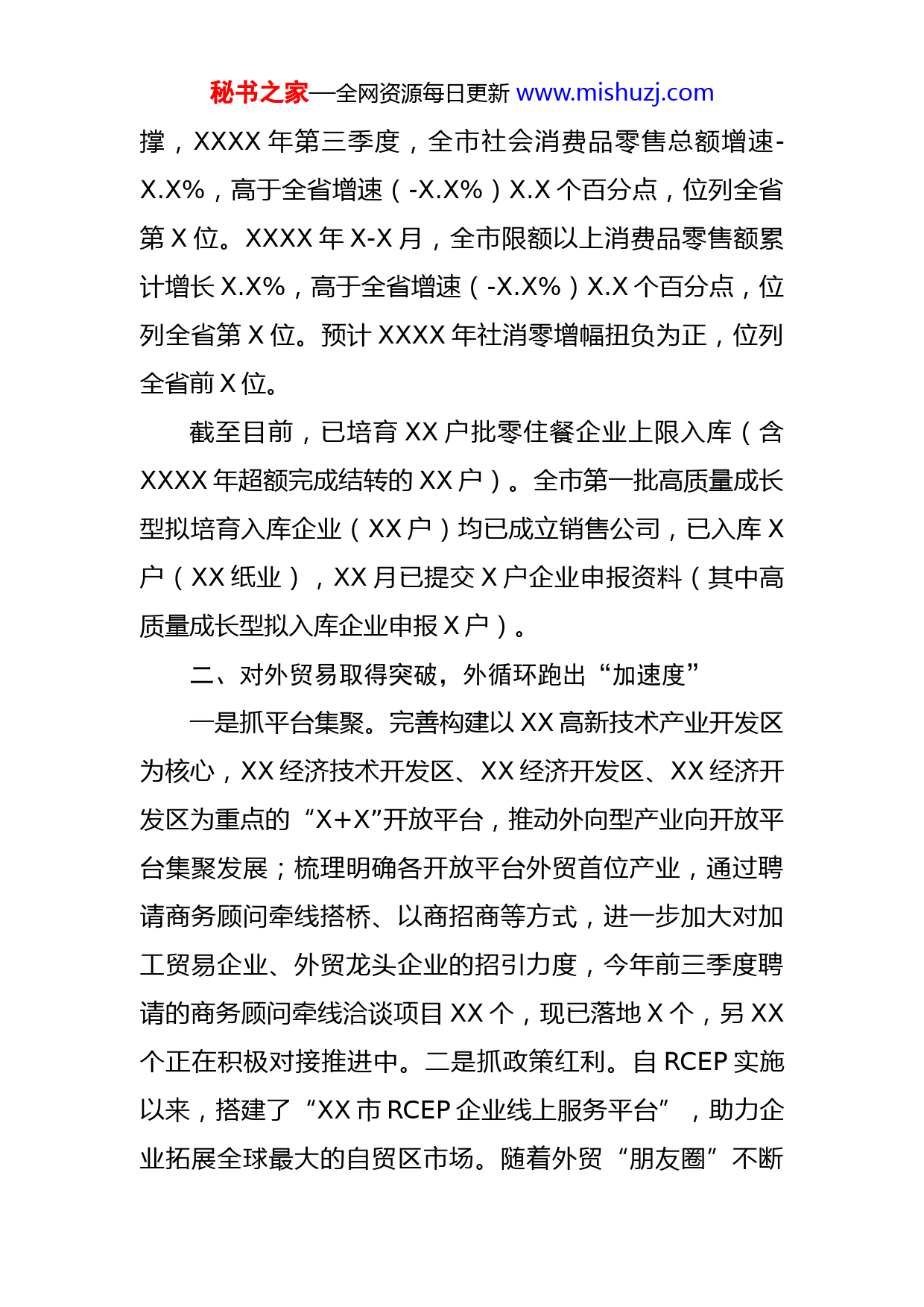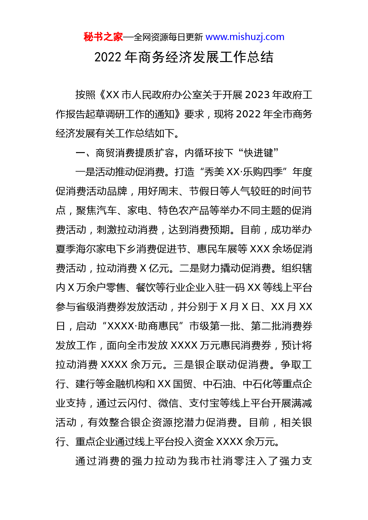 秘书之家—全网资源每日更新www.mishuzj.com2022年商务经济发展工作总结按照《XX市人民政府办公室关于开展2023年政府工作报告起草调研工作的通知》要求,现将2022年全市商务经济发展有关工作总结如下。一、商贸消费提质扩容,内循环按下“快进键”一是活动推动促消费。打造“秀美XX·乐购四季”年度促消费活动品牌,用好周末、节假日等人气较旺的时间节点,聚焦汽车、家电、特色农产品等举办不同主题的促消费活动,刺激拉动消费,达到消费预期。目前,成功举办夏季海尔家电下乡消费促进节、惠民车展等XXX余场促消费活动,拉动消费X亿元。二是财力撬动促消费。组织辖内X万余户零售、餐饮等行业企业入驻一码XX等线上平台参与省级消费券发放活动,并分别于X月X日、XX月XX日,启动“XXXX·助商惠民”市级第一批、第二批消费券发放工作,面向全市发放XXXX万元惠民消费券,预计将拉动消费XXXX余万元。三是银企联动促消费。争取工行、建行等金融机构和XX国贸、中石油、中石化等重点企业支持,通过云闪付、微信、支付宝等线上平台开展满减活动,有效整合银企资源挖潜力促消费。目前,相关银行、重点企业通过线上平台投入资金XXXX余万元。通过消费的强力拉动为我市社消零注入了强力支秘书之家—全网资源每日更新www.mishuzj.com撑,XXXX年第三季度,全市社会消费品零售总额增速-X.X%,高于全省增速(-X.X%)X.X个百分点,位列全省第X位。XXXX年X-X月,全市限额以上消费品零售额累计增长X.X%,高于全省增速(-X.X%)X.X个百分点,位列全省第X位。预计XXXX年社消零增幅扭负为正,位列全省前X位。截至目前,已培育XX户批零住餐企业上限入库(含XXXX年超额完成结转的XX户)。全市第一批高质量成长型拟培育入库企业(XX户)均已成立销售公司,已入库X户(XX纸业),XX月已提交X户企业申报资料(其中高质量成长型拟入库企业申报X户)。二、对外贸易取得突破,外循环跑出“加速度”一是抓平台集聚。完善构建以XX高新技术产业开发区为核心,XX经济技术开发区、XX经济开发区、XX经济开发区为重点的“X+X”开放平台,推动外向型产业向开放平台集聚发展;梳理明确各开放平台外贸首位产业,通过聘请商务顾问牵线搭桥、以商招商等方式,进一步加大对加工贸易企业、外贸龙头企业的招引力度,今年前三季度聘请的商务顾问牵线洽谈项目XX个,现已落地X个,另XX个正在积极对接推进中。二是抓政策红利。自RCEP实施以来,搭建了“XX市RCEP企业线上服务平台”,助力企业拓展全球最大的自贸区市场。随着外贸“朋友圈”不断秘书之家—全网资源每日更新www.mishuzj.com扩大,美国、法国、英国以及澳大利亚、新加坡等RCEP成员国等共计XX个国家(地区)与我市建立贸易往来。XXX中央厨房有限公司“XX”出口澳大利亚,开启了XX快消食品走出国门的先河;XX家居有限公司生产的户外家居产品由市级外综服企业服务实现本地报关出口。三是抓重点招商。充分发挥XX对口协作帮扶我市的资源优势,聚焦“短链轻工”产业,组织商务领域招商小分队赴XX开展招商、举办外贸外资企业对接交流洽谈会,引进服装、乐器、制鞋、皮具等特色轻工外向型企业X家,达产后将实现年产值X.X亿元以上。四是抓新型业态。结合“跨境电商+旅游”推动跨境电商零售进口试点,建成XX进口产品线上线下展示交易中心。目前,我市“XX跨境购”线上店已于今年X月份正式运营,线下展示交易示范体验馆XX月已投入运营。XX等一批适销对路的外贸企业纷纷通过阿里巴巴国际站、亚马逊等主流跨境电商平台开设店铺拓展国际市场。对外贸易工作局面的逐步打开,为我市助推开放型经济发展打下了坚实的基础,XXXX年前三季度,我市货物进出口完成X.XX亿元,同比增长XX.XX%,增速排全省第X位。全年预计完成X亿元,增速XX.X%,排位全省第X位。三、市场体系逐步完善,主动脉实现“大贯通”秘书之家—全网资源每日更新www.mishuzj.com一是健全农产品供应链体系。积极申报省级产品供应链体系建设项目,XX项目等X个项目获评,并得到XXX万元上级资金支持。加强农产品批发市场冷链硬件设施建设能力,提高冷链物流重点干支线配送效率,减少服务农产品销售过程的损耗,XXXX年度共完成新增冷库库容X.X万立方,超额完成市政府下达的X万立方冷库库容任务。二是打造县域商业体系。通过对全市县域商贸物流配送中心、乡镇商贸中心、乡村便利店的建设和改造,打造形成以县城为中心,乡镇为重点,村为基础的一体化县域商业体系。今年成功申报XX自治县为省级试点县,目前共获得中央、省XXX万元资金支持。截至目前,重点建设的XX县级物流配送中心、XX新城农贸市场改建项目等X个项目,共完成投资金额XXXX.X余万元。三是完善电商供应链云仓服务体系。有效整合全市电商快递物流资源,集聚电商企业,构建智慧仓配网络,今年新增建成XX县级节点仓,目前全市已完成X个市级枢纽仓、X个县级节点仓及X个XX前置仓布局,均实现“一个产品多仓卖”“零碎产品汇集卖”的目标,推动农产品上行规模快速增长。XXXX年X-X月,我市网络零售额XX.XX亿元,同比增速XX.XX%,全年预计完成XX.X亿元,增速XX.X%,排位全省第X位。四是巩固XX销售体系。巩固已建成的X个“XX·臻品”XX销售中心,开展品牌建设、拓展销售市场,形成智秘书之家—全网资源每日更新www.mishuzj.com慧仓配网络,XXXX年X-XX月,东西部消