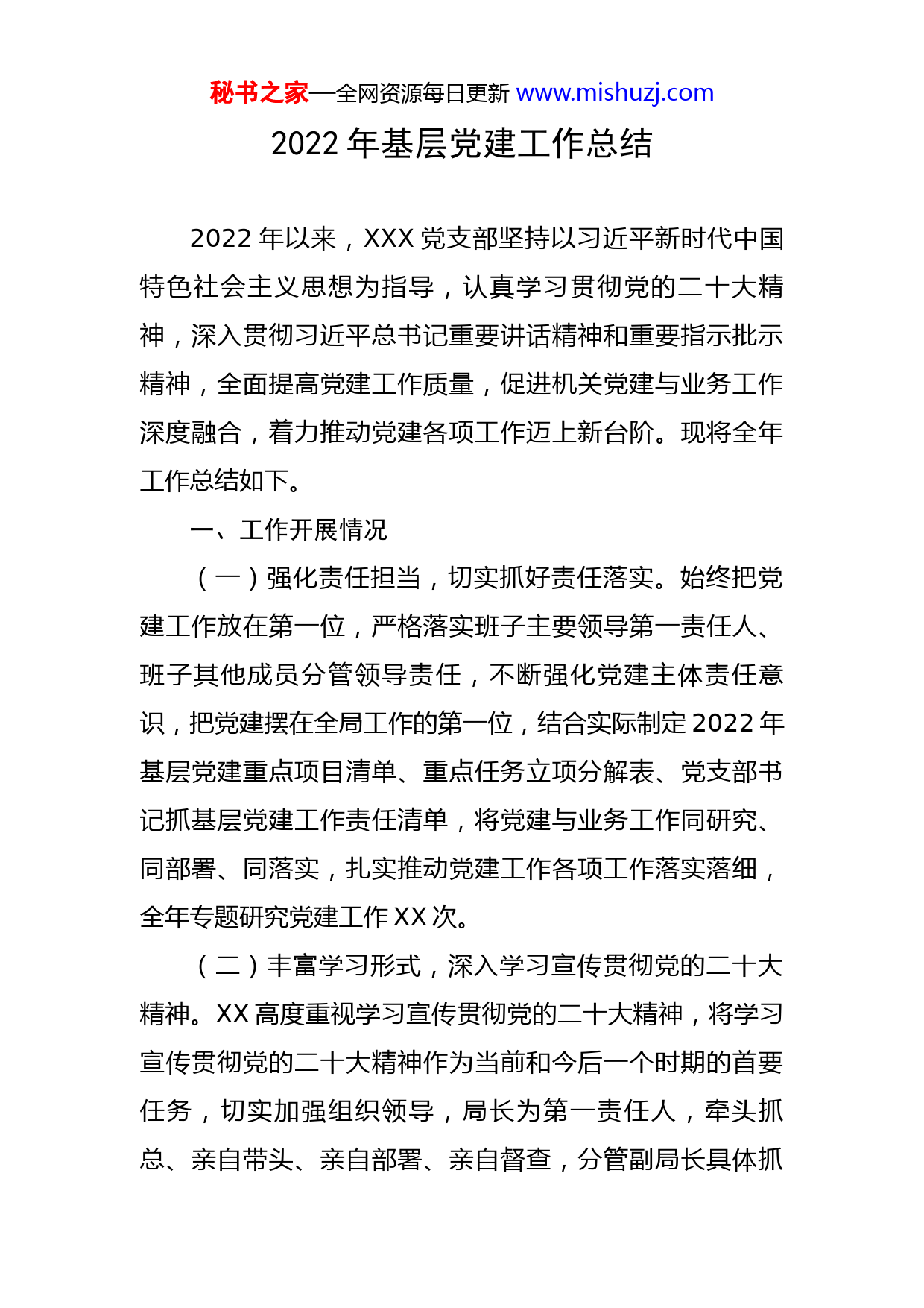 秘书之家—全网资源每日更新www.mishuzj.com2022年基层党建工作总结2022年以来,XXX党支部坚持以习近平新时代中国特色社会主义思想为指导,认真学习贯彻党的二十大精神,深入贯彻习近平总书记重要讲话精神和重要指示批示精神,全面提高党建工作质量,促进机关党建与业务工作深度融合,着力推动党建各项工作迈上新台阶。现将全年工作总结如下。一、工作开展情况(一)强化责任担当,切实抓好责任落实。始终把党建工作放在第一位,严格落实班子主要领导第一责任人、班子其他成员分管领导责任,不断强化党建主体责任意识,把党建摆在全局工作的第一位,结合实际制定2022年基层党建重点项目清单、重点任务立项分解表、党支部书记抓基层党建工作责任清单,将党建与业务工作同研究、同部署、同落实,扎实推动党建工作各项工作落实落细,全年专题研究党建工作XX次。(二)丰富学习形式,深入学习宣传贯彻党的二十大精神。XX高度重视学习宣传贯彻党的二十大精神,将学习宣传贯彻党的二十大精神作为当前和今后一个时期的首要任务,切实加强组织领导,局长为第一责任人,牵头抓总、亲自带头、亲自部署、亲自督查,分管副局长具体抓秘书之家—全网资源每日更新www.mishuzj.com落实,指定专人具体负责该项工作认真做好相关资料的收集整理并按时上报情况报告。结合实际精心组织、深入学习、广泛宣传和全面贯彻落实,印发《学习宣传贯彻党的二十大精神工作方案》《XX关于认真学习宣传贯彻党的二十大精神的实施方案》。通过领导班子“带头学”、专题研讨“深入学”、全体党员“集中学”、线上线下“广泛学”。2022年共组织集中学习XX次、开展交流研讨XX次、开展专题读书会XX次、撰写心得体会XX篇、撰写交流发言提纲XX份、讲授党的二十大精神专题党课XX次、宣讲党的二十大精神XX次。(三)严格制度落实,全面提升党建水平。一是持续深化巩固党支部标准化规范化建设成果。认真贯彻落实《中国共产党支部工作条例》,把党支部建设放在更加突出的位置,围绕基本组织、基本队伍、基本活动、基本制度、基本保障等要求,对标对表持续深化巩固党支部标准化规范化建设成果,提升党支部工作水平。二是严肃党内政治生活。认真贯彻执行党章及党内法规,从严落实“三会一课”、党费日及领导干部双重组织生活等制度,扎实开展主题党日、党员政治生日等活动,抓实党员积分制管理,党建各项重点任务全面完成,基层党建工作质量全面提高。2022年以来,共召开组织生活会XX次、党员大会XX次、支委会XX次、主题党日XX次、理论小组学习XX秘书之家—全网资源每日更新www.mishuzj.com次、班子成员为全体党员干部上党课XX次。三是严肃规范完成支部换届选举工作。XX根据《党章》《中国共产党基层组织选举工作条例》《中国共产党支部工作条例(试行)》和基层党组织标准化建设要求,严格按照方法步骤和时间安排于2022年XX月XX日完成换届选举,确保程序规范步骤标准,并结合工作实际对新一届支部委员会领导班子成员进行分工安排。(四)强化政治担当,纵深推进从严治党。一是扛牢压实全面从严治党主体责任。结合实际制定XX,进一步推动全面从严治党主体责任规定的各项工作有序开展。结合党的工作机关实际,党支部发挥战斗堡垒作用,主要领导注重示范带头,切实履行第一责任人责任,班子成员认真落实“一岗双责”,确保了全面从严治党各项任务落到实处。二是将党风廉政警示教育纳入每月主题党日固定内容,2022年共开展党风廉政警示教育XX次、观看警示教育片XX次,全局干部职工无违规违纪行为发生。扎实开展违规配备使用公务用车问题、违规公款购买烟酒和高档茶叶、“超标准使用办公用房”“违规发放津补贴或福利”、开展违规吃喝、形式主义官僚主义突出问题、纪律作风建设等专项自检自查,同时积极配合市纪委做好节日节点的监督检查,抓实“清廉XX”建设,结合实际深入推进“清廉XX”建设XX行动走深走实。三是抓实家庭家教家秘书之家—全网资源每日更新www.mishuzj.com风建设。把家风建设作为党员和领导干部作风建设重要内容,围绕“育家庭、传家教、塑家风”家庭家教家风建设,扎实开展“树清廉家风创清廉家庭促清廉社风”主题活动,积极参与市级开展的各类创建活动,XX名党员家庭被评为“XX家庭”“XX家庭”“XX家庭”“XX家庭”。组织观看《云岭好家风》等家风节目,深化警示教育和家风教育“三个一”系列活动,多形式开展家庭助廉和家风教育活动,共签订家风承诺书XX份、交流分享家风家训XX次、学习家风家教故事XX余个、观看家风节目XX次。(五)强化典型引领,推进机关党建创先争优。一是抓实“XX模范机关”创建工作。坚持以“XX模范机关”创建为抓手,把创建“XX模范机关”融入党建工作和业务工作中,聚焦“政治建设、理论武装、制度健全、主责主业、作风效能、宗旨意识”持续打造“政治过硬型、学以致用型、规范示范型、本领高强型、风清气正型、为民服务型”模范机关,用创建工作成效推动党建工作和业务工作双促进、双见效,已命名为第二批“XX模范机关”。二是扎实开展“对标先进争创一流”主题实践活动。结合实际制定《XX“对标先进、争创一流”主题实践活动方案》,通过纵看横比寻标、靶向精准对标、明