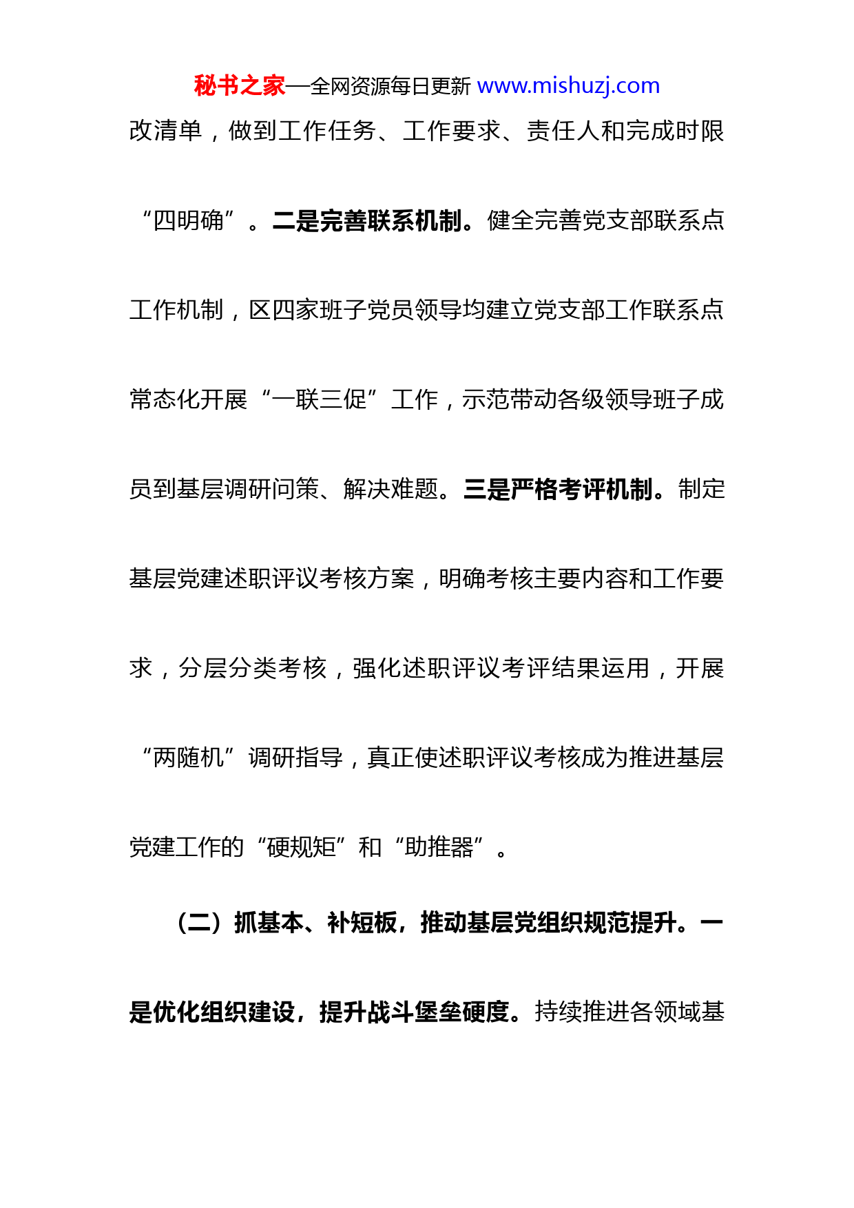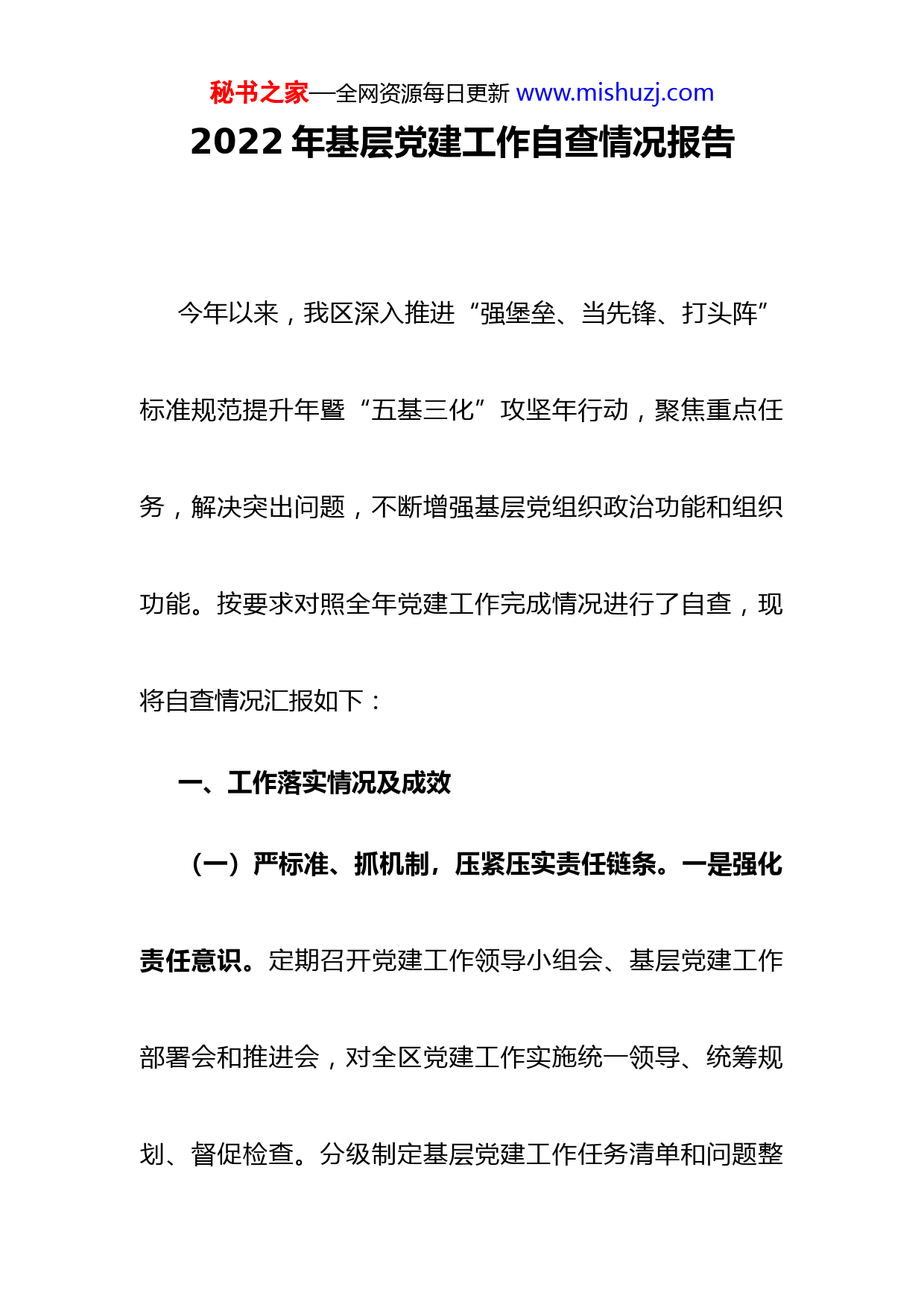 秘书之家—全网资源每日更新www.mishuzj.com2022年基层党建工作自查情况报告今年以来,我区深入推进“强堡垒、当先锋、打头阵”标准规范提升年暨“五基三化”攻坚年行动,聚焦重点任务,解决突出问题,不断增强基层党组织政治功能和组织功能。按要求对照全年党建工作完成情况进行了自查,现将自查情况汇报如下:一、工作落实情况及成效(一)严标准、抓机制,压紧压实责任链条。一是强化责任意识。定期召开党建工作领导小组会、基层党建工作部署会和推进会,对全区党建工作实施统一领导、统筹规划、督促检查。分级制定基层党建工作任务清单和问题整秘书之家—全网资源每日更新www.mishuzj.com改清单,做到工作任务、工作要求、责任人和完成时限“四明确”。二是完善联系机制。健全完善党支部联系点工作机制,区四家班子党员领导均建立党支部工作联系点常态化开展“一联三促”工作,示范带动各级领导班子成员到基层调研问策、解决难题。三是严格考评机制。制定基层党建述职评议考核方案,明确考核主要内容和工作要求,分层分类考核,强化述职评议考评结果运用,开展“两随机”调研指导,真正使述职评议考核成为推进基层党建工作的“硬规矩”和“助推器”。(二)抓基本、补短板,推动基层党组织规范提升。一是优化组织建设,提升战斗堡垒硬度。持续推进各领域基秘书之家—全网资源每日更新www.mishuzj.com层党组织评星定级,全区农村星级党组织覆盖率达%,小区获评自治区三星级居民小区党组织。创新打造“”党建联盟和“”党建联盟,整合各领域党组织力量和资源,在品牌建设、村企合作、校地合作等方面优势互补、资源共享,实现区域党建互联互动。二是培育“先锋”,壮大雁阵队伍力量。严格把关发展党员质量,确保发展党员数量和质量“双线”提升,全额完成个发展党员任务数,入党积极分子库存名。打造直观生动党性教育模式,举办“党建领航清风护航”文艺汇演暨“党课开讲啦”清廉社区情景党课,把党课的阵地从课堂搬到舞台。三是强化阵地建设,完善良好发展环境。持续深化党群服务中心标秘书之家—全网资源每日更新www.mishuzj.com准化建设,实施基层阵地建设提档升级,其中村、村等8个村党群服务中心达到500平方米以上,村党群服务中心达到2000平方米以上,打造乡党建振兴广场,新建村屯级党群服务中心,打通服务群众“最后一百米”。(三)抓发展、优服务,促进党建与中心工作融合。一是党旗领航赋能乡村振兴。大力实施党建引领乡村振兴战略,以田园综合体为载体,大力实施“五大行动”,推动田园综合体党建工作提档升级。以盘活资产、土地流转产业融合、“人才回流”、项目驱动为重要抓手,不断探索多元化村级集体经济发展模式,实现所有行政村集体经济年收入均达到5万元以上,其中有个村年收入达到10秘书之家—全网资源每日更新www.mishuzj.com万元以上,有个村年收入达到20万元以上,有个村年收入达到50万元以上。二是党旗引领凝聚担当力量。突出服务功能,成立疫情防控临时党支部个,设立党员先锋岗个,组建党员先锋队支,构筑起党建引领、群防群治抗击疫情的严密防线。面对暴雨洪水,全区各级党组织和广大党员干部集结在一线,投入防汛救灾和风险隐患排查,由区、镇、村三级党员干部余人组成支党员防汛先锋突击队,保持24小时在岗在位、随时待命,对所在村屯、水库、重点区域展开巡查切实掌握村庄和群众情况并及时处理和反馈汛情。三是红色引领助力文旅腾飞。昂起文化旅游龙头新定位,将党建工作深度嵌入打造世界级旅秘书之家—全网资源每日更新www.mishuzj.com游城市中,组织党员干部在创全域旅游示范区工作中争先锋、做表率,助力我区成功入选2022年国家全域旅游示范区初审达标验收名单。实施旅游红色驿站“增点拓面”行动,实现在公路黄金旅游通道段、名胜风景区全覆盖,设置“党员志愿服务点”、“党员咨询台”、“党员示范岗”,提供咨询、充电、茶水等服务,打通服务旅客“最后一公里”。二、存在的问题及原因(一)基层党组织“领头雁”作用发挥有待进一步提升。主要体现在:我区个行政村党支部书记中35岁(含)以下的有人,占比%,50岁(含)以上的有人,占比秘书之家—全网资源每日更新www.mishuzj.com%,具有大专及以上学历的有名,占比%。少数村党支部书记主动学习意识不强,对党的创新理论把握不到位理解不够深;少数村党支部书记能力参差不齐,有的存在畏难心理,安于现状,工作方法单一,发展思路局限,积极性、主动性不足,致富、带富能力不够强。主要原因有村支书一人承担着村支部书记、村委会主任、村级集体经济组织负责人三重身份的工作,既要抓党务又要抓村务,还要抓村级集体经济发展,任务繁重;少数村支书年纪大学历偏低,学习能力不强,思路创新、带头致富等方面心有余而力不足。秘书之家—全网资源每日更新www.mishuzj.com(二)基层党组织阵地建设有待进一步强化。主要体现在:部分村级阵地重硬件轻软件建设,党务信息更新不够及时,管理不够规范;部分村活动场所服务群众作用不明显,组织村民开展技能培训、服务群众活动相对较少,阵地使用率不高,服务水平和办事效率不高;部分机关党组织党员活动室无制度无书报,党员活动室与办公室合用。主要原因有:少数基层党组织对