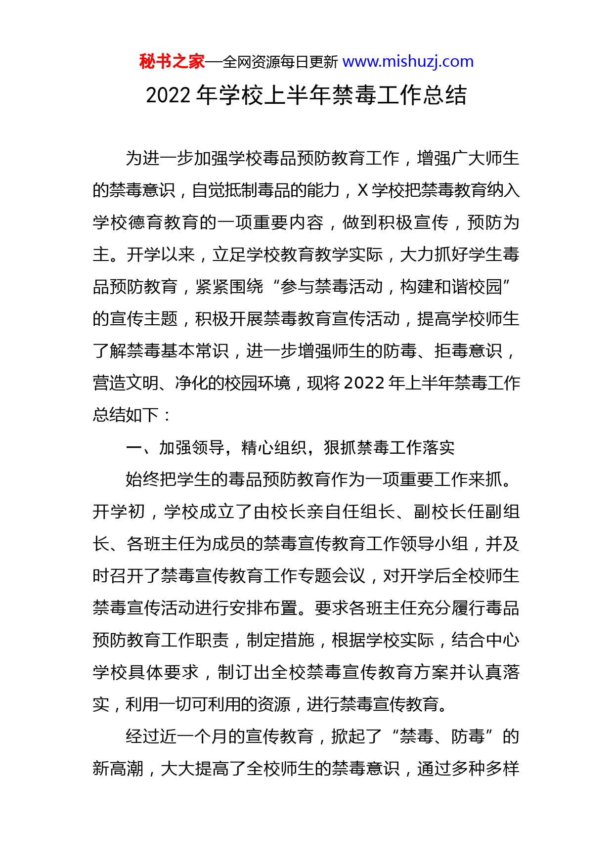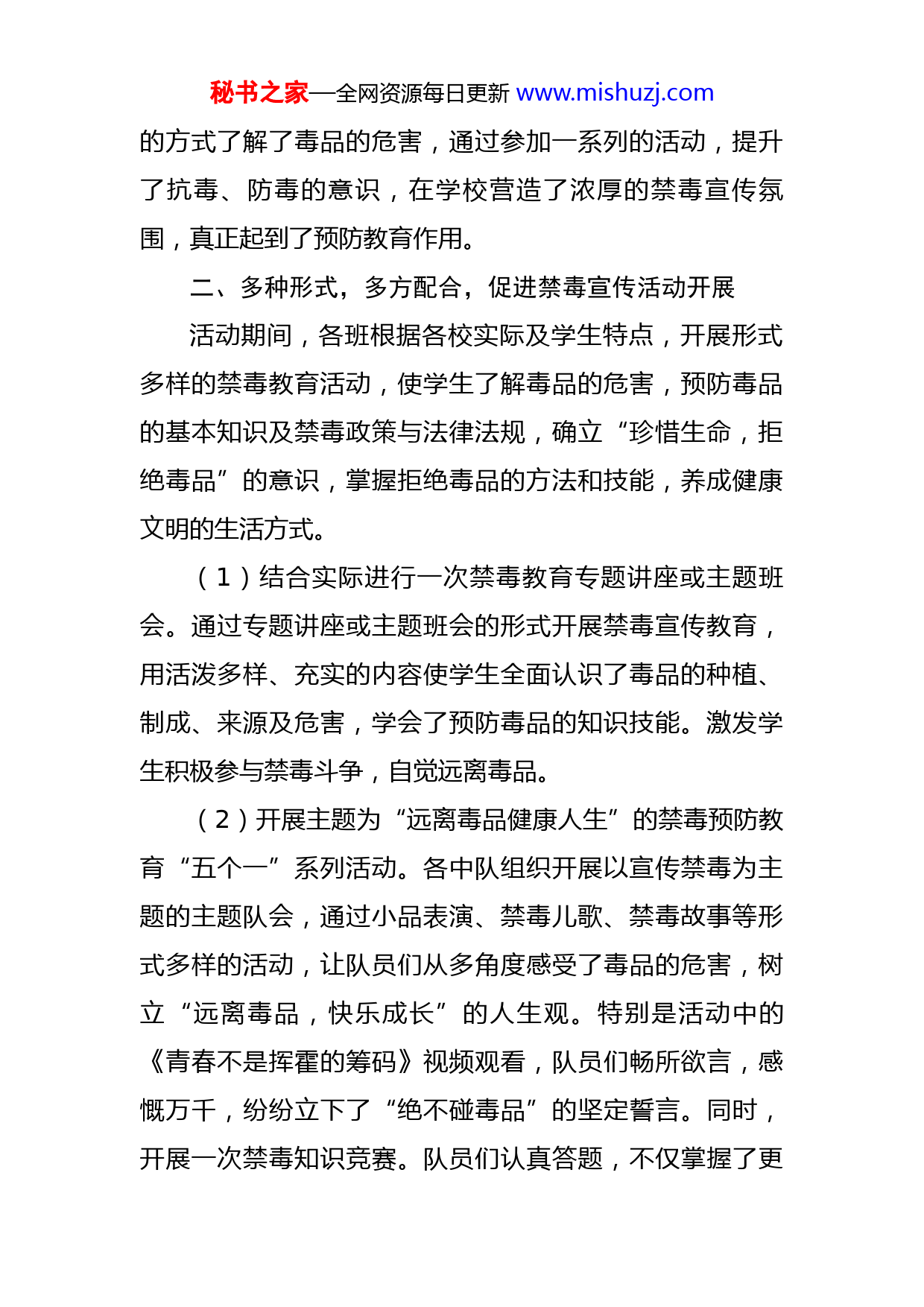 秘书之家—全网资源每日更新www.mishuzj.com2022年学校上半年禁毒工作总结为进一步加强学校毒品预防教育工作,增强广大师生的禁毒意识,自觉抵制毒品的能力,X学校把禁毒教育纳入学校德育教育的一项重要内容,做到积极宣传,预防为主。开学以来,立足学校教育教学实际,大力抓好学生毒品预防教育,紧紧围绕“参与禁毒活动,构建和谐校园”的宣传主题,积极开展禁毒教育宣传活动,提高学校师生了解禁毒基本常识,进一步增强师生的防毒、拒毒意识,营造文明、净化的校园环境,现将2022年上半年禁毒工作总结如下:一、加强领导,精心组织,狠抓禁毒工作落实始终把学生的毒品预防教育作为一项重要工作来抓。开学初,学校成立了由校长亲自任组长、副校长任副组长、各班主任为成员的禁毒宣传教育工作领导小组,并及时召开了禁毒宣传教育工作专题会议,对开学后全校师生禁毒宣传活动进行安排布置。要求各班主任充分履行毒品预防教育工作职责,制定措施,根据学校实际,结合中心学校具体要求,制订出全校禁毒宣传教育方案并认真落实,利用一切可利用的资源,进行禁毒宣传教育。经过近一个月的宣传教育,掀起了“禁毒、防毒”的新高潮,大大提高了全校师生的禁毒意识,通过多种多样秘书之家—全网资源每日更新www.mishuzj.com的方式了解了毒品的危害,通过参加一系列的活动,提升了抗毒、防毒的意识,在学校营造了浓厚的禁毒宣传氛围,真正起到了预防教育作用。二、多种形式,多方配合,促进禁毒宣传活动开展活动期间,各班根据各校实际及学生特点,开展形式多样的禁毒教育活动,使学生了解毒品的危害,预防毒品的基本知识及禁毒政策与法律法规,确立“珍惜生命,拒绝毒品”的意识,掌握拒绝毒品的方法和技能,养成健康文明的生活方式。(1)结合实际进行一次禁毒教育专题讲座或主题班会。通过专题讲座或主题班会的形式开展禁毒宣传教育,用活泼多样、充实的内容使学生全面认识了毒品的种植、制成、来源及危害,学会了预防毒品的知识技能。激发学生积极参与禁毒斗争,自觉远离毒品。(2)开展主题为“远离毒品健康人生”的禁毒预防教育“五个一”系列活动。各中队组织开展以宣传禁毒为主题的主题队会,通过小品表演、禁毒儿歌、禁毒故事等形式多样的活动,让队员们从多角度感受了毒品的危害,树立“远离毒品,快乐成长”的人生观。特别是活动中的《青春不是挥霍的筹码》视频观看,队员们畅所欲言,感慨万千,纷纷立下了“绝不碰毒品”的坚定誓言。同时,开展一次禁毒知识竞赛。队员们认真答题,不仅掌握了更秘书之家—全网资源每日更新www.mishuzj.com多的禁毒知识,还提高了毒品的安全意识。(3)利用板报橱窗进行禁毒知识宣传。充分利用板报橱窗宣传栏等从认识毒品种类、特点、产地、种植,吸毒后的危害、后果等多方面、多角度进行了开展广泛宣传,时刻提醒广大学生增强对毒品危害的认识,千万不能去接触毒品。(4)利用校园广播,收集有关资料进行广播讲座,还利用班会课时间播放有关禁毒系列宣传片。宣传片上吸毒者一幅幅惨不忍睹的画面,一个个悲惨的遭遇,让全体学生在教育片中的真实事例和活生生的、血淋淋的镜头中感受了毒品的危害,接受到了深刻地教育,并使同学们留下了深刻的思考:青少年在成长过程中,要远离毒品,千万不要因为一时的好奇,一时的疏忽,而踏上这样一条不归路。还要求每个班出一期禁毒板报,然后评比出优秀的板报并组织全校学生去观看。(5)与公安部门联系,开展“禁毒宣传进校园,无毒青春伴你行”宣传教育活动。禁毒专干针对青少年辨别毒品能力差、自制力差,容易受犯罪的诱惑利用这一特点,并向学生展示仿真毒品模型让学生们面对面认识毒品的外形,并详细的介绍了毒品的种类、危害以及新型毒品伪装形式,并告诫在校师生要谨慎交友,自觉抵制毒品侵害,在日常的学习和工作中要懂得如何识毒、防毒和拒绝毒秘书之家—全网资源每日更新www.mishuzj.com品。三、家庭学校社会联手共同禁毒防毒学校在开展学校教育主导作用的同时,充分发挥了家长和社会的作用,避免形成校外教育盲区。开学第二周,举行了由全体师生、学生家长及社会人士共同参加的开学典礼大会,将学校教育、家庭教育、社会教育结合起来,利用家庭教育阵地进行毒品预防教育,帮助家长掌握有关禁毒知识和教育子女拒绝毒品、远离毒品的方法,使得家长能以其特殊而有效的身份影响子女,做好子女的榜样,形成良好的家庭教育氛围。这样的做法深受家长、社会的赞同,也取得了一定的成效。还定期组织有关人员整治校园周边环境,堵截了学生参与吸、贩毒的源头,减少了学生受引诱、教唆的机会,净化了教育的环境,为禁毒教育起了很大的促进作用。总之,X学校紧紧围绕“参与禁毒活动,构建和谐校园”主题,通过多种途径和方式,开展丰富多彩、行之有效的禁毒宣传教育活动,培养了学生健康的生活情趣、毒品预防意识和社会责任感,提升了学校德育教育水平,促进了校风的好转,带动了办学效益的提高。禁毒工作是一项长期艰巨的工作。为预防毒品侵蚀蔓延,净化学校空气,X学校在今后的工作中还将继续努力,不断总结经验,提高认识,把禁毒工作引向深入,一如既往地做好禁毒宣秘书之家—全网资源每日更新www.mishuzj.com传教育工作,促进