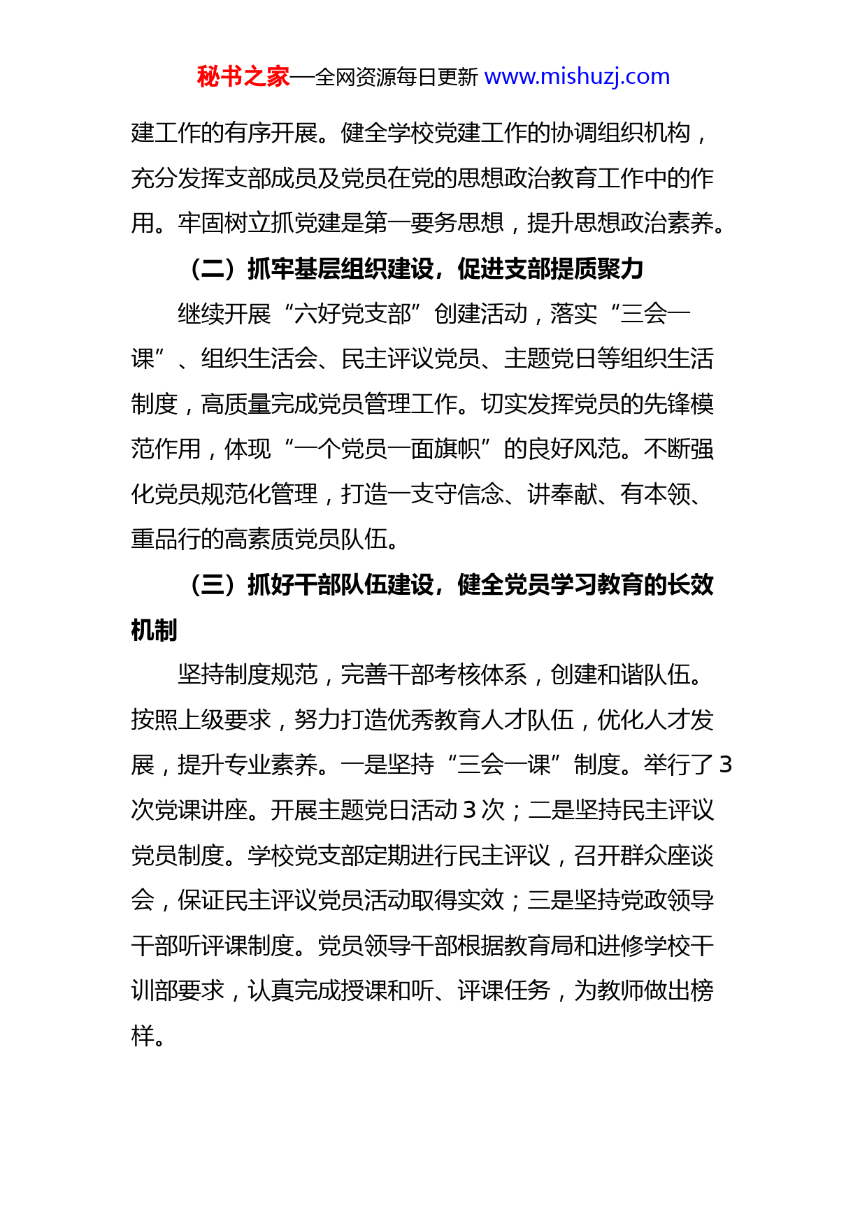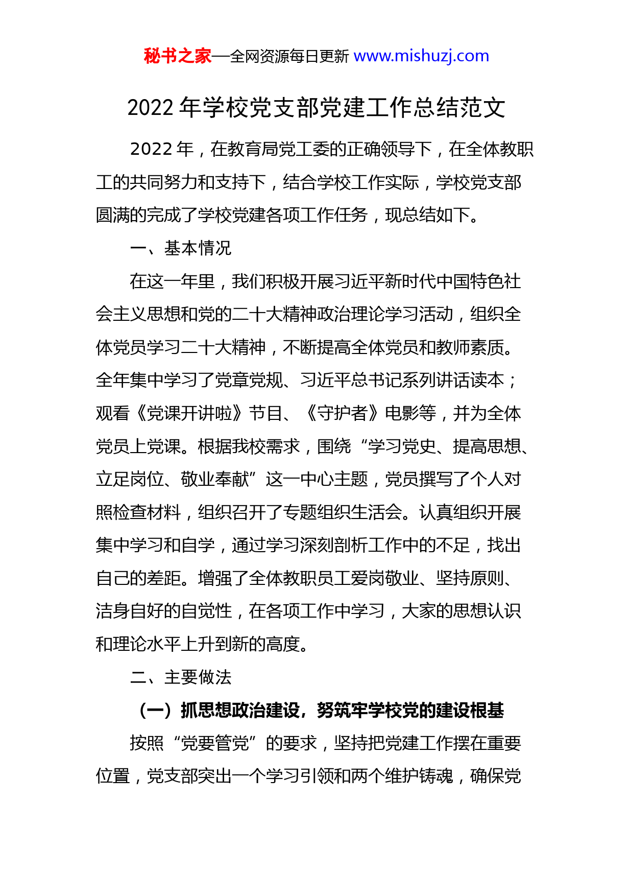 秘书之家—全网资源每日更新www.mishuzj.com2022年学校党支部党建工作总结范文2022年,在教育局党工委的正确领导下,在全体教职工的共同努力和支持下,结合学校工作实际,学校党支部圆满的完成了学校党建各项工作任务,现总结如下。一、基本情况在这一年里,我们积极开展习近平新时代中国特色社会主义思想和党的二十大精神政治理论学习活动,组织全体党员学习二十大精神,不断提高全体党员和教师素质。全年集中学习了党章党规、习近平总书记系列讲话读本;观看《党课开讲啦》节目、《守护者》电影等,并为全体党员上党课。根据我校需求,围绕“学习党史、提高思想、立足岗位、敬业奉献”这一中心主题,党员撰写了个人对照检查材料,组织召开了专题组织生活会。认真组织开展集中学习和自学,通过学习深刻剖析工作中的不足,找出自己的差距。增强了全体教职员工爱岗敬业、坚持原则、洁身自好的自觉性,在各项工作中学习,大家的思想认识和理论水平上升到新的高度。二、主要做法(一)抓思想政治建设,努筑牢学校党的建设根基按照“党要管党”的要求,坚持把党建工作摆在重要位置,党支部突出一个学习引领和两个维护铸魂,确保党秘书之家—全网资源每日更新www.mishuzj.com建工作的有序开展。健全学校党建工作的协调组织机构,充分发挥支部成员及党员在党的思想政治教育工作中的作用。牢固树立抓党建是第一要务思想,提升思想政治素养。(二)抓牢基层组织建设,促进支部提质聚力继续开展“六好党支部”创建活动,落实“三会一课”、组织生活会、民主评议党员、主题党日等组织生活制度,高质量完成党员管理工作。切实发挥党员的先锋模范作用,体现“一个党员一面旗帜”的良好风范。不断强化党员规范化管理,打造一支守信念、讲奉献、有本领、重品行的高素质党员队伍。(三)抓好干部队伍建设,健全党员学习教育的长效机制坚持制度规范,完善干部考核体系,创建和谐队伍。按照上级要求,努力打造优秀教育人才队伍,优化人才发展,提升专业素养。一是坚持“三会一课”制度。举行了3次党课讲座。开展主题党日活动3次;二是坚持民主评议党员制度。学校党支部定期进行民主评议,召开群众座谈会,保证民主评议党员活动取得实效;三是坚持党政领导干部听评课制度。党员领导干部根据教育局和进修学校干训部要求,认真完成授课和听、评课任务,为教师做出榜样。秘书之家—全网资源每日更新www.mishuzj.com(四)抓严党风廉政和作风建设,全面落实从严治党责任严格落实“一岗双责”责任制。不断完善廉政风险防控体系,切实做好廉政风险防控工作。做到三步走:一是继续加强廉政警示教育。切实强化党员干部和教职工的廉洁自律意识;二是持续关注热点难点问题,规范学校办学行为和教师从教行为;三是进一步规范权力运行程序。切实做好政务公开、党务公开、财务公开等重大事项的公开透明,让各项权力在阳光下运行。(五)抓紧队伍建设,充分发挥党员的先锋模范作用1.强核心,打造“三型”支部班子。一是团结型班子建设。我校充分发挥党内民主,加强班子成员交心谈心活动,自觉开展批评与自我批评,广泛征求改善工作的意见,使班子成员之间即坦诚相待又各抒己见,构成团结、民主、和谐的班子队伍;二是加强学习型班子建设。将学习作为提高本领、改善工作的重要举措,支部班子重点学习二十大精神和习近平新时代中国特色社会主义思想,切实提高了党政班子政策理论水平、执政潜力和服务群众的本领;三是加强发展型班子建设。坚持用“发展才是硬道理”的思想建设完善班子,在新时代教育形式下,前瞻性规划学校的发展,全面提升教书育人的本领。秘书之家—全网资源每日更新www.mishuzj.com2.按标准,提升党员队伍素质。按照发挥一个作用(先锋模范作用)、坚持两个在前(吃苦在前,奉献在前)、履行三个服务(为学生服务,为学校服务,为社会服务)和达到四个提高(提高党员形象,提高个人素养,提高专业内涵,提高工作业绩)的要求,在广大党员和教师中开展以老带新、以能带新的传帮带活动,每学期进行学校优秀党员、教学优秀、德育优秀、师德优秀和工会优秀积极分子评选、表彰。同时,按照“坚持标准,保证质量,改善结构,慎重发展”的要求,培养入党积极分子。(六)依托党建活动,切实提高党建工作水平围绕“践行教师准则,争做四有好老师”主题实践活动,开展师德师风系列教育活动为x教育持续、快速、健康发展贡献力量,为构建社会主义和谐社会贡献力量。1.开展一次师德承诺活动。为强化廉洁从教意识,完善师德规范,全体教师签订《教师遵守职业道德承诺书》,从十个方面进行师德承诺。2.积极开展师德自查活动。认真做好对照检查、扎实进行整改提高,确保师德师风教育活动取得实效,形成《德师风自查自纠报告》。(七)立足本岗,深入学习党史知识1.坚持读原著、学原文、悟原理。组织党员干部研读《习近平谈治国理政》第四卷等重要论述和习近平总书记秘书之家—全网资源每日更新www.mishuzj.com在中国共产党第二十次全国代表大会上的报告等最新重要讲话精神,不断提高理论素养、政治素养。2.明确学习重点,抓质量效果。依托学习强国、e支部、党建微平台开展线上学习,提升学习效果。今年开展“学习二十大精神”“