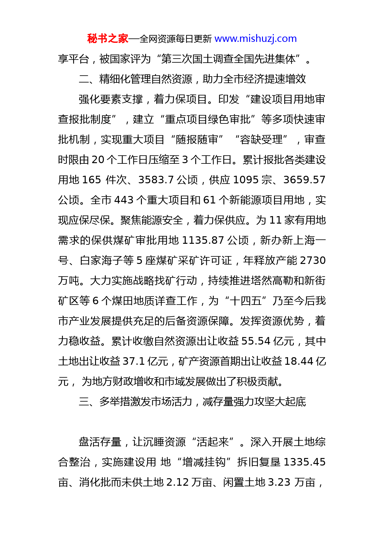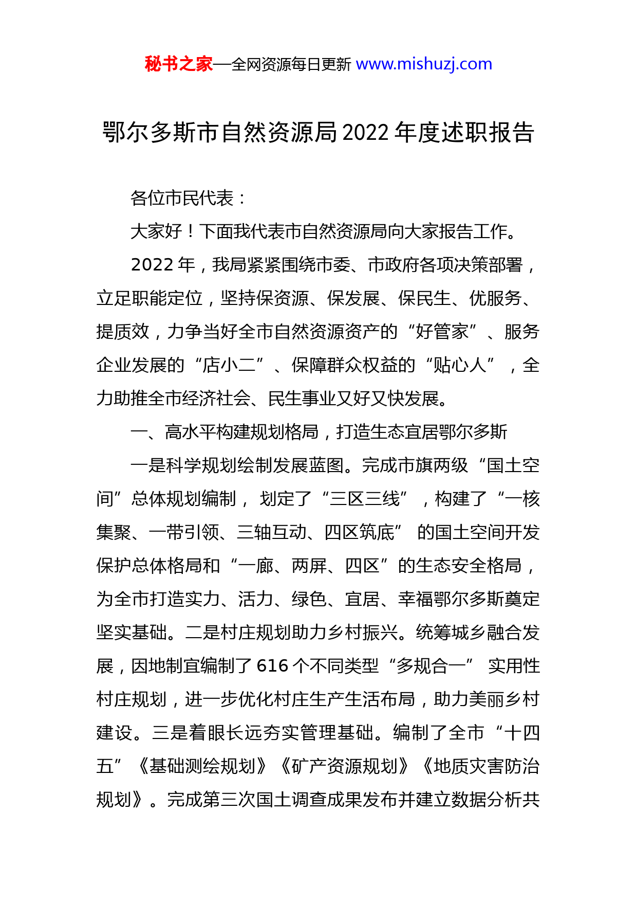 秘书之家—全网资源每日更新www.mishuzj.com鄂尔多斯市自然资源局2022年度述职报告各位市民代表:大家好!下面我代表市自然资源局向大家报告工作。2022年,我局紧紧围绕市委、市政府各项决策部署,立足职能定位,坚持保资源、保发展、保民生、优服务、提质效,力争当好全市自然资源资产的“好管家”、服务企业发展的“店小二”、保障群众权益的“贴心人”,全力助推全市经济社会、民生事业又好又快发展。一、高水平构建规划格局,打造生态宜居鄂尔多斯一是科学规划绘制发展蓝图。完成市旗两级“国土空间”总体规划编制,划定了“三区三线”,构建了“一核集聚、一带引领、三轴互动、四区筑底”的国土空间开发保护总体格局和“一廊、两屏、四区”的生态安全格局,为全市打造实力、活力、绿色、宜居、幸福鄂尔多斯奠定坚实基础。二是村庄规划助力乡村振兴。统筹城乡融合发展,因地制宜编制了616个不同类型“多规合一”实用性村庄规划,进一步优化村庄生产生活布局,助力美丽乡村建设。三是着眼长远夯实管理基础。编制了全市“十四五”《基础测绘规划》《矿产资源规划》《地质灾害防治规划》。完成第三次国土调查成果发布并建立数据分析共秘书之家—全网资源每日更新www.mishuzj.com享平台,被国家评为“第三次国土调查全国先进集体”。二、精细化管理自然资源,助力全市经济提速增效强化要素支撑,着力保项目。印发“建设项目用地审查报批制度”,建立“重点项目绿色审批”等多项快速审批机制,实现重大项目“随报随审”“容缺受理”,审查时限由20个工作日压缩至3个工作日。累计报批各类建设用地165件次、3583.7公顷,供应1095宗、3659.57公顷。全市443个重大项目和61个新能源项目用地,实现应保尽保。聚焦能源安全,着力保供应。为11家有用地需求的保供煤矿审批用地1135.87公顷,新办新上海一号、白家海子等5座煤矿采矿许可证,年释放产能2730万吨。大力实施战略找矿行动,持续推进塔然高勒和新街矿区等6个煤田地质详查工作,为“十四五”乃至今后我市产业发展提供充足的后备资源保障。发挥资源优势,着力稳收益。累计收缴自然资源出让收益55.54亿元,其中土地出让收益37.1亿元,矿产资源首期出让收益18.44亿元,为地方财政增收和市域发展做出了积极贡献。三、多举措激发市场活力,减存量强力攻坚大起底盘活存量,让沉睡资源“活起来”。深入开展土地综合整治,实施建设用地“增减挂钩”拆旧复垦1335.45亩、消化批而未供土地2.12万亩、闲置土地3.23万亩,秘书之家—全网资源每日更新www.mishuzj.com完成率分别达到133.5%、146.2%和326.3%,均超额完成年度任务,处置量居全区第一。极速审批,让项目建设“快起来”。创新推进工业项目“标准地+项目带方案+拿地即开工”全流程审批服务新模式,竞买人签订出让合同后,最短1个工作日即可实现“四证”齐发、拿地即开工,刷新了鄂尔多斯极速审批新纪录。已挂牌“标准地”8宗1016.46亩,成交2宗461.45亩;通过“拿地即开工”供应土地846.02亩。我市有效化解存量、创新审批服务的新举措、新思路,被人民日报、人民网、新华网、中国网等多家权威媒体广泛宣传报道。四、全方位保护利用资源,推动自然生态持续向好牢牢端稳粮食饭碗。严守耕地保护红线,建立四级耕地保护网格体系和“网格员”责任制度,全市411.6万亩耕地和333.9万亩基本农田,实现“总量不减少、质量有提升”。严格耕地占补平衡,率先在全区实现补充耕地指标网上挂牌出让,新建补充耕地库1.97万亩,建设项目占用耕地全部实现“占一补一、占优补优”。持续推进生态修复。编制了《乌海及周边地区绿色矿山建设和矿山地质环境治理“十四五”规划》,实施棋蒙地区矿山“集中连片”治理7.79平方公里,建成横跨棋盘井矿区至乌海交界7公里绿色走廊。完成鄂尔多斯市龙口镇—万家寨—薛家湾段黄河西岸地质环境治理及历史遗留废弃矿山治理项目4秘书之家—全网资源每日更新www.mishuzj.com个。累计争取中央重点生态保护修复治理资金1.13亿元,企业支取使用矿山地质环境治理恢复基金43.7亿元,年度矿山地质环境修复治理面积达143.97平方公里,治理面积及成效位居全区前列。高效规范管理秩序。报请市政府制定出台了自然资源管理秩序规范意见,从矿产资源、土地等7个方面明确了管控措施。开展了历史遗留违法问题专项整改“清零行动”,累计拆除整改违法用地图斑849个,恢复土地面积33776.4亩。推动数字鄂尔多斯·自然资源智慧平台建设,构建“高空看、智能判、地上查、网上管”的空天地一体化自然资源监测体系,保障自然资源管理秩序健康稳定发展。五、高质量回应社会关切,用心用情办好民生实事聚焦目标导向,群众办事更舒心。持续深化“放管服”改革,全区首个实现新建商品房“交房即交证”9个旗区全覆盖。中心城区用地规划、工程规划许可、工业类方案审查等多项审批权限进一步下放。不动产登记实现呼包鄂乌“四城通办”,市内“一网通办”,水电气暖“一窗联办”,抵押换证异地申办,企业群众办事更便捷、更高效。强化信息共享,实现新生入学、公租房申请、公积金贷款等“我要办理不动产权证”一件事一次办。率先在全区实现“不动产登记+用电”联合过户、“公积金贷款+不动产抵押登记”线上一