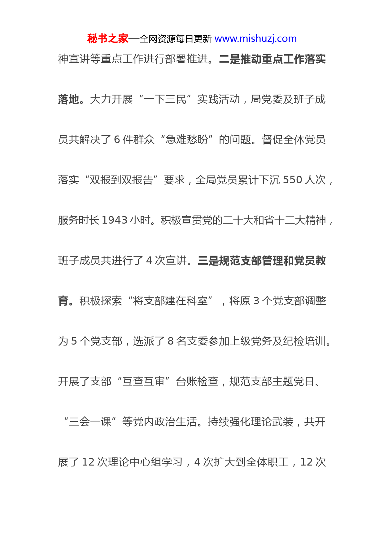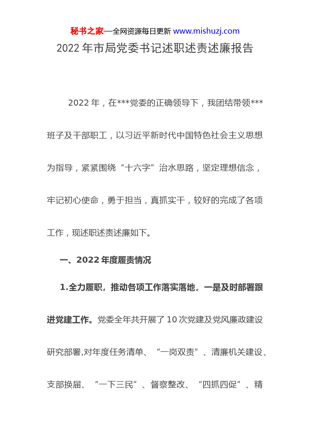 秘书之家—全网资源每日更新www.mishuzj.com2022年市局党委书记述职述责述廉报告2022年,在党委的正确领导下,我团结带领班子及干部职工,以习近平新时代中国特色社会主义思想为指导,紧紧围绕“十六字”治水思路,坚定理想信念,牢记初心使命,勇于担当,真抓实干,较好的完成了各项工作,现述职述责述廉如下。一、2022年度履责情况1.全力履职,推动各项工作落实落地。一是及时部署跟进党建工作。党委全年共开展了10次党建及党风廉政建设研究部署,对年度任务清单、“一岗双责”、清廉机关建设、支部换届、“一下三民”、督察整改、“四抓四促”、精秘书之家—全网资源每日更新www.mishuzj.com神宣讲等重点工作进行部署推进。二是推动重点工作落实落地。大力开展“一下三民”实践活动,局党委及班子成员共解决了6件群众“急难愁盼”的问题。督促全体党员落实“双报到双报告”要求,全局党员累计下沉550人次,服务时长1943小时。积极宣贯党的二十大和省十二大精神,班子成员共进行了4次宣讲。三是规范支部管理和党员教育。积极探索“将支部建在科室”,将原3个党支部调整为5个党支部,选派了8名支委参加上级党务及纪检培训。开展了支部“互查互审”台账检查,规范支部主题党日、“三会一课”等党内政治生活。持续强化理论武装,共开展了12次理论中心组学习,4次扩大到全体职工,12次秘书之家—全网资源每日更新www.mishuzj.com主题党日活动,8次党课,6次廉政微党课。开展联合党建活动。邀请其他单位、对口社区参加道德讲堂活动。联合党支部等开展了两次支部主题党日活动。丰富了党建活动的形式,促进了业务交流。四是积极落实意识形态工作责任制。局党委进行了2次意识形态工作研究部署,我在“意识形态”专题中心组学习中作了形势分析报告。在全局范围内开展了网络安全培训,增强职工网络安全意识。号召党员干部积极转发跟评正能量新闻报道,在省部级及以上媒体上发布14篇文章。2.敢于担责,强化各项责任压紧压实。一是严明政治纪律和政治规矩。开展了2次“强化政治机关意识”的专题秘书之家—全网资源每日更新www.mishuzj.com活动,严格规范党员干部的政治言行。按照选举方案和纪律,严格开展党代表选举及支部换届工作。认真开展政治生态分析研判工作,分析了2022年的政治生态状况,形成了问题清单和分析研判报告。二是严肃开展督查反馈问题整改。针对对我局落实全面从严治党方面反馈意见、“一把手”谈话反馈意见,以及第一巡察组对巡察反馈意见,局党委重点查找自身原因,以“严”的作风把“两个责任”压紧压实,班子成员加强对所在支部和分管科室指导监督力度,对照反馈意见,快速拟定整改方案,压实整改责任,整改措施具体可行、举一反三、立行立改,有明显的整改成效。三是切实履行“一岗双责”。作为党秘书之家—全网资源每日更新www.mishuzj.com建第一责任人,我牢固树立“抓好党建是最大政绩”的理念,带头讲党课、做调研、进行基层督导,班子成员共开展了8次党课,35人次基层督导4次向上级汇报等工作。修订了本单位“三重一大”集体决策实施办法和党委议事规则,严格贯彻落实民主集中制,避免权力的滥用。通过月例会、专项工作督导会等会议形式听取重点工作进度情况,通过实地督导检查、下发文件通报等方法加强监督,确保及时发现问题,解决问题。3.廉洁自律,大力推进党风廉政建设。一是带头以身作则,我严格参加党的组织生活,严肃进行批评与自我批评,深入学习党规党纪,以案例自警自省,以榜样检视初心,秘书之家—全网资源每日更新www.mishuzj.com时时处处以身作则,严格按照规定和制度办事,始终按照工作规程履行职责。保持谦虚、谨慎、不骄不躁艰苦奋斗的作风,自觉抵制和反对各种消极腐败现象,在公务活动和社交活动中严格遵守廉洁自律的各项规定。二是持续纠治“四风”。开展了形式主义、官僚主义自查自纠活动,发文、会议、检查考核数量比去年明显减少。严格报销手续和审核,同时邀请审计公司进行外审。紧盯重大节假日,对违反中央八项规定精神的问题开展了3次明察暗访,发送了纪律提示、廉政短信,畅通了举报渠道,未出现违规违纪现象。三是推进清廉机关建设。开展了第二十三个党风廉政宣教月活动和纪法教育活动。观看了警示教育片,秘书之家—全网资源每日更新www.mishuzj.com讲授了2次廉政党课,开展了2次廉政谈话,不断推动党员干部以案为鉴、依法履职、廉洁从政。针对重点工作、重要项目、节假日纪律、“学习强国”平台学习情况、推动党员干部下基层、廉洁文化建设等问题,局纪委下发了四期《监督提示函》。结合“”文化活动,大力征集优秀廉政作品,打造了廉政展板,加强了清廉文化阵地建设。二、存在的突出问题1.政治理论学习力度不够。一是缺乏“真功夫”,缺乏真学、真知、真信,学习笔记记载不详,心得体会思考不深,没有真正的“触及灵魂”,不能将学习内容化为政治秘书之家—全网资源每日更新www.mishuzj.com信仰和党性原则。二是缺乏“实功夫”,在学习党的理论精神时,缺乏将自己摆进去,将自身工作和发展结合起来,导致理论不能指导实践,难以做到学以致用、学用结合。三是缺乏“苦功夫”,“学习强国”出现个别党员忘记学习,学习分数低等情况,没有做