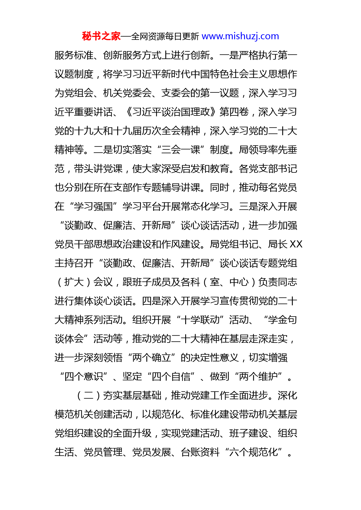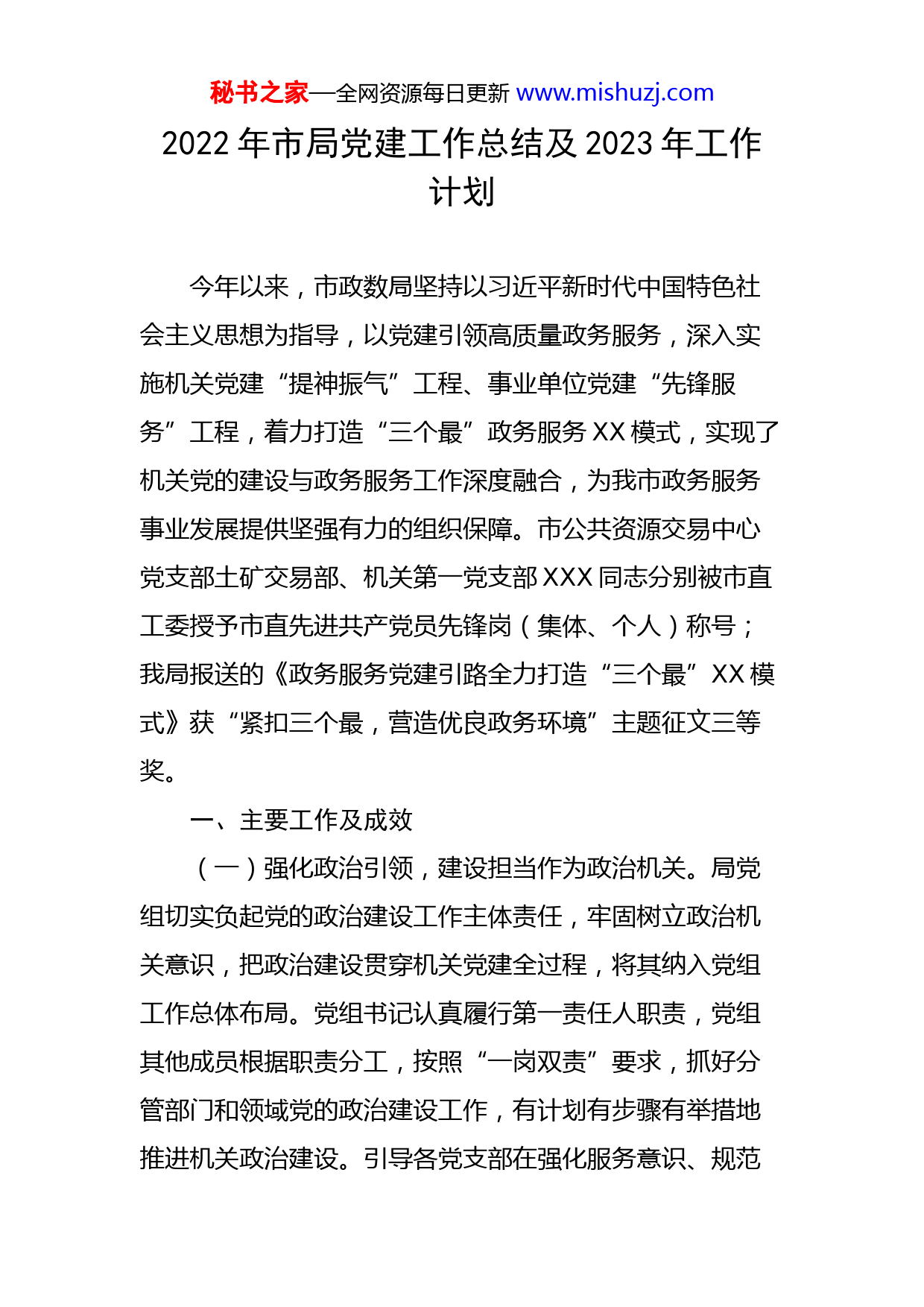 秘书之家—全网资源每日更新www.mishuzj.com2022年市局党建工作总结及2023年工作计划今年以来,市政数局坚持以习近平新时代中国特色社会主义思想为指导,以党建引领高质量政务服务,深入实施机关党建“提神振气”工程、事业单位党建“先锋服务”工程,着力打造“三个最”政务服务XX模式,实现了机关党的建设与政务服务工作深度融合,为我市政务服务事业发展提供坚强有力的组织保障。市公共资源交易中心党支部土矿交易部、机关第一党支部XXX同志分别被市直工委授予市直先进共产党员先锋岗(集体、个人)称号;我局报送的《政务服务党建引路全力打造“三个最”XX模式》获“紧扣三个最,营造优良政务环境”主题征文三等奖。一、主要工作及成效(一)强化政治引领,建设担当作为政治机关。局党组切实负起党的政治建设工作主体责任,牢固树立政治机关意识,把政治建设贯穿机关党建全过程,将其纳入党组工作总体布局。党组书记认真履行第一责任人职责,党组其他成员根据职责分工,按照“一岗双责”要求,抓好分管部门和领域党的政治建设工作,有计划有步骤有举措地推进机关政治建设。引导各党支部在强化服务意识、规范秘书之家—全网资源每日更新www.mishuzj.com服务标准、创新服务方式上进行创新。一是严格执行第一议题制度,将学习习近平新时代中国特色社会主义思想作为党组会、机关党委会、支委会的第一议题,深入学习习近平重要讲话、《习近平谈治国理政》第四卷,深入学习党的十九大和十九届历次全会精神,深入学习党的二十大精神等。二是切实落实“三会一课”制度。局领导率先垂范,带头讲党课,使大家深受启发和教育。各党支部书记也分别在所在支部作专题辅导讲课。同时,推动每名党员在“学习强国”学习平台开展常态化学习。三是深入开展“谈勤政、促廉洁、开新局”谈心谈话活动,进一步加强党员干部思想政治建设和作风建设。局党组书记、局长XX主持召开“谈勤政、促廉洁、开新局”谈心谈话专题党组(扩大)会议,跟班子成员及各科(室、中心)负责同志进行集体谈心谈话。四是深入开展学习宣传贯彻党的二十大精神系列活动。组织开展“十学联动”活动、“学金句谈体会”活动等,推动党的二十大精神在基层走深走实,进一步深刻领悟“两个确立”的决定性意义,切实增强“四个意识”、坚定“四个自信”、做到“两个维护”。(二)夯实基层基础,推动党建工作全面进步。深化模范机关创建活动,以规范化、标准化建设带动机关基层党组织建设的全面升级,实现党建活动、班子建设、组织生活、党员管理、党员发展、台账资料“六个规范化”。秘书之家—全网资源每日更新www.mishuzj.com一是开展清查整治突出问题规范党务工作的专项行动。机关党委召开由各党支部书记及党务工作者参加的清查整治突出问题规范党务工作专题培训会,扎实做好自查摸排工作,确保清查整治工作覆盖每个党支部,实现全覆盖、无遗漏。二是加强组织建设,有序发展新党员。顺利完成机关第一党支部、第二党支部的换届选举工作;对党支部书记和业务骨干进行培训,进一步加强党务干部素质;把好党员“入口关”,有序发展新党员。今年共吸收预备党员X名,培养入党积极分子X名,同时有X名预备党员按期转为正式党员,为党组织输入“新鲜血液”。三是开展党支部评星定级工作。制订了所属事业单位、机关党支部评星定级工作实施方案,积极创新党支部评星定级,在打造特色标杆政务服务中不断激励党支部和党员争“级”追“星”。四是开展党建联建共建活动。局机关党支部、市公共资源交易中心党支部分别与XX联通、XX电信公司党支部开展党建联建共建活动,并签订党建联建共建协议,共同提升党建工作水平。五是扎实推动“擎旗筑堡垒、亮徽当先锋”活动深入开展。结合“双报到”活动,组织党员志愿者到挂钩联系村XX区XX村及XX区XX社区开展志愿活动。党员注册使用市“先锋引领双报到”党建平台,推动单位党组织及在职党员到社区报到开展服务常态化制度化。目前,已全部完成到指定辖属社区的注册报秘书之家—全网资源每日更新www.mishuzj.com到,注册报到在职党员70人。(三)转变思想作风,促进党建与业务新融合。紧扣“三个最”,深入开展“三亮一创”(亮身份、亮职责、亮承诺,创党员先锋岗)系列机关党建活动,实现办事更有速度、服务更有温度,有效促进了“党建+政务服务”的新融合。一是抓“党建+窗口建设”。开展“窗口党员佩党徽、亮身份、做承诺”活动;探索监督前移、设置“协调帮办”,同时指导县级政务服务中心和市社保分中心设立了“协调帮办”窗口,使我市成为全省第二个从上到下设置此类窗口的地级市。二是抓“党建+实践活动”。巩固深化党史学习教育成果,持续开展“党旗在基层一线高高飘扬”和“我为群众办实事”实践活动,通过组织党员现场观摩党建引领营造优良政务环境典型案例、参与“一站式”服务、“沉浸式”现场体验服务窗口办事流程、学习先进党员模范等形式,着力打造“有效率”的模范机关。三是抓“党建+指尖民生服务”。全力打造具有XX地方特色的“X省事”“X商通”等XX专版,积极拓展“便民利企”渠道,推进更多政务服务事项“掌上查”“指尖办”。目前,“X省事”XX版已接入1021