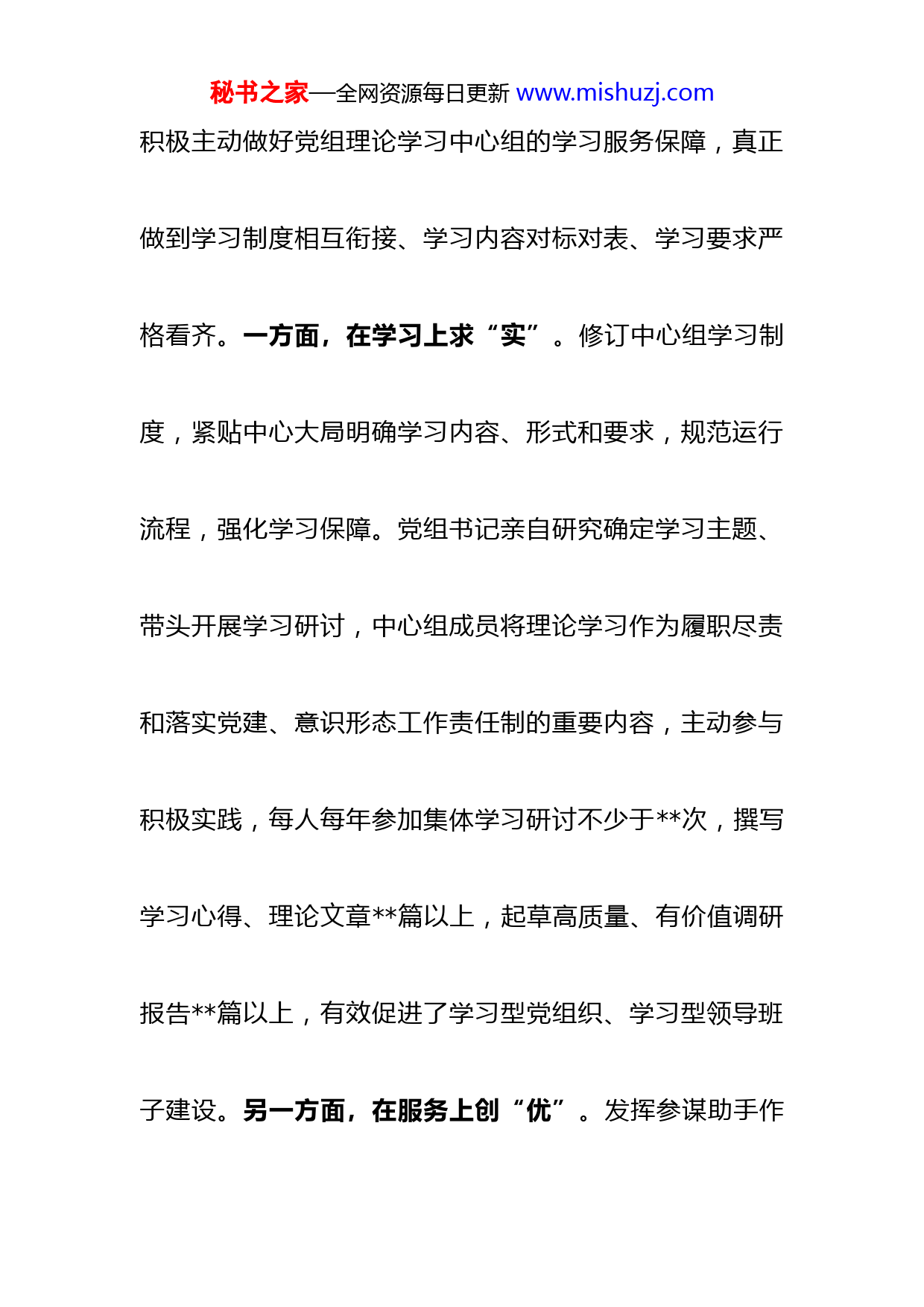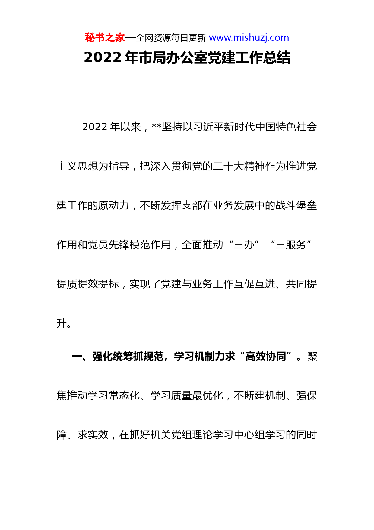 秘书之家—全网资源每日更新www.mishuzj.com2022年市局办公室党建工作总结2022年以来,坚持以习近平新时代中国特色社会主义思想为指导,把深入贯彻党的二十大精神作为推进党建工作的原动力,不断发挥支部在业务发展中的战斗堡垒作用和党员先锋模范作用,全面推动“三办”“三服务”提质提效提标,实现了党建与业务工作互促互进、共同提升。一、强化统筹抓规范,学习机制力求“高效协同”。聚焦推动学习常态化、学习质量最优化,不断建机制、强保障、求实效,在抓好机关党组理论学习中心组学习的同时秘书之家—全网资源每日更新www.mishuzj.com积极主动做好党组理论学习中心组的学习服务保障,真正做到学习制度相互衔接、学习内容对标对表、学习要求严格看齐。一方面,在学习上求“实”。修订中心组学习制度,紧贴中心大局明确学习内容、形式和要求,规范运行流程,强化学习保障。党组书记亲自研究确定学习主题、带头开展学习研讨,中心组成员将理论学习作为履职尽责和落实党建、意识形态工作责任制的重要内容,主动参与积极实践,每人每年参加集体学习研讨不少于次,撰写学习心得、理论文章篇以上,起草高质量、有价值调研报告篇以上,有效促进了学习型党组织、学习型领导班子建设。另一方面,在服务上创“优”。发挥参谋助手作秘书之家—全网资源每日更新www.mishuzj.com用,承办党组理论学习中心组活动组织工作,健全完善学习制度,制定年度学习计划,落实议题收集、选题设定、成果转化机制,周密做好集体学习、交流研讨和专题调研的组织服务保障,助推党组理论学习中心组打造学习“示范班”。二、聚焦重点精选题,学习内容力求“多元管用”。以学习贯彻习近平新时代中国特色社会主义思想为主线,精心策划学习板块,在学深、学全、管用上持续用力。一是常学必学内容。对习近平总书记重要著作、党的二十大精神、习近平总书记对甘肃重要讲话和指示精神等重点学习内容,分解篇目、列出专题,有计划、有步骤组织学习研秘书之家—全网资源每日更新www.mishuzj.com讨。特别是结合党史学习教育,确定个专题个篇目,读原著、学原文,做到了深学细悟、常学常新、入脑入心二是跟学最新理论。建立学习议题动态调整机制,对习近平总书记最新重要讲话精神,党中央国务院、省委省政府和市委作出的新部署、出台的新文件,及时列入集体学习议题库,第一时间开展学习研讨,推动学习跟进、认识跟进、行动跟进。三是研学自主选题。聚焦上级决策部署、全市经济社会发展中心工作、群众关切的热点难点、“三办”“三服务”相关专业知识,找准方向,策划选题,先后确定“两个确立”、“五个坚持”、意识形态、九大重秘书之家—全网资源每日更新www.mishuzj.com点产业链、创建全国文明城市等学习专题和调研课题,深学细悟,把握精髓,共同研讨贯彻落实的具体举措。三、多措并举拓路径,学习方式力求“灵活多样”。立足办公室工作实际,创新方式方法,强化效果导向,不断增强学习的吸引力和针对性。一是解读研讨。坚持把集体学习研讨作为学习主要形式,每项学习内容由中心组成员领学,党组书记解读并提出贯彻落实要求;专题学习安排班子成员逐个发言谈认识谈体会,在互动交流、思想碰撞中相互启迪、凝聚共识,提升学习效果;重点课题邀请市委党校、市委讲师团教授作专业讲解、辅导报告,加深理解领悟。二是专题调研。把调查研究作为理论联系实际的秘书之家—全网资源每日更新www.mishuzj.com重要途径,开展重点课题全员调研活动,围绕县域经济、工业强市战略、生态产业化产业生态化等主题,由班子成员带队,深入基层、深入群众,掌握情况、研机析理,深化对理论的学习领会,提升推动工作的能力水平。三是现场研学。注重用好红色文化资源,先后组织中心组成员赴红军长征纪念馆、革命遗址、烈士主题广场等革命遗址参观瞻仰,开展体验式、情景式现场教学,在鲜活生动的课堂中接受思想洗礼、感悟思想伟力。四是拓宽渠道。中心组成员积极参加崆峒大讲堂和各类宣讲会、报告会、网络培训,充分利用“学习强国”“甘肃党建”平台和媒秘书之家—全网资源每日更新www.mishuzj.com体微信公众号,深入开展自学,做到了学有所悟、学有所得。四、真学善用助发展,学习效果力求“知行合一”。突出学以增信、学以致用,努力将学习成果内化为精神追求外化为自觉行动。一是学出坚定信仰。通过学党史、学理论、学讲话,中心组成员不断增强党性修养,提高政治判断力、政治领悟力、政治执行力,坚定捍卫“两个确立”坚决做到“两个维护”。二是学出使命担当。从党的理论路线方针政策和习近平总书记的关注牵挂中瞄定“国之大者”,从国内外形势的发展变化中跟进大事要事,始终聚焦“三新一高”,服务发展大局,担好“责之重者”、当秘书之家—全网资源每日更新www.mishuzj.com好示范表率。三是学出能力作风。把习近平总书记“五个坚持”重要指示渗透落实到“三办”“三服务”全过程,着眼更高站位统筹协调、更宽视野参谋辅政、更实作风优化服务、更大力度督促落实,把中央和省市的决策部署转化为具体举措、具体任务、具体行动,切实当好“坚强前哨”和“巩固后院”。尽管做了一定的工作,取得了一定成效,但与中央