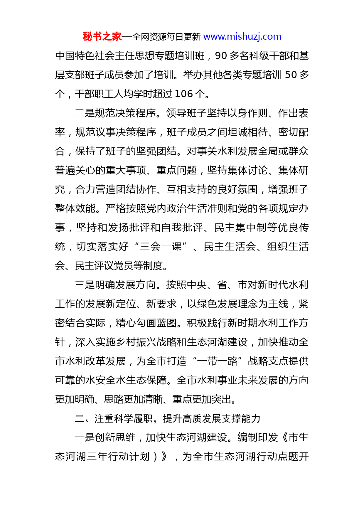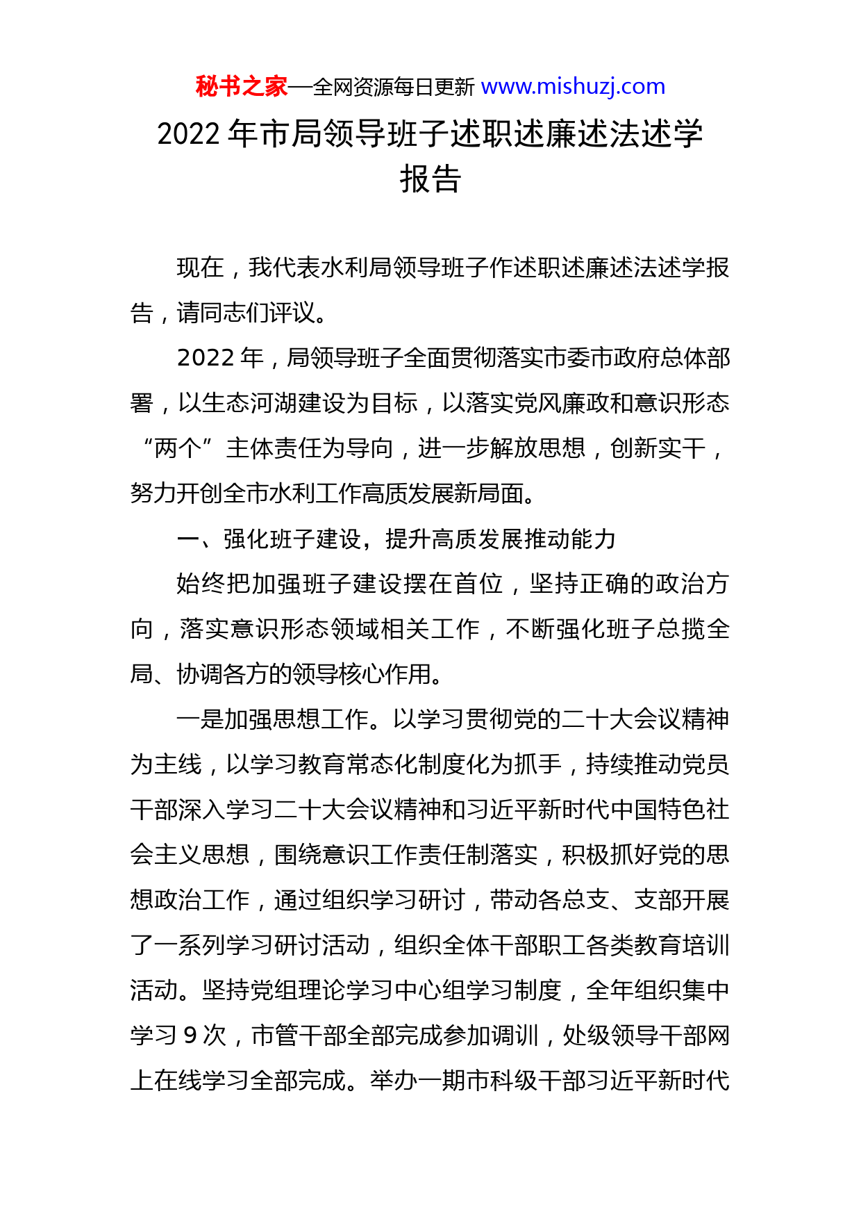 秘书之家—全网资源每日更新www.mishuzj.com2022年市局领导班子述职述廉述法述学报告现在,我代表水利局领导班子作述职述廉述法述学报告,请同志们评议。2022年,局领导班子全面贯彻落实市委市政府总体部署,以生态河湖建设为目标,以落实党风廉政和意识形态“两个”主体责任为导向,进一步解放思想,创新实干,努力开创全市水利工作高质发展新局面。一、强化班子建设,提升高质发展推动能力始终把加强班子建设摆在首位,坚持正确的政治方向,落实意识形态领域相关工作,不断强化班子总揽全局、协调各方的领导核心作用。一是加强思想工作。以学习贯彻党的二十大会议精神为主线,以学习教育常态化制度化为抓手,持续推动党员干部深入学习二十大会议精神和习近平新时代中国特色社会主义思想,围绕意识工作责任制落实,积极抓好党的思想政治工作,通过组织学习研讨,带动各总支、支部开展了一系列学习研讨活动,组织全体干部职工各类教育培训活动。坚持党组理论学习中心组学习制度,全年组织集中学习9次,市管干部全部完成参加调训,处级领导干部网上在线学习全部完成。举办一期市科级干部习近平新时代秘书之家—全网资源每日更新www.mishuzj.com中国特色社会主任思想专题培训班,90多名科级干部和基层支部班子成员参加了培训。举办其他各类专题培训50多个,干部职工人均学时超过106个。二是规范决策程序。领导班子坚持以身作则、作出表率,规范议事决策程序,班子成员之间坦诚相待、密切配合,保持了班子的坚强团结。对事关水利发展全局或群众普遍关心的重大事项、重点问题,坚持集体讨论、集体研究,合力营造团结协作、互相支持的良好氛围,增强班子整体效能。严格按照党内政治生活准则和党的各项规定办事,坚持和发扬批评和自我批评、民主集中制等优良传统,切实落实好“三会一课”、民主生活会、组织生活会、民主评议党员等制度。三是明确发展方向。按照中央、省、市对新时代水利工作的发展新定位、新要求,以绿色发展理念为主线,紧密结合实际,精心勾画蓝图。积极践行新时期水利工作方针,深入实施乡村振兴战略和生态河湖建设,加快推动全市水利改革发展,为全市打造“一带一路”战略支点提供可靠的水安全水生态保障。全市水利事业未来发展的方向更加明确、思路更加清晰、重点更加突出。二、注重科学履职,提升高质发展支撑能力一是创新思维,加快生态河湖建设。编制印发《市生态河湖三年行动计划)》,为全市生态河湖行动点题开秘书之家—全网资源每日更新www.mishuzj.com篇。总投资4.47亿元的湿地公园项目进展迅速,主园区地形塑造、旅游道路铺设,水系连通,景观绿化等工程基本完成。城市尾水生态湖净化工程一、二期已完成,通过“积淤筑岛”等工程措施,创新建设鸟类生态栖息地,打造水生态环保名片,实现水利、环保、旅游多方共赢发展。X治理工程前期工作已全面启动,这也是我市创新建立“投资→产出→再投入”水利投入循环模式的样板。项目实施后将实现防洪、供水保障、水景观和经济融合产出等四大目标。二是持续发力,做好城区“三水文章”。市区河道基本轮浚一遍,建成排水通道等关键节点补短板工程,主城区防洪除涝标准整体达到二十年一遇。城市水生态建设目标初步实现,黑臭水体治理成效显著,全市35条入海河道全面消除劣五类水。三是以点带面,打造河长治河样板。市、县、乡三级河长累计巡河次数和交办事项均过万次,交办事项完成率超90%。编制实施省级河道重点治理实施方案和主要入海河流综合治理行动方案。在市本级、各县区、每个乡镇都重点打造一条样板河道,引领河长制工作全面快速推进。集中进行“三乱”专项整治,清理违章种植1.7万亩,清理违章圈圩1.68万亩,河湖水岸面貌和水质得到有效改善。秘书之家—全网资源每日更新www.mishuzj.com四是加大力度,推进城乡水利建设。重大水利工程建设完成投资16.44亿元。一些省重点工程进展迅速。农村水利累计投资5.59亿元,疏浚县乡河道458公里,整治村庄河塘745条(面),新增农村饮水受益人口22.78万人,完成农业水价综合改革227.82万亩。新增高效节水灌溉面积4.04万亩,全市累计面积已达50万亩,完成移民后扶项目年度投资2.16亿元,54个省定经济薄弱移民村脱贫攻坚项目全部完成。五是科学调度,防汛防旱成效显著。上游沂沭泗流域出现强降雨过程,致使我市大流量行洪,泄洪流量达到5680立方米/秒,超历史峰值。行洪期间,全市各地超前部署,科学调度,确保了上游洪水安全过境。同时在省厅支持下,全年调引江淮水43.2亿立方米,有效地保障了我市居民饮用水和工农业生产用水需求。三、加强依法行政,提升高质发展保障能力紧紧围绕法治建设,深入推进依法治水,不断规范水行政执法工作机制,全面提高依法行政水平和依法履职能力。一是依法执政能力得到加强。局党组中心组带头尊法学法守法用法,增强依法执政意识。认真学习《宪法》《党章》等党纪法规和相关条例,积极组织和参加领导干部普法学习活动。努力把学法知法贯穿工作和生活始终,秘书之家—全网资源每日更新www.mishuzj.com不断提高法律意识和法学知识。要求班子成员要提高法治思维,做到办事依法、遇事找法、解决问题用法、化解矛盾靠法,真正使学法守法用法成为