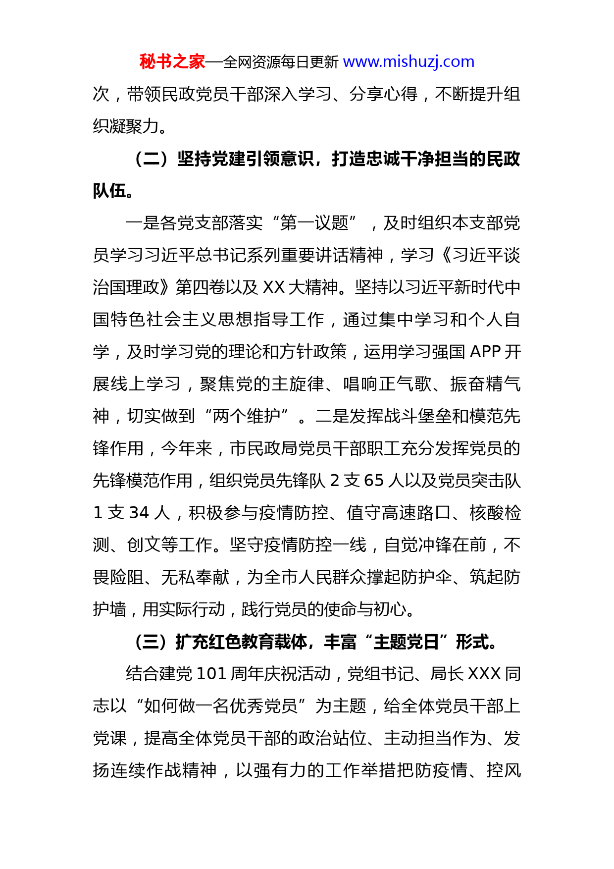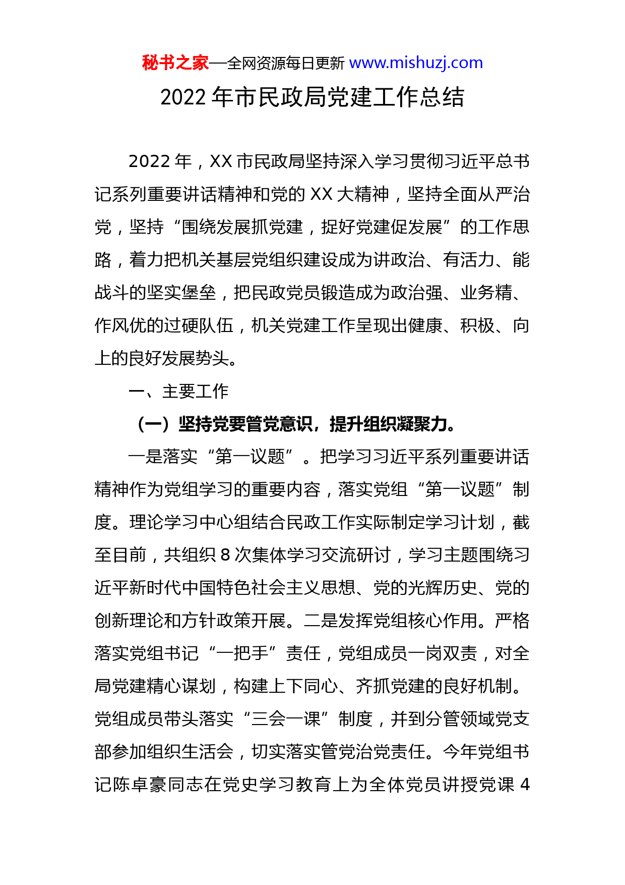 秘书之家—全网资源每日更新www.mishuzj.com2022年市民政局党建工作总结2022年,XX市民政局坚持深入学习贯彻习近平总书记系列重要讲话精神和党的XX大精神,坚持全面从严治党,坚持“围绕发展抓党建,捉好党建促发展”的工作思路,着力把机关基层党组织建设成为讲政治、有活力、能战斗的坚实堡垒,把民政党员锻造成为政治强、业务精、作风优的过硬队伍,机关党建工作呈现出健康、积极、向上的良好发展势头。一、主要工作(一)坚持党要管党意识,提升组织凝聚力。一是落实“第一议题”。把学习习近平系列重要讲话精神作为党组学习的重要内容,落实党组“第一议题”制度。理论学习中心组结合民政工作实际制定学习计划,截至目前,共组织8次集体学习交流研讨,学习主题围绕习近平新时代中国特色社会主义思想、党的光辉历史、党的创新理论和方针政策开展。二是发挥党组核心作用。严格落实党组书记“一把手”责任,党组成员一岗双责,对全局党建精心谋划,构建上下同心、齐抓党建的良好机制。党组成员带头落实“三会一课”制度,并到分管领域党支部参加组织生活会,切实落实管党治党责任。今年党组书记陈卓豪同志在党史学习教育上为全体党员讲授党课4秘书之家—全网资源每日更新www.mishuzj.com次,带领民政党员干部深入学习、分享心得,不断提升组织凝聚力。(二)坚持党建引领意识,打造忠诚干净担当的民政队伍。一是各党支部落实“第一议题”,及时组织本支部党员学习习近平总书记系列重要讲话精神,学习《习近平谈治国理政》第四卷以及XX大精神。坚持以习近平新时代中国特色社会主义思想指导工作,通过集中学习和个人自学,及时学习党的理论和方针政策,运用学习强国APP开展线上学习,聚焦党的主旋律、唱响正气歌、振奋精气神,切实做到“两个维护”。二是发挥战斗堡垒和模范先锋作用,今年来,市民政局党员干部职工充分发挥党员的先锋模范作用,组织党员先锋队2支65人以及党员突击队1支34人,积极参与疫情防控、值守高速路口、核酸检测、创文等工作。坚守疫情防控一线,自觉冲锋在前,不畏险阻、无私奉献,为全市人民群众撑起防护伞、筑起防护墙,用实际行动,践行党员的使命与初心。(三)扩充红色教育载体,丰富“主题党日”形式。结合建党101周年庆祝活动,党组书记、局长XXX同志以“如何做一名优秀党员”为主题,给全体党员干部上党课,提高全体党员干部的政治站位、主动担当作为、发扬连续作战精神,以强有力的工作举措把防疫情、控风秘书之家—全网资源每日更新www.mishuzj.com险、保安全、守稳定等各项工作落实到位,切实扛起民政领域安全工作责任。为进一步增强老党员的荣誉感、归属感,传递组织的温暖,为1名光荣在党50年老党员颁发纪念章。同时结合“喜迎党的XX大精神”,组织党员干部探访红色教育基地、接受革命精神洗礼。8月18日,党支部组织党员干部到XX镇XXX村XXX故居,跟着革命先辈的脚步感悟XXXX夫妇在XX启文明、办教育、兴水利、战瘟疫,不辞辛劳、呕心沥血为各族人民谋福祉的生动形象;感受到了XXX同志用平凡一生铸就了不平凡的人生经历;感受到了XXX、XXX等老一辈革命者大公无私、一切为群众着想、艰苦奋斗、顽强拼搏的革命精神;更让大家感受到了美好幸福生活的来之不易。(四)加强思想淬炼,认真学习党史。一是形式多样学习党史。各党支部开展集中学习,以党支部书记讲党课、自学等方式认真学习习近平总书记重要文章、重要讲话系列精神,认真学习《习近平谈治国理政》第四卷、“党的XX大”重要精神等。各党支部集中学习共45次。另外党组书记讲党课4次,纪委监委驻市民政局纪检监察组组长讲党课1次,理论中心学习组专题集中学习研讨8次。二是积极开展“我为群众办实事”实践活动。契合“520”氛围,婚姻登记处践行“民政为民”、“民政爱民”的工作理念,全面实行预约制,提前线上为秘书之家—全网资源每日更新www.mishuzj.com预约新人预审预录证件,加快办证流程。同时,充分发挥党建引领民政业务的作用,保证各项民生实事落实到位,达到惠民利民的效果。三是营造良好学习教育氛围。从民政学习党史实际工作出发,每月至少报送一篇简报到市委党史学习教育小组办公室简报组,并将党史学习教育简报公开上墙、上网站,营造积极的党史学习教育氛围。二、不足之处一是对党员个人开展学习情况监督不严。对党员干部开展自学情况监督手段不足,学情掌握不全,个别党员存在工学矛盾,造成自学成效不够好。二抓党建方式方法不多。党建工作思维不够新颖,思路还不宽广,党建工作特色、亮点不多。三、工作计划一提高政治站位,加强纪律教育。带领全系统党员干部深入学习领会习近平总书记重要系列讲话、《习近平谈治国理政》第四卷、认真学习贯彻XX大精神。做到从严治党,教育引导党员干部提高拒腐防变和抵御风险的能力,始终保持艰苦奋斗、勤俭节约的本色,做到守纪律、讲规矩、走正道、扬正气。二学用结合,推进党史学习教育走深走实。把党史学习教育与学习贯彻习近平总书记系列重要讲话精神,以及党的“XX大”结合起来、与“我为群众办实事”、与推动秘书之家—全网资源每日更新www.mishuzj.com本职工作结合起来,坚持问题导向、开展对照检查,不断提高履职尽责能力,力