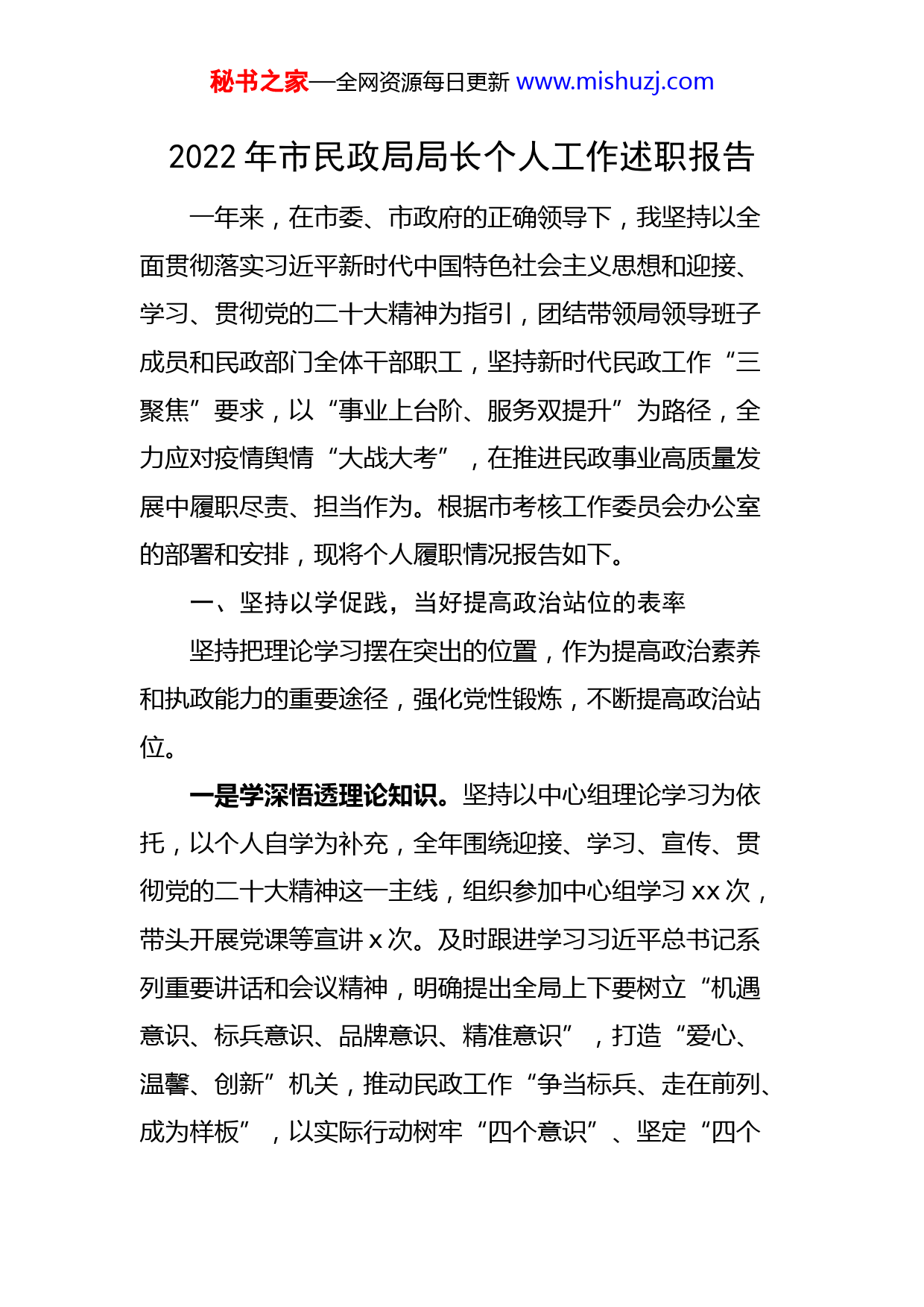 秘书之家—全网资源每日更新www.mishuzj.com2022年市民政局局长个人工作述职报告一年来,在市委、市政府的正确领导下,我坚持以全面贯彻落实习近平新时代中国特色社会主义思想和迎接、学习、贯彻党的二十大精神为指引,团结带领局领导班子成员和民政部门全体干部职工,坚持新时代民政工作“三聚焦”要求,以“事业上台阶、服务双提升”为路径,全力应对疫情舆情“大战大考”,在推进民政事业高质量发展中履职尽责、担当作为。根据市考核工作委员会办公室的部署和安排,现将个人履职情况报告如下。一、坚持以学促践,当好提高政治站位的表率坚持把理论学习摆在突出的位置,作为提高政治素养和执政能力的重要途径,强化党性锻炼,不断提高政治站位。一是学深悟透理论知识。坚持以中心组理论学习为依托,以个人自学为补充,全年围绕迎接、学习、宣传、贯彻党的二十大精神这一主线,组织参加中心组学习xx次,带头开展党课等宣讲x次。及时跟进学习习近平总书记系列重要讲话和会议精神,明确提出全局上下要树立“机遇意识、标兵意识、品牌意识、精准意识”,打造“爱心、温馨、创新”机关,推动民政工作“争当标兵、走在前列、成为样板”,以实际行动树牢“四个意识”、坚定“四个秘书之家—全网资源每日更新www.mishuzj.com自信”、践行“两个维护”,坚决在思想上政治上行动上同以习近平同志为核心的党中央保持高度一致。围绕疫情防控常态化、落实“六稳六保”任务、市域治理创新、民生改善专项行动等方面的新精神新要求,加强领学促学督学,以“关键少数”带动“绝大多数”,不断提高把方向、谋大局、定政策、促改革的能力。二是规范党内政治生活。坚持和健全民主集中制,严格执行局党委会制度和党委议事规则。明确实施月度例会制度,按月总结梳理上级精神及安排部署的贯彻落实情况,压茬部署推动新思想新理论新要求落实落地。坚持重大决策征求意见、重大问题集中讨论、重大事项集体决策,保证议事决策言路畅通、公正透明。认真落实党内各项组织生活制度,坚持以普通党员身份参加党员活动日活动,带头落实“三会一课”制度,上党课x次、召开民主生活会x次。注重党建品牌引领,在全局确立“党建+服务惠民365”党建品牌,不断锤炼党性修养,提升党建形象。三是牢牢把控意识形态。坚持把意识形态工作融入到党建工作、目标考核、全局干部职工教育培训、党风廉政建设等活动中,层层压紧压实意识形态工作责任,推动工作机制进一步完善。始终密切关注党员干部思想状况,提高新形势下做好意识形态工作的准确性和全面性。落实网络舆情发布责任制,结合全局焦点、发展难点、改革痛点、秘书之家—全网资源每日更新www.mishuzj.com社会热点,加强对群众思想和舆论问题的引导,牢牢把握意识形态主导权、话语权。今年来,在国家和省市等新闻媒体刊发稿件xx余篇,其中被“学习强国”采用x篇;局门户网站编发信息xx多篇,推送编发微信微博xx多条、召开新闻发布会x场,广泛宣传民生保障新政策、新作为。带头走进行风热线直播间,面对面为群众答疑解惑,接受社会监督。四是坚持修身立德为本。带头走好群众路线,开展对口结对帮扶工作,并送去xx万元帮扶资金;一线指导基层辖区内服务机构疫情防控xx次;开展基层业务调研xx次,以上率下示范建设爱民、务实、清廉、创新的机关干部队伍。积极落实惠民利民新举措,创新实施养老社区等一批为民实事,优先解决好养老、殡葬等群众最关心最直接最现实的利益问题。。带头践行社会主义核心价值观,在日常工作中严于律已,以身作则,关心集体,扎实工作;在家庭中,坚持耕读传家、勤俭持家的家风,严格要求子女和家人。二、坚持以勤履职,当好增进群众福祉的表率紧紧围绕市委、市政府决策部署,统筹推动基本民生保障兜底兜牢、基本社会服务创新创优、基层社会治理提质提效,圆满完成各项目标任务。秘书之家—全网资源每日更新www.mishuzj.com一是坚持补短板强保障。健全完善城乡低保兜底制度安排,明确做好民生兜底保障与乡村振兴有效衔接的重点任务和工作要求,全力推进“老幼困残”服务对象保障标准提标扩面,低保在城乡一体化的基础上提高至xx元,补差率提升至xx%。特困供养集中和分散供养年标准最高分别达xx元、xx元,孤儿集中和分散供养月标准分别达xx元、xx元。为xx万残疾人发放“两项补贴”xx亿元,及时救助xx人次流乞人员。充分发挥动态管理、核减刚性支出、重点保障、缓退渐退、临时救助“五个一批”作用,将易致贫返贫或脱贫边缘户全部录入平台跟踪监测,xx人参照“单人户”纳入低保。完善“临时救助+”的“急诊救助”模式,加强临时救助和其他社会救助政策的衔接。今年来,实施临时救助xx万人次,发放临时救助金xx万元,人均救助水平xx元。疫情期间,创新实施“六个一”暖心工程,用心落实一系列“防疫情、保民生、守阵地”政策,及时启动xx次物价补贴,累计发放基本保障和支出防疫捐助资金xx亿元。二是坚持盯重点抓落实。依照“一院一策”“一案一策”方式,实施挂牌督战,全面完成xx家养老机构消防审验整治任务,全市xx家养老机构驶入提质“快车道”。社会资本投资养老服务业踊跃,在建高端养老项目xx个,一批养老综合体、养老社区、医养康