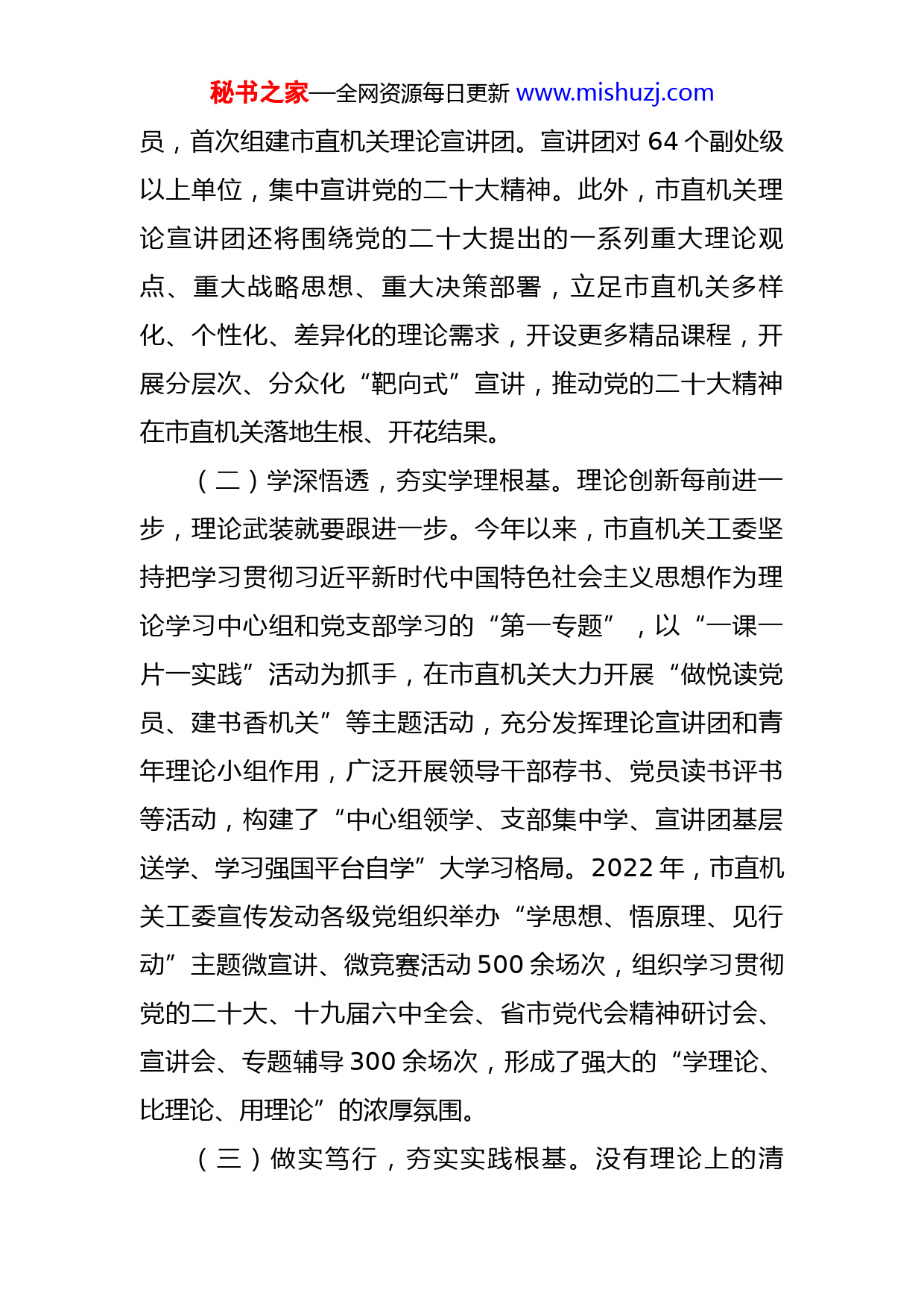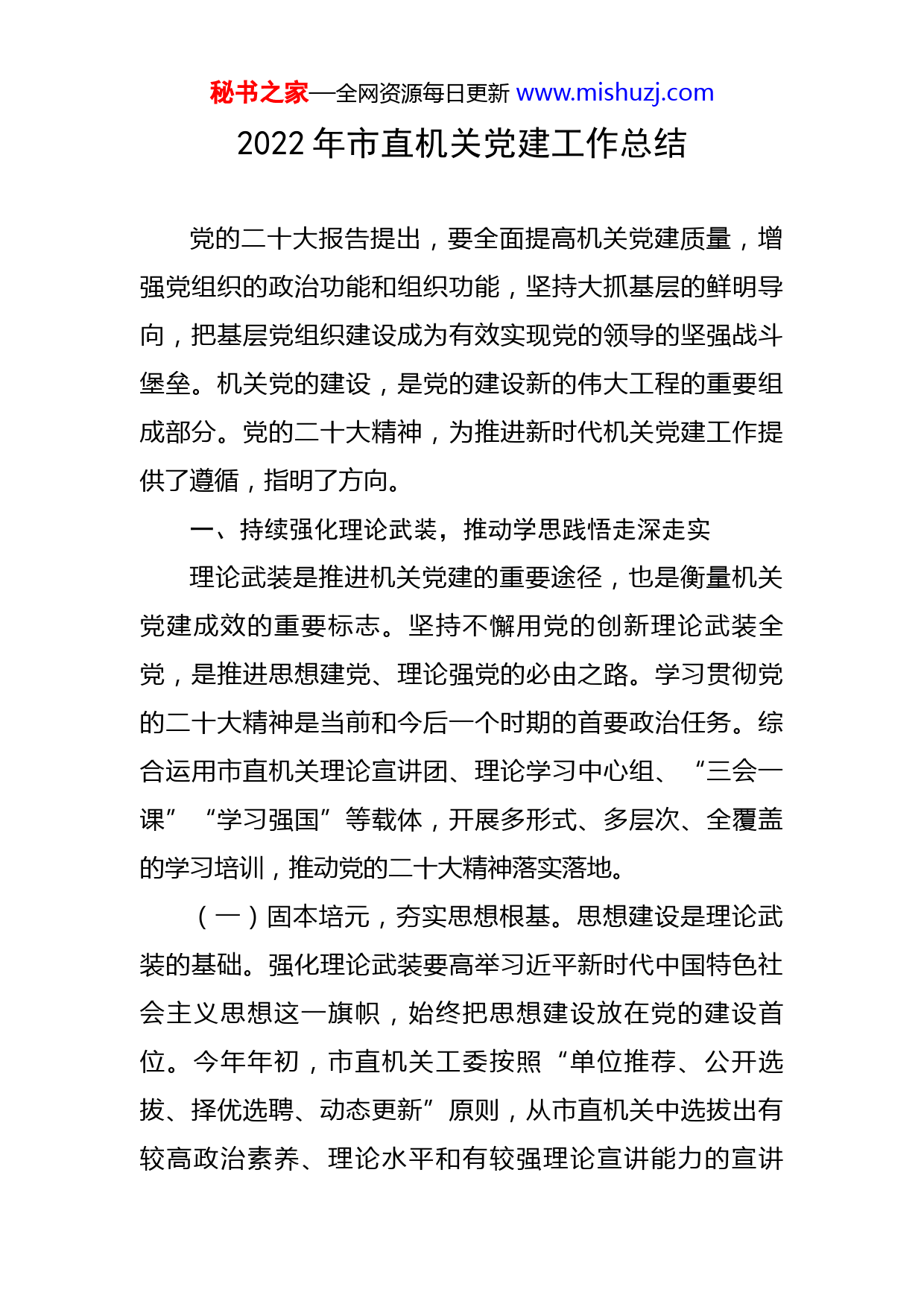 秘书之家—全网资源每日更新www.mishuzj.com2022年市直机关党建工作总结党的二十大报告提出,要全面提高机关党建质量,增强党组织的政治功能和组织功能,坚持大抓基层的鲜明导向,把基层党组织建设成为有效实现党的领导的坚强战斗堡垒。机关党的建设,是党的建设新的伟大工程的重要组成部分。党的二十大精神,为推进新时代机关党建工作提供了遵循,指明了方向。一、持续强化理论武装,推动学思践悟走深走实理论武装是推进机关党建的重要途径,也是衡量机关党建成效的重要标志。坚持不懈用党的创新理论武装全党,是推进思想建党、理论强党的必由之路。学习贯彻党的二十大精神是当前和今后一个时期的首要政治任务。综合运用市直机关理论宣讲团、理论学习中心组、“三会一课”“学习强国”等载体,开展多形式、多层次、全覆盖的学习培训,推动党的二十大精神落实落地。(一)固本培元,夯实思想根基。思想建设是理论武装的基础。强化理论武装要高举习近平新时代中国特色社会主义思想这一旗帜,始终把思想建设放在党的建设首位。今年年初,市直机关工委按照“单位推荐、公开选拔、择优选聘、动态更新”原则,从市直机关中选拔出有较高政治素养、理论水平和有较强理论宣讲能力的宣讲秘书之家—全网资源每日更新www.mishuzj.com员,首次组建市直机关理论宣讲团。宣讲团对64个副处级以上单位,集中宣讲党的二十大精神。此外,市直机关理论宣讲团还将围绕党的二十大提出的一系列重大理论观点、重大战略思想、重大决策部署,立足市直机关多样化、个性化、差异化的理论需求,开设更多精品课程,开展分层次、分众化“靶向式”宣讲,推动党的二十大精神在市直机关落地生根、开花结果。(二)学深悟透,夯实学理根基。理论创新每前进一步,理论武装就要跟进一步。今年以来,市直机关工委坚持把学习贯彻习近平新时代中国特色社会主义思想作为理论学习中心组和党支部学习的“第一专题”,以“一课一片一实践”活动为抓手,在市直机关大力开展“做悦读党员、建书香机关”等主题活动,充分发挥理论宣讲团和青年理论小组作用,广泛开展领导干部荐书、党员读书评书等活动,构建了“中心组领学、支部集中学、宣讲团基层送学、学习强国平台自学”大学习格局。2022年,市直机关工委宣传发动各级党组织举办“学思想、悟原理、见行动”主题微宣讲、微竞赛活动500余场次,组织学习贯彻党的二十大、十九届六中全会、省市党代会精神研讨会、宣讲会、专题辅导300余场次,形成了强大的“学理论、比理论、用理论”的浓厚氛围。(三)做实笃行,夯实实践根基。没有理论上的清秘书之家—全网资源每日更新www.mishuzj.com醒,就没有政治上的坚定。市直机关工委坚持将政治建设贯穿思想建设的全过程,深入推进“三表率一模范”机关建设,推动党史学习教育常态化长效化,用好XX红色资源,不断加强机关党员干部政治机关意识教育、理想信念教育、对党忠诚教育,教育引导党员干部增强政治意识,带头捍卫“两个确立”,坚决做到“两个维护”。今年以来,市直机关工委先后以“强政治、带头抓落实;强思想、带头学理论;强组织、带头严纪律;强服务、带头勇担当;强队伍、带头当标兵”为建设内容,积极开展“喜迎二十大、聚力中心化”系列实践活动,组织指导市直机关各级党组织深入基层一线、项目一线、产业一线,开展“四个一”行动。即:开展一次底线工作大排查,开展一次底线工作大宣传,开展一次底线工作大整治,开展一次底线工作大检查。排查自建房安全、社会治安、城市管理等方面隐患问题3900余个,通过采取责任包干、评估检查、责令整改、停业整顿等方式,已“稀释”、化解各类隐患问题3500多个。二、“双建”标准为抓手,夯实基层党建工作基础在深入总结机关党建工作规律、经验的基础上,市直机关工委对标对表,今年在市直机关开展机关党建标准化建设和清廉机关建设(以下简称“双建”工作),这项具有长远战略意义的系统工程,进一步夯实基层党建工作基秘书之家—全网资源每日更新www.mishuzj.com础。(一)“六化”标准擘画“全景图”。围绕“政治、思想、组织、党风廉政、队伍、制度”六大建设,建立起“六化”标准蓝图,明确和细化70个正向标准和100个负面问题,对机关党建各项具体工作的步骤、要求等要素进行精准“画图”,让机关基层党组织循标尺、知戒尺。配套编发《XX机关党建标准化建设工作手册》,厘清工作职责,规范工作程序,切实解决了机关党组织“干什么、怎么干、谁来干”的问题。制定下发《XX市清廉机关建设考核评估细则》,明确重点任务、工作步骤,细化考核评估标准,严格考评结果运用,实行挂图作战、按项施工,推动清廉机关建设有序进行。(二)星级支部撬动“内生力”。坚持“五化”标准,以提高基层党组织政治功能和组织功能为重点,扎实推行星级党支部创建管理,推进机关基层党组织整建提质工作,严格执行换届提醒督促制度,督促指导200多个基层党组织按期换届,400余名80后、90后干部加入机关党务干部队伍,基层基础进一步夯实。目前,市直机关党支部创星率达100%。其中,四星级以上党支部占比60%以上。同时,严格落实“月月有提示、季季有调研、半年有讲评”工作制度,编印《机关党务知识应