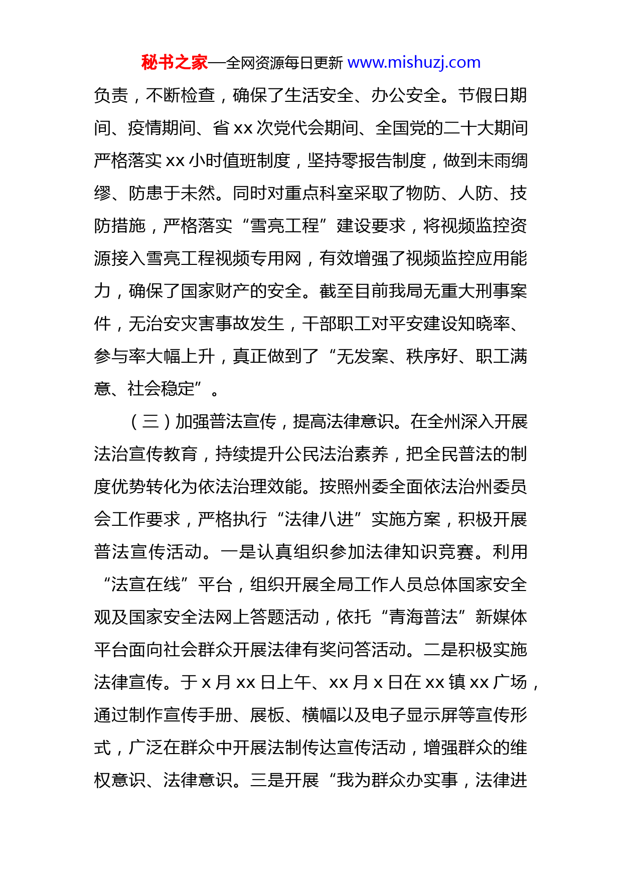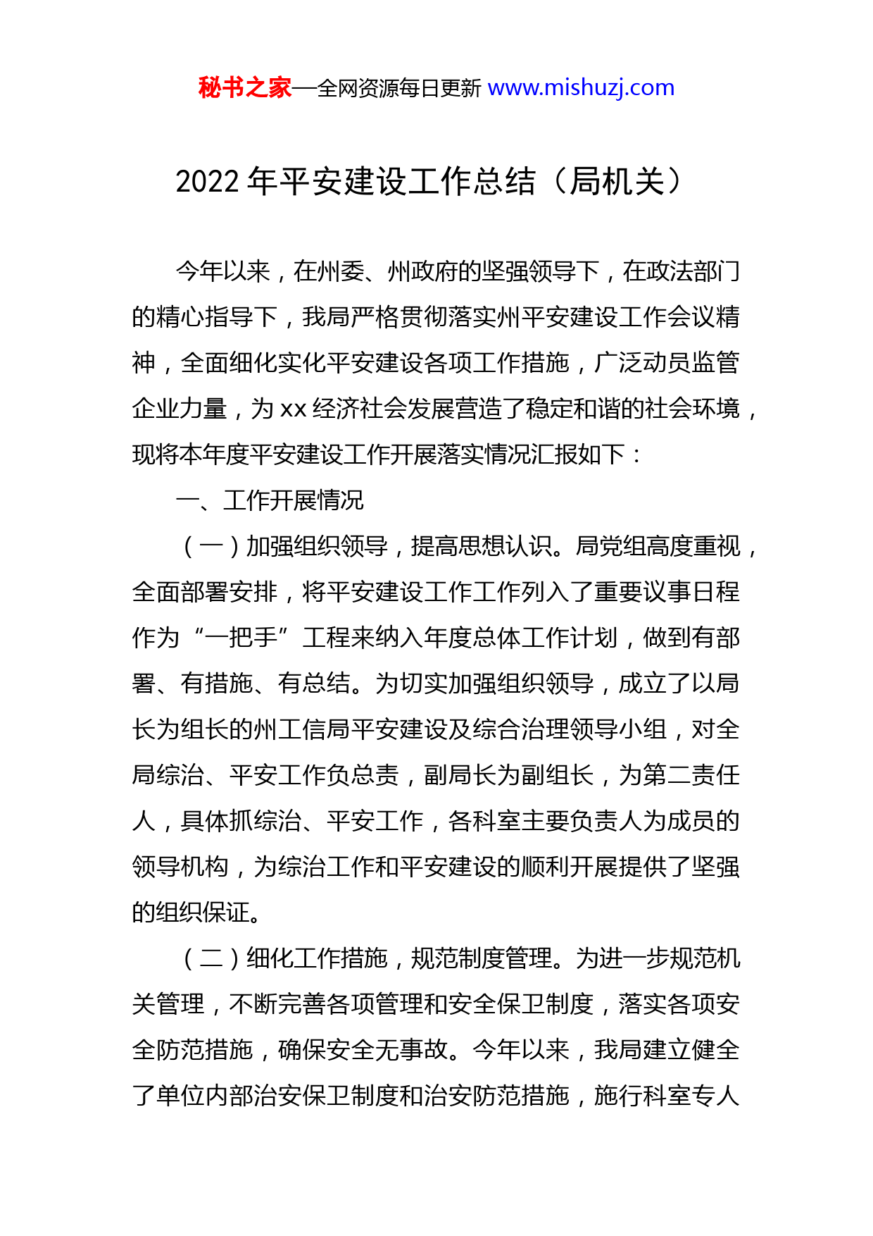 秘书之家—全网资源每日更新www.mishuzj.com2022年平安建设工作总结(局机关)今年以来,在州委、州政府的坚强领导下,在政法部门的精心指导下,我局严格贯彻落实州平安建设工作会议精神,全面细化实化平安建设各项工作措施,广泛动员监管企业力量,为xx经济社会发展营造了稳定和谐的社会环境,现将本年度平安建设工作开展落实情况汇报如下:一、工作开展情况(一)加强组织领导,提高思想认识。局党组高度重视,全面部署安排,将平安建设工作工作列入了重要议事日程作为“一把手”工程来纳入年度总体工作计划,做到有部署、有措施、有总结。为切实加强组织领导,成立了以局长为组长的州工信局平安建设及综合治理领导小组,对全局综治、平安工作负总责,副局长为副组长,为第二责任人,具体抓综治、平安工作,各科室主要负责人为成员的领导机构,为综治工作和平安建设的顺利开展提供了坚强的组织保证。(二)细化工作措施,规范制度管理。为进一步规范机关管理,不断完善各项管理和安全保卫制度,落实各项安全防范措施,确保安全无事故。今年以来,我局建立健全了单位内部治安保卫制度和治安防范措施,施行科室专人秘书之家—全网资源每日更新www.mishuzj.com负责,不断检查,确保了生活安全、办公安全。节假日期间、疫情期间、省xx次党代会期间、全国党的二十大期间严格落实xx小时值班制度,坚持零报告制度,做到未雨绸缪、防患于未然。同时对重点科室采取了物防、人防、技防措施,严格落实“雪亮工程”建设要求,将视频监控资源接入雪亮工程视频专用网,有效增强了视频监控应用能力,确保了国家财产的安全。截至目前我局无重大刑事案件,无治安灾害事故发生,干部职工对平安建设知晓率、参与率大幅上升,真正做到了“无发案、秩序好、职工满意、社会稳定”。(三)加强普法宣传,提高法律意识。在全州深入开展法治宣传教育,持续提升公民法治素养,把全民普法的制度优势转化为依法治理效能。按照州委全面依法治州委员会工作要求,严格执行“法律八进”实施方案,积极开展普法宣传活动。一是认真组织参加法律知识竞赛。利用“法宣在线”平台,组织开展全局工作人员总体国家安全观及国家安全法网上答题活动,依托“青海普法”新媒体平台面向社会群众开展法律有奖问答活动。二是积极实施法律宣传。于x月xx日上午、xx月x日在xx镇xx广场,通过制作宣传手册、展板、横幅以及电子显示屏等宣传形式,广泛在群众中开展法制传达宣传活动,增强群众的维权意识、法律意识。三是开展“我为群众办实事,法律进秘书之家—全网资源每日更新www.mishuzj.com企业”宣传活动。我局普法工作小组于x月xx日、xx月xx日赴xx国投公司、西海投资公司、能源公司通过讲问结合的方式进行普法宣传活动。宣讲《国有资产法》《安全生产法》《民法典》等法律法规,并邀请专业法律顾问进行现场答疑,让企业职工更深的了解法律法规,为公司安全生产打下坚实的基础。四是全局干部职工积极参与学法普法活动,法宣在线积分均达到xxxx分以上,平均积分为xxxx分,年度国家工作人员法律知识考试全部合格。(四)积极开展市域社会治理现代化工作。持续深入思想认识,提高政治站位,充分认识开展市域社会治理现代化工作的重要意义,切实增强责任感和紧迫感,围绕“全面建、重点创、补短板、建机制”等重点任务,积极与州政法部门沟通,调整任务分工方案内的工作任务,今年x月,州政法部门重新印发《xx州州域社会治理现代化试点工作实施方案》。局党组高度重视,局负责人亲自安排部署,成立市域社会治理现代化工作领导小组,由局长任组长,全局干部职工共同参与,从“行业管理、安全生产、保煤供暖、考试保障、平安行业创建、清理拖欠账款、电信普遍服务、工业商贸领域矛盾排查”等八个切入点及各领域常态化扫黑除恶、指导四县开展市域社会治理两个基本工作方面对市域社会治理工作进行细化分解,起草了任务清单,全局干部职工主动认领任务分工,坚持以XJP新秘书之家—全网资源每日更新www.mishuzj.com时代中国特色社会主义思想为指导,全面落实省州委关于社会治理的决策部署,坚持和完善共建共治共享的社会治理制度,推进社会治理体系和治理能力现代化。今年xx月,州政法部门重新发下《xx州州域社会治理现代化试点工作指引分工》,要求我局从五个方面对工作进行细化分解,后收集相关资料后向州政法部门作专题汇报,得到充分指导肯定。目前,已完成市域社会治理现代化工作任务方案中xx%以上的目标任务,其余工作正在稳步推进中。(五)深入开展社会风险集中排查化解工作。我局以“事关民生无小事”为基本原则,多管齐下、强化措施,积极防止矛盾积聚、风险叠加,有效地化解了社会不稳定因素。一是紧紧围绕xx镇、xx城镇群众供暖民生问题,多方协调,登记车辆信息,确保了xx城镇xx工业园区xx煤场-xx镇唐xx电厂煤场“一路畅通”,供暖系统正常投入运行,完成了如期供暖的任务。二是主动作为,多次前往省国资委、省工信厅、省财政厅、省国投公司等相关部门对接xx有限责任公司拖欠xx名退休职工及x名职工的社保费事宜。经多方协调,2022年x月x日,缺口资金xxxxxxx.xx元已全部拨付至祁连县财政局社保费专户中,目前xx名退休职工的医保卡开通了结算功能,退