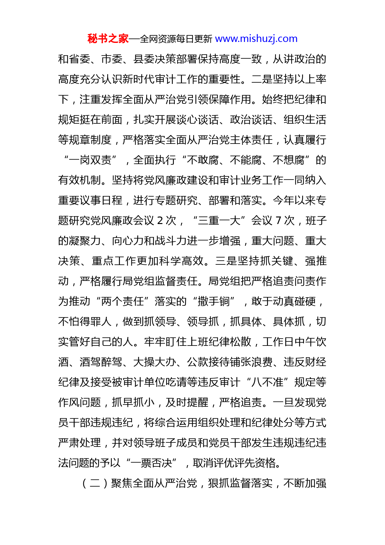 秘书之家—全网资源每日更新www.mishuzj.com2022年度下半年县审计局党风廉政建设工作报告2022年是党的XX大召开之年,是全面实施“十四五”规划的关键之年。今年以来,县审计局在县委县政府的坚强领导和派驻纪检组的监督指导下,坚持以习近平新时代中国特色社会主义思想为指引,深入贯彻党的十九大、十九历次全会精神,认真贯彻落实中央、省、市、县委关于党风廉政建设和反腐败工作的新部署新要求,始终保持政治定力,持续推进党风廉政建设向纵深发展。着力强化政治建设,扎实推进组织建设,全面深化队伍建设,为建设风清气正、廉洁高效的政治机关夯实基础。一、局党组履行全面从严治党主体责任及监督责任情况(一)聚焦政治机关建设,筑牢思想基础,严格落实党风廉政建设主体责任。一是坚持把政治建设放在首要位置,旗帜鲜明讲政治。通过集中学习和“三会一课”等形式,深入学习贯彻党的十九大、十九届历次全会精神和习近平总书记系列重要讲话精神,不断增强“四个意识”、坚定“四个自信”、做到“两个维护”,坚决捍卫“两个确立”,在政治立场、政治原则、政治观点和执行党的路线、方针、政策上,始终与以习近平同志为核心的党中央秘书之家—全网资源每日更新www.mishuzj.com和省委、市委、县委决策部署保持高度一致,从讲政治的高度充分认识新时代审计工作的重要性。二是坚持以上率下,注重发挥全面从严治党引领保障作用。始终把纪律和规矩挺在前面,扎实开展谈心谈话、政治谈话、组织生活等规章制度,严格落实全面从严治党主体责任,认真履行“一岗双责”,全面执行“不敢腐、不能腐、不想腐”的有效机制。坚持将党风廉政建设和审计业务工作一同纳入重要议事日程,进行专题研究、部署和落实。今年以来专题研究党风廉政会议2次,“三重一大”会议7次,班子的凝聚力、向心力和战斗力进一步增强,重大问题、重大决策、重点工作更加科学高效。三是坚持抓关键、强推动,严格履行局党组监督责任。局党组把严格追责问责作为推动“两个责任”落实的“撒手锏”,敢于动真碰硬,不怕得罪人,做到抓领导、领导抓,抓具体、具体抓,切实管好自己的人。牢牢盯住上班纪律松散,工作日中午饮酒、酒驾醉驾、大操大办、公款接待铺张浪费、违反财经纪律及接受被审计单位吃请等违反审计“八不准”规定等作风问题,抓早抓小,及时提醒,严格追责。一旦发现党员干部违规违纪,将综合运用组织处理和纪律处分等方式严肃处理,并对领导班子成员和党员干部发生违规违纪违法问题的予以“一票否决”,取消评优评先资格。(二)聚焦全面从严治党,狠抓监督落实,不断加强秘书之家—全网资源每日更新www.mishuzj.com机关作风建设。一是强化日常监督,积极支持派驻纪检组工作,邀请派驻纪检组领导参加局党组会议。坚持“每会一廉”,立足抓早抓小,开展谈心谈话活动。2022年,已经开展谈心谈话6人次,政治谈话5人次。给予一名党员领导干部党内严重警告处分。二是节日及时廉政提醒。重大节假日前开展提醒工作,进一步提高机关干部的纪律意识和廉政风险意识。三是推进“五型”政府建设和法治政府建设。持续整治“怕、慢、假、庸、散”等突出问题,在不断解决问题中深入改进作风建设,提升机关工作效能,确保务实、有序、高效,推进“五型”政府建设。四是严肃党内政治生活。严格执行《关于新形势下党内政治生活的若干准则》,坚持和落实“三会一课”、民主生活会、组织生活会、党员民主评议、主题党日活动等制度,用好批评和自我批评的武器,增强党内政治生活的政治性、时代性、原则性、战斗性。严格执行民主集中制、坚持“三重一大”事项集体决策,严格执行重大事项请示报告制度。(三)聚焦主责主业、做到依法履职强化审计监督。积极做好政府投资审计工作。今年以来,我局共完成固定资产投资审计(含审核监管)项目63个,送审金额7.04亿,核减1.06亿,核减率达15%。加强政府投资审计监管。督促建设单位加强内部管理,初审竣工结算,严把工秘书之家—全网资源每日更新www.mishuzj.com程竣工结算审计关。通过审阅工程档案,熟悉工程总体情况,掌握变更、签证等影响工程造价的主要事项,并与合同价进行对比分析,审查增加或减少投资的主要原因。重视现场实地测量和察看,抽查核对工程量,对设计变更、现场签证等导致增加工程造价的情况,严格按照规定执行。开展县本级财政预算执行审计和县直部门单位预算执行及决算草案审计。以推动建立现代财政制度、提高财政资金使用绩效、维护财政安全为目标,对县本级预算执行情况进行审计。通过审计发现县财政局及相关部门对照法律法规,预算执行中还存在一些需要进一步规范的问题,比如“三公”经费增长,预备费、国有土地收益基金设置不足,虚增财政收入等问题。开展经济责任审计工作。以促进本部门科学发展和领导干部守法守纪守规、廉政用权为目标,对34名县直单位领导干部开展经济责任审计,目前已完成10个项目。开展绩效审计。根据市审计局统一安排,对体育场馆管理运营情况和县生活污水处理厂运营情况开展审计调查。通过审计共发现了文体中心综合馆没有完成决算审核和办理资产移交手续、文体中心综合馆所有运营者,没有制定“安全管理责任制度”等