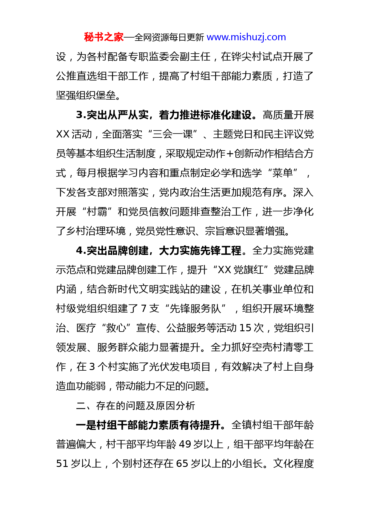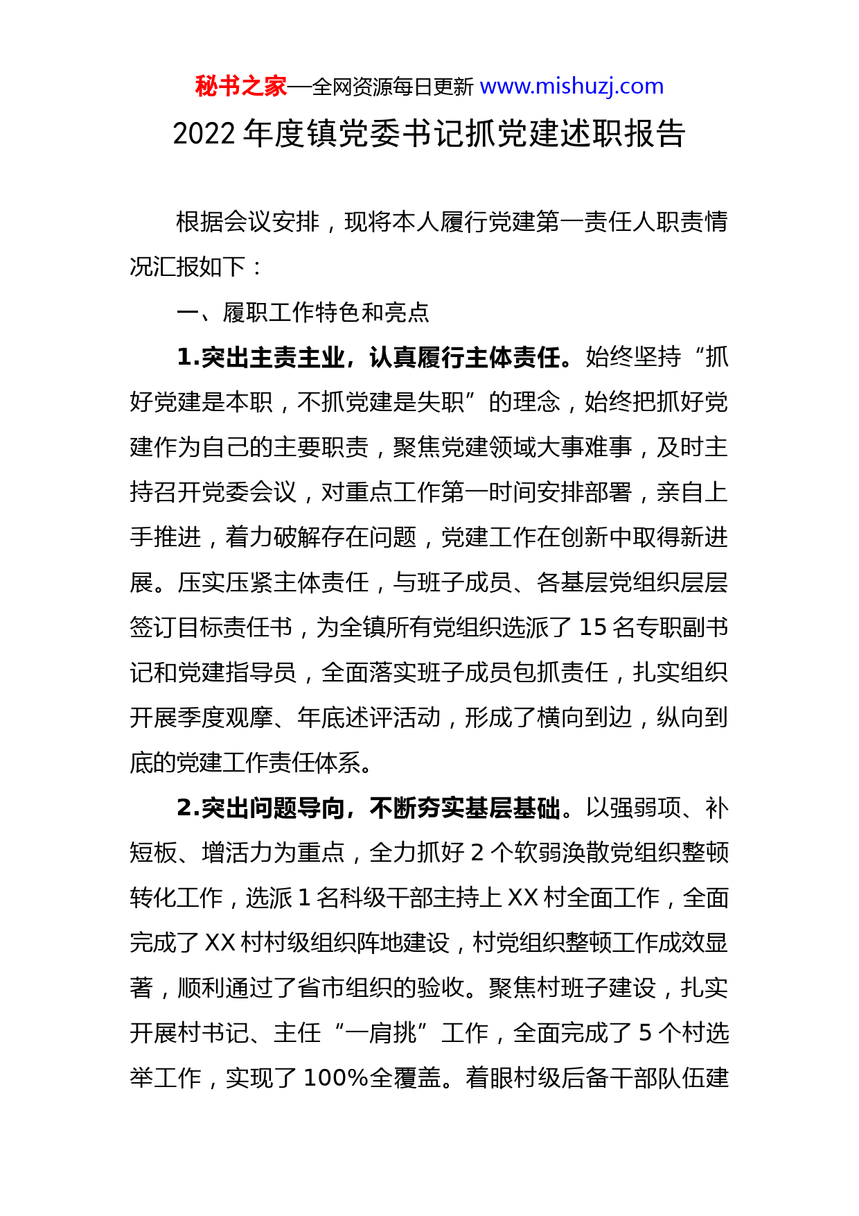 秘书之家—全网资源每日更新www.mishuzj.com2022年度镇党委书记抓党建述职报告根据会议安排,现将本人履行党建第一责任人职责情况汇报如下:一、履职工作特色和亮点1.突出主责主业,认真履行主体责任。始终坚持“抓好党建是本职,不抓党建是失职”的理念,始终把抓好党建作为自己的主要职责,聚焦党建领域大事难事,及时主持召开党委会议,对重点工作第一时间安排部署,亲自上手推进,着力破解存在问题,党建工作在创新中取得新进展。压实压紧主体责任,与班子成员、各基层党组织层层签订目标责任书,为全镇所有党组织选派了15名专职副书记和党建指导员,全面落实班子成员包抓责任,扎实组织开展季度观摩、年底述评活动,形成了横向到边,纵向到底的党建工作责任体系。2.突出问题导向,不断夯实基层基础。以强弱项、补短板、增活力为重点,全力抓好2个软弱涣散党组织整顿转化工作,选派1名科级干部主持上XX村全面工作,全面完成了XX村村级组织阵地建设,村党组织整顿工作成效显著,顺利通过了省市组织的验收。聚焦村班子建设,扎实开展村书记、主任“一肩挑”工作,全面完成了5个村选举工作,实现了100%全覆盖。着眼村级后备干部队伍建秘书之家—全网资源每日更新www.mishuzj.com设,为各村配备专职监委会副主任,在铧尖村试点开展了公推直选组干部工作,提高了村组干部能力素质,打造了坚强组织堡垒。3.突出从严从实,着力推进标准化建设。高质量开展XX活动,全面落实“三会一课”、主题党日和民主评议党员等基本组织生活制度,采取规定动作+创新动作相结合方式,每月根据学习内容和重点制定必学和选学“菜单”,下发各支部对照落实,党内政治生活更加规范有序。深入开展“村霸”和党员信教问题排查整治工作,进一步净化了乡村治理环境,党员党性意识、宗旨意识显著增强。4.突出品牌创建,大力实施先锋工程。全力实施党建示范点和党建品牌创建工作,提升“XX党旗红”党建品牌内涵,结合新时代文明实践站的建设,在机关事业单位和村级党组织组建了7支“先锋服务队”,组织开展环境整治、医疗“救心”宣传、公益服务等活动15次,党组织引领发展、服务群众能力显著提升。全力抓好空壳村清零工作,在3个村实施了光伏发电项目,有效解决了村上自身造血功能弱,带动能力不足的问题。二、存在的问题及原因分析一是村组干部能力素质有待提升。全镇村组干部年龄普遍偏大,村干部平均年龄49岁以上,组干部平均年龄在51岁以上,个别村还存在65岁以上的小组长。文化程度秘书之家—全网资源每日更新www.mishuzj.com普遍偏低,村干部中高中文化程度以上的只占40%,村干部电脑操作、文字处理等能力水平远远不能适应工作需要,影响了工作的高效开展。二是党建与产业发展还不紧密。在党建引领产业发展上,思路不活,办法不多,村级党组织领办集体经济组织和合作社的目前只有1个村,部分村集体经济薄弱,缺乏好的项目支撑,年收入5万元以上的只占60%。三是党建品牌培育推广力度不够。对新形势下党建工作研究还不深,谋划推进还不够有力,对已经形成的党建品牌提炼总结、宣传推广上做得不到位,还存在亮点不亮的现象。产生问题的原因:一是思想认识还有差距。对党建工作重要性认识还不足,平时把主要精力放在了重点工作、示范点建设上,对党建工作的抓落实力度不够,有重安排、轻落实的现象。二是创新意识不强。对党建工作学习研究不够,特别是对中央、省市出台的农村工作条例、四抓两整治等政策文件,学的不深不透,没有结合实际探索创新,工作按部就班多,创新不足。三是问题整改不及时。平时对党建工作强调的多,但跟踪落实少,对督查检查结果的运用没有切中要害,对部分党组织存在的主体责任落实不到位、村组干部后继乏人、镇村干部管理不严格、党员党性意识不强等问题,虽然认识到了问题的存在,但缺乏动真碰硬的勇气。秘书之家—全网资源每日更新www.mishuzj.com三、下一步工作思路和措施1.强化培养管理,打造高素质村组干部队伍。大力实施村组干部能力素质提升工程,着眼于村“三委”换届,及时出台村级后备干部管理意见,按照正职1名,副职2名的比例,在全镇选拔和储备15名村级后备干部,积极把一批政治素质高、年轻有活力、敢于担当的干部充实到村班子中,切实解决好村班子年龄偏大、能力不强的问题。全面推进“公推直选”组干部工作,选配一批45岁左右的年轻村民小组长,打通神经末梢,增强组干部活力。加强教育培训,在近期举办电脑操作班的基础上,年内再结合实际举办乡村治理、依法行政等培训班5期,组织村组干部到周边XX等地观摩学习,不断提高村组干部新形势下农村工作能力。2.强化引领示范,激发党建工作活力。坚持抓党建、强产业、促增收,持续深化党建引领“三链建设”方式,加大党组织领办合作组织力度,引导5个村党支部全部牵头成立合作经济组织,大力发展设施蔬菜、水产养殖、草食畜牧等新兴产业,培育壮大XX韭菜、长茄、螃蟹、小龙虾等特色农业品牌,提升党组织引领产业发展、推动农民增收的示范效应。积极争取项目资金,持续壮大村级集体经济,力争年内集体经济收入5万元以上的村达到80%以上,解决好村党组织无钱办事的难题。秘书之家—全网资源每日更新www.mishuzj.com3.强化教育管理,促进党