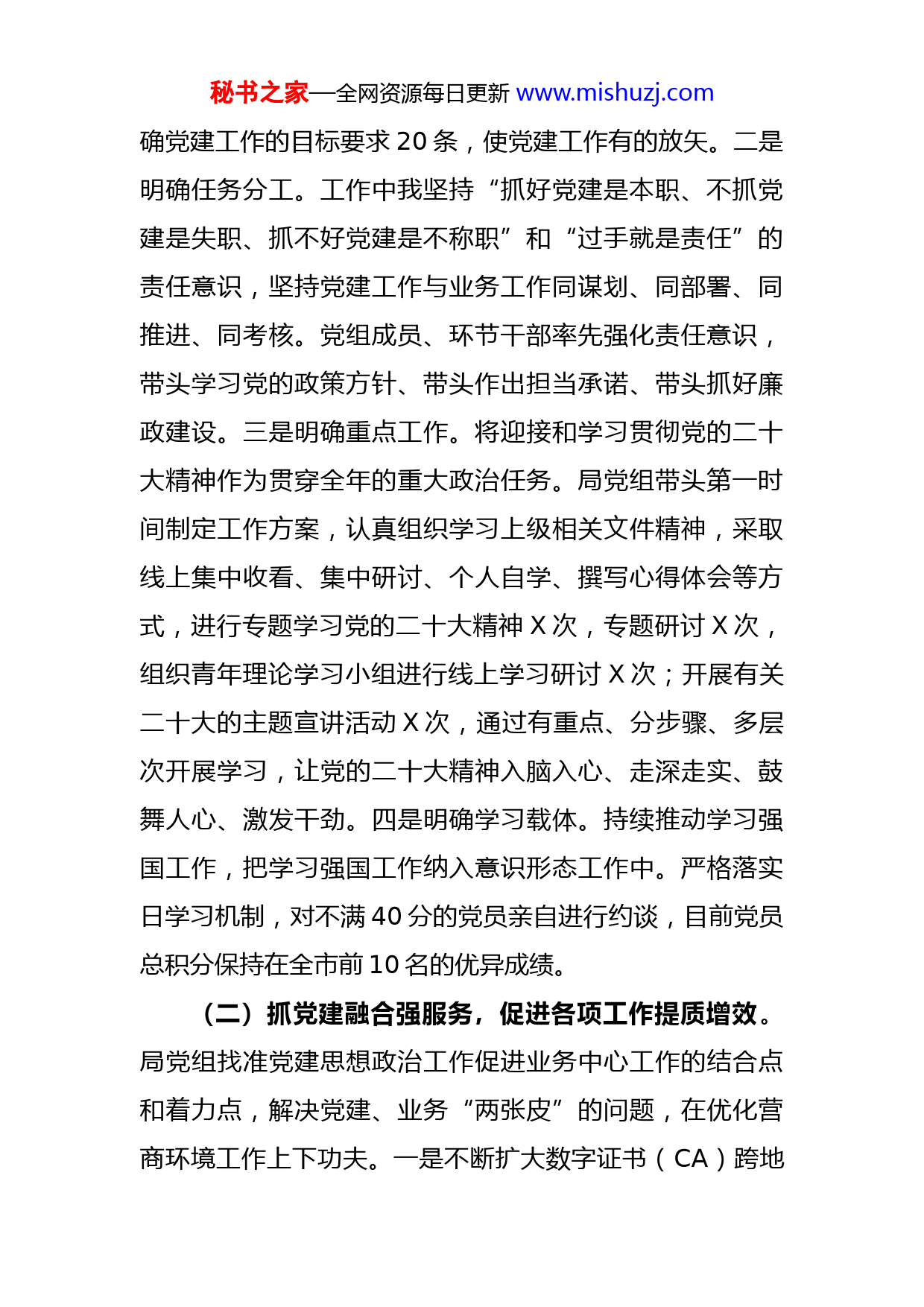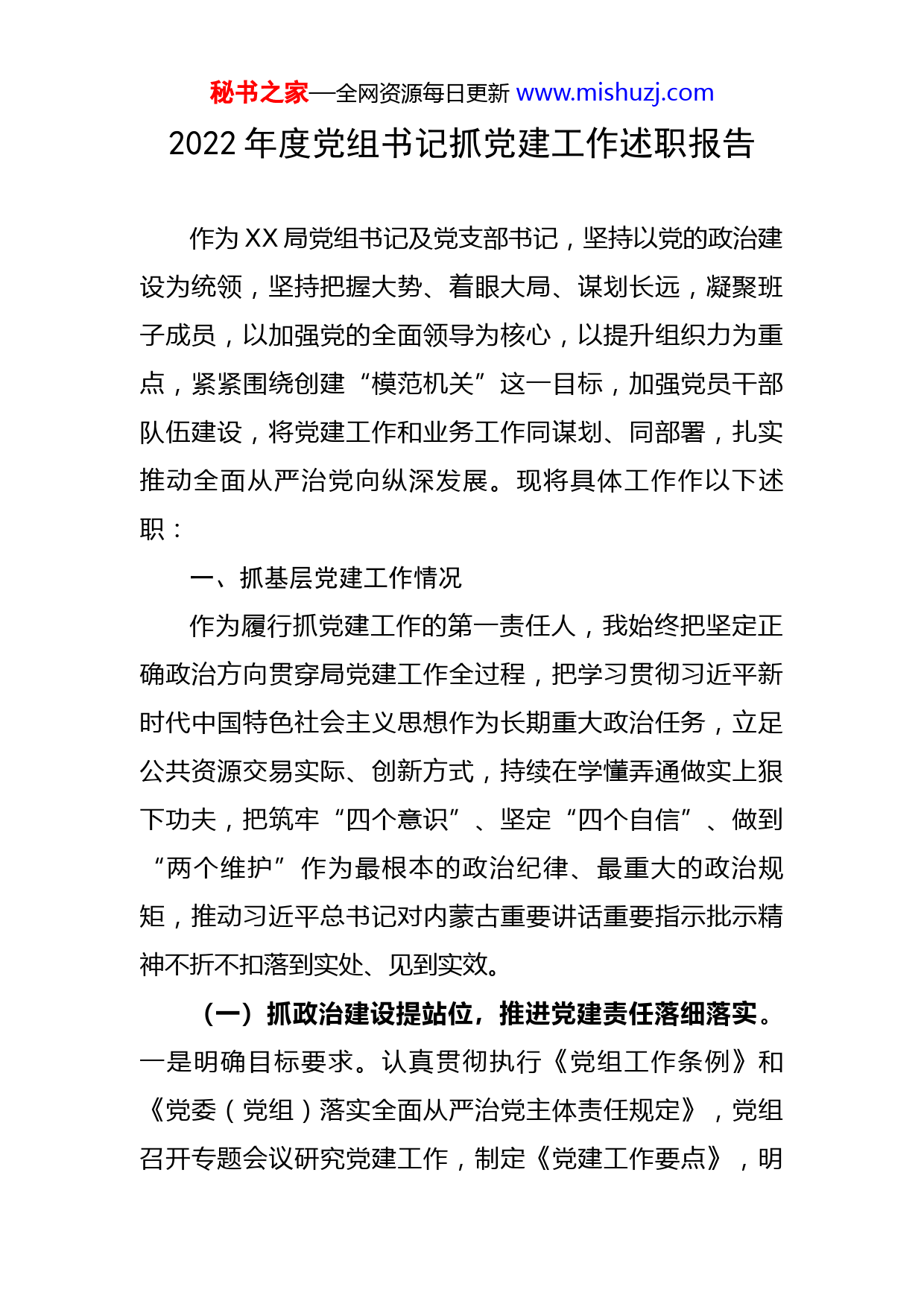 秘书之家—全网资源每日更新www.mishuzj.com2022年度党组书记抓党建工作述职报告作为XX局党组书记及党支部书记,坚持以党的政治建设为统领,坚持把握大势、着眼大局、谋划长远,凝聚班子成员,以加强党的全面领导为核心,以提升组织力为重点,紧紧围绕创建“模范机关”这一目标,加强党员干部队伍建设,将党建工作和业务工作同谋划、同部署,扎实推动全面从严治党向纵深发展。现将具体工作作以下述职:一、抓基层党建工作情况作为履行抓党建工作的第一责任人,我始终把坚定正确政治方向贯穿局党建工作全过程,把学习贯彻习近平新时代中国特色社会主义思想作为长期重大政治任务,立足公共资源交易实际、创新方式,持续在学懂弄通做实上狠下功夫,把筑牢“四个意识”、坚定“四个自信”、做到“两个维护”作为最根本的政治纪律、最重大的政治规矩,推动习近平总书记对内蒙古重要讲话重要指示批示精神不折不扣落到实处、见到实效。(一)抓政治建设提站位,推进党建责任落细落实。一是明确目标要求。认真贯彻执行《党组工作条例》和《党委(党组)落实全面从严治党主体责任规定》,党组召开专题会议研究党建工作,制定《党建工作要点》,明秘书之家—全网资源每日更新www.mishuzj.com确党建工作的目标要求20条,使党建工作有的放矢。二是明确任务分工。工作中我坚持“抓好党建是本职、不抓党建是失职、抓不好党建是不称职”和“过手就是责任”的责任意识,坚持党建工作与业务工作同谋划、同部署、同推进、同考核。党组成员、环节干部率先强化责任意识,带头学习党的政策方针、带头作出担当承诺、带头抓好廉政建设。三是明确重点工作。将迎接和学习贯彻党的二十大精神作为贯穿全年的重大政治任务。局党组带头第一时间制定工作方案,认真组织学习上级相关文件精神,采取线上集中收看、集中研讨、个人自学、撰写心得体会等方式,进行专题学习党的二十大精神X次,专题研讨X次,组织青年理论学习小组进行线上学习研讨X次;开展有关二十大的主题宣讲活动X次,通过有重点、分步骤、多层次开展学习,让党的二十大精神入脑入心、走深走实、鼓舞人心、激发干劲。四是明确学习载体。持续推动学习强国工作,把学习强国工作纳入意识形态工作中。严格落实日学习机制,对不满40分的党员亲自进行约谈,目前党员总积分保持在全市前10名的优异成绩。(二)抓党建融合强服务,促进各项工作提质增效。局党组找准党建思想政治工作促进业务中心工作的结合点和着力点,解决党建、业务“两张皮”的问题,在优化营商环境工作上下功夫。一是不断扩大数字证书(CA)跨地秘书之家—全网资源每日更新www.mishuzj.com区、跨平台互认范围。二是与XXXX局联合出台《关于进一步规范房屋建筑和市政基础设施工程招标投标工作的通知》。三是制定《XX电子保函管理办法(试行)》。截止2022年12月底,我市XX平台共开立投标保证电子保函XXXX笔,服务企业XXXX余家,累计减少企业资金占用XXXX亿元,有效降低企业投标成本,充分释放企业现金流。(三)抓组织建设强活力,提升机关党建工作能力。一是严肃党内政治生活,高标准开展民主生活会和组织生活。按照《全市各领域党支部规范化建设指导意见》,严格落实市委组织部、市直机关工委的工作部署,严格执行“三会一课”制度,抓好年度民主生活会、组织生活会、民主评议党员工作的开展。二是创建模范机关,深化“最强党支部”创建。结合全市“最强党支部”提质升级方案,将“最强党支部”建设与“模范机关建设”工作相融合,进一步强化党支部标准化规范化建设。三是常态化开展“我为群众办实事”实践活动。结合工作实际,将党史学习教育常态化、长效化真正落实到为民办实事上来。与11家党建共建单位签订共建协议,把疫情防控、经济建设、促民族团结进步、“三城同创”等重点工作作为党组织结对共建、结对帮扶的重要任务。通过举办创城消夏晚会、慰问社区困难群众、宣讲党课等形式,形成长效化包秘书之家—全网资源每日更新www.mishuzj.com联机制,将“我为群众办实事”工作落到实处。四是在疫情防控中切实发挥支部的战斗堡垒作用。疫情期间本人在市疫情指挥部,全封闭管理,利用线上亲自部署疫情防控工作,第一时间落实市委、市政府疫情防控要求,带领班子成员率先垂范、靠前指挥,与全体党员干部同向发力、高效协作,切实把党的二十大精神落实在行动上、体现在工作中。在包联工作中,与社区包容聚力,形成合力,主动建立沟通联动机制,加入X个社区群,了解社区实际困难,亮明身份,宣讲政策,精准解决社区困难。协调红十字会、共建单位、爱心企业,先后X次向包联社区进行捐赠;共成立XXX支党员“先锋队”、X支青年志愿服务队、XX名包联干部持续参于包联社区疫情防控工作。与此同时,派出X名青年党员干部参加了新城区、玉泉区青年突击队。我局XXX名党员干部(含聘用人员)全部严格落实“双报道”制度,参与到XX余个居住地社区疫情防控工作。期间,利用公众号宣传抗疫一线先进事迹,将专项党费慰问工作落到实处,传递党组织温暖,党员干部职工深受鼓舞。X名工作人员受到市直机关工委和双报到居住地社区的通报表扬。二、2022年度基层党建“书记项目”特色亮点工作(一)以党建为引