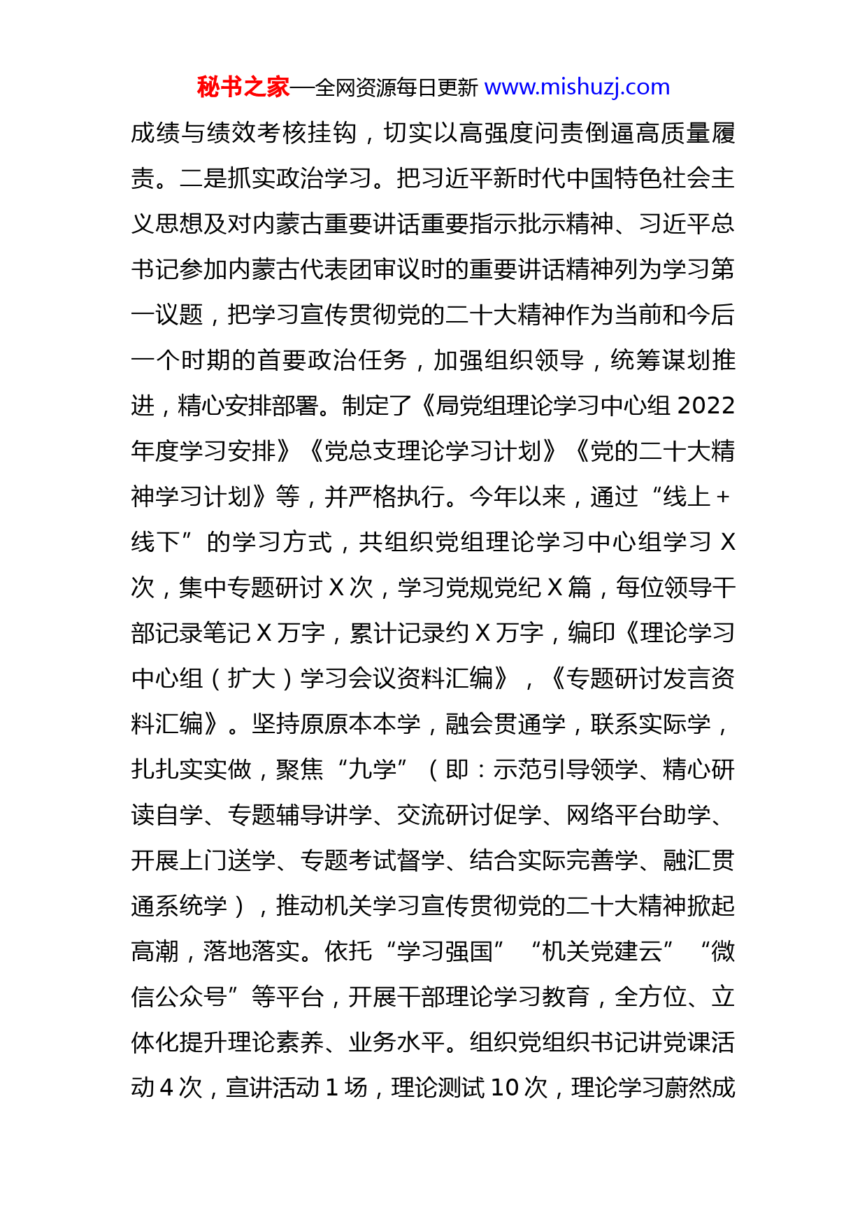 秘书之家—全网资源每日更新www.mishuzj.com2022年度某党组书记抓基层党建工作述职报告2022年,党总支以党的建设为统领,坚持以习近平新时代中国特色社会主义思想为指导,认真学习宣传贯彻党的二十大精神,严格按照新时代党的建设要求,以推进“五大行动”为抓手,强化“最强党支部”提质升级,深入开展创建北疆模范机关和“两个示范点”创建活动,聚焦重点,创新方法,努力建设一流机关,培育一流作风,创造一流业绩,打造一流队伍,推动党建工作与政务服务工作深度融合,为绿色高质量发展提供坚实保障。现将一年来抓党建工作情况述职如下:一、工作开展情况(一)以政治建设为“魂”,筑牢信念过硬的“压舱石”始终坚持正确政治方向,牢固树立“四个意识”,坚定“四个自信”,做到“两个维护”。一是抓好主责主业。制定了全面从严治党年度任务清单,落实党组抓党建主体责任,党组书记带头抓,分管领导具体抓,其他班子成员严格履行“一岗双责”。将党建工作与业务工作同谋划、同部署、同推进、同考核,建立《党组书记抓基层党建述职评议制度》等从严治党工作制度X项,把党建工作秘书之家—全网资源每日更新www.mishuzj.com成绩与绩效考核挂钩,切实以高强度问责倒逼高质量履责。二是抓实政治学习。把习近平新时代中国特色社会主义思想及对内蒙古重要讲话重要指示批示精神、习近平总书记参加内蒙古代表团审议时的重要讲话精神列为学习第一议题,把学习宣传贯彻党的二十大精神作为当前和今后一个时期的首要政治任务,加强组织领导,统筹谋划推进,精心安排部署。制定了《局党组理论学习中心组2022年度学习安排》《党总支理论学习计划》《党的二十大精神学习计划》等,并严格执行。今年以来,通过“线上+线下”的学习方式,共组织党组理论学习中心组学习X次,集中专题研讨X次,学习党规党纪X篇,每位领导干部记录笔记X万字,累计记录约X万字,编印《理论学习中心组(扩大)学习会议资料汇编》,《专题研讨发言资料汇编》。坚持原原本本学,融会贯通学,联系实际学,扎扎实实做,聚焦“九学”(即:示范引导领学、精心研读自学、专题辅导讲学、交流研讨促学、网络平台助学、开展上门送学、专题考试督学、结合实际完善学、融汇贯通系统学),推动机关学习宣传贯彻党的二十大精神掀起高潮,落地落实。依托“学习强国”“机关党建云”“微信公众号”等平台,开展干部理论学习教育,全方位、立体化提升理论素养、业务水平。组织党组织书记讲党课活动4次,宣讲活动1场,理论测试10次,理论学习蔚然成秘书之家—全网资源每日更新www.mishuzj.com风。通过持续强化“学习强国”管理,“学习强国”积分排名稳定在前10名。三是抓牢意识形态。严格落实相关制度,守好阵地,做好防范负面舆情的准备。制定了《关于落实意识形态工作责任制实施方案》《意识形态工作责任制清单》等X项机制,加强意识形态阵地建设,开展铸牢中华民族共同体意识宣传,加强重点岗位及网络安全管理,严格信息宣传审批。开展意识形态专题学习X次,及时了解掌握党员思想动态,在重要时间节点做好意识形态宣传引导,定期做好分析研判,提高党员干部职工的政治敏锐性和政治鉴别力。(二)以服务群众为“本”,尽心用情答好“为民卷”坚持人民至上的思想,切实发挥党支部战斗堡垒和党员先锋模范作用。一是推进“一次办成”,高效审批“创一流”。持续深化党史学习教育,将“我为群众办实事”实践活动贯穿始终。瞄准企业群众需求,推广一件事一次办,目前,全市共有X个“一件事一次办”事项落地运行,X个我要开店类“一件事”在全区率先推行“一张表单”申请,一次办成;设置“一次办”窗口X个,专职人员X人,累计联办“一件事”X万件,服务水平大幅提升。相比改革前,办事材料平均减少X%,办理环节平均减少X%,办理时间平均缩短X%,群众满意度持续提升。二秘书之家—全网资源每日更新www.mishuzj.com是推进“一窗受理”,集成办理“好又快”。积极推出“早晚弹性办”“午间不间断”“周末不休息”等延时服务,不断提高企业和群众办事便利度。设置代办帮办窗口X个,配备专兼职代办帮办人员X名,参与项目审批洽谈、协调解决相关问题,累计为X个重点投资建设项目、重大招商引资项目提供了“帮您办”服务,此项工作得到自治区政府办公厅通报表扬。深入开展党员帮办代办、“预约办理”“延时服务”“周末不打烊”等,积极开展“党员模范岗”“人民满意服务窗口”等评选活动,擦亮“新政务·心服务”党建品牌,守护“自治区文明单位标兵”荣誉称号。三是推进“一号响应”,为民服务“心贴心”。以党建引领提升12345热线办理满意度,自2019年11月4日正式上线运行以来,先后对全市X个热线电话进行整合,日均受理诉求量从X件增到X件,“传感器”“连心桥”“贴心人”的服务作用日益凸显。同时,创新推出了一系列特色服务,2021年7月1日开通企业服务专线,配备企业服务专席和政策专员,实行专人盯办督办,2022年受理企业工单X件,已办结X件;依托热线服务平台,创新建设“电视政务大厅”,实现远程异地视频办事,今年新增用户共X户,作为党组织“书记项目”,此项目真正让边远地区群众“咨询不出门、办事零跑路”,打通政务服务群众的“最后一公里”。秘书之家—全网资