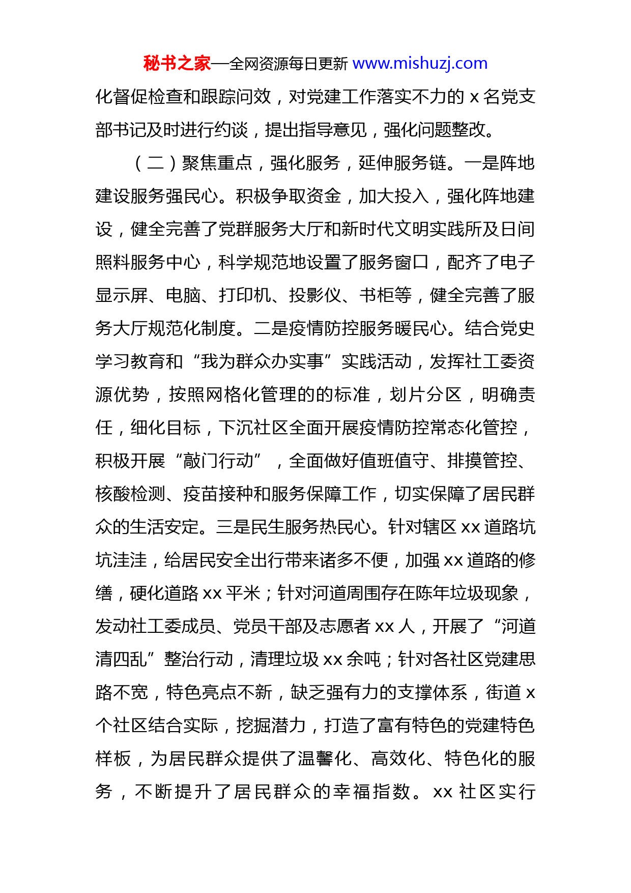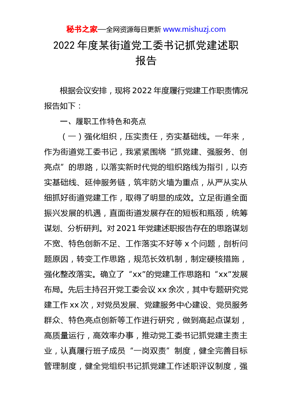 秘书之家—全网资源每日更新www.mishuzj.com2022年度某街道党工委书记抓党建述职报告根据会议安排,现将2022年度履行党建工作职责情况报告如下:一、履职工作特色和亮点(一)强化组织,压实责任,夯实基础线。一年来,作为街道党工委书记,我紧紧围绕“抓党建、强服务、创亮点”的思路,以落实新时代党的组织路线为指引,以夯实基础线、延伸服务链,筑牢防火墙为重点,从严从实从细抓好街道党建工作,取得了明显的成效。立足街道全面振兴发展的机遇,直面街道发展存在的短板和瓶颈,统筹谋划、分析研判。对2021年党建述职报告存在的思路谋划不宽、特色创新不足、工作落实不好等x个问题,剖析问题原因,转变工作思路,规范长效机制,制定硬核措施,强化整改落实。确立了“xx”的党建工作思路和“xx”发展布局。先后主持召开党工委会议xx余次,其中专题研究党建工作xx次,对党员发展、党建服务中心建设、党员服务群众、特色亮点创新等工作进行研究,做到高起点谋划,高质量运行,高效率办事,推动党工委书记抓党建主责主业,认真履行班子成员“一岗双责”制度,健全完善目标管理制度,健全党组织书记抓党建工作述职评议制度,强秘书之家—全网资源每日更新www.mishuzj.com化督促检查和跟踪问效,对党建工作落实不力的x名党支部书记及时进行约谈,提出指导意见,强化问题整改。(二)聚焦重点,强化服务,延伸服务链。一是阵地建设服务强民心。积极争取资金,加大投入,强化阵地建设,健全完善了党群服务大厅和新时代文明实践所及日间照料服务中心,科学规范地设置了服务窗口,配齐了电子显示屏、电脑、打印机、投影仪、书柜等,健全完善了服务大厅规范化制度。二是疫情防控服务暖民心。结合党史学习教育和“我为群众办实事”实践活动,发挥社工委资源优势,按照网格化管理的的标准,划片分区,明确责任,细化目标,下沉社区全面开展疫情防控常态化管控,积极开展“敲门行动”,全面做好值班值守、排摸管控、核酸检测、疫苗接种和服务保障工作,切实保障了居民群众的生活安定。三是民生服务热民心。针对辖区xx道路坑坑洼洼,给居民安全出行带来诸多不便,加强xx道路的修缮,硬化道路xx平米;针对河道周围存在陈年垃圾现象,发动社工委成员、党员干部及志愿者xx人,开展了“河道清四乱”整治行动,清理垃圾xx余吨;针对各社区党建思路不宽,特色亮点不新,缺乏强有力的支撑体系,街道x个社区结合实际,挖掘潜力,打造了富有特色的党建特色样板,为居民群众提供了温馨化、高效化、特色化的服务,不断提升了居民群众的幸福指数。xx社区实行秘书之家—全网资源每日更新www.mishuzj.com“3+X”服务体系,为居民开辟绿色通道,撑起为民的保护伞;xx社区实行“360”服务,健全完善医疗救助、养老保险、残疾人扶持等救助体系,进一步拓宽就业渠道,加强提标扩面。年内,城镇新增就业xx人,城镇登记失业率控制在x%的幅度。(三)强化督促,廉洁自律,筑牢防火墙。一是从健全长效机制上下功夫。按照以制度管人,以制度管事的标准和要求,全面落实从严治党主体责任。进一步健全民主集中制,党工委议事、内部决策等长效机制,优化整合、补充完善,发现盲区,及时补救。对重大事项、项目建设、干部调整及大额资金支付等重要事项,规定提交街道党工委会议集体研究,共同商榷,促进民主集中制度的规范运用,杜绝一言堂现象的发生。二是从强化督促检查上下功夫。建立健全督促问效和定期约谈机制,每周进行1次统计、每月进行1次公示,1个季度进行1次通报,督促干部加强廉洁自律,强化规矩意识。年内对各支部、各科室进行督促检查xx人次,对违反请销假、干部考勤制度、工作拖沓敷衍的干部通报批评xx人次,约谈班子成员xx人次,开展了“xx”活动,稳步推进各支部作风整改,提档升级,努力营造“真抓实干、你追赶我、争先进位”的范围。三是从强化教育培训上下功夫。坚持以教育培训为导向,以提升素质为根本,在严格落实“三会一课”的基础秘书之家—全网资源每日更新www.mishuzj.com上,扎实开展主题党日活动和各类教育培训活动。组织在职党员及居民党员共xx余人次,参观区委党史馆、廉政教育基地,接受红色教育,赓续红色基因;邀请区委党校讲师xx对街道干部做了题《xx》的专题培训,增强了党员廉洁自律、夙夜为公的意识;组织党员干部xx人,观看了廉政教育《xx》,剖析典型案例,及时提醒党员干部防微杜渐,不触碰火线,全面提升了工作效能。二、存在的主要问题及原因(一)履职尽责的意识缺乏。对抓好党建的认识不足,工作上安于现状,缺乏主动性和积极性,只满足于完成任务,缺乏久久为功、常抓不懈的韧劲和钻劲,在打造特色亮点、创色品牌服务方面,思考谋划不够、方式方法不活、进取意识不强,致使党建成效不给力。主要原因是:对新形势、新常态下如何抓党建工作缺乏前瞻性的思考琢磨和分析研判,深入辖区调查研究不够,习惯于闭门造车和遥控指挥。对指导各支部打造特色亮点方面缺乏对策的研究、特色的凝练、问题的总结,致使党建特色服务缺乏常态化的支撑体系和框架,跟踪问效不力,导致党建工作推进迟缓,迟迟打不开局面。(二)党员干部的教育缺乏。对党员干部的管理松软,往往以过问代替管理,批评教育少。有时,看到一些小问题,也是睁一只眼闭一只眼,