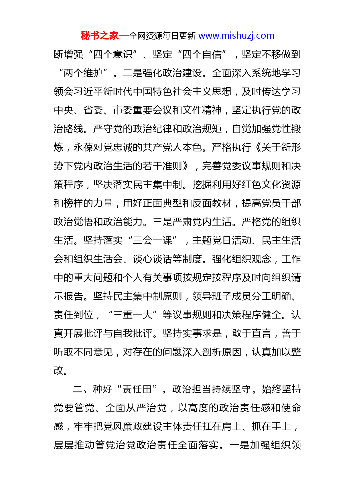 秘书之家—全网资源每日更新www.mishuzj.com2022年度落实全面从严治党主体责任和党风廉政建设责任制情况述职述廉报告市纪委监委:根据组织安排,我于20XX年XX月任市XX局党组书记、局长。一年来,我坚持以习近平新时代中国特色社会主义思想为指导,深入学习贯彻党的二十大精神,坚持以党的政治建设为统领,担负起党风廉政建设第一责任人职责,带头严格执行廉洁从政各项规定,全面推进党的政治建设、思想建设、组织建设、作风建设、纪律建设,为开启新时代XX高质量发展,为实现建设XX的宏伟目标提供坚强政治保障和纪律保障。现就有关情况报告如下:一、当好“领头雁”,政治生态持续巩固。坚持把党的领导作为思想和行动的基本准则,教育引导党员干部讲政治、守纪律、懂规矩,风清气正、崇严尚实、干事创业、遵纪守法的良好政治生态持续巩固。一是加强理论学习。及时制定理论学习中心组学习计划,深入学习习近平新时代中国特色社会主义思想和党的二十大精神,强化班子成员和党员干部的理想信念、宗旨观念,及时传达学习中央和省委、市委作出的重要决策部署并认真抓好贯彻落实。全年累计主持召开中心组学习13次,赴基层开展宣讲10次,引导系统上下深刻领会两个确立的决定性意义,不秘书之家—全网资源每日更新www.mishuzj.com断增强“四个意识”、坚定“四个自信”,坚定不移做到“两个维护”。二是强化政治建设。全面深入系统地学习领会习近平新时代中国特色社会主义思想,及时传达学习中央、省委、市委重要会议和文件精神,坚定执行党的政治路线。严守党的政治纪律和政治规矩,自觉加强党性锻炼,永葆对党忠诚的共产党人本色。严格执行《关于新形势下党内政治生活的若干准则》,完善党委议事规则和决策程序,坚决落实民主集中制。挖掘利用好红色文化资源和榜样的力量,用好正面典型和反面教材,提高党员干部政治觉悟和政治能力。三是严肃党内生活。严格党的组织生活。坚持落实“三会一课”,主题党日活动、民主生活会和组织生活会、谈心谈话等制度。强化组织观念,工作中的重大问题和个人有关事项按规定按程序及时向组织请示报告。坚持民主集中制原则,领导班子成员分工明确、责任到位,“三重一大”等议事规则和决策程序健全。认真开展批评与自我批评。坚持实事求是,敢于直言,善于听取不同意见,对存在的问题深入剖析原因,认真加以整改。二、种好“责任田”,政治担当持续坚守。始终坚持党要管党、全面从严治党,以高度的政治责任感和使命感,牢牢把党风廉政建设主体责任扛在肩上、抓在手上,层层推动管党治党政治责任全面落实。一是加强组织领秘书之家—全网资源每日更新www.mishuzj.com导。多次召开专题会议研究部署党风廉政建设相关工作,定期听取纪工委工作汇报、研究解决存在问题,做到了重要工作亲自部署、重大问题亲自过问、重点环节亲自协调、重要环节亲自督办,真正守好种好了自己的“责任田”。主持制定印发了《XX党工委全面从严治党主体责任清单》《2022年党风廉政建设工作要点》等文件,细化各级党组织书记、班子成员全面从严治党责任,推动各级党组织层层签订责任状,形成了一级抓一级、层层抓落实的工作格局。二是加强廉政教育。坚持把加强廉洁思想建设作为推进党风廉政建设工作的“先手棋”,带头深入开展纪律教育学习宣传月等宣教活动,为XX各级党员领导干部讲授了深化作风建设主题党课,安排XX各级党组织开展纪律教育专题党课活动XX余次、受教育的干部员工达XX万余人(次),观看警示教育片XX余次、观看人次超过XX万人。坚持警示在先,每逢重大节假日,都安排发送廉政短信、开展专项督查,监督提醒各级党员领导干部严守纪律底线。坚持“任前必谈”“凡提必考”的原则,对新任和新提拔的干部全部进行了廉政考试和廉政谈话,切实扣好干部履职“第一粒扣子”。三是加强督导检查。认真落实廉政谈话提醒制度,先后多次约谈各级单位及下级纪委主要负责人,层层传导压力,靠实工作责任。充分发挥考核指挥棒作用,从严考核各级党(工)委和各基层党组织秘书之家—全网资源每日更新www.mishuzj.com落实党风廉政建设责任制情况,并将考核结果与领导班子、领导干部业绩评定、奖励惩处和选拔任用等挂钩,推动了两个责任的全面有效落实。三、念好“紧箍咒”,正风肃纪持续强化。坚持常态化深入推进正风肃纪,紧盯老问题,瞄准新动向,不断深化作风建设,深入开展专项整治,促进党风政风更加清朗。一是加强监督力量建设。结合XX体制机制改革,不断优化提升XX、XX两级纪检监察机关的管理运行机制,深入推进“三化”建设、实现基层单位专职纪检监察干部全覆盖。二是加大监督执纪力度。全力支持各级纪检监察部门畅通案件举报渠道,构建完善信、访、网、电四位一体的立体式投诉举报体系,同时定期听取案件举报受理情况,研究部署推进案件查办工作,确保事事有回音,件件有结果。XX纪检监察机关共受理问题线索XX件,立案XX件,党纪政务处分XX人,其中处级以上干部XX人,保持了高压震慑态势。三是深化巡察结果运用。推动XX探索构建了“12146”巡察工作法,安排开展了两轮巡察工作、累计巡察党组织XX个、移交问题线索XX件。高标准推进市委巡察反馈意见整改,问责XX人次、