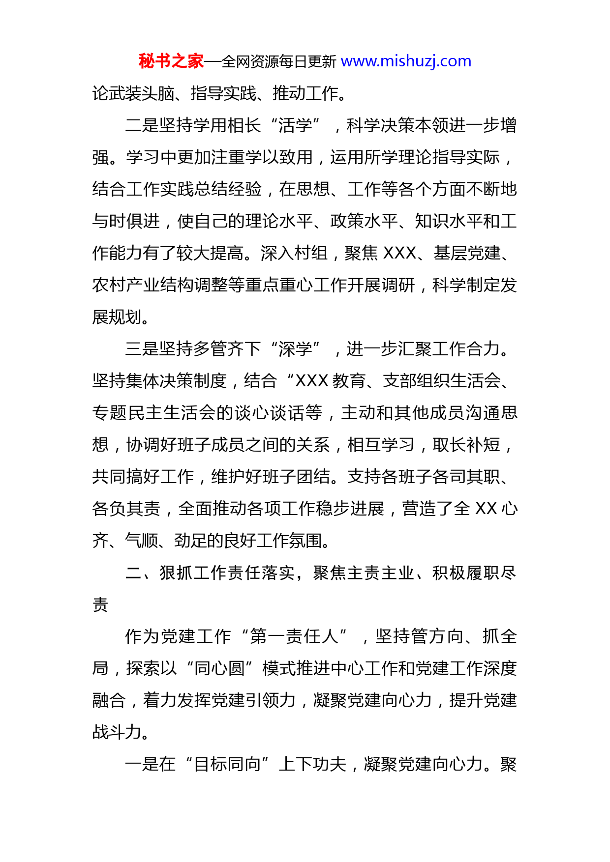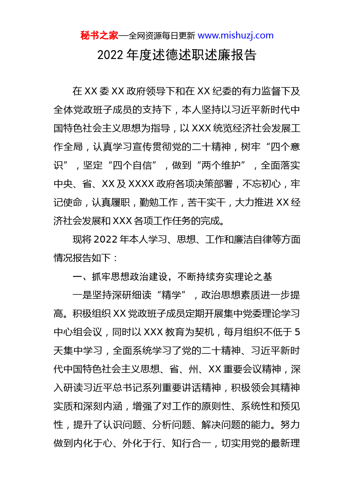 秘书之家—全网资源每日更新www.mishuzj.com2022年度述德述职述廉报告在XX委XX政府领导下和在XX纪委的有力监督下及全体党政班子成员的支持下,本人坚持以习近平新时代中国特色社会主义思想为指导,以XXX统览经济社会发展工作全局,认真学习宣传贯彻党的二十精神,树牢“四个意识”,坚定“四个自信”,做到“两个维护”,全面落实中央、省、XX及XXXX政府各项决策部署,不忘初心,牢记使命,认真履职,勤勉工作,苦干实干,大力推进XX经济社会发展和XXX各项工作任务的完成。现将2022年本人学习、思想、工作和廉洁自律等方面情况报告如下:一、抓牢思想政治建设,不断持续夯实理论之基一是坚持深研细读“精学”,政治思想素质进一步提高。积极组织XX党政班子成员定期开展集中党委理论学习中心组会议,同时以XXX教育为契机,每月组织不低于5天集中学习,全面系统学习了党的二十精神、习近平新时代中国特色社会主义思想、省、州、XX重要会议精神,深入研读习近平总书记系列重要讲话精神,积极领会其精神实质和深刻内涵,增强了对工作的原则性、系统性和预见性,提升了认识问题、分析问题、解决问题的能力。努力做到内化于心、外化于行、知行合一,切实用党的最新理秘书之家—全网资源每日更新www.mishuzj.com论武装头脑、指导实践、推动工作。二是坚持学用相长“活学”,科学决策本领进一步增强。学习中更加注重学以致用,运用所学理论指导实际,结合工作实践总结经验,在思想、工作等各个方面不断地与时俱进,使自己的理论水平、政策水平、知识水平和工作能力有了较大提高。深入村组,聚焦XXX、基层党建、农村产业结构调整等重点重心工作开展调研,科学制定发展规划。三是坚持多管齐下“深学”,进一步汇聚工作合力。坚持集体决策制度,结合“XXX教育、支部组织生活会、专题民主生活会的谈心谈话等,主动和其他成员沟通思想,协调好班子成员之间的关系,相互学习,取长补短,共同搞好工作,维护好班子团结。支持各班子各司其职、各负其责,全面推动各项工作稳步进展,营造了全XX心齐、气顺、劲足的良好工作氛围。二、狠抓工作责任落实,聚焦主责主业、积极履职尽责作为党建工作“第一责任人”,坚持管方向、抓全局,探索以“同心圆”模式推进中心工作和党建工作深度融合,着力发挥党建引领力,凝聚党建向心力,提升党建战斗力。一是在“目标同向”上下功夫,凝聚党建向心力。聚秘书之家—全网资源每日更新www.mishuzj.com焦党委自身建设,将党内有关法规纳入党委中心组必学内容,严肃党内政治生活,要求党委班子带头以普通党员身份参加所在支部组织生活。严格执行重大事项请示报告制度、民主集中制等制度,确保权力在制度范围内规范运行,做到“识大体、顾大局、讲团结、做表率”。聚焦基层组织建设,严格对照“八项指标”和“十四项负面清单”,对软弱涣散党组织进行整顿和提升,完成XX个五星级党支部创建工作,提升党组织战斗力。聚焦队伍建设,注重选优配强农村党组织带头人,全面完成XX个行政村的“一肩挑”工作,累计调整不适应工作需要的村党组织书记XXX人,以习近平总书记20字好干部标准,配优选强中层干部XX名,从XXX一线推荐优秀后备干部XXX名,充分调动干部的工作积极性、主动性和创造性。二是在“行动同力”上求突破,提升党建战斗力。注重将党建与中心工作融合,一起安排、一起部署,同时发力,打破就党建抓党建的自我循环,解决好党建与中心工作“两张皮”的问题,延伸“同心圆”半径,扩大“同心圆”面积,坚持突出在党建与XXX上同力,认真贯彻落实习近平总书记关于“抓好党建促XXX”的要求,继续把XXX名优秀机关干部选派到村开展XXX工作。对XX个村议事协商、村规民约等进行排查、建立和完善,村级事务公开进一步规范,森林防火、河道治理、公共设施管理等秘书之家—全网资源每日更新www.mishuzj.com初步实现有章可循,充分用好XXX所新时代农民讲习所,实现村村通广电云,农村精神文化生活到进一步得到丰富和提高,婚丧陋习、天价彩礼、孝道式微、老无所养等不良社会风气进一步得到治理。通过发放宣传册、张贴宣传标语、公布举报电话等方式,以及全面无死角的排查,落实扫黑除恶专项斗争工作,憎恶向善、风清气正的社会氛围全面形成。坚持突出党建与村集体经济发展上同力,应用集中学、外出考察学和驻村队伍帮等形式,积极培育村党支部、村委会负责人懂经济、抓经济,成为带动群众发展的行家里手,全XX基本形成了“一园两线五产七坝”的产业发展布局。创新实施消除“XXX”八大清零行动,集中整治农村脏乱差、移风易俗等综合问题,群众精神面貌焕然一新,主动参与村级社会事务热情高涨,农村你追我赶氛围更加浓厚,农村滥办酒席等现象得到根本性治理。三、注重从严从实正己修身,扎实推进党风廉政建设一是注重修养,不断增强廉洁自律的自觉性和坚定性。在日常工作和生活中始终注重严格要求自己,自觉遵守廉洁自律及上级有关党风廉政建设的各项规定,始终做到自重、自省、自警、自励。工作中以身作则,防微杜渐,始终把自己置于党纪政纪的约束和干部群众的监督之下,坚决杜绝任何违纪现象,认真执行重大事项报告制度、收入申报制度等,切实管好自己的家庭、子女、亲属秘书之家—全网资源