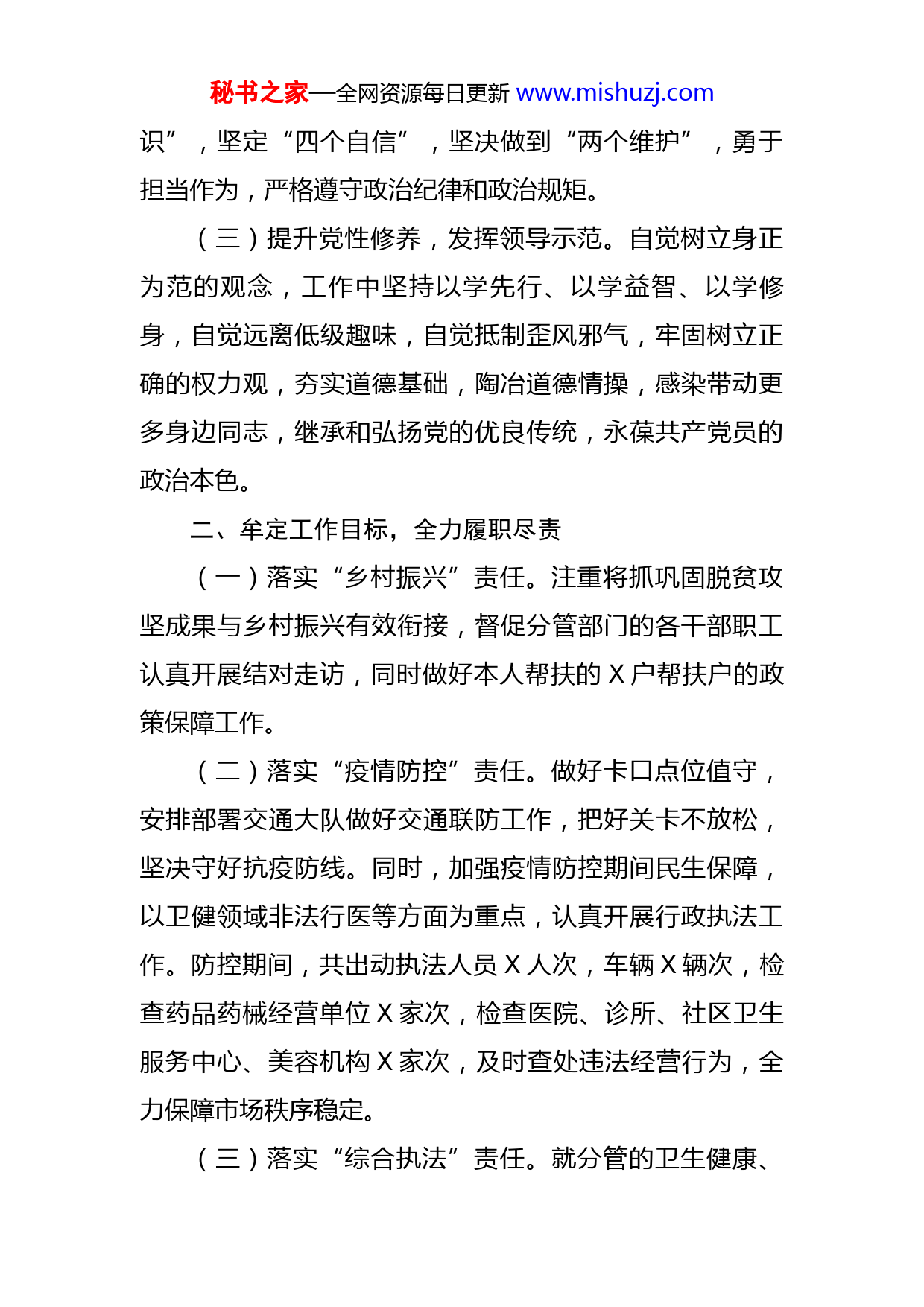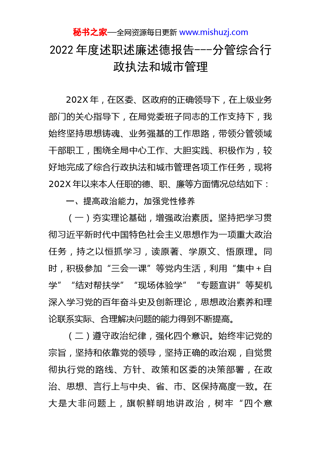 秘书之家—全网资源每日更新www.mishuzj.com2022年度述职述廉述德报告---分管综合行政执法和城市管理202X年,在区委、区政府的正确领导下,在上级业务部门的关心指导下,在局党委班子同志的工作支持下,我始终坚持思想铸魂、业务强基的工作思路,带领分管领域干部职工,围绕全局中心工作、大胆实践、积极作为,较好地完成了综合行政执法和城市管理各项工作任务,现将202X年以来本人任职的德、职、廉等方面情况总结如下:一、提高政治能力,加强党性修养(一)夯实理论基础,增强政治素质。坚持把学习贯彻习近平新时代中国特色社会主义思想作为一项重大政治任务,持之以恒抓学习,读原著、学原文、悟原理。同时,积极参加“三会一课”等党内生活,利用“集中+自学”“结对帮扶学”“现场体验学”“专题宣讲”等契机深入学习党的百年奋斗史及创新理论,思想政治素养和理论联系实际、合理解决问题的能力得到不断提高。(二)遵守政治纪律,强化四个意识。始终牢记党的宗旨,坚持和依靠党的领导,坚持正确的政治观,自觉贯彻执行党的路线、方针、政策和区委的决策部署,在政治、思想、言行上与中央、省、市、区保持高度一致。在大是大非问题上,旗帜鲜明地讲政治,树牢“四个意秘书之家—全网资源每日更新www.mishuzj.com识”,坚定“四个自信”,坚决做到“两个维护”,勇于担当作为,严格遵守政治纪律和政治规矩。(三)提升党性修养,发挥领导示范。自觉树立身正为范的观念,工作中坚持以学先行、以学益智、以学修身,自觉远离低级趣味,自觉抵制歪风邪气,牢固树立正确的权力观,夯实道德基础,陶冶道德情操,感染带动更多身边同志,继承和弘扬党的优良传统,永葆共产党员的政治本色。二、牟定工作目标,全力履职尽责(一)落实“乡村振兴”责任。注重将抓巩固脱贫攻坚成果与乡村振兴有效衔接,督促分管部门的各干部职工认真开展结对走访,同时做好本人帮扶的X户帮扶户的政策保障工作。(二)落实“疫情防控”责任。做好卡口点位值守,安排部署交通大队做好交通联防工作,把好关卡不放松,坚决守好抗疫防线。同时,加强疫情防控期间民生保障,以卫健领域非法行医等方面为重点,认真开展行政执法工作。防控期间,共出动执法人员X人次,车辆X辆次,检查药品药械经营单位X家次,检查医院、诊所、社区卫生服务中心、美容机构X家次,及时查处违法经营行为,全力保障市场秩序稳定。(三)落实“综合执法”责任。就分管的卫生健康、秘书之家—全网资源每日更新www.mishuzj.com交通运输、安全生产等综合行政执法领域工作加强业务研究,加大工作调度,认真履职,全面完成各项既定任务目标。1.卫健领域综合执法。加强多部门、宽领域联合执法,联合市场监管、消防大队、文旅部门,对住宿、沐浴、游泳场所、美容美发、文化娱乐等场所卫生设施是否完善、卫生管理是否合规、疫情防控是否到位等方面开展执法整治,全力配合主管部门查处医疗卫生行业违法经营行为。20XX年共开展执法检查X次,出动执法人员X人次,一般程序立案X件,累计下达行政处罚决定书X件。2.交通领域综合执法。安排部署交通执法大队开展“三无船舶整治行动”“机动车维修市场专项执法检查行动”“旅客运输市场专项执法检查行动”“危货运输专项行动”“打击道路运输非法营运百日攻坚行动”“超限超载专项行动”“交通运输执法领域突出问题专项整治行动”等X个专项执法行动。20XX年,共受理案件X件,下达处罚决定书X份,有力震慑非法运营等违法经营行为。3.安全生产领域综合执法。分析研判案件线索,在投诉举报、主动执法检查、部门移交、上级交办等方面,安排部署安全执法大队开展摸排核查,确定执法重点。对煤矿、非煤矿山、危险化学品、烟花爆竹、工贸领域等行业开展执法检查。20XX年,共开展安全执法检查和执法调查秘书之家—全网资源每日更新www.mishuzj.comXX余次,出动执法人员检查XX余人次,一般程序案件立案XX件,有力增强企业安全生产意识。(四)落实“意识形态”责任。积极参与党委会议研究意识形态工作,多次调度分管的部门意识形态工作,在利用各类媒体平台进行法治宣传过程中,认真审核把关,做好“读网”工作和舆情监测等工作,发布信息时,严格落实“三审三校”制度等。20XX年,分管的部门未发生意识形态方面的问题。三、保持廉政警醒,筑牢“拒腐”防线(一)做好个人廉洁自律。一是认真学习《中国共产党廉洁自律准则》《中国共产党纪律处分条例》《党员领导干部廉洁从政若干准则》等相关法规,从思想上切实筑牢防线;二是自觉遵守党的各项纪律,坚决执行中央“八项规定”和“十严禁”、“十不准”,坚持秉公办事、不谋私利。凡是分管工作涉及到重大决策、重要干部任免、重大项目安排和大额度资金的使用,都报局党委集体讨论作出决定,不存在利用职权贪污受贿、以权谋私,搞权钱交易等不廉洁行为;三是在知敬畏、存戒惧、守底线方面、对照初心使命方面等开展自查自纠,自我警醒,把自己摆进去,把职责摆进去,把工作摆进去,梳理、检视自己存在的突出问题。通过对照自查,不断纠正错误和偏差,不断修正思想、促进工作。秘书之家—全网资源每日更新www.mishuzj.com(二)做好队伍廉洁自律。严格执行党风廉政建设责任制。一年来,严格按照党