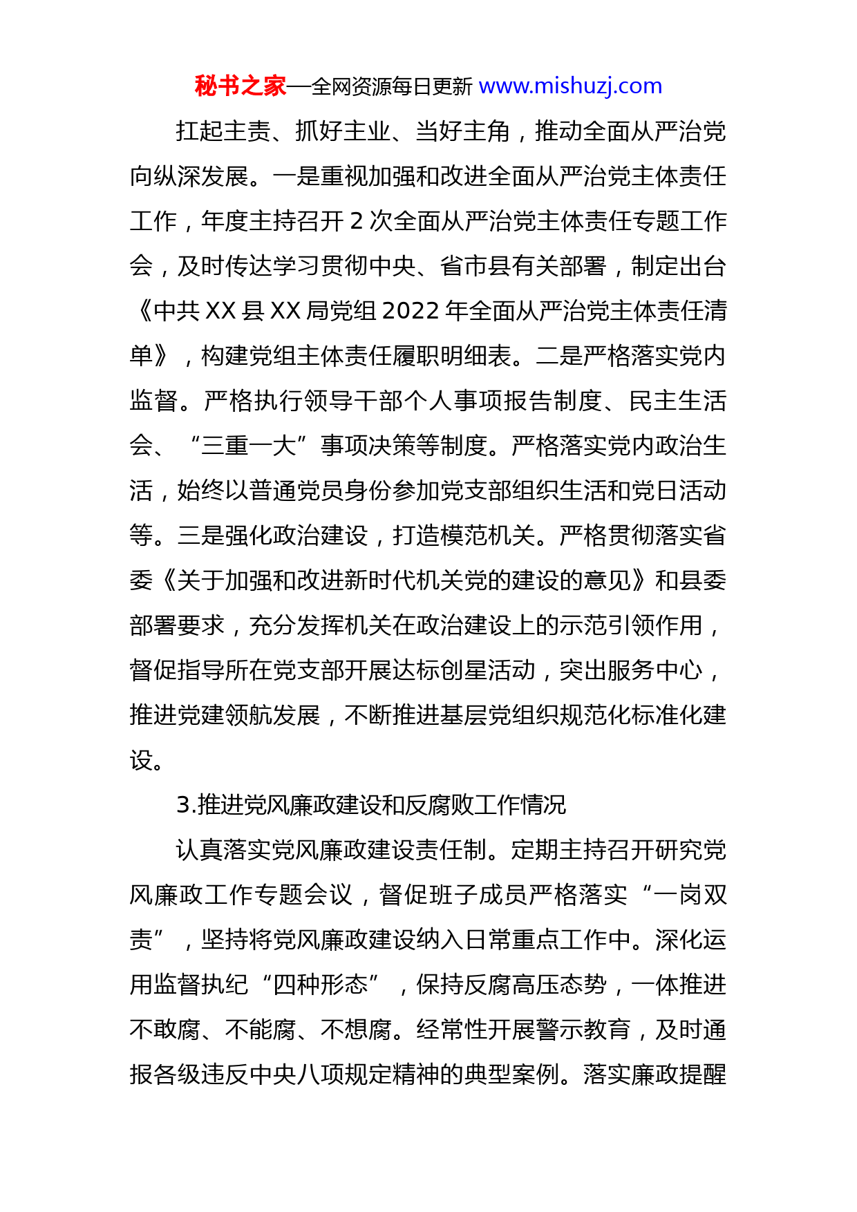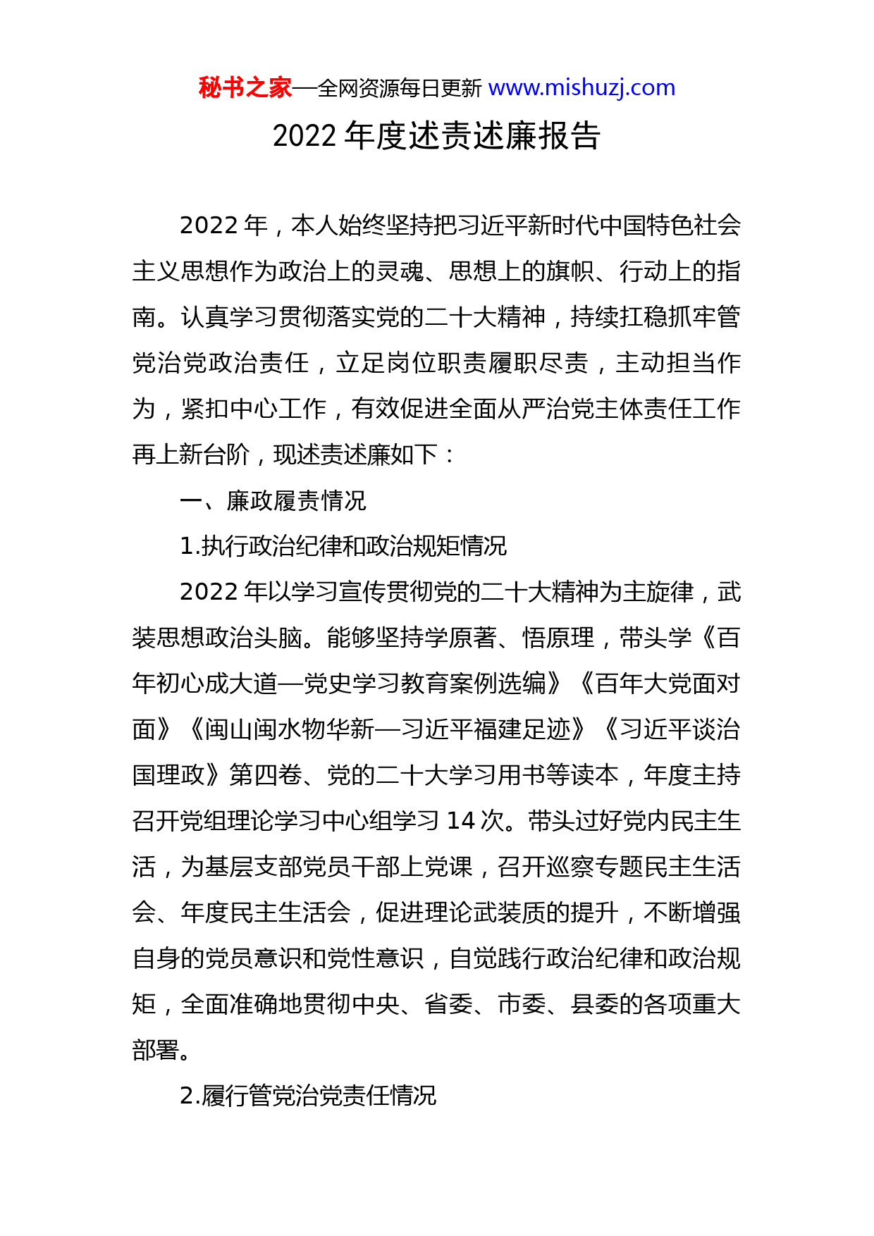 秘书之家—全网资源每日更新www.mishuzj.com2022年度述责述廉报告2022年,本人始终坚持把习近平新时代中国特色社会主义思想作为政治上的灵魂、思想上的旗帜、行动上的指南。认真学习贯彻落实党的二十大精神,持续扛稳抓牢管党治党政治责任,立足岗位职责履职尽责,主动担当作为,紧扣中心工作,有效促进全面从严治党主体责任工作再上新台阶,现述责述廉如下:一、廉政履责情况1.执行政治纪律和政治规矩情况2022年以学习宣传贯彻党的二十大精神为主旋律,武装思想政治头脑。能够坚持学原著、悟原理,带头学《百年初心成大道—党史学习教育案例选编》《百年大党面对面》《闽山闽水物华新—习近平福建足迹》《习近平谈治国理政》第四卷、党的二十大学习用书等读本,年度主持召开党组理论学习中心组学习14次。带头过好党内民主生活,为基层支部党员干部上党课,召开巡察专题民主生活会、年度民主生活会,促进理论武装质的提升,不断增强自身的党员意识和党性意识,自觉践行政治纪律和政治规矩,全面准确地贯彻中央、省委、市委、县委的各项重大部署。2.履行管党治党责任情况秘书之家—全网资源每日更新www.mishuzj.com扛起主责、抓好主业、当好主角,推动全面从严治党向纵深发展。一是重视加强和改进全面从严治党主体责任工作,年度主持召开2次全面从严治党主体责任专题工作会,及时传达学习贯彻中央、省市县有关部署,制定出台《中共XX县XX局党组2022年全面从严治党主体责任清单》,构建党组主体责任履职明细表。二是严格落实党内监督。严格执行领导干部个人事项报告制度、民主生活会、“三重一大”事项决策等制度。严格落实党内政治生活,始终以普通党员身份参加党支部组织生活和党日活动等。三是强化政治建设,打造模范机关。严格贯彻落实省委《关于加强和改进新时代机关党的建设的意见》和县委部署要求,充分发挥机关在政治建设上的示范引领作用,督促指导所在党支部开展达标创星活动,突出服务中心,推进党建领航发展,不断推进基层党组织规范化标准化建设。3.推进党风廉政建设和反腐败工作情况认真落实党风廉政建设责任制。定期主持召开研究党风廉政工作专题会议,督促班子成员严格落实“一岗双责”,坚持将党风廉政建设纳入日常重点工作中。深化运用监督执纪“四种形态”,保持反腐高压态势,一体推进不敢腐、不能腐、不想腐。经常性开展警示教育,及时通报各级违反中央八项规定精神的典型案例。落实廉政提醒秘书之家—全网资源每日更新www.mishuzj.com谈话制度,注重抓早抓小,防微杜渐。年度开展党风廉政警示教育7次,186人次,讲授廉政党课1次,开展集体廉政谈话2次。持续深化“生态建设年”活动和“转作风、优效能”专项整治行动。4.执行廉洁纪律情况坚持正人先正己,严格自律。牢固树立正确权力观,保持高尚精神追求,敬畏人民、敬畏组织、敬畏法纪,做到公正用权、依法用权、为民用权、廉洁用权,带头遵守中央八项规定精神及其细则,切实维护好自身形象、发挥好表率作用。认真执行廉洁自律的各项规定,带头执行《中国共产党廉洁自律准则》和《关于领导干部报告个人有关事项的规定》,严格遵守用车、住房、公务接待等方面有关规定,主动报告个人有关事项。切实肩负起监管责任,管好家属,严格要求家属当好廉内助,管好下属,一年以来,党风廉政建设责任职责范围内的领导班子和党员干部队伍没有存在违法违纪问题,廉洁自律状况良好。5.落实意识形态工作情况年度召开意识形态工作专题会议2次,专题研究部署意识形态工作、定期综合分析研判意识形态领域的情况,及时处理,确保意识形态工作有效推进。抓好意识形态领域和网络意识形态工作,持续把意识形态工作专题学习纳入党组理论学习中心组、持续把“学习强国”学习平台工秘书之家—全网资源每日更新www.mishuzj.com作纳入意识形态工作责任制、精神文明创建和党员干部学习考核。多措并举开展宣传教育,把握正确的政治导向、舆论导向和价值取向,夯实主流意识形态工作话语权。二、存在问题和不足1.推动重大部署落实还有差距。对习近平新时代中国特色社会主义思想的理论精髓、核心要义和科学体系认识不够深刻、理解不够全面,在学懂弄通做实上下的功夫不够,特别是运用新思想解决XXX领域工作上的问题的能力还有差距。虽然带头严格贯彻落实党的方针政策和各项决策部署,但督促落实力度不够,导致贯彻还不到位。比如招商引资成效、扶优培强企业方面还有差距。2.推动党建工作办法不够丰富。平时注重对基层党建“必修课”和“规定动作”的落实,结合单位实际“选修课”和“自选动作”较少。指导基层党组织安排的学习任务多,集体活动少,形式比较单一,指导基层党建工作新思路、新举措不多,对准确把握年轻党员特点,增强支部吸引力、提升凝聚力上还有不足。3.干部监督管理方面还需加强。平时开展业务时,开会强调多、提要求多,但考虑到干部业务多、担子重,严管干部方面还缺乏“刀刃向内”的勇气,对于干部在工作中存在的形式主义、不作为、慢作为、乱作为排查整治力度还不够,结合干部“五不”专项整治和转作风效能活动,打秘书之家—全网资源每日更新www.mishuzj.com造一流工信队伍的方式方法有待进一