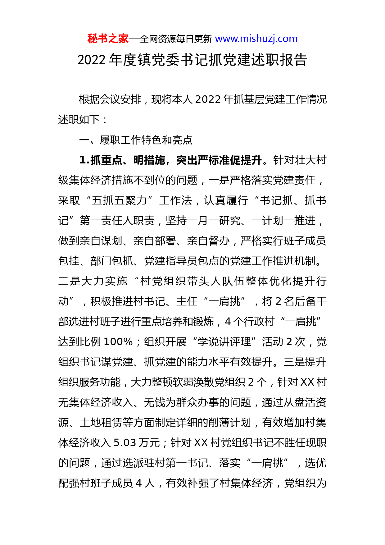 秘书之家—全网资源每日更新www.mishuzj.com2022年度镇党委书记抓党建述职报告根据会议安排,现将本人2022年抓基层党建工作情况述职如下:一、履职工作特色和亮点1.抓重点、明措施,突出严标准促提升。针对壮大村级集体经济措施不到位的问题,一是严格落实党建责任,采取“五抓五聚力”工作法,认真履行“书记抓、抓书记”第一责任人职责,坚持一月一研究、一计划一推进,做到亲自谋划、亲自部署、亲自督办,严格实行班子成员包挂、部门包抓、党建指导员包点的党建工作推进机制。二是大力实施“村党组织带头人队伍整体优化提升行动”,积极推进村书记、主任“一肩挑”,将2名后备干部选进村班子进行重点培养和锻炼,4个行政村“一肩挑”达到比例100%;组织开展“学说讲评理”活动2次,党组织书记谋党建、抓党建的能力水平有效提升。三是提升组织服务功能,大力整顿软弱涣散党组织2个,针对XX村无集体经济收入、无钱为群众办事的问题,通过从盘活资源、土地租赁等方面制定详细的削薄计划,有效增加村集体经济收入5.03万元;针对XX村党组织书记不胜任现职的问题,通过选派驻村第一书记、落实“一肩挑”,选优配强村班子成员4人,有效补强了村集体经济,党组织为秘书之家—全网资源每日更新www.mishuzj.com民服务的能力和水平进一步提高。2.抓认识、理思路,突出抓党建促发展。针对党建工作特色不鲜明的问题,一是依托本地资源优势和有利条件,镇党委充分发挥党组织的引领作用,积极组织党员干部开展实地考察和座谈,提出了“创一个品牌、兴一个产业、富一方百姓”的发展思路,推动党建资源转化为发展活力,切实构建起了“党建强、发展强”、“党建促产业、产业促发展”的“双强双促”党建引领格局。二是在充分调研谋划的基础上,研究制定了《XX产业发展五年规划》;围绕“三链”建设,紧盯粤港澳大湾区和北上广高端市场,采取“企业+合作社+基地+党员”的模式,通过积极引进龙头企业,实行订单化种植,鼓励党员带动群众大力发展西蜜瓜和叶菜种植,全镇特色瓜菜产业效益显著。三是大力创建先锋富民基地。通过支部强化引领、党员带头示范、群众积极参与,建成XX村千亩桃园特色经济林示范种植基地,辐射带动周边3个组56户农户,农民增收渠道持续拓宽。3.抓教育、强管理,突出重规范促先锋。针对党员管理教育抓的不严的问题,一是扎实组织学习党的二十大精神专题读书班,采取专题辅导、交流研讨、知识竞赛等多种形式,组织开展14个必学篇目和重点内容学习50余场次、研讨交流4轮8场次,党员干部受教育2000余人秘书之家—全网资源每日更新www.mishuzj.com次。二是从严落实“三会一课”、“1+8”主题菜单“固定党日”、“一卡双制”管理、专题组织生活会和民主评议党员等组织生活制度,按照“三定一报一记实”,在“XX党建”信息化平台进行规范操作,确保了党内组织生活从严从实从细。三是按照“不在村里在群里”的要求,在全镇大力创建“网上党支部”微信群7个,及时发布党建动态、学习资料等内容,有效确保了农村党员流动不流失。二、存在的主要问题及原因一是抓党建工作的创新力度不够大。对新形势下基层党建工作的思考研究不够深入,在研究党建工作与服务效能提升和农旅融合发展上方面结合还不紧密。二是抓党建品牌创建上亮点不够多。作为党委书记抓党建缺乏推进党建工作的有效载体和抓手,“河清先锋行”党建品牌内涵还不够丰富,党建工作的活力和吸引力不够。三是抓党建标准提升上办法不够好。按照党支部建设标准化要求推动党组织的先锋引领作用发挥方面还不够明显,在党员队伍的管理教育上,还存在引导力度不够、形式多样化不足、教育管理效率不高等问题。产生以上问题的原因:一是尽管自己对党建第一责任人认识到位、态度坚决,但实际工作中有时投入的时间和精力不足,平时把主要精力放在了重点工作、示范点建设上,在党建工作压力传导和抓党建品牌培育上力度还不秘书之家—全网资源每日更新www.mishuzj.com够;二是调查研究不扎实,有时习惯于老思路、老办法和老经验,工作大胆创新的意识还不够强;三是思考谋划党建工作缺乏深度和广度,对抓学习教育凝聚发展合力、抓示范引导汇聚发展动力、抓作用发挥聚焦先锋带富活力上认识还不够。三、下一步工作思路和措施1.抓政治建设,在落实党建责任上求突破。坚持“抓班子、带队伍、优结构、促工作”的原则,不断加强班子自身建设和党员干部队伍建设,认真贯彻落实《中国共产党支部工作条例(试行)》和《中国共产党农村基层组织工作条例》,深入学习宣传贯彻党的二十大精神,带头制定完善领导班子成员“绩效党建”责任清单,带头落实班子成员双重组织生活制度,围绕乡村振兴、农村人居环境整治、农村“三变”改革、项目建设等重点工作开展“主题党日”活动,提高党员参与农村重点工作的积极性。2.抓组织建设,在提升服务能力上下功夫。建立健全基层民主和依法办事工作机制,严格落实“四议两公开”,继续抓好“作风转变”、“放管服”等活动,按照“阵地最小化、办公最大化、服务最优化”的要求,持续推进全镇阵地服务“六个中心”创新服务体系建设,以“星级化”创建为抓手,规范便民服务事项和流程,不断提升综合服务能