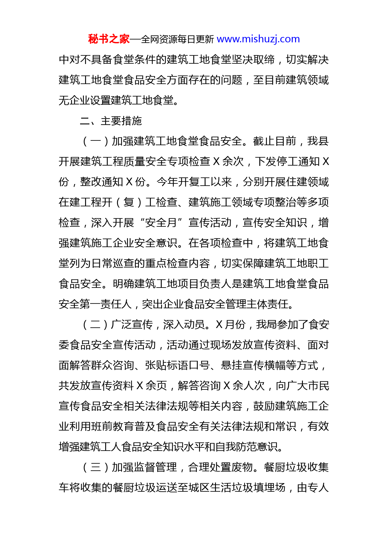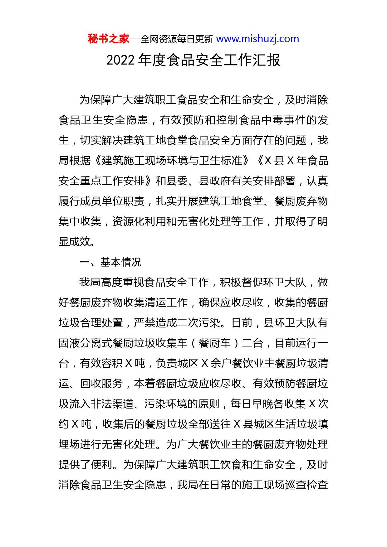 秘书之家—全网资源每日更新www.mishuzj.com2022年度食品安全工作汇报为保障广大建筑职工食品安全和生命安全,及时消除食品卫生安全隐患,有效预防和控制食品中毒事件的发生,切实解决建筑工地食堂食品安全方面存在的问题,我局根据《建筑施工现场环境与卫生标准》《X县X年食品安全重点工作安排》和县委、县政府有关安排部署,认真履行成员单位职责,扎实开展建筑工地食堂、餐厨废弃物集中收集,资源化利用和无害化处理等工作,并取得了明显成效。一、基本情况我局高度重视食品安全工作,积极督促环卫大队,做好餐厨废弃物收集清运工作,确保应收尽收,收集的餐厨垃圾合理处置,严禁造成二次污染。目前,县环卫大队有固液分离式餐厨垃圾收集车(餐厨车)二台,目前运行一台,有效容积X吨,负责城区X余户餐饮业主餐厨垃圾清运、回收服务,本着餐厨垃圾应收尽收、有效预防餐厨垃圾流入非法渠道、污染环境的原则,每日早晚各收集X次约X吨,收集后的餐厨垃圾全部送往X县城区生活垃圾填埋场进行无害化处理。为广大餐饮业主的餐厨废弃物处理提供了便利。为保障广大建筑职工饮食和生命安全,及时消除食品卫生安全隐患,我局在日常的施工现场巡查检查秘书之家—全网资源每日更新www.mishuzj.com中对不具备食堂条件的建筑工地食堂坚决取缔,切实解决建筑工地食堂食品安全方面存在的问题,至目前建筑领域无企业设置建筑工地食堂。二、主要措施(一)加强建筑工地食堂食品安全。截止目前,我县开展建筑工程质量安全专项检查X余次,下发停工通知X份,整改通知X份。今年开复工以来,分别开展住建领域在建工程开(复)工检查、建筑施工领域专项整治等多项检查,深入开展“安全月”宣传活动,宣传安全知识,增强建筑施工企业安全意识。在各项检查中,将建筑工地食堂列为日常巡查的重点检查内容,切实保障建筑工地职工食品安全。明确建筑工地项目负责人是建筑工地食堂食品安全第一责任人,突出企业食品安全管理主体责任。(二)广泛宣传,深入动员。X月份,我局参加了食安委食品安全宣传活动,活动通过现场发放宣传资料、面对面解答群众咨询、张贴标语口号、悬挂宣传横幅等方式,共发放宣传资料X余页,解答咨询X余人次,向广大市民宣传食品安全相关法律法规等相关内容,鼓励建筑施工企业利用班前教育普及食品安全有关法律法规和常识,有效增强建筑工人食品安全知识水平和自我防范意识。(三)加强监督管理,合理处置废物。餐厨垃圾收集车将收集的餐厨垃圾运送至城区生活垃圾填埋场,由专人秘书之家—全网资源每日更新www.mishuzj.com过磅登记签字后在垃圾填埋场集中处理,按照泔水、固体餐厨垃圾在指定地点分离、倾倒、消毒、灭蝇、填埋等工作流程操作,有效杜绝了餐厨垃圾的二次污染。X年X月至X月共计处置餐厨废弃物X吨。三、存在的问题1.个别建筑施工企业食品安全意识不高。我局在日常检查中,个别建筑施工企业存在设置管理人员食堂的情况,对未经卫生备案许可的管理人员食堂,督促建筑施工企业即知即改,坚决关停整改。2.在餐厨垃圾收集过程中,部分餐饮店离街道较远,或是餐饮店工作人员忙于店内工作,在餐厨垃圾车就位后不能及时倾倒,等待时间较长,严重影响了清运效率。四、下一步工作打算及建议1.我局将继续督促环卫大队加大清运力度,安排专职司机每日对产生的餐厨垃圾进行清运并处理,做到收集不漏户、不过夜,安全处置。2.认真做好餐厨垃圾的无害化处理,按照相关要求,按时消毒、灭蝇、填埋,确保不造成二次污染。3.持续开展建筑工地食堂检查工作,以检查促规范,切实增强建筑施工企业管理人员守法经营和食品安全意识,确保建筑工人的餐桌安全。