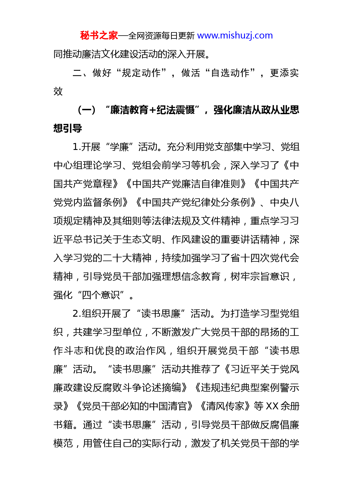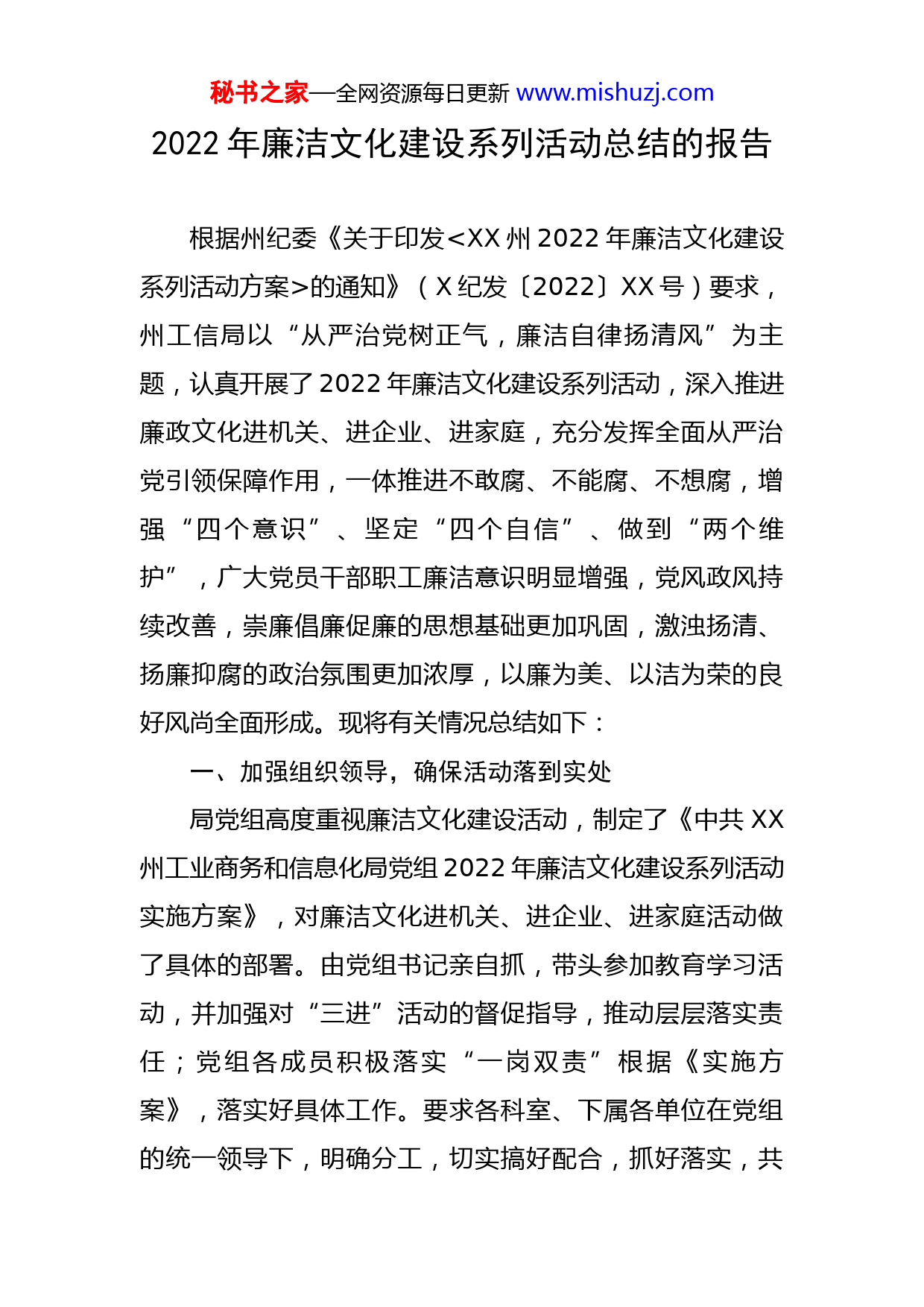 秘书之家—全网资源每日更新www.mishuzj.com2022年廉洁文化建设系列活动总结的报告根据州纪委《关于印发的通知》(X纪发〔2022〕XX号)要求,州工信局以“从严治党树正气,廉洁自律扬清风”为主题,认真开展了2022年廉洁文化建设系列活动,深入推进廉政文化进机关、进企业、进家庭,充分发挥全面从严治党引领保障作用,一体推进不敢腐、不能腐、不想腐,增强“四个意识”、坚定“四个自信”、做到“两个维护”,广大党员干部职工廉洁意识明显增强,党风政风持续改善,崇廉倡廉促廉的思想基础更加巩固,激浊扬清、扬廉抑腐的政治氛围更加浓厚,以廉为美、以洁为荣的良好风尚全面形成。现将有关情况总结如下:一、加强组织领导,确保活动落到实处局党组高度重视廉洁文化建设活动,制定了《中共XX州工业商务和信息化局党组2022年廉洁文化建设系列活动实施方案》,对廉洁文化进机关、进企业、进家庭活动做了具体的部署。由党组书记亲自抓,带头参加教育学习活动,并加强对“三进”活动的督促指导,推动层层落实责任;党组各成员积极落实“一岗双责”根据《实施方案》,落实好具体工作。要求各科室、下属各单位在党组的统一领导下,明确分工,切实搞好配合,抓好落实,共秘书之家—全网资源每日更新www.mishuzj.com同推动廉洁文化建设活动的深入开展。二、做好“规定动作”,做活“自选动作”,更添实效(一)“廉洁教育+纪法震慑”,强化廉洁从政从业思想引导1.开展“学廉”活动。充分利用党支部集中学习、党组中心组理论学习、党组会前学习等机会,深入学习了《中国共产党章程》《中国共产党廉洁自律准则》《中国共产党党内监督条例》《中国共产党纪律处分条例》、中央八项规定精神及其细则等法律法规及文件精神,重点学习习近平总书记关于生态文明、作风建设的重要讲话精神,深入学习党的二十大精神,持续加强学习了省十四次党代会精神,引导党员干部加强理想信念教育,树牢宗旨意识,强化“四个意识”。2.组织开展了“读书思廉”活动。为打造学习型党组织,共建学习型单位,不断激发广大党员干部的昂扬的工作斗志和优良的政治作风,组织开展党员干部“读书思廉”活动。“读书思廉”活动共推荐了《习近平关于党风廉政建设反腐败斗争论述摘编》《违规违纪典型案例警示录》《党员干部必知的中国清官》《清风传家》等XX余册书籍。通过“读书思廉”活动,引导党员干部做反腐倡廉模范,用管住自己的实际行动,激发了机关党员干部的学秘书之家—全网资源每日更新www.mishuzj.com习热情。3.党组书记讲授专题党课。党组书记以《树廉洁清风,倡勤政为企》为主题讲授专题党课,通过党课进一步严明了政治纪律和政治规矩,全面加强了纪律作风建设,促使全体干部职工牢固树立“四个意识”,自觉做到自身正、自身硬、自身净,从政治上、思想上、行动上拧紧廉洁“总开关”、筑牢拒腐防变的“防火墙”。4.组织观看警示教育片。组织党员干部集中观看《迷失的人生坐标——XXX典型案例廉政警示教育篇》,以鲜活贪腐案例为鉴、以案明纪,使全体党员干部接受了一次思想和灵魂的洗礼,受到了深刻的警示教育,认识到党风廉政建设的重要性和廉洁自律的必要性。5.参观一次廉政教育基地。为进一步巩固拒腐防变的思想防线,增强反腐倡廉教育的影响力,组织党员干部职工到海晏县XX州廉政警示教育基地接受廉政警示教育。通过观看影像资料、警示图片等方式,使党员干部心灵受到巨大震撼,灵魂受到巨大触动,告诫党员干部要算好人生的七笔账,切勿滥用手中的权力,葬送美好前途,毁掉幸福家庭,失去人生的自由,让大家接受了一次深刻的思想洗礼。6.开展一项专项整治。聚焦政商交往中权钱交易、利益输送等廉政风险,深入开展了构建“亲”“清”政商关系秘书之家—全网资源每日更新www.mishuzj.com中的作风突出问题专项整治,把廉洁从政从业文化渗透到政府服务和企业生产经营管理全过程,切实增强党员干部依规依法履职、民营企业家诚信廉洁从业意识,进一步营造“亲不逾矩、清不疏远、有为有畏”的良好营商环境。(二)“廉洁教育+家风建设”,涵养廉洁文化的社会新风1.发一份致党员干部家属的倡议书。活动期间,局党组向全局党员干部家属发出了一份以《致全体党员干部职工家属的倡议书》,教育引导领导干部重家教严家规正家风,把党的政治纪律和政治规矩教育内容贯穿渗透到工作时间的八小时以外,发挥家庭成员“廉内助”作用,共同培育和建设清廉家风。2.写一份党员干部给家人的廉政家书。为促进党员干部及其家庭成员自觉遵守廉洁自律各项规定,帮助家庭成员提高廉政意识,局机关组织开展给家人书写廉政家书活动,倡导党员干部家属当好“廉内助”,把好家庭“廉政关”。活动开展以来,广大党员干部职工积极响应,踊跃参与,共收到廉政家书XX余份。通过“廉政家书”进家庭活动,促进干部职工及其家庭成员牢固树立家庭思廉、倡廉、助廉意识,共同建设清廉家风,筑牢廉洁“防护墙”。(三)“廉洁教育+趣味运动会”,以寓教于乐方式感秘书之家—全网资源每日更新www.mishuzj.com受廉洁文化的深刻内涵结合主题党日活动,开展了一次廉洁趣味运动会,精心设置廉洁词语你比我猜、接“廉”不断、“廉”风传递、步步生“廉”