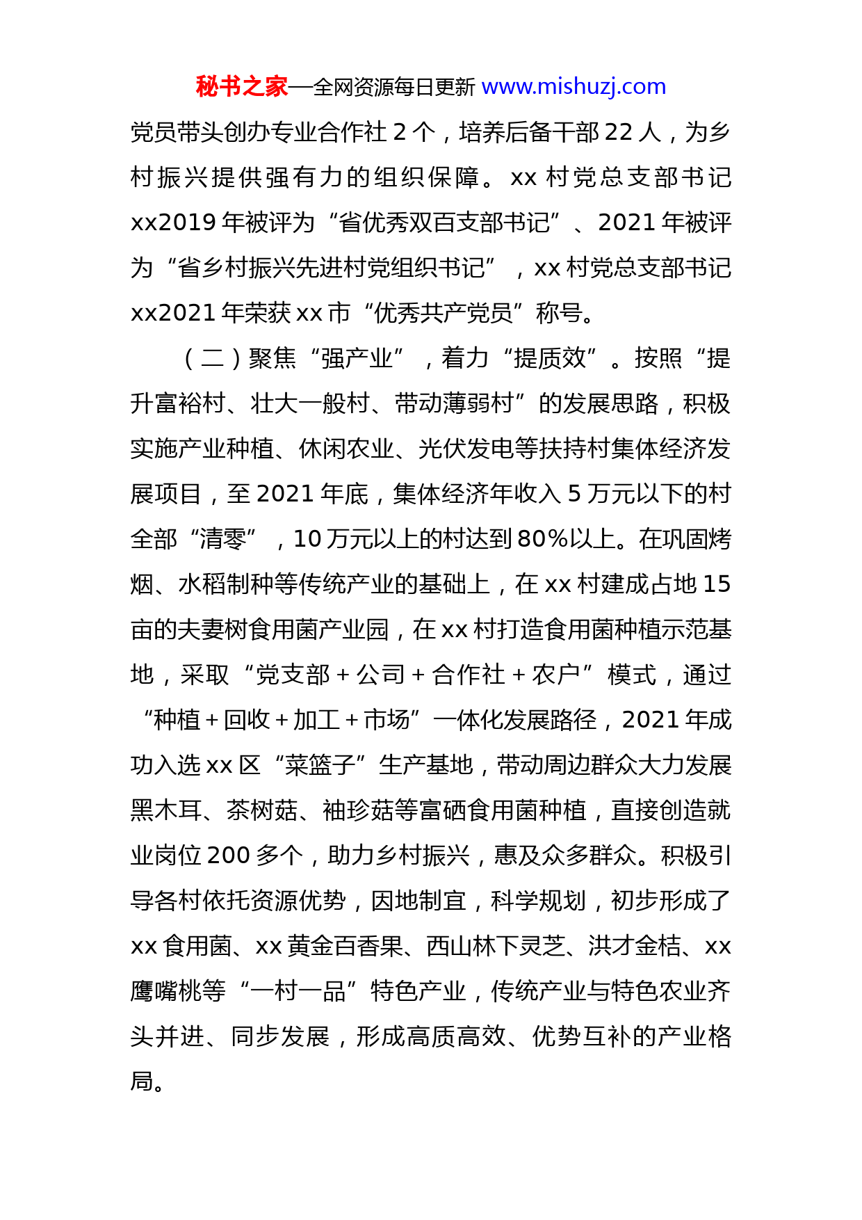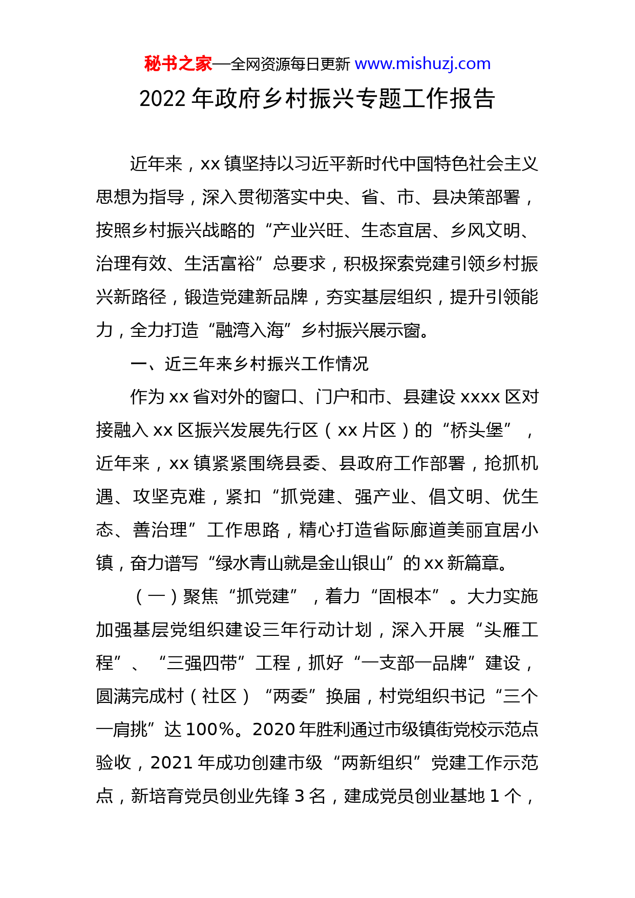 秘书之家—全网资源每日更新www.mishuzj.com2022年政府乡村振兴专题工作报告近年来,xx镇坚持以习近平新时代中国特色社会主义思想为指导,深入贯彻落实中央、省、市、县决策部署,按照乡村振兴战略的“产业兴旺、生态宜居、乡风文明、治理有效、生活富裕”总要求,积极探索党建引领乡村振兴新路径,锻造党建新品牌,夯实基层组织,提升引领能力,全力打造“融湾入海”乡村振兴展示窗。一、近三年来乡村振兴工作情况作为xx省对外的窗口、门户和市、县建设xxxx区对接融入xx区振兴发展先行区(xx片区)的“桥头堡”,近年来,xx镇紧紧围绕县委、县政府工作部署,抢抓机遇、攻坚克难,紧扣“抓党建、强产业、倡文明、优生态、善治理”工作思路,精心打造省际廊道美丽宜居小镇,奋力谱写“绿水青山就是金山银山”的xx新篇章。(一)聚焦“抓党建”,着力“固根本”。大力实施加强基层党组织建设三年行动计划,深入开展“头雁工程”、“三强四带”工程,抓好“一支部一品牌”建设,圆满完成村(社区)“两委”换届,村党组织书记“三个一肩挑”达100%。2020年胜利通过市级镇街党校示范点验收,2021年成功创建市级“两新组织”党建工作示范点,新培育党员创业先锋3名,建成党员创业基地1个,秘书之家—全网资源每日更新www.mishuzj.com党员带头创办专业合作社2个,培养后备干部22人,为乡村振兴提供强有力的组织保障。xx村党总支部书记xx2019年被评为“省优秀双百支部书记”、2021年被评为“省乡村振兴先进村党组织书记”,xx村党总支部书记xx2021年荣获xx市“优秀共产党员”称号。(二)聚焦“强产业”,着力“提质效”。按照“提升富裕村、壮大一般村、带动薄弱村”的发展思路,积极实施产业种植、休闲农业、光伏发电等扶持村集体经济发展项目,至2021年底,集体经济年收入5万元以下的村全部“清零”,10万元以上的村达到80%以上。在巩固烤烟、水稻制种等传统产业的基础上,在xx村建成占地15亩的夫妻树食用菌产业园,在xx村打造食用菌种植示范基地,采取“党支部+公司+合作社+农户”模式,通过“种植+回收+加工+市场”一体化发展路径,2021年成功入选xx区“菜篮子”生产基地,带动周边群众大力发展黑木耳、茶树菇、袖珍菇等富硒食用菌种植,直接创造就业岗位200多个,助力乡村振兴,惠及众多群众。积极引导各村依托资源优势,因地制宜,科学规划,初步形成了xx食用菌、xx黄金百香果、西山林下灵芝、洪才金桔、xx鹰嘴桃等“一村一品”特色产业,传统产业与特色农业齐头并进、同步发展,形成高质高效、优势互补的产业格局。秘书之家—全网资源每日更新www.mishuzj.com(三)聚焦“倡文明”,着力“促和谐”。以人民对美好生活的向往为奋斗目标,2018年以来,持续开展“好媳妇”、“文明家庭”、“模范夫妻”等评选活动,着力培育优良家风,组织开展家风家训进家庭、进祠堂活动,提升广大家庭的文化素养和文明素质。全面加强新时代文明实践站阵地建设,镇综合文化站2020年获评省一级站。2020年xx村被评为“xx省民主法治示范村”,目前正在全力推进“全国民主法治示范村”创建工作。大力弘扬传统文化,2021年,xx船灯舞成功入选xx省第八批省级非物质文化遗产代表性项目名录,镇文化站挂牌创建市级金狮舞传承基地,在xx村成立中国非物质文化遗产市级xx金狮艺术团。(四)聚焦“优生态”,着力“美环境”。把人居环境整治作为全面推进乡村振兴的主要抓手,统筹乡村风貌,精心规划布局,以“五宜”城乡建设为目标,统筹天际线、水岸线、路沿线“三线结合”,大力开展“提升205国道(xx段)一条对外通道、谋划一批特色产业项目、建设一个政务服务中心、完善一批公共服务设施、改造一条特色商贸街、打造一河两岸景观带”“六个一”行动,对205国道(xx)段沿线农房开展屋顶“平改坡”整治,拆除沿街铁皮瓦棚;持续开展乐干河主干道水环境整治、河道清淤、生态治理、日常管护等工作,提升河堤景秘书之家—全网资源每日更新www.mishuzj.com观;对xx农贸市场进行翻新、改造,对市场内部及周边环境开展整治,解决了以往环境设施差、食品安全无保障、垃圾随意堆放、商贩无序经营等问题;以xx农贸市场为中心,完成周边商业街路面黑化和综合管沟工程,划立停车线,提升街道商业环境;在大坝村实施“一河两岸”工程,综合打造兼具体验和观赏功能的“微田园”河堤景观,形成沿河沿路田园景观带,镇村品质大幅提升。新建了一批小公园和公益设施,连片对205国道沿线各村进行乡村风貌提升,全力打造具有xx特色的省际廊道美丽乡村风貌带。(五)聚焦“善治理”,着力“提效能”。以xx、xx村为乡村治理试点,探索“支部引领、多层共治、全要素联动”的乡村治理模式,坚持党支部引领村内各类组织,以“一个党支部管事、一张清单明事、一套机制议事、一个地方说事、一种方法评事、一个模式强事”“六事”治理模式为抓手,制定了《村民小组长目标考核责任制》《村民小组长“十好”工作制》《村民理事会“每月一汇报、每季一推进、半年一座谈、每年一表彰”》《村民协商议事会议》等制度,抓好村民小组、村民理事会、村民协商议事会“三个建设”,大力提升了村级治理效能。同时围绕农村“人、地、钱”等发展难题,试点开展“土地、资金、劳务、产业、组织”五大