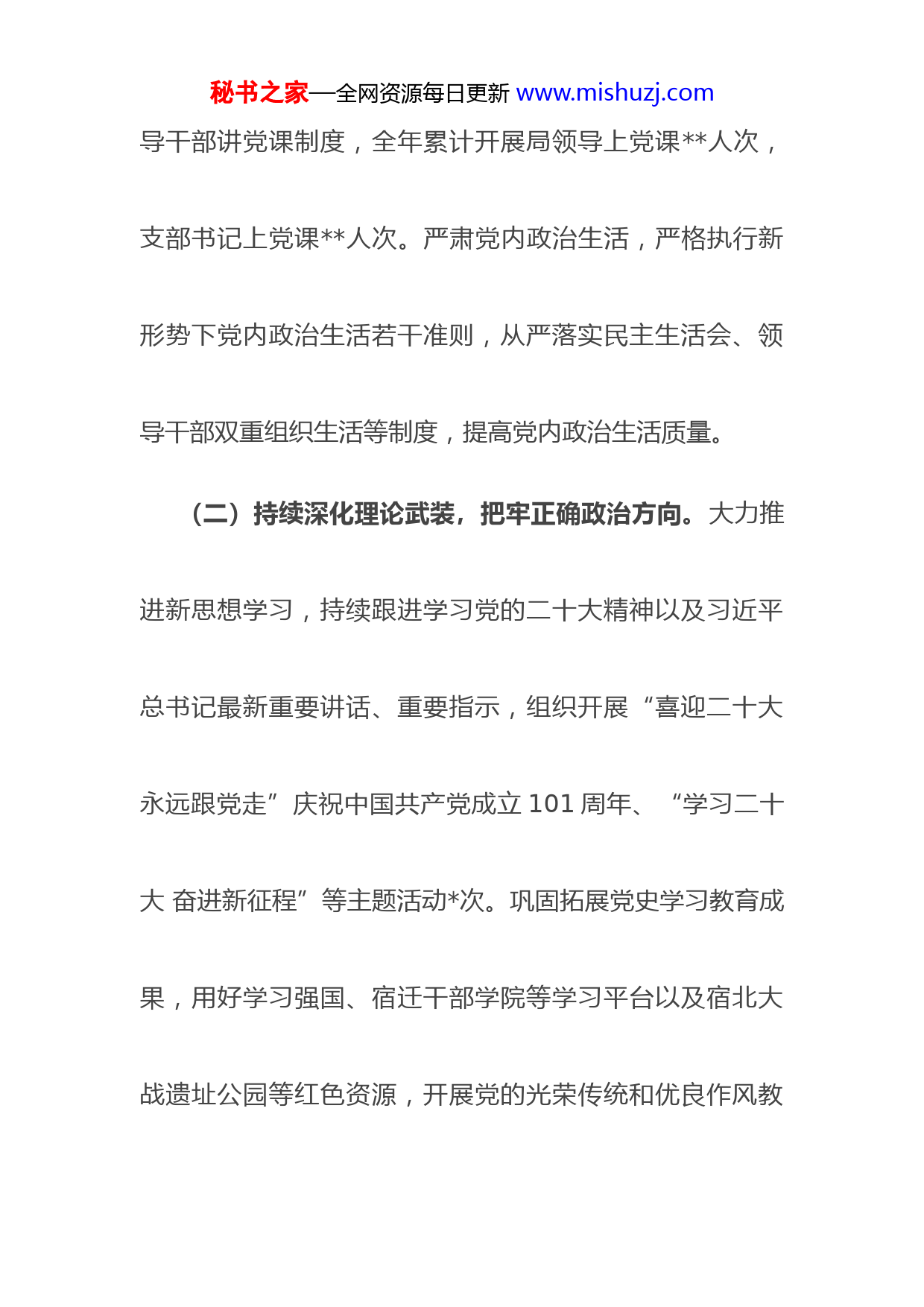 秘书之家—全网资源每日更新www.mishuzj.com2022年机关党组织书记述职报告(城管局)根据会议安排,现将2022年履行抓基层党建工作职责情况报告如下:一、履职工作情况(一)坚持政治建设统领,忠诚拥护“两个确立”。严格贯彻落实“第一议题”制度,通过集中学习、交流研讨专家讲座等多种形式,全面、系统、深入学习党的二十大精神、习近平总书记最新重要讲话和指示批示精神,全年组织中心组学习会次,专题研讨交流次,理论根基在勤学善思中得到夯实。深化对党忠诚教育,严格落实党员领秘书之家—全网资源每日更新www.mishuzj.com导干部讲党课制度,全年累计开展局领导上党课人次,支部书记上党课人次。严肃党内政治生活,严格执行新形势下党内政治生活若干准则,从严落实民主生活会、领导干部双重组织生活等制度,提高党内政治生活质量。(二)持续深化理论武装,把牢正确政治方向。大力推进新思想学习,持续跟进学习党的二十大精神以及习近平总书记最新重要讲话、重要指示,组织开展“喜迎二十大永远跟党走”庆祝中国共产党成立101周年、“学习二十大奋进新征程”等主题活动次。巩固拓展党史学习教育成果,用好学习强国、宿迁干部学院等学习平台以及宿北大战遗址公园等红色资源,开展党的光荣传统和优良作风教秘书之家—全网资源每日更新www.mishuzj.com育。严格落实意识形态工作责任制,强化意识形态阵地的建设和管理,做好意识形态领域重大敏感时间节点的预警监测、分析研判和风险防控。深入推进书香机关、学习型党组织建设,开展“悦读新思想、干部强素质”阅读分享活动次,建设“先锋书吧”个,在市级机关文化艺术节中获各类奖项个。(三)持之以恒固本强基,锻造坚强战斗堡垒。践行以人民为中心的发展思想,聚焦主责主业,构建党建引领城市治理“1+5+”标准体系。认真贯彻落实《中国共产党党和国家机关基层组织工作条例》《中国共产党支部工作条例(试行)》,扎实推进党支部“标准+示范”建设,秘书之家—全网资源每日更新www.mishuzj.com优化调整各基层党支部设置,基层党组织活力有效激发。强化党务工作者教育培训和实践锻炼,依托党员E家系统加强党员教育管理,先后召开党建工作调度会次,党务实务培训次、党性锤炼次。注重对先进分子吸纳,考察培养确定入党积极分子人,新递交入党申请书人。大力开展党内关爱,慰问老党员、生活困难党员、因公殉职党员干部遗属人次,党员的荣誉感和归属感进一步增强。(四)创新服务群众载体,抓好书记项目落实。探索实践“城市管理综合服务进小区”模式,拓展延伸“五服务五促进”内容,以在职党员“报到服务进小区”为载体,常态开展各类志愿服务、主题实践活动、联合执法服务,秘书之家—全网资源每日更新www.mishuzj.com研发综合执法进小区APP,升级“市民城管通”微信小程序,采取“智慧平台+网格员+微信随手拍”综合治理方式,帮助解决小区居民身边问题近万个。扎实开展“双联双促”先锋行动、“紫薇花开三比三创”专项提升等各类志愿服务、主题实践、联合执法服务近次,参与党员万人次。(五)锻造“三真三实”作风,提升机关服务效能。发挥“头雁领航”示范引领作用,健全作风督查机制,抓好作风意识教育,组织开展不担当问题检视查改、“小切口”项目整治、“三比三赛”主题活动,广大党员干部担当意识持续增强。扎实开展“双创一争”主题活动、“服秘书之家—全网资源每日更新www.mishuzj.com务提优年”活动等,项目《政务服务“三减一提”行动》入选全市2022年度作风问题“小切口”重点项目库,“简易办”相关做法作为“宿迁速办”首批可复制典型案例进行推广。加强廉政警示教育,组织开展党纪培训、节前廉政提醒监督、签廉政承诺书、任前廉政谈话等。持续开展作风整治,充分发挥机关纪委“前沿”“哨兵”作用,加强日常监督和执纪问责,组织开展廉洁风险点动态排查、公职人员违规参与民间借贷专项宣传教育,党员干部规矩意识进一步筑牢。二、存在问题秘书之家—全网资源每日更新www.mishuzj.com一是党建工作统筹推动力度不够。还不能很好地处理好抓党建与抓业务之间的关系,经常忙于业务工作,对基层党建的研究部署、贯彻落实力度不够,缺乏一以贯之、常抓不懈的工作韧劲。二是党建活动创新性不足。开展党建活动形式还比较单一,大多满足于上级的安排部署,结合城市管理工作实际创新的少,缺少创新力和吸引力的党建活动,还没有真正形成鲜明的党建工作特色。三是机关党建基础不牢。机关党建业务培训偏少,基层支部委员党建业务水平不高,“两个作用”发挥不够,“两个融合”谋划与落实不深入。三、下步工作思路秘书之家—全网资源每日更新www.mishuzj.com(一)以抓实基础为根本,不断提升党员干部“向心力”。把严格执行“三会一课”“主题党日”“民主评议党员”等党内政治生活制度作为加强基层组织建设的有力举措。制定党建工作任务清单,将每月主题党日、党员学习计划纳入任务清单,让广大党员干部积极参与到党内政治生活中,从行动上、思想上接受党性教育,提升思想认识。突出加强党员干部理想信念宗旨教育和对党忠诚教育以持续开展“我为群众办实事”等实践活动为载体,推进党史学习教育常态化,引导党员干部群众坚定不