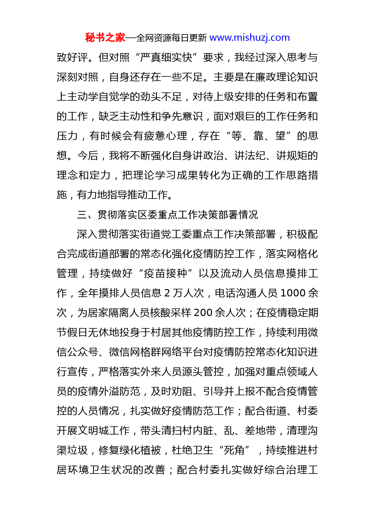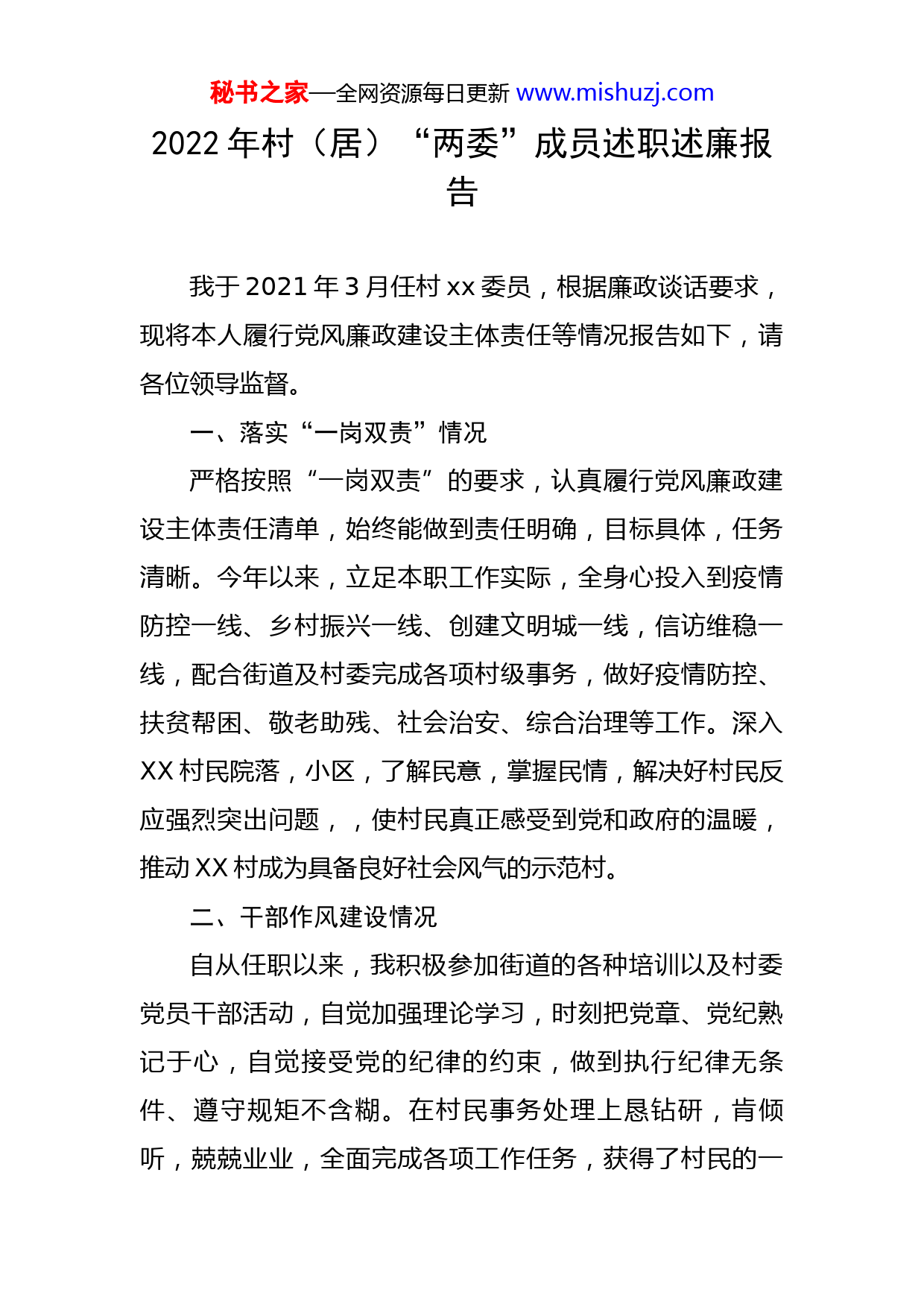 秘书之家—全网资源每日更新www.mishuzj.com2022年村(居)“两委”成员述职述廉报告我于2021年3月任村xx委员,根据廉政谈话要求,现将本人履行党风廉政建设主体责任等情况报告如下,请各位领导监督。一、落实“一岗双责”情况严格按照“一岗双责”的要求,认真履行党风廉政建设主体责任清单,始终能做到责任明确,目标具体,任务清晰。今年以来,立足本职工作实际,全身心投入到疫情防控一线、乡村振兴一线、创建文明城一线,信访维稳一线,配合街道及村委完成各项村级事务,做好疫情防控、扶贫帮困、敬老助残、社会治安、综合治理等工作。深入XX村民院落,小区,了解民意,掌握民情,解决好村民反应强烈突出问题,,使村民真正感受到党和政府的温暖,推动XX村成为具备良好社会风气的示范村。二、干部作风建设情况自从任职以来,我积极参加街道的各种培训以及村委党员干部活动,自觉加强理论学习,时刻把党章、党纪熟记于心,自觉接受党的纪律的约束,做到执行纪律无条件、遵守规矩不含糊。在村民事务处理上恳钻研,肯倾听,兢兢业业,全面完成各项工作任务,获得了村民的一秘书之家—全网资源每日更新www.mishuzj.com致好评。但对照“严真细实快”要求,我经过深入思考与深刻对照,自身还存在一些不足。主要是在廉政理论知识上主动学自觉学的劲头不足,对待上级安排的任务和布置的工作,缺乏主动性和争先意识,面对艰巨的工作任务和压力,有时候会有疲惫心理,存在“等、靠、望”的思想。今后,我将不断强化自身讲政治、讲法纪、讲规矩的理念和定力,把理论学习成果转化为正确的工作思路措施,有力地指导推动工作。三、贯彻落实区委重点工作决策部署情况深入贯彻落实街道党工委重点工作决策部署,积极配合完成街道部署的常态化强化疫情防控工作,落实网格化管理,持续做好“疫苗接种”以及流动人员信息摸排工作,全年摸排人员信息2万人次,电话沟通人员1000余次,为居家隔离人员核酸采样200余人次;在疫情稳定期节假日无休地投身于村居其他疫情防控工作,持续利用微信公众号、微信网格群网络平台对疫情防控常态化知识进行宣传,严格落实外来人员源头管控,加强对重点领域人员的疫情外溢防范,及时劝阻、引导并上报不配合疫情管控的人员情况,扎实做好疫情防范工作;配合街道、村委开展文明城工作,带头清扫村内脏、乱、差地带,清理沟渠垃圾,修复绿化植被,杜绝卫生“死角”,持续推进村居环境卫生状况的改善;配合村委扎实做好综合治理工秘书之家—全网资源每日更新www.mishuzj.com作,为群众参加新农合以及村居养老保险工作等做好宣传和指导,为村内60岁以上老人以及五保低保户等重点人员的福利待遇问题争取政策支持;配合村委扎实做好社会治安工作,尤其在街道“水系连通”工程中存在的村民矛盾纠纷中,积极参与调解,确保无上访等问题的出现。四、遵守党章党规党纪和宪法法律法规情况作为一名党员,我认真执行廉洁从政有关规定,带头模范遵守宪法以及村居法律法规,遵守《中国共产党廉洁自律准则》《中国共产党纪律处分条例》、中央“八项规定”,自觉做到坚守思想道德防线、廉洁从政底线、党纪国法红线。一直以来能够始终坚持民主集中制原则和党内生活的各项规定,在政治上、思想上、纪律上坚持原则、从不含糊,全力支持村党委工作,自觉维护班子团结,自觉树立自警、自省、自励的廉政意识。五、存在问题及下一步打算任职以来,自己在落实党风廉政建设责任制还存在对党风廉政建设及业务知识学习研究不够深入,与联系村民还不够密切等问题。下一步我将进一步加强学习,立足本职工作,严格执行“两公开一监督”的制度,廉洁自律,坚持廉洁自律,以德服人。转变工作观念,把村民满意放在第一位,多为村民办实事、办好事以实实在在的工作业绩赢得村民的拥护和信赖。秘书之家—全网资源每日更新www.mishuzj.com六、意见建议对我街道、XX村开展持续抓好党风廉政的建议主要有两点:一是加强村两委人员典型案例警示教育活动,突出解决干部不会为、不想为等问题,提升村委人员工作水平。二是突出执纪问责。全面落实新形势下,对全面从严治党的工作要求,大力支持街道纪委、监察组以“零容忍”态度查办案件,营造风清气正的政治生态环境。