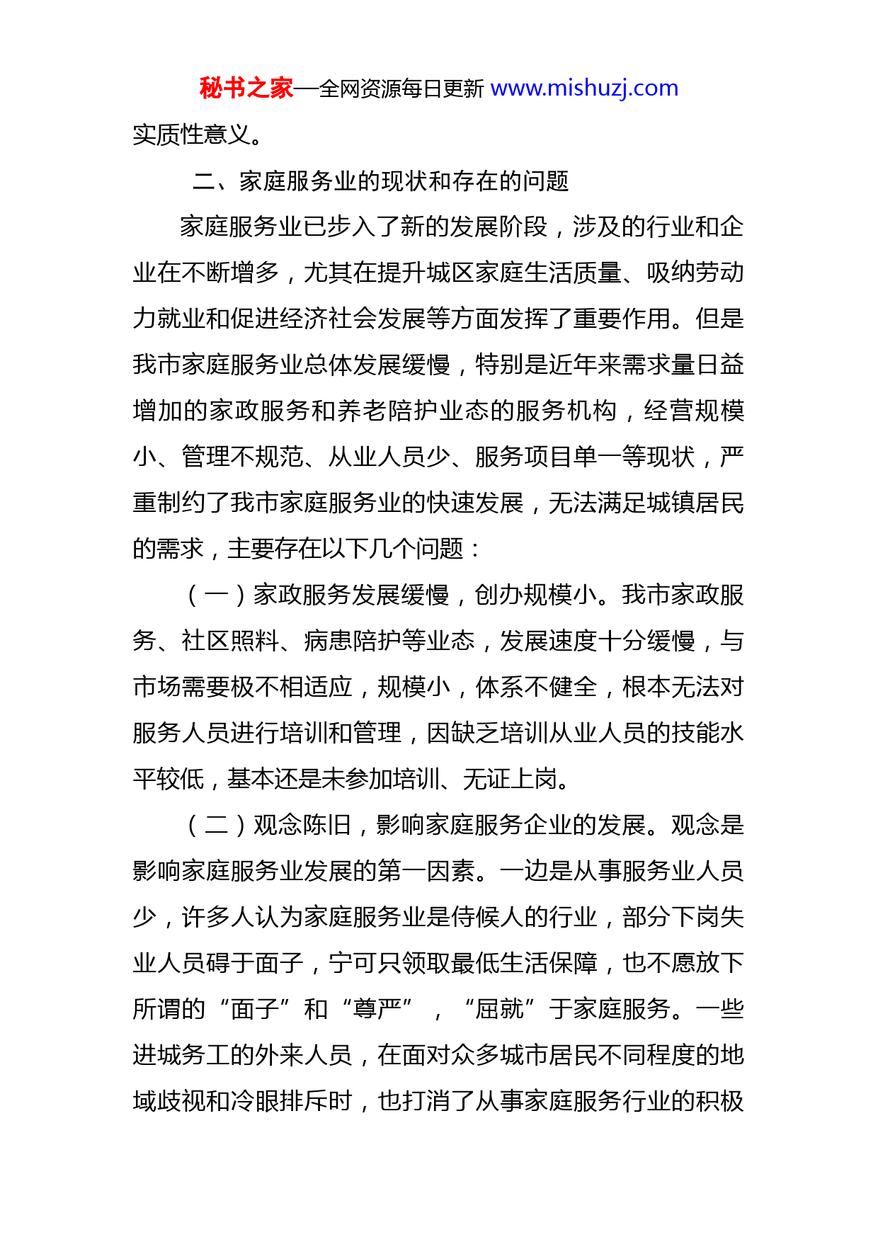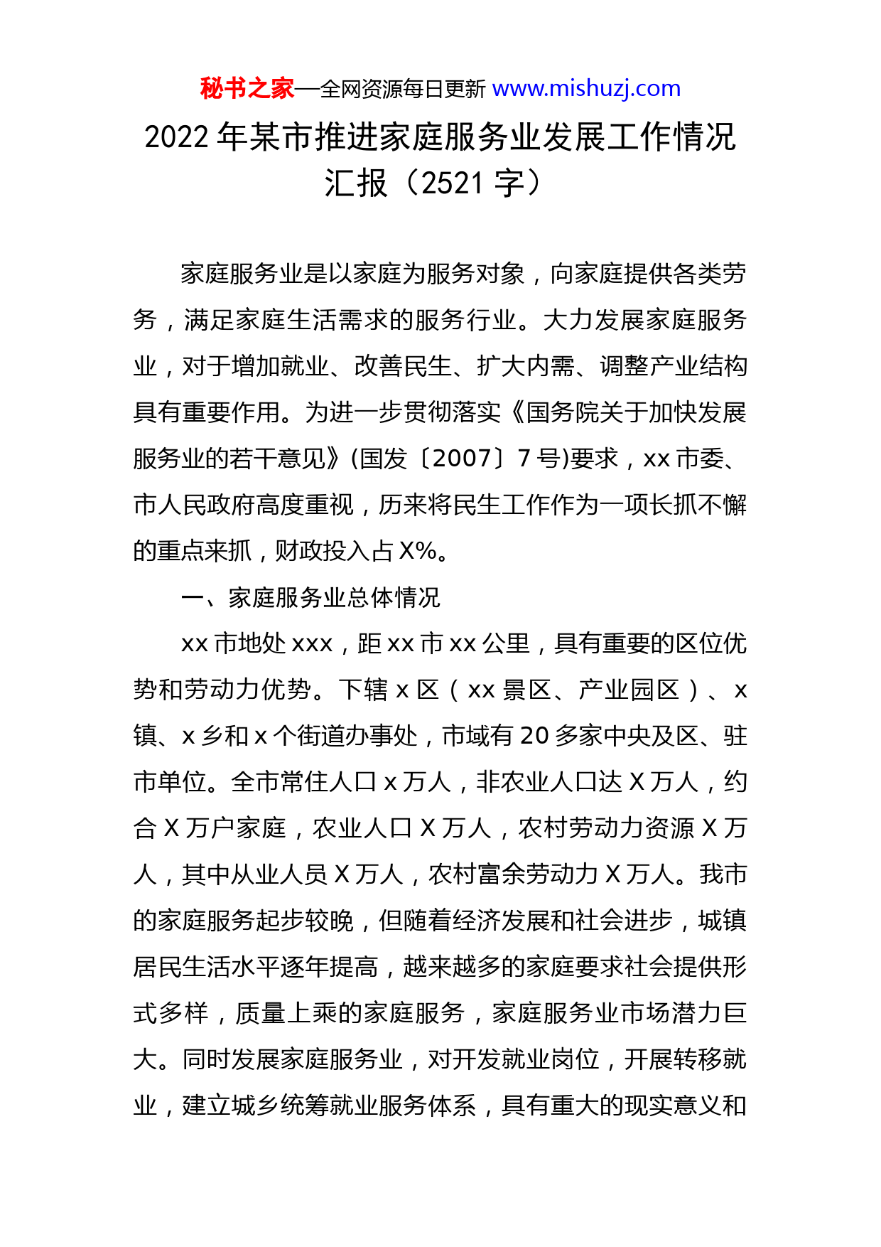秘书之家—全网资源每日更新www.mishuzj.com2022年某市推进家庭服务业发展工作情况汇报(2521字)家庭服务业是以家庭为服务对象,向家庭提供各类劳务,满足家庭生活需求的服务行业。大力发展家庭服务业,对于增加就业、改善民生、扩大内需、调整产业结构具有重要作用。为进一步贯彻落实《国务院关于加快发展服务业的若干意见》(国发〔2007〕7号)要求,xx市委、市人民政府高度重视,历来将民生工作作为一项长抓不懈的重点来抓,财政投入占X%。一、家庭服务业总体情况xx市地处xxx,距xx市xx公里,具有重要的区位优势和劳动力优势。下辖x区(xx景区、产业园区)、x镇、x乡和x个街道办事处,市域有20多家中央及区、驻市单位。全市常住人口x万人,非农业人口达X万人,约合X万户家庭,农业人口X万人,农村劳动力资源X万人,其中从业人员X万人,农村富余劳动力X万人。我市的家庭服务起步较晚,但随着经济发展和社会进步,城镇居民生活水平逐年提高,越来越多的家庭要求社会提供形式多样,质量上乘的家庭服务,家庭服务业市场潜力巨大。同时发展家庭服务业,对开发就业岗位,开展转移就业,建立城乡统筹就业服务体系,具有重大的现实意义和秘书之家—全网资源每日更新www.mishuzj.com实质性意义。二、家庭服务业的现状和存在的问题家庭服务业已步入了新的发展阶段,涉及的行业和企业在不断增多,尤其在提升城区家庭生活质量、吸纳劳动力就业和促进经济社会发展等方面发挥了重要作用。但是我市家庭服务业总体发展缓慢,特别是近年来需求量日益增加的家政服务和养老陪护业态的服务机构,经营规模小、管理不规范、从业人员少、服务项目单一等现状,严重制约了我市家庭服务业的快速发展,无法满足城镇居民的需求,主要存在以下几个问题:(一)家政服务发展缓慢,创办规模小。我市家政服务、社区照料、病患陪护等业态,发展速度十分缓慢,与市场需要极不相适应,规模小,体系不健全,根本无法对服务人员进行培训和管理,因缺乏培训从业人员的技能水平较低,基本还是未参加培训、无证上岗。(二)观念陈旧,影响家庭服务企业的发展。观念是影响家庭服务业发展的第一因素。一边是从事服务业人员少,许多人认为家庭服务业是侍候人的行业,部分下岗失业人员碍于面子,宁可只领取最低生活保障,也不愿放下所谓的“面子”和“尊严”,“屈就”于家庭服务。一些进城务工的外来人员,在面对众多城市居民不同程度的地域歧视和冷眼排斥时,也打消了从事家庭服务行业的积极秘书之家—全网资源每日更新www.mishuzj.com性和主动性。(三)政府扶持力度小,培训力量缺乏。1.政府扶持政策难以落实到位。近年来,上级政府部门虽然出台了相关扶持家庭服务行业的系列优惠政策,但由于种种原因,一些优惠政策和举措因缺乏有效的推动,难以落到实处,全市家庭服务业仍处在举步维艰的艰难境地。2.政府部门立法相对滞后。目前,家政服务被排除在《劳动法》的适用范围之外,我国尚没有一部调整规范家政服务业的全国性法律或法规,因此,家政从业人员、家政企业和用户的一些基本权益,无法得到法律的有效保障,致使供求的各方都存在后顾之忧。3.职业技能培训缺乏。政府未能牵头建立家庭服务行业从业人员培训体系,缺乏师资力量和实践培训场所,未建立起系统的培训激励机制,所以大部分从业人员从未接受过培训,也不主动要求培训提升技能。三、下一步工作对策与措施家庭服务业是拉动居民消费、劳动力转移和就业的新渠道,提升我市居民生活质量和水平,促进我市经济又好又快发展具有重要作用。当前和今后一段时期,家庭服务业发展应坚持“政府引导、企业主体、社会参与、市场运作”的方针,以促进就业和满足用户需求为宗旨,以政府扶持和典型示范为引导,以劳动保障相关政策和服务为导向,以政府办公益型和社会办效益型相结合,紧紧依托乡秘书之家—全网资源每日更新www.mishuzj.com镇、街道社区,兴办家庭服务机构,走市场化、社会化、专业化、精细化的道路,真正形成推动家庭服务行业健康有序快速发展的强大工作合力。(一)加强组织领导,建立家庭服务业组织管理体系。规范和加快我市家庭服务业的发展,不是哪一个部门所能单独完成的,需要政府牵头,相关部门和单位的共同参与。1.成立我市的家庭服务业联席会议制度,明确成员单位、职责分工和牵头单位,充分发挥各部门的职责,共同推进我市家庭服务业的发展。2.加快家庭服务业行业协会建设,在开办经费、办公场地、人员配备等方面给予扶持。充分发挥行业协会的作用,研究制定行业标准,切实加强对会员单位的管理,坚持向会员提供实用信息支持和项目建设建议,促进会员单位之间的交流沟通,协助有关部门调查处理恶意竞争和违反行业规定的企业,规范行业经营,督促行业不断提高服务质量和水平。(二)加强社会舆论引导,不断提升家庭服务业的社会地位。坚持正确的舆论导向,帮助人们加快突破思想观念障碍。1.广泛宣传。充分发挥各新闻媒体的宣传优势,大力宣传家庭服务业的新理念、新知识,积极引导社会转变就业观念,树立正确的择业观,逐步形成全社会尊重家庭服务从业人员的新风尚,营造“家庭服务光荣”的良好社会氛围。2.鼓励引导。坚持面向基层、面向社区、面向群秘书之家—全网资源每日
