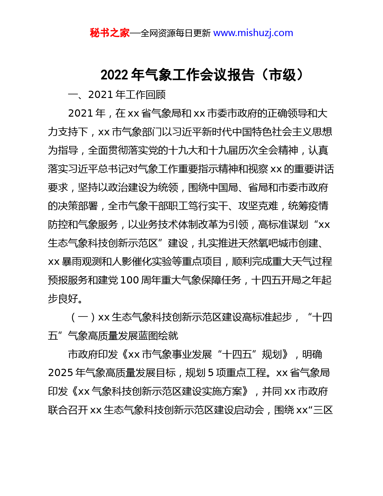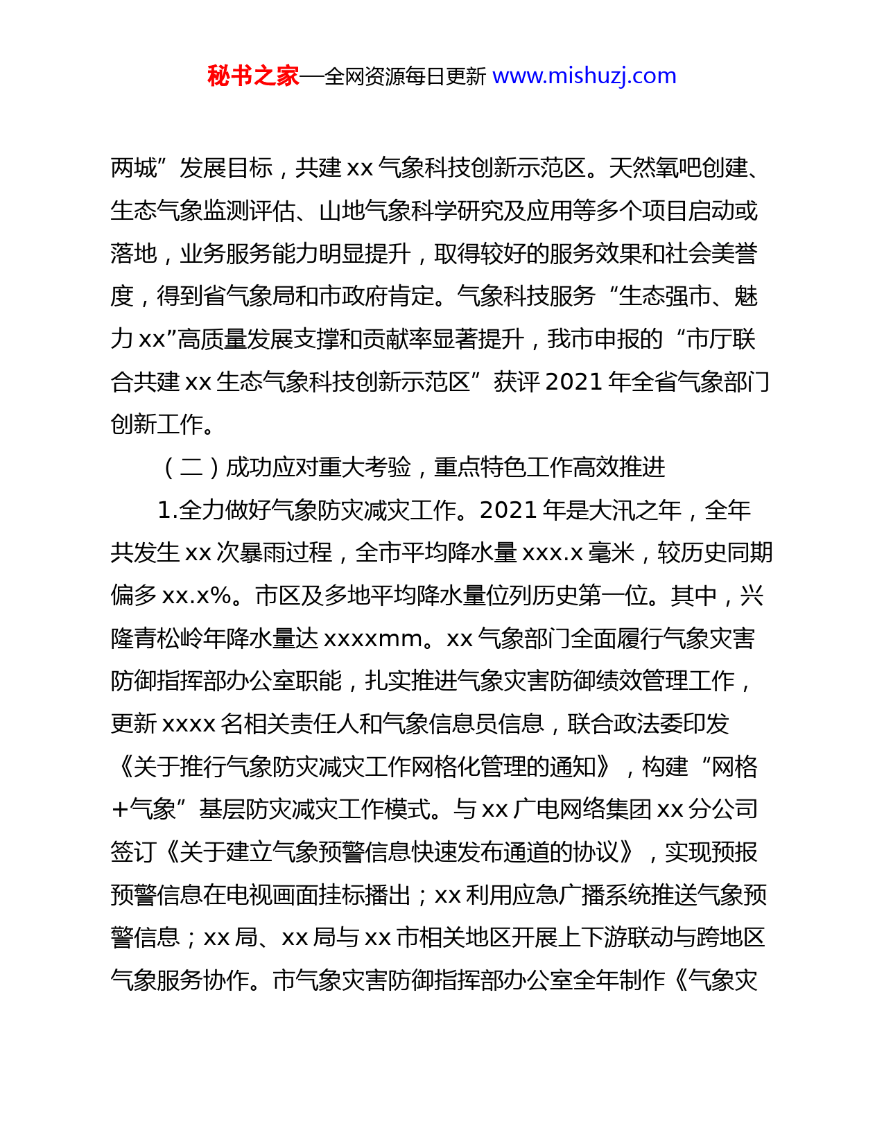 秘书之家—全网资源每日更新www.mishuzj.com2022年气象工作会议报告(市级)一、2021年工作回顾2021年,在xx省气象局和xx市委市政府的正确领导和大力支持下,xx市气象部门以习近平新时代中国特色社会主义思想为指导,全面贯彻落实党的十九大和十九届历次全会精神,认真落实习近平总书记对气象工作重要指示精神和视察xx的重要讲话要求,坚持以政治建设为统领,围绕中国局、省局和市委市政府的决策部署,全市气象干部职工笃行实干、攻坚克难,统筹疫情防控和气象服务,以业务技术体制改革为引领,高标准谋划“xx生态气象科技创新示范区”建设,扎实推进天然氧吧城市创建、xx暴雨观测和人影催化实验等重点项目,顺利完成重大天气过程预报服务和建党100周年重大气象保障任务,十四五开局之年起步良好。(一)xx生态气象科技创新示范区建设高标准起步,“十四五”气象高质量发展蓝图绘就市政府印发《xx市气象事业发展“十四五”规划》,明确2025年气象高质量发展目标,规划5项重点工程。xx省气象局印发《xx气象科技创新示范区建设实施方案》,并同xx市政府联合召开xx生态气象科技创新示范区建设启动会,围绕xx“三区秘书之家—全网资源每日更新www.mishuzj.com两城”发展目标,共建xx气象科技创新示范区。天然氧吧创建、生态气象监测评估、山地气象科学研究及应用等多个项目启动或落地,业务服务能力明显提升,取得较好的服务效果和社会美誉度,得到省气象局和市政府肯定。气象科技服务“生态强市、魅力xx”高质量发展支撑和贡献率显著提升,我市申报的“市厅联合共建xx生态气象科技创新示范区”获评2021年全省气象部门创新工作。(二)成功应对重大考验,重点特色工作高效推进1.全力做好气象防灾减灾工作。2021年是大汛之年,全年共发生xx次暴雨过程,全市平均降水量xxx.x毫米,较历史同期偏多xx.x%。市区及多地平均降水量位列历史第一位。其中,兴隆青松岭年降水量达xxxxmm。xx气象部门全面履行气象灾害防御指挥部办公室职能,扎实推进气象灾害防御绩效管理工作,更新xxxx名相关责任人和气象信息员信息,联合政法委印发《关于推行气象防灾减灾工作网格化管理的通知》,构建“网格+气象”基层防灾减灾工作模式。与xx广电网络集团xx分公司签订《关于建立气象预警信息快速发布通道的协议》,实现预报预警信息在电视画面挂标播出;xx利用应急广播系统推送气象预警信息;xx局、xx局与xx市相关地区开展上下游联动与跨地区气象服务协作。市气象灾害防御指挥部办公室全年制作《气象灾秘书之家—全网资源每日更新www.mishuzj.com害风险预警服务快报》xx期,发布内部明电xx期,启动重大气象灾害应急响应x次,为政府领导决策和指挥部各成员单位成功应对气象灾害提供科学依据。气象灾害风险普查工作稳步推进。2.毫不松懈抓好疫情防控。依法、科学、有序开展疫情防控常态化管理,根据疫情形势变化,不断完善防控举措。加强内部日常疫情排查,强化院落重点环节防控,完善相关预案,完成职工疫苗接种工作。有序开展疫情防控气象服务保障工作,及时报告重大天气过程对疫情防控可能产生的影响。3.深化业务技术体制改革。聚焦解决目前制约xx气象业务发展的瓶颈和问题,对标监测精密,预报精准、服务精细的总要求,通过“走出去”、“请进来”、“本地化”引智创新,积极探索业务技术体制改革新路子。全面梳理市县观测保障业务流程,制定了《xx市气象局气象观测保障队伍建设实施方案》等x项方案和细则,保证气象观测设备质量,xxxx年设备稳定运行率(业务可用性)xx.xx%;市县预警发布无错情,市县灾害性天气预警发布准确率xx.x%。开展预报员走基层活动,市局预报员深入县局参与气象服务工作,指导业务软件应用和决策气象服务工作。优化专业气象服务体系,明确了x+N+x业务布局,梳理“僵尸”气象服务业务和产品清单,合并服务产品x项,撤销服务产品x项,增加服务产品x项。秘书之家—全网资源每日更新www.mishuzj.com4.全力打造xx生态名片。推动市政府印发《xx市“中国天然氧吧”城市创建工作实施方案》,并列入市第十次党代会和第十五次人代会工作报告,围场成功保持“中国天然氧吧”县称号,xx等县已启动天然氧吧县建设。市级打造统一的数据平台、制作负氧离子监测分析报告,发布负氧离子监测数据和空气清新指数。与高分辨率对地观测系统xx生态气象应用中心和xx市高分卫星数据应用中心深度合作,开展植被长势、水体等生态环境动态监测评估,定期发布监测评估报告,并建立了x县x区生态档案。《2000-2020年xx市植被生态遥感监测分析报告》得到市政府充分肯定。5.着力推进研究型业务发展。组建生态气象科技创新和旅游康养气象创新团队,大力推动研究型业务。王宏创新工作室新荣获省级科技创新工作室。和中国气象科学研究院、xx大气所、xx大学、xx民族师范学院、xx市高分卫星数据应用中心等单位建立了合作关系,联合开展了通量观测理论和应用技术研究,申报了科研项目“双碳战略下基层气象部门生态气象服务对策和技术应用研究”和“xx市生态气象综合应用保障技术研究”。启动了xx地区暴雨观测试验和迎风坡降水人影试验。申报市厅级以上科研项目x项,x篇科技论文在SCI或国家核心气象期刊录用,新秘书之家—全网资源每日更新www.mishuz