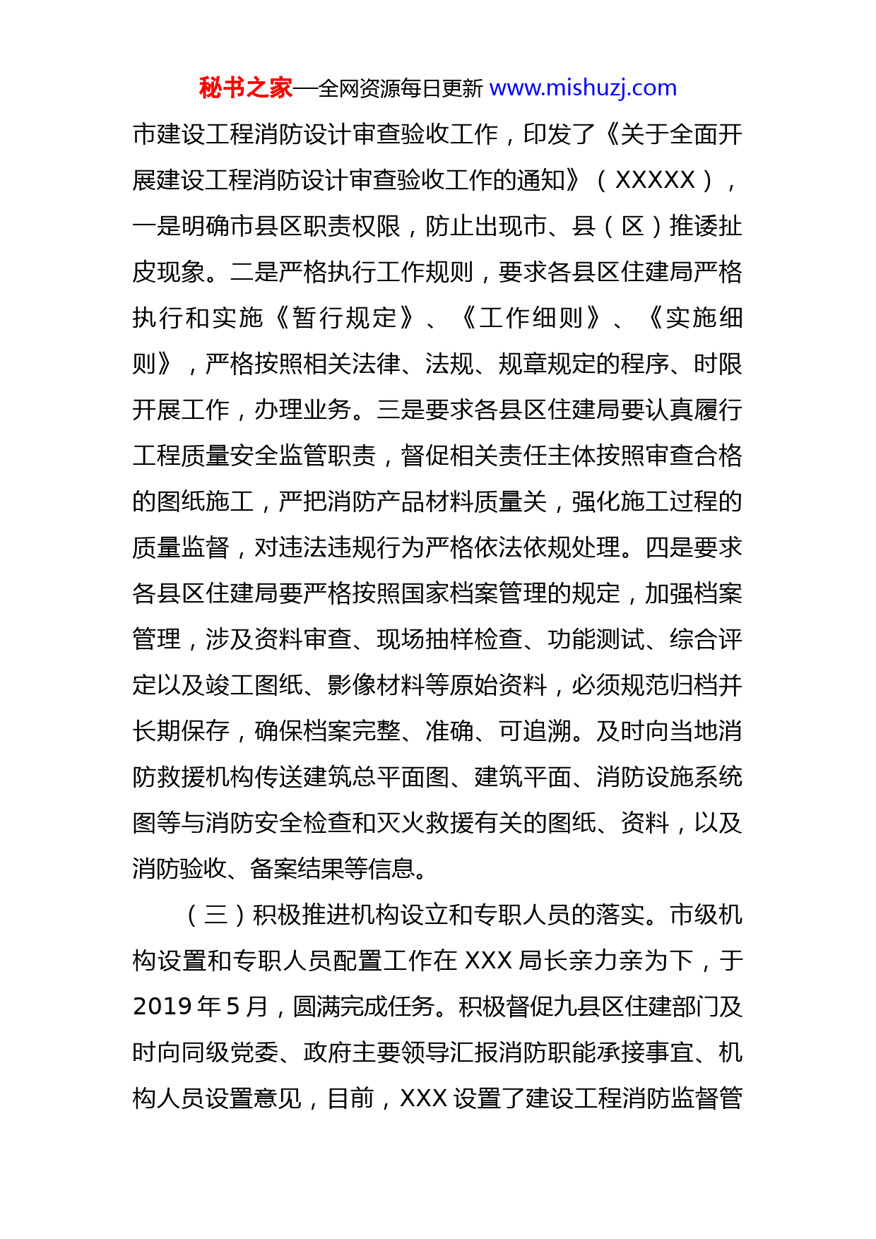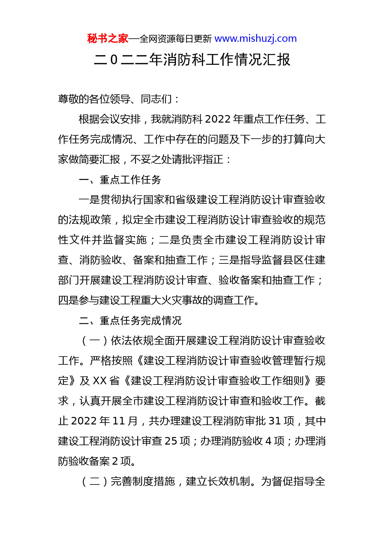 秘书之家—全网资源每日更新www.mishuzj.com二O二二年消防科工作情况汇报尊敬的各位领导、同志们:根据会议安排,我就消防科2022年重点工作任务、工作任务完成情况、工作中存在的问题及下一步的打算向大家做简要汇报,不妥之处请批评指正:一、重点工作任务一是贯彻执行国家和省级建设工程消防设计审查验收的法规政策,拟定全市建设工程消防设计审查验收的规范性文件并监督实施;二是负责全市建设工程消防设计审查、消防验收、备案和抽查工作;三是指导监督县区住建部门开展建设工程消防设计审查、验收备案和抽查工作;四是参与建设工程重大火灾事故的调查工作。二、重点任务完成情况(一)依法依规全面开展建设工程消防设计审查验收工作。严格按照《建设工程消防设计审查验收管理暂行规定》及XX省《建设工程消防设计审查验收工作细则》要求,认真开展全市建设工程消防设计审查和验收工作。截止2022年11月,共办理建设工程消防审批31项,其中建设工程消防设计审查25项;办理消防验收4项;办理消防验收备案2项。(二)完善制度措施,建立长效机制。为督促指导全秘书之家—全网资源每日更新www.mishuzj.com市建设工程消防设计审查验收工作,印发了《关于全面开展建设工程消防设计审查验收工作的通知》(XXXXX),一是明确市县区职责权限,防止出现市、县(区)推诿扯皮现象。二是严格执行工作规则,要求各县区住建局严格执行和实施《暂行规定》、《工作细则》、《实施细则》,严格按照相关法律、法规、规章规定的程序、时限开展工作,办理业务。三是要求各县区住建局要认真履行工程质量安全监管职责,督促相关责任主体按照审查合格的图纸施工,严把消防产品材料质量关,强化施工过程的质量监督,对违法违规行为严格依法依规处理。四是要求各县区住建局要严格按照国家档案管理的规定,加强档案管理,涉及资料审查、现场抽样检查、功能测试、综合评定以及竣工图纸、影像材料等原始资料,必须规范归档并长期保存,确保档案完整、准确、可追溯。及时向当地消防救援机构传送建筑总平面图、建筑平面、消防设施系统图等与消防安全检查和灭火救援有关的图纸、资料,以及消防验收、备案结果等信息。(三)积极推进机构设立和专职人员的落实。市级机构设置和专职人员配置工作在XXX局长亲力亲为下,于2019年5月,圆满完成任务。积极督促九县区住建部门及时向同级党委、政府主要领导汇报消防职能承接事宜、机构人员设置意见,目前,XXX设置了建设工程消防监督管秘书之家—全网资源每日更新www.mishuzj.com理站,落实事业编制6名,XXX落实事业编制1名,七县区全部向同级编制主管部门呈报了《关于核增建设工程消防监督机构的请示》,衔接了机构编制设置事项。(四)提高技术支撑能力,推进信息化建设。积极推进建设工程消防设计审查、消防验收、备案和抽查工作的信息化建设,通过网络技术、数字存贮、系统管理等信息化手段,提高建设工程消防设计审查验收工作能力和水平。现已安排软件方积极有序开展建设工程消防设计审查验收工作信息管理平台建设,并已做好前期相关工作,拟定完成系统建设实施细则。目前,申报端程序页面已搭建部署完成,业务申报流程、申报材料、申请表单、以及各系统之间的对接关系已梳理完毕,审批端审批人员接件、待办提醒功能已建设完成,业务监管、业务查询、业务统计等辅助决策功能模型已初步建设完成。三、存在的问题建设工程消防设计审查验收是专业性、技术性极强,风险与责任极为重大的工作,监管人员均需具有专业的消防知识或取得消防工作执业资格,由于工作人员业务不熟、政策不精和用于工作的相关信息系统的不完善,在工作开展中还存在审查验收工作责任认识不足、技术服务支撑不强、建设工程消防设计审查验收不全面等问题。四、下一步打算秘书之家—全网资源每日更新www.mishuzj.com下一步,我科室将继续认真履责,坚决贯彻落实上级文件精神和市委市政府机构改革要求,按照建设工程消防设计审查和验收的有关规定,不断加强相关人员学习和培训,尽快掌握建设工程消防设计验收标准规范、消防设计审查和验收工作流程与要点等,完善消防设计审查和验收制度,进一步加快落实机构设置和专职人员配备,积极采取政府购买服务方式,充分利用第三方技术服务机构推进工作开展,确保我市建设工程消防设计审查和验收工作顺利开展。