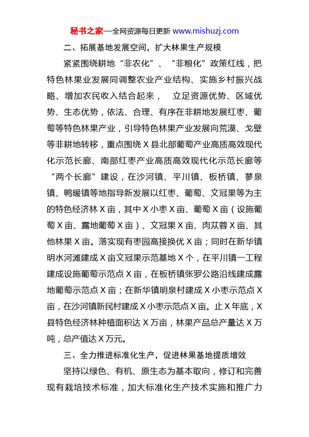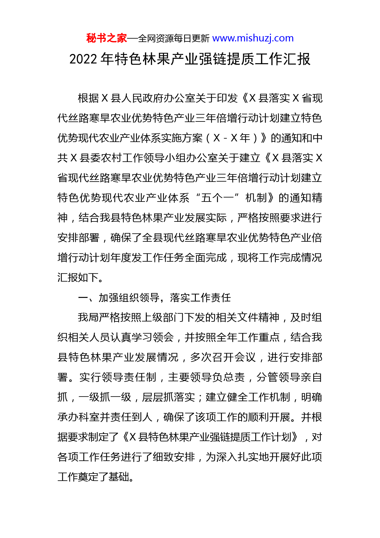 秘书之家—全网资源每日更新www.mishuzj.com2022年特色林果产业强链提质工作汇报根据X县人民政府办公室关于印发《X县落实X省现代丝路寒旱农业优势特色产业三年倍增行动计划建立特色优势现代农业产业体系实施方案(X-X年)》的通知和中共X县委农村工作领导小组办公室关于建立《X县落实X省现代丝路寒旱农业优势特色产业三年倍增行动计划建立特色优势现代农业产业体系“五个一”机制》的通知精神,结合我县特色林果产业发展实际,严格按照要求进行安排部署,确保了全县现代丝路寒旱农业优势特色产业倍增行动计划年度发工作任务全面完成,现将工作完成情况汇报如下。一、加强组织领导,落实工作责任我局严格按照上级部门下发的相关文件精神,及时组织相关人员认真学习领会,并按照全年工作重点,结合我县特色林果产业发展情况,多次召开会议,进行安排部署。实行领导责任制,主要领导负总责,分管领导亲自抓,一级抓一级,层层抓落实;建立健全工作机制,明确承办科室并责任到人,确保了该项工作的顺利开展。并根据要求制定了《X县特色林果产业强链提质工作计划》,对各项工作任务进行了细致安排,为深入扎实地开展好此项工作奠定了基础。秘书之家—全网资源每日更新www.mishuzj.com二、拓展基地发展空间,扩大林果生产规模紧紧围绕耕地“非农化”、“非粮化”政策红线,把特色林果业发展同调整农业产业结构、实施乡村振兴战略、增加农民收入结合起来,立足资源优势、区域优势、生态优势,依法、合理、有序在非耕地发展红枣、葡萄等特色林果产业,引导特色林果产业发展向荒漠、戈壁等非耕地转移,重点围绕X县北部葡萄产业高质高效现代化示范长廊、南部红枣产业高质高效现代化示范长廊等“两个长廊”建设,在沙河镇、平川镇、板桥镇、蓼泉镇、鸭暖镇等地指导新发展以红枣、葡萄、文冠果等为主的特色经济林X亩,其中X小枣X亩、葡萄X亩(设施葡萄X亩、露地葡萄X亩)、文冠果X亩、肉苁蓉X亩、其他林果X亩。落实现有枣园高接换优X亩;同时在新华镇明水河滩建成X亩文冠果示范基地X个,在平川镇一工程建成设施葡萄示范点X亩,在板桥镇张罗公路沿线建成露地葡萄示范点X亩;在新华镇明泉村建成X小枣示范点X亩,在沙河镇新民村建成X小枣示范点X亩。止X年底,X县特色经济林种植面积达X万亩,林果产品总产量达X万吨,总产值达X万元。三、全力推进标准化生产,促进林果基地提质增效坚持以绿色、有机、原生态为基本取向,修订和完善现有栽培技术标准,加大标准化生产技术实施和推广力秘书之家—全网资源每日更新www.mishuzj.com度。大力推广宽行密株省力化栽培、水肥一体化、病虫害无害化防控、机械化作业等先进栽植模式,在全县林果基地重点推广老枣树更新复壮、整形修剪、花期喷水、喷肥、果穗套袋、生物有机肥使用、高效节水滴灌等绿色(有机)标准化栽培管理技术,完成经济林提质增效X亩,其中葡萄X亩,红枣X亩。四、健全科技服务体系,夯实产业发展技术支撑结合特色林果产业发展,先后邀请X农业大学教授X、省农科院研究员X、X及市林果专家来我县现场会诊解决经济林果生产中的疑难问题,主要针对葡萄提质增效、梨树省力化栽培、桃、杏标准化管理等方面开展专题培训。同时,积极组织技术干部到各镇采取集中培训和现场示范相结合的方式,分层次举办各类经济林整形修剪、标准化管理等生产实用技术的灌输式培训,至目前已组织开展培训X场次,培训林农X人次,技术骨干X人次,印发政策宣传材料、特色林果栽培技术要点X多份,技术手册X余册。并通过公务网站GX系统及林果业技术交流、矮化密植枣园栽培管理、葡萄栽培管理等QQ、微信新型媒介群,结合葡萄、红枣、梨等主要经济林树种生产农时物候特点,向各镇、各国有林场及林果种植大户发布“林业有害生物病虫情报”和“林果业技术信息”等指导性技术措施。至目前,编印发布发布“林业有害生物病虫情报”X秘书之家—全网资源每日更新www.mishuzj.com期,“林果业技术信息”X期。通过培训宣传,进一步提高了广大果农标准化管理水平,为增产增收打下良好的基础。五、多渠道引种引技,推进科技成果转化与应用针对特色林果产业发展实际,继续开展果树优良品种引进试验示范,今年先后引进推广X等葡萄优良品种X个,中油X号、福秀、秋彤、秋燕等桃优良品种X个,丑梨、新梨X号、南国梨等梨优良品种X个,以及鲁丽苹果优良品种X个;同时围绕特色林果产业发展实际,示范推广葡萄v形架栽培模式、戈壁荒漠土壤改良技术、戈壁荒漠造林绿化保水剂的推广应用、梨树省力化栽培、梨树病虫害生物防治、杨树蛀干天牛树皮穿透技术等新技术X项,林业科技推广与示范成效明显增强。六、推行政策性经济林保险,增强果农抵御风险能力为进一步增强林农应对自然风险的能力,降低特色林果业在自然灾害中的经济损失,提高地方优势特色林果产业发展的稳定性,X结合我县实际情况,按照“政府引导、市场运作、自主自愿、协同推进”的基本原则,再次在我县开展经济林保险工作,引导新型经营主体、种植户积极参保投保、应保尽保,对购买保险的,县级财政给予保费X%的补贴(贫困户X%)。X月份农业农村局通过统一公开招标,确定中国人寿财产、中国人民财产、黄河财产、中秘书之家—全网