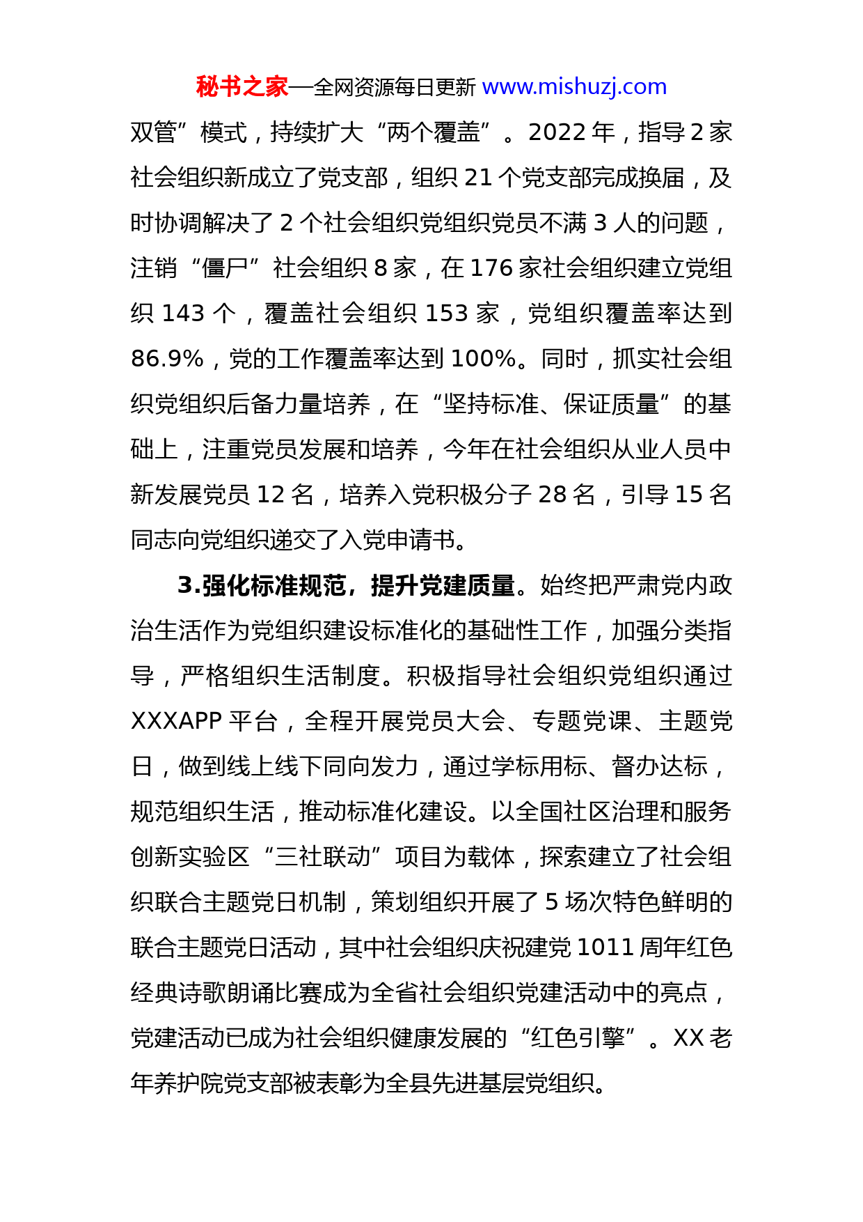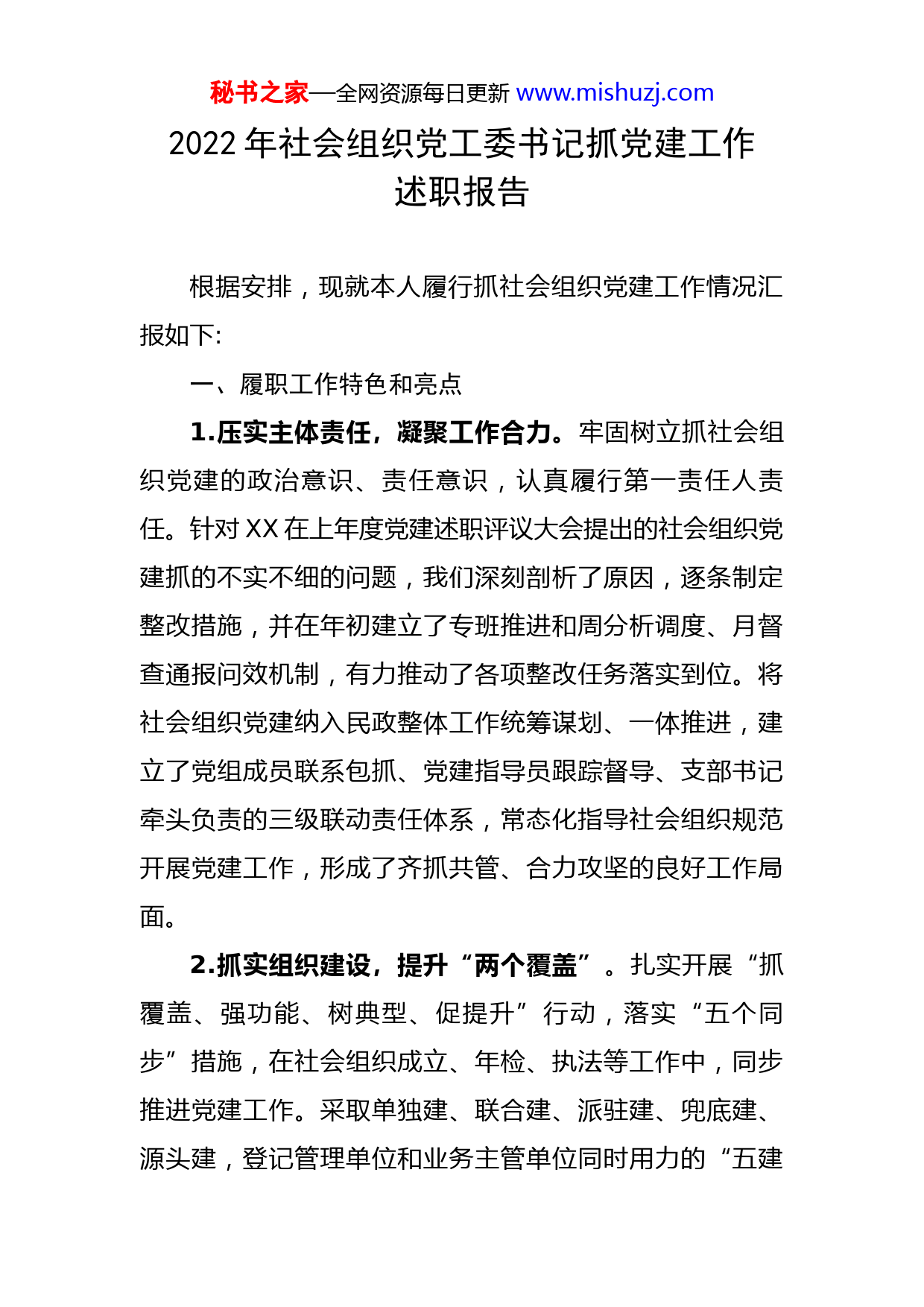 秘书之家—全网资源每日更新www.mishuzj.com2022年社会组织党工委书记抓党建工作述职报告根据安排,现就本人履行抓社会组织党建工作情况汇报如下:一、履职工作特色和亮点1.压实主体责任,凝聚工作合力。牢固树立抓社会组织党建的政治意识、责任意识,认真履行第一责任人责任。针对XX在上年度党建述职评议大会提出的社会组织党建抓的不实不细的问题,我们深刻剖析了原因,逐条制定整改措施,并在年初建立了专班推进和周分析调度、月督查通报问效机制,有力推动了各项整改任务落实到位。将社会组织党建纳入民政整体工作统筹谋划、一体推进,建立了党组成员联系包抓、党建指导员跟踪督导、支部书记牵头负责的三级联动责任体系,常态化指导社会组织规范开展党建工作,形成了齐抓共管、合力攻坚的良好工作局面。2.抓实组织建设,提升“两个覆盖”。扎实开展“抓覆盖、强功能、树典型、促提升”行动,落实“五个同步”措施,在社会组织成立、年检、执法等工作中,同步推进党建工作。采取单独建、联合建、派驻建、兜底建、源头建,登记管理单位和业务主管单位同时用力的“五建秘书之家—全网资源每日更新www.mishuzj.com双管”模式,持续扩大“两个覆盖”。2022年,指导2家社会组织新成立了党支部,组织21个党支部完成换届,及时协调解决了2个社会组织党组织党员不满3人的问题,注销“僵尸”社会组织8家,在176家社会组织建立党组织143个,覆盖社会组织153家,党组织覆盖率达到86.9%,党的工作覆盖率达到100%。同时,抓实社会组织党组织后备力量培养,在“坚持标准、保证质量”的基础上,注重党员发展和培养,今年在社会组织从业人员中新发展党员12名,培养入党积极分子28名,引导15名同志向党组织递交了入党申请书。3.强化标准规范,提升党建质量。始终把严肃党内政治生活作为党组织建设标准化的基础性工作,加强分类指导,严格组织生活制度。积极指导社会组织党组织通过XXXAPP平台,全程开展党员大会、专题党课、主题党日,做到线上线下同向发力,通过学标用标、督办达标,规范组织生活,推动标准化建设。以全国社区治理和服务创新实验区“三社联动”项目为载体,探索建立了社会组织联合主题党日机制,策划组织开展了5场次特色鲜明的联合主题党日活动,其中社会组织庆祝建党1011周年红色经典诗歌朗诵比赛成为全省社会组织党建活动中的亮点,党建活动已成为社会组织健康发展的“红色引擎”。XX老年养护院党支部被表彰为全县先进基层党组织。秘书之家—全网资源每日更新www.mishuzj.com4.抓实学习教育,激发党建活力。做实“党建+”文章,引导社会组织主动融入文明城市创建、疫情防控、乡村振兴、基层社会治理等重点工作。发挥社会组织行业特色,组织开展“我为群众办实事,助力乡村振兴”“汇聚志愿力量,邻里守望关爱,共筑免疫屏障”等实践活动10余场次。在10月份全县疫情防控阻击战中,充分整合社区、社会组织、社会工作者、志愿者和公益慈善资源优势,“五社”联动参与疫情防控,动员100多家社会组织积极募集捐款捐物,彰显了社会组织力量。二、存在的问题及原因主要问题:一是社会组织党建工作责任压力传导还不到位。对一些社会组织党组织开展组织生活不规范等问题纠正不及时,抓党建工作思路还不够开阔、方法不够灵活,在破解存在问题、激发社会组织活力上用力不足。二是巩固提升“两个覆盖”质量还有差距。因社会组织相对松散,党的工作“有形覆盖”易、“有效覆盖”难的问题比较突出,特别是乡镇水协会、扶贫互助协会等挂靠型、功能型支部有组织、无活动的问题尚未得到有效解决。三是党组织服务功能发挥还不充分。社会组织党员人数少、且流动性大,社会组织党建工作面临党组织组建难、巩固难、发挥作用难、党员发展难和党员教育管理难等“五难”困境,战斗堡垒作用还不明显。秘书之家—全网资源每日更新www.mishuzj.com产生问题的原因分析:一是抓社会组织党建工作用力不够,把更多的精力投入到了机关全面从严治党和民生保障中心工作上,在具体工作中提要求、交任务多,片面认为社会组织党建工作直接责任在业务主管部门,个人直接盯办抓得少,在整合资源、统筹协调上尚未形成有效合力,缺乏钉钉子精神。二是对社会组织领域党建工作思考还不深,创造性开展工作的眼界还不够开阔,协调行业主管部门、业务指导单位,持续抓“两个覆盖”方面推出的创新举措还不多。三是党员干部教育管理的机制不够健全完善,考核评价体系还不够科学合理,党员管理教育缺乏有力的抓手和行之有效的措施;对社会组织党建工作开展点对点调研、面对面指导的少,分类指导管理还不够到位。三、下一步工作思路和措施1.进一步理顺管理机制。不断探索推进社会组织党建工作发展的新途径、新举措,完善社会组织党建工作责任制,通过上下协同,形成由非公和社会组织工委牵头抓总、社会组织党委指导协调、业务主管单位推进落实的社会组织党建工作格局。坚持问题导向,补齐工作短板,在组织体系建立、专职力量配备、经费保障落实、管理体制创新等方面,形成务实管用的长效机制,推动党建工作顺利开展。2.进一步压实工作责任。探索把社会组织党建列入业秘书之家—全网资源每日更新www.mishuzj.com务主管部