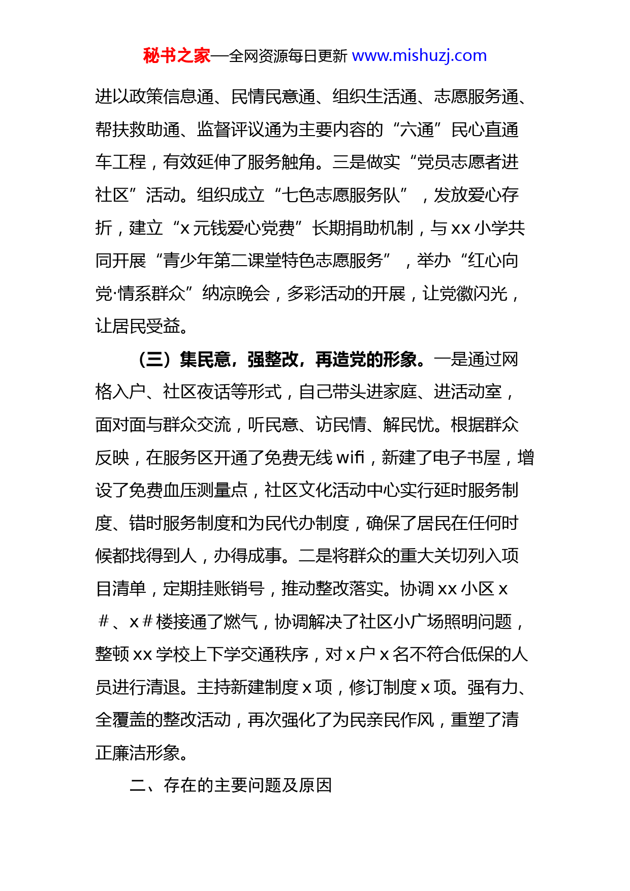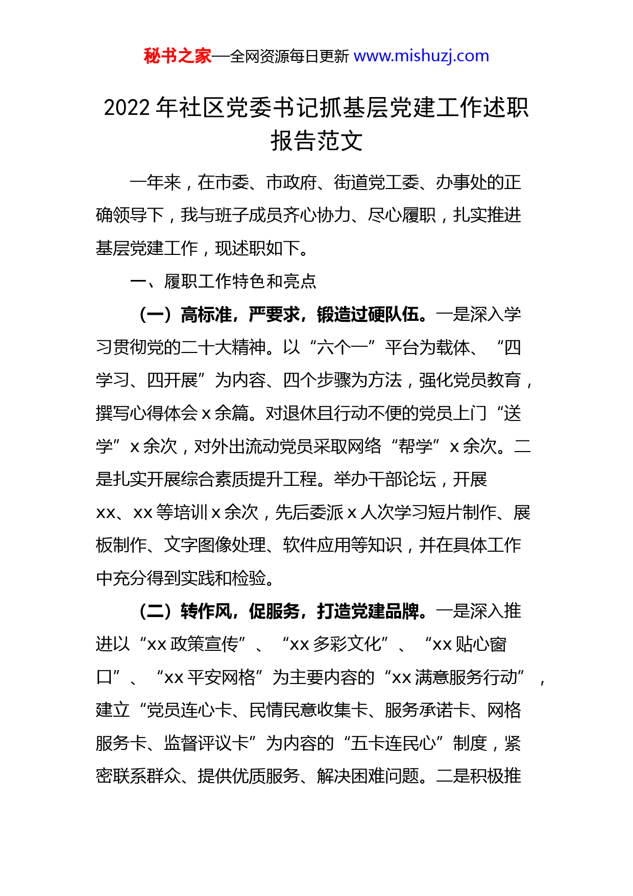秘书之家—全网资源每日更新www.mishuzj.com2022年社区党委书记抓基层党建工作述职报告范文一年来,在市委、市政府、街道党工委、办事处的正确领导下,我与班子成员齐心协力、尽心履职,扎实推进基层党建工作,现述职如下。一、履职工作特色和亮点(一)高标准,严要求,锻造过硬队伍。一是深入学习贯彻党的二十大精神。以“六个一”平台为载体、“四学习、四开展”为内容、四个步骤为方法,强化党员教育,撰写心得体会x余篇。对退休且行动不便的党员上门“送学”x余次,对外出流动党员采取网络“帮学”x余次。二是扎实开展综合素质提升工程。举办干部论坛,开展xx、xx等培训x余次,先后委派x人次学习短片制作、展板制作、文字图像处理、软件应用等知识,并在具体工作中充分得到实践和检验。(二)转作风,促服务,打造党建品牌。一是深入推进以“xx政策宣传”、“xx多彩文化”、“xx贴心窗口”、“xx平安网格”为主要内容的“xx满意服务行动”,建立“党员连心卡、民情民意收集卡、服务承诺卡、网格服务卡、监督评议卡”为内容的“五卡连民心”制度,紧密联系群众、提供优质服务、解决困难问题。二是积极推秘书之家—全网资源每日更新www.mishuzj.com进以政策信息通、民情民意通、组织生活通、志愿服务通、帮扶救助通、监督评议通为主要内容的“六通”民心直通车工程,有效延伸了服务触角。三是做实“党员志愿者进社区”活动。组织成立“七色志愿服务队”,发放爱心存折,建立“x元钱爱心党费”长期捐助机制,与xx小学共同开展“青少年第二课堂特色志愿服务”,举办“红心向党·情系群众”纳凉晚会,多彩活动的开展,让党徽闪光,让居民受益。(三)集民意,强整改,再造党的形象。一是通过网格入户、社区夜话等形式,自己带头进家庭、进活动室,面对面与群众交流,听民意、访民情、解民忧。根据群众反映,在服务区开通了免费无线wifi,新建了电子书屋,增设了免费血压测量点,社区文化活动中心实行延时服务制度、错时服务制度和为民代办制度,确保了居民在任何时候都找得到人,办得成事。二是将群众的重大关切列入项目清单,定期挂账销号,推动整改落实。协调xx小区x#、x#楼接通了燃气,协调解决了社区小广场照明问题,整顿xx学校上下学交通秩序,对x户x名不符合低保的人员进行清退。主持新建制度x项,修订制度x项。强有力、全覆盖的整改活动,再次强化了为民亲民作风,重塑了清正廉洁形象。二、存在的主要问题及原因秘书之家—全网资源每日更新www.mishuzj.com(一)对网格支部建设指导不够。虽然为x个网格党支部都选配了书记、组织委员、宣传委员,但居民党员因没有相应的工资待遇,一定程度上缺乏开展工作的积极性和主动性。我在给他们争取待遇方面主动作为不够,具体如何开展工作指导欠缺。(二)集中教育形式还显单一。教育形式还仅限于“读读文件、看看影片”,“三会一课”制度执行仍有差距,“走出去”接受“实景教育”还偏少。对那些不自觉履行党员义务、不自觉参加党内生活、不主动交纳党费的居民党员缺乏严格有效的组织处理措施。(三)党员干部管理尚有欠缺。对党员会上要求多,跟踪督导少,谈心谈话不深入,有时忽略了党员自我成长内心期待。个别干部庸懒散拖现象仍然存在,需要下大力度坚决整改。认真反思,问题产生的原因主要有以下几个方面:一是对“第一责任人”的认识不足。主要是履行“第一责任人”职责有不求过得硬,只求过得去的思想,归根结底还是宗旨意识有所淡化,没有更多的以xx等先进人物为镜,容易自我满足,没有准确看到差距,找准不足。二是工作作风不扎实。对照“xx”的要求,主要表现在谋事不实,脚踏实地、真抓实干的精神发扬不充分。创业秘书之家—全网资源每日更新www.mishuzj.com不实,“直面矛盾”的勇气较为缺乏,“吃别人嚼过的馍没味道”的创新精神有所欠缺。三是能力水平有待提升。对社区党建下一步的创新发展思考不够,不能很好地把党建与社区各项事业发展、居民群众生活紧密联系起来。究其根本,还是主观努力不足,缺少应有的招数,缺乏敢于担当的勇气,领导艺术和领导水平方面需要进一步提升。三、下一步工作思路及主要措施(一)创新形式,以“大党委”推动“联建共建”。坚持抓组织建设,按照便于党员参加活动、党组织发挥作用的要求,与辖区单位(组织)进行“联建共建”,通过“大党委”的引领和整合,使辖区单位(组织)和群众团结凝聚在党组织周围,活跃基层,打牢基础。(二)多措并举,以“大提升”保证“党员素养”。以学习贯彻党的二十大精神为主线,采取多种有效形式对党员进行经常性教育培训,增强党员干部综合素质。新建社区“党员远程教育广场”,强化“廉政讲堂”活动,继续“走出去”接受“实景教育”。重视党员先进典型培养与宣传,提高党员队伍形象。认真做好发展党员工作,提高发展党员质量,建立不合格党员退出机制,增强党员队伍“正能量”。秘书之家—全网资源每日更新www.mishuzj.com(三)监督问效,以“抓作风”落实“两个责任”。切实担起“第一责任人”责任,切实改进工作作风。积极主动作为,着力把居民关心的社区治安、纠纷调解、养老助残、社区服务、低保受理、物业监督等方面的问题做实,带头倾听群众呼声,拓展为民服务渠道,