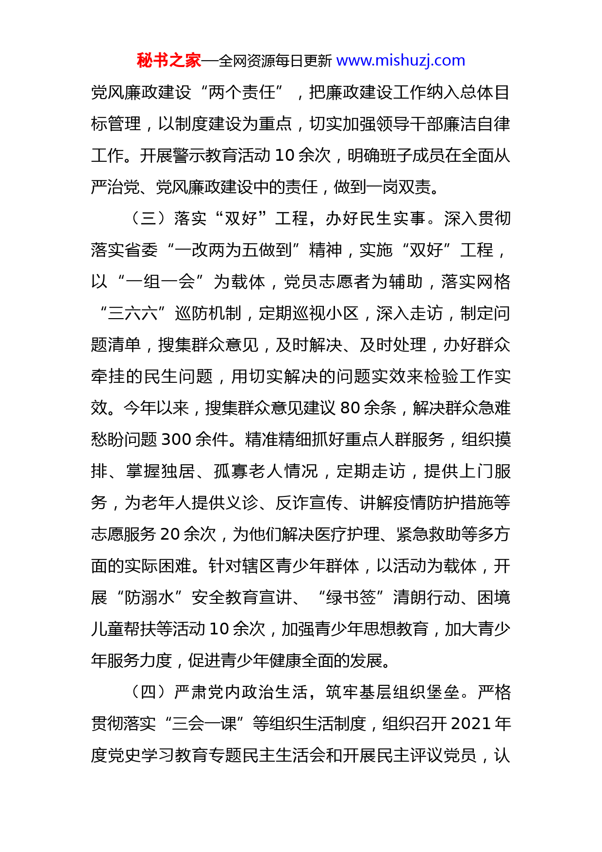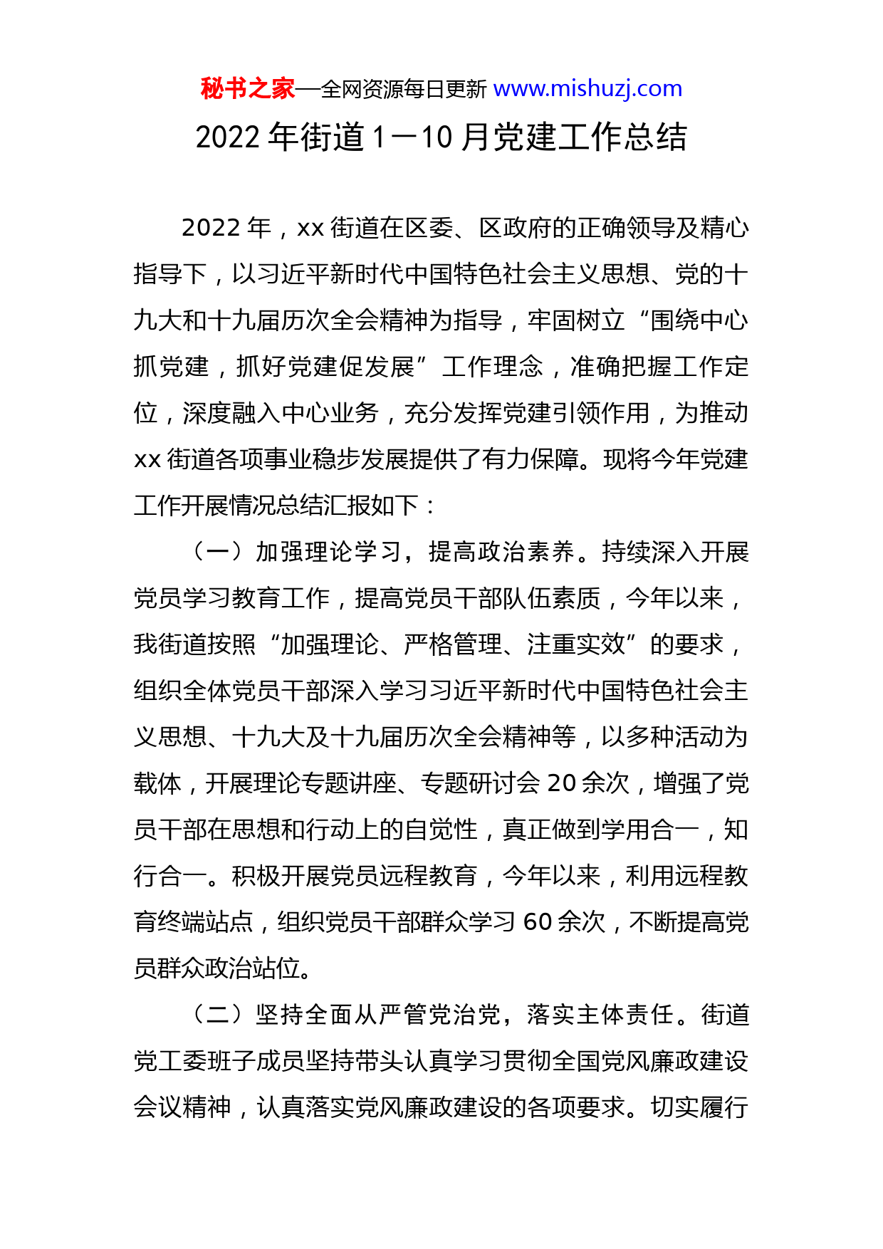 秘书之家—全网资源每日更新www.mishuzj.com2022年街道1-10月党建工作总结2022年,xx街道在区委、区政府的正确领导及精心指导下,以习近平新时代中国特色社会主义思想、党的十九大和十九届历次全会精神为指导,牢固树立“围绕中心抓党建,抓好党建促发展”工作理念,准确把握工作定位,深度融入中心业务,充分发挥党建引领作用,为推动xx街道各项事业稳步发展提供了有力保障。现将今年党建工作开展情况总结汇报如下:(一)加强理论学习,提高政治素养。持续深入开展党员学习教育工作,提高党员干部队伍素质,今年以来,我街道按照“加强理论、严格管理、注重实效”的要求,组织全体党员干部深入学习习近平新时代中国特色社会主义思想、十九大及十九届历次全会精神等,以多种活动为载体,开展理论专题讲座、专题研讨会20余次,增强了党员干部在思想和行动上的自觉性,真正做到学用合一,知行合一。积极开展党员远程教育,今年以来,利用远程教育终端站点,组织党员干部群众学习60余次,不断提高党员群众政治站位。(二)坚持全面从严管党治党,落实主体责任。街道党工委班子成员坚持带头认真学习贯彻全国党风廉政建设会议精神,认真落实党风廉政建设的各项要求。切实履行秘书之家—全网资源每日更新www.mishuzj.com党风廉政建设“两个责任”,把廉政建设工作纳入总体目标管理,以制度建设为重点,切实加强领导干部廉洁自律工作。开展警示教育活动10余次,明确班子成员在全面从严治党、党风廉政建设中的责任,做到一岗双责。(三)落实“双好”工程,办好民生实事。深入贯彻落实省委“一改两为五做到”精神,实施“双好”工程,以“一组一会”为载体,党员志愿者为辅助,落实网格“三六六”巡防机制,定期巡视小区,深入走访,制定问题清单,搜集群众意见,及时解决、及时处理,办好群众牵挂的民生问题,用切实解决的问题实效来检验工作实效。今年以来,搜集群众意见建议80余条,解决群众急难愁盼问题300余件。精准精细抓好重点人群服务,组织摸排、掌握独居、孤寡老人情况,定期走访,提供上门服务,为老年人提供义诊、反诈宣传、讲解疫情防护措施等志愿服务20余次,为他们解决医疗护理、紧急救助等多方面的实际困难。针对辖区青少年群体,以活动为载体,开展“防溺水”安全教育宣讲、“绿书签”清朗行动、困境儿童帮扶等活动10余次,加强青少年思想教育,加大青少年服务力度,促进青少年健康全面的发展。(四)严肃党内政治生活,筑牢基层组织堡垒。严格贯彻落实“三会一课”等组织生活制度,组织召开2021年度党史学习教育专题民主生活会和开展民主评议党员,认秘书之家—全网资源每日更新www.mishuzj.com真检视剖析,深刻分析原因,明确整改方向,不断增强党员干部党性修养。充分利用红色教育基地资源,组织党员干部前往津浦铁路固镇站遗址公园等红色教育主阵地,通过重温入党誓词、听红色党史故事,学习革命先辈对党忠诚、英勇无畏、艰苦奋斗的革命精神,引导党员干部时刻践行初心使命,在工作和生活中发挥先锋模范作用。(五)强化组织建设,发挥党建引领作用。一是加强党员管理,制定《社区党员分类管理名册》,对党员进行针对性管理,增强党组织凝聚力。二是组织辖区党员签订党员承诺书,加强党对信访工作的全面领导。根据群众需求,开展政策宣讲、矛盾调解、治安巡逻等志愿服务活动,用实际行动迎接XX大的顺利召开。三是扎实开展“我为群众办实事”实践活动。组织开展慰问疫情防控志愿者505人、大白志愿者15人。春节走访慰问困难党员40人,“七一”慰问困难党员19人,展现了党的关怀和温暖。通过党建共建,组织在职党员开展疫情防控、文明创建、义诊、义剪、环境整治、值班值守等10余项办实事志愿活动,进一步引导了党员认真履行党员义务,发挥党员先锋模范作用。(六)保证党员发展质量,壮大党员队伍。认真落实《中国共产党发展党员工作细则》,遵守“保持标准、保证质量、改善结构、慎重发展”的方针,严把党员发展质秘书之家—全网资源每日更新www.mishuzj.com量关。今年已发展党员2名,并加强对入党积极分子的培养和教育,发展入党积极分子20名。(七)延伸服务触角,为新业态群体办实事。开辟专区,在街道及五个社区打造了“X您同行”爱心驿站,免费向所有快递员、外卖员、环卫工人等户外工作者提供休息区、饮用水、医药包等多项服务,让他们真切感受到关怀和温暖,让城市更有温度。(八)创新基层治理模式,打造社区服务品牌。根据各社区特色,在xx社区、xx中心社区以及xx社区,发挥党建引领作用,打造“五彩先锋志愿服务队”、“xx调解工作室”、“灯谜传统文化社区”等三个社区特色品牌,为居民提供志愿服务、纠纷调解、普及文化等各方面服务,不断创新基层治理模式,营造出越来越文明、便捷、舒心的生活环境,让社区特色服务成为基层治理的一张新名片。今年以来,“五彩先锋志愿服务队”已招募志愿者150余人,开展了志愿活动100余件;“xx调解工作室”调解队伍以xx为中心,共计有12人,调解了20余起居民纠纷;“灯谜传统文化社区”开展线上猜灯谜活动参与人数达到500余人次。
