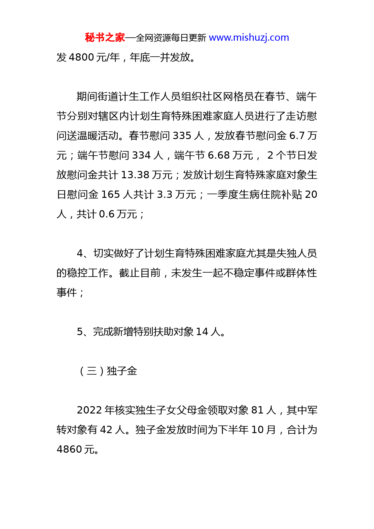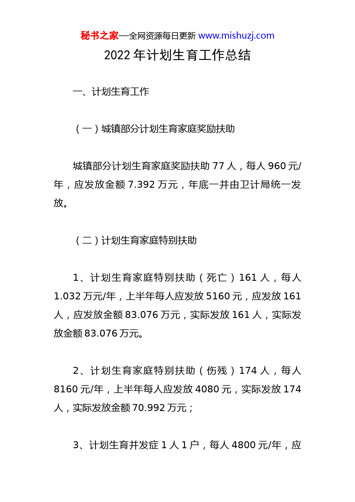 秘书之家—全网资源每日更新www.mishuzj.com2022年计划生育工作总结一、计划生育工作(一)城镇部分计划生育家庭奖励扶助城镇部分计划生育家庭奖励扶助77人,每人960元/年,应发放金额7.392万元,年底一并由卫计局统一发放。(二)计划生育家庭特别扶助1、计划生育家庭特别扶助(死亡)161人,每人1.032万元/年,上半年每人应发放5160元,应发放161人,应发放金额83.076万元,实际发放161人,实际发放金额83.076万元。2、计划生育家庭特别扶助(伤残)174人,每人8160元/年,上半年每人应发放4080元,实际发放174人,实际发放金额70.992万元;3、计划生育并发症1人1户,每人4800元/年,应秘书之家—全网资源每日更新www.mishuzj.com发4800元/年,年底一并发放。期间街道计生工作人员组织社区网格员在春节、端午节分别对辖区内计划生育特殊困难家庭人员进行了走访慰问送温暖活动。春节慰问335人,发放春节慰问金6.7万元;端午节慰问334人,端午节6.68万元,2个节日发放慰问金共计13.38万元;发放计划生育特殊家庭对象生日慰问金165人共计3.3万元;一季度生病住院补贴20人,共计0.6万元;4、切实做好了计划生育特殊困难家庭尤其是失独人员的稳控工作。截止目前,未发生一起不稳定事件或群体性事件;5、完成新增特别扶助对象14人。(三)独子金2022年核实独生子女父母金领取对象81人,其中军转对象有42人。独子金发放时间为下半年10月,合计为4860元。秘书之家—全网资源每日更新www.mishuzj.com(四)业务目标1、截止2022年11月,出生婴儿106人,符合政策生育率达100%。2、截至目前,办理生育服务证47本,补办独子子女光荣证62本。落实“全面两孩政策”,做好了政策宣传公开,张榜公示,严肃查处违法生育行为,严格控制政策外多孩生育,依法搞好社会抚养费征收管理。3、完成计划生育特殊家庭扶助关怀系统对象基本信息录入,并有效开展了扶助关怀工作。建立了特殊家庭一对一、多对一联系人制度,每户特殊家庭走访慰问不少于5次/年;4、2021年享受独生子女父母奖励金81人,独生子女父母奖励金由卫计局统一发放独子金0.486万元。(五)流动人口管理服务统计和信息化建设、行政执法及其他工作1、四川省健康档案云平台数据处理新生儿信息156秘书之家—全网资源每日更新www.mishuzj.com条,人员死亡信息处理252条;2、计生政务服务公开,规范性文件备案审查率达100%,无行政侵权案件;3、免费避孕药具发放网点公示10个点位;4、回复网络理政信访件4件,来访人员来电人员二十余件。(六)0-3岁托育机构工作辖区目前有6家托育机构,上半年完成登记备案有3家,其中伯克利创科托育中心正创建区示范性机构。已登记未备案的3家。督查消防安全防疫工作每月至少一次。(七)协会工作为特扶对象生病住院护理保险报账20人次,合计6000元,四季度正在收集中。开展春节、端午节、5.29计生协会活动日等宣传主题秘书之家—全网资源每日更新www.mishuzj.com活动25余次,发放避孕药具18000余支,宣传资料5000余份。