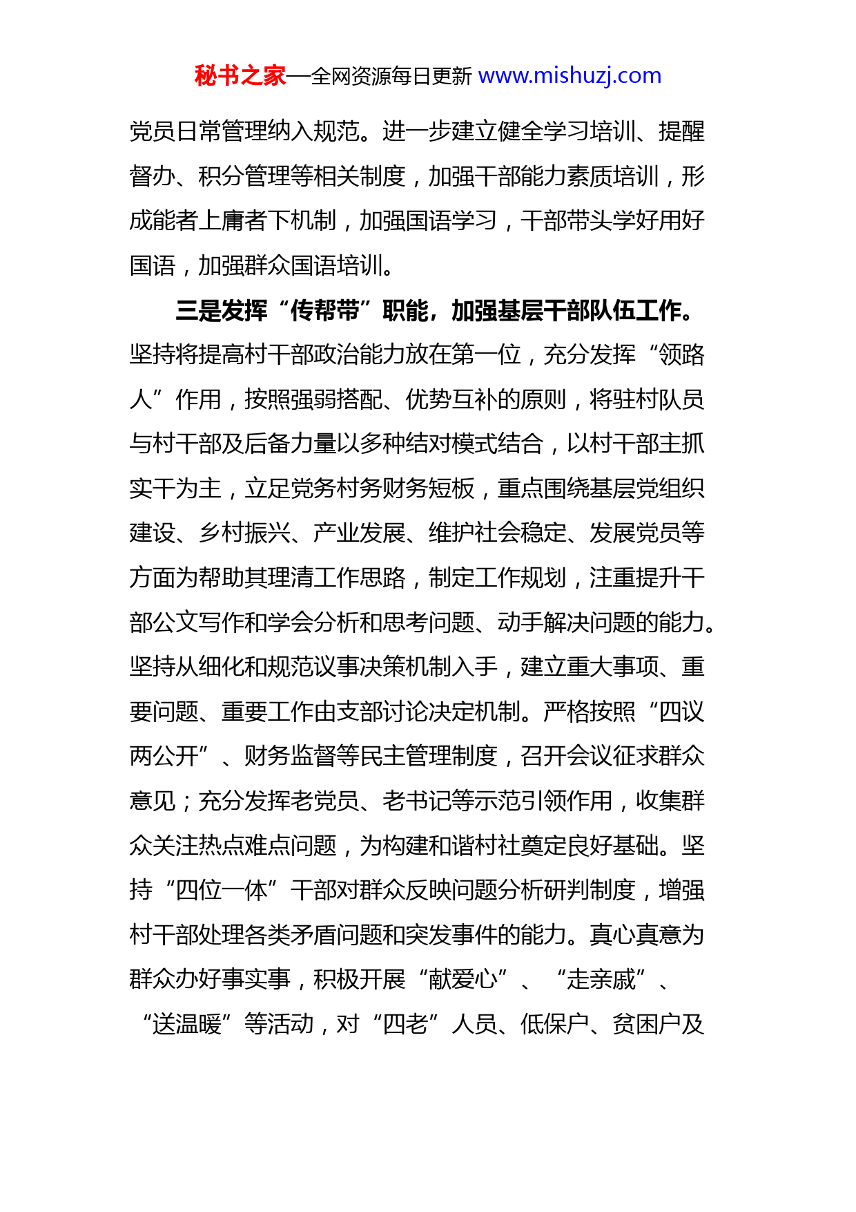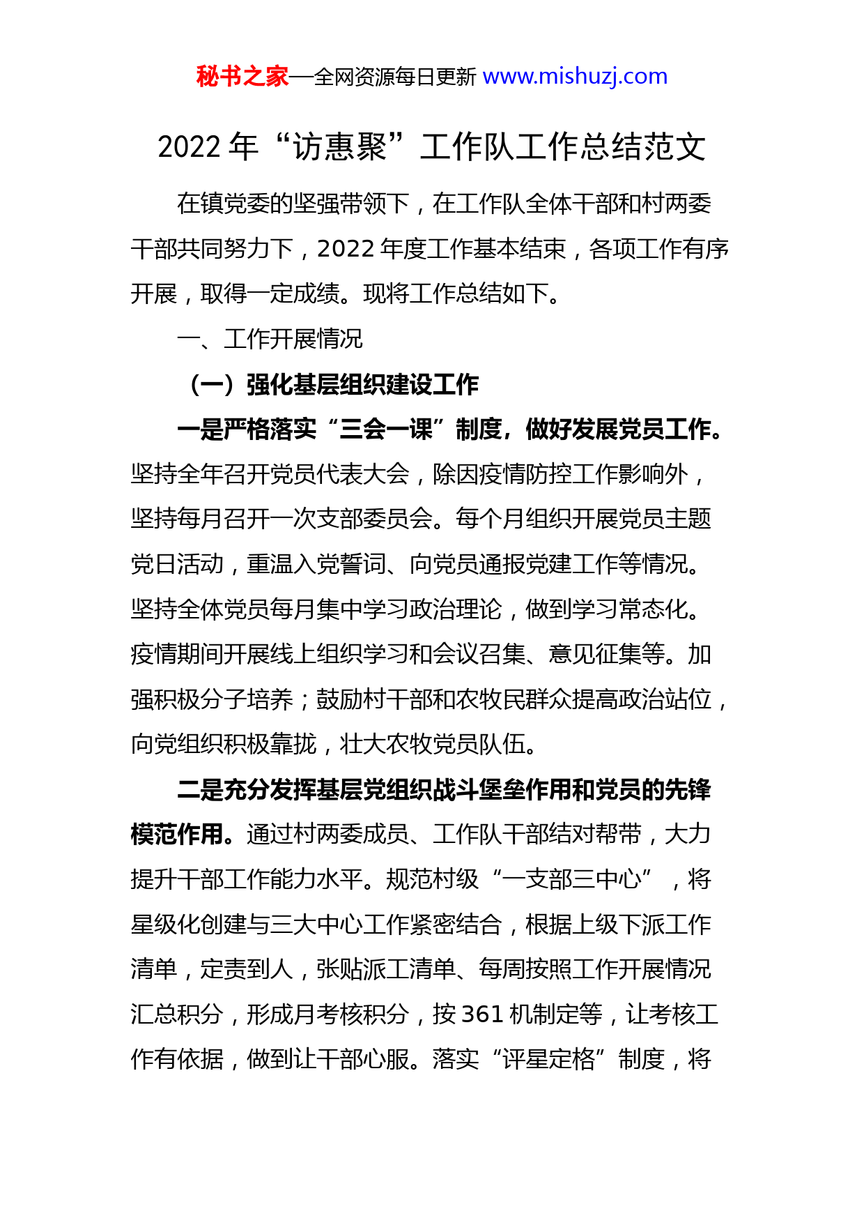 秘书之家—全网资源每日更新www.mishuzj.com2022年“访惠聚”工作队工作总结范文在镇党委的坚强带领下,在工作队全体干部和村两委干部共同努力下,2022年度工作基本结束,各项工作有序开展,取得一定成绩。现将工作总结如下。一、工作开展情况(一)强化基层组织建设工作一是严格落实“三会一课”制度,做好发展党员工作。坚持全年召开党员代表大会,除因疫情防控工作影响外,坚持每月召开一次支部委员会。每个月组织开展党员主题党日活动,重温入党誓词、向党员通报党建工作等情况。坚持全体党员每月集中学习政治理论,做到学习常态化。疫情期间开展线上组织学习和会议召集、意见征集等。加强积极分子培养;鼓励村干部和农牧民群众提高政治站位,向党组织积极靠拢,壮大农牧党员队伍。二是充分发挥基层党组织战斗堡垒作用和党员的先锋模范作用。通过村两委成员、工作队干部结对帮带,大力提升干部工作能力水平。规范村级“一支部三中心”,将星级化创建与三大中心工作紧密结合,根据上级下派工作清单,定责到人,张贴派工清单、每周按照工作开展情况汇总积分,形成月考核积分,按361机制定等,让考核工作有依据,做到让干部心服。落实“评星定格”制度,将秘书之家—全网资源每日更新www.mishuzj.com党员日常管理纳入规范。进一步建立健全学习培训、提醒督办、积分管理等相关制度,加强干部能力素质培训,形成能者上庸者下机制,加强国语学习,干部带头学好用好国语,加强群众国语培训。三是发挥“传帮带”职能,加强基层干部队伍工作。坚持将提高村干部政治能力放在第一位,充分发挥“领路人”作用,按照强弱搭配、优势互补的原则,将驻村队员与村干部及后备力量以多种结对模式结合,以村干部主抓实干为主,立足党务村务财务短板,重点围绕基层党组织建设、乡村振兴、产业发展、维护社会稳定、发展党员等方面为帮助其理清工作思路,制定工作规划,注重提升干部公文写作和学会分析和思考问题、动手解决问题的能力。坚持从细化和规范议事决策机制入手,建立重大事项、重要问题、重要工作由支部讨论决定机制。严格按照“四议两公开”、财务监督等民主管理制度,召开会议征求群众意见;充分发挥老党员、老书记等示范引领作用,收集群众关注热点难点问题,为构建和谐村社奠定良好基础。坚持“四位一体”干部对群众反映问题分析研判制度,增强村干部处理各类矛盾问题和突发事件的能力。真心真意为群众办好事实事,积极开展“献爱心”、“走亲戚”、“送温暖”等活动,对“四老”人员、低保户、贫困户及秘书之家—全网资源每日更新www.mishuzj.com其他困难群体进行慰,送去了大米、清油、面粉等慰问品和慰问金。(二)坚定不移推进强村富民工作一是积极动员群众外出务工就业创业。二是大力开展技能培训,以增加就业能力和提升收入水平。三是持续加大教育和健康扶持力度。四是积极推行新型农村合作医疗、大病保险、养老保险等,目前各项工作有序推进。。五是全村农业户籍人口住房安全与饮水安全均有保障。六是加大农村改厕力度。七是大力壮大集体经济。进行土地流转,增加集体和个人收入。进行三资清理,增强集体资产。积极扶持合作社发展。通过门面出租等方式,实现集体收入增收。(三)坚定不移提升治理水平方面一是做好社会面防控,严格落实值班备勤制度和人防物防技防措施。二是落实“369限时工作法”,创新流动人口服务管理。三是做好重点人员、关注群体的管控,四是依法调处,做好矛盾化解工作。五是强化党组织对基层治理的领导,发动无职党员积极参与村级治理,落实无职党员评星定等工作。六是加强法制宣传和村规民约宣讲,积极宣传身边好人好事,弘扬正气(四)坚定不移为民办事服务方面秘书之家—全网资源每日更新www.mishuzj.com一是打好疫情防控“阻击站”,确保群众生命安全。二是践行新时代枫桥经验,强化走访摸排,发现矛盾纠纷苗头,及时调节处置,防止激化。三是做好困难群众帮扶解困工作,及时将党和政府的温暖送到群众身边。四是送法律送理念,提升群众认识和观念,为群众创收奠定基础。五是抓好安全生产工作。(五)疫情防控工作8月初,根据疫情防控需要和上级安排,成立疫情防控工作领导小组,对我村疫情情况加强监测,对防范和应对工作加强督导,确保责任落实到位,监测预警及时,防范措施得力,应对控制有效。截至目前,累计召开专题工作会30余次,专题安排部署此次防疫工作,进一步统一思想,提高认识。全面摸排登记。组织网格员、访惠聚工作队队员、对辖区进行全面逐户摸排返乡人员,并建立健全台账。强力宣传引导,面对疫情的突发态势,各网格通过微信群教育引导我辖区居民,引导居民无特殊需求不得外出。加强消杀防疫。每天由村委会统一组织消杀员对封闭管理区域、公共管理区域开展一次消杀工作,并统筹设立专门的医疗垃圾收集桶。依托社区网格化管理工作为平台,通过电话、微信、上门等多种方式,摸排群众困难诉求,做到主动发现、快速响应、精准救助。一是快速建立了特殊人群台账,按照网格分别与他们快速联系,解决他们的困难。秘书之家—全网资源每日更新www.mishuzj.com充分发挥志愿者的作用,在卡点值守、物资购买等方面确保困难诉求及时得到解决疫