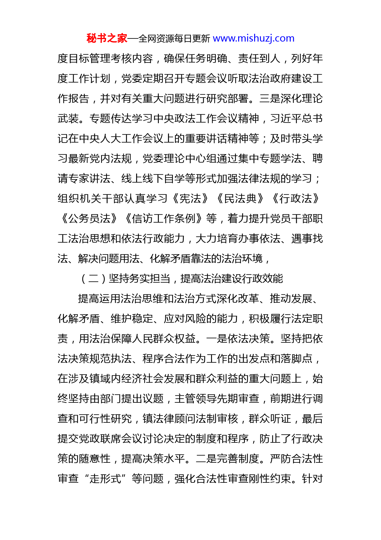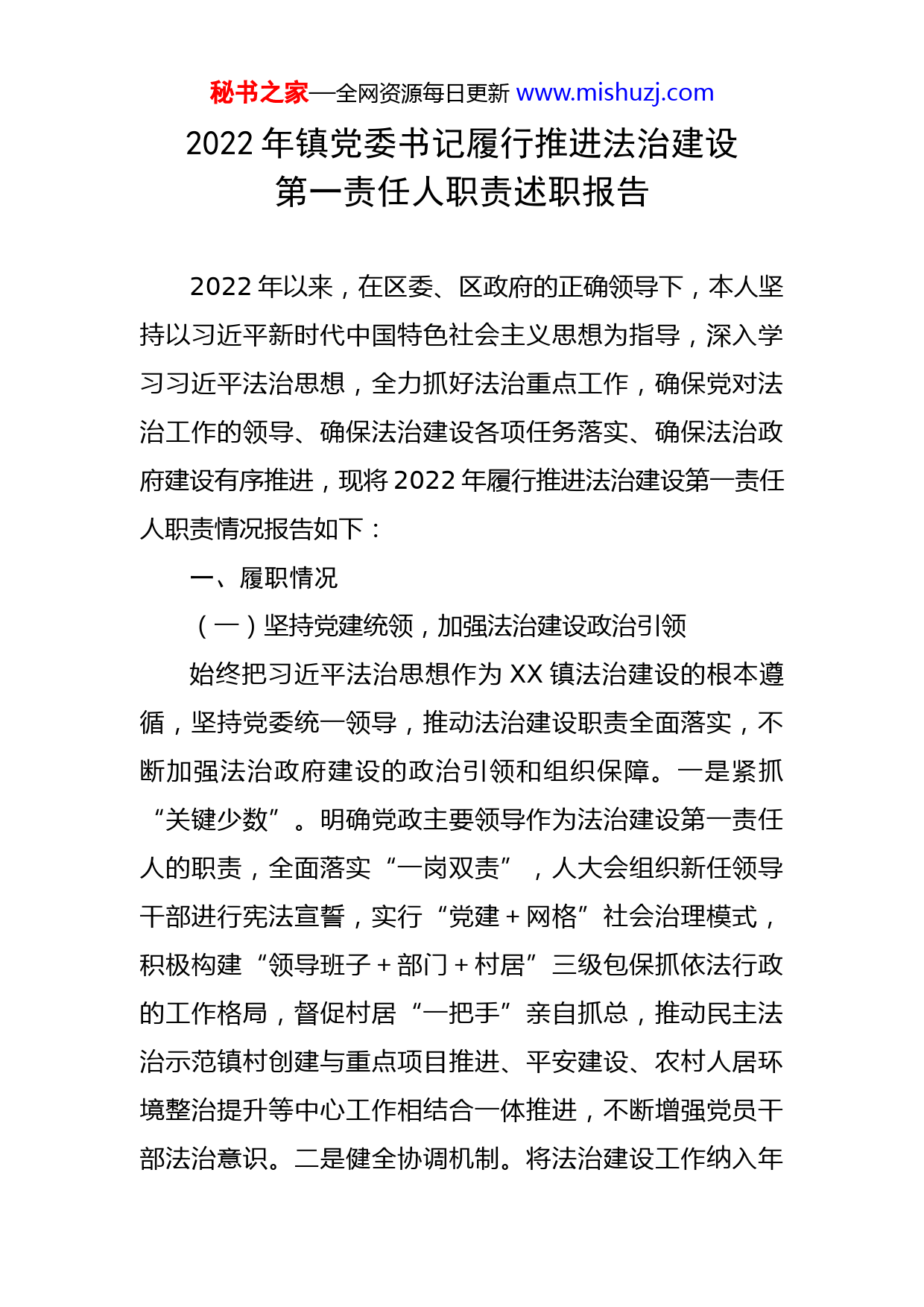 秘书之家—全网资源每日更新www.mishuzj.com2022年镇党委书记履行推进法治建设第一责任人职责述职报告2022年以来,在区委、区政府的正确领导下,本人坚持以习近平新时代中国特色社会主义思想为指导,深入学习习近平法治思想,全力抓好法治重点工作,确保党对法治工作的领导、确保法治建设各项任务落实、确保法治政府建设有序推进,现将2022年履行推进法治建设第一责任人职责情况报告如下:一、履职情况(一)坚持党建统领,加强法治建设政治引领始终把习近平法治思想作为XX镇法治建设的根本遵循,坚持党委统一领导,推动法治建设职责全面落实,不断加强法治政府建设的政治引领和组织保障。一是紧抓“关键少数”。明确党政主要领导作为法治建设第一责任人的职责,全面落实“一岗双责”,人大会组织新任领导干部进行宪法宣誓,实行“党建+网格”社会治理模式,积极构建“领导班子+部门+村居”三级包保抓依法行政的工作格局,督促村居“一把手”亲自抓总,推动民主法治示范镇村创建与重点项目推进、平安建设、农村人居环境整治提升等中心工作相结合一体推进,不断增强党员干部法治意识。二是健全协调机制。将法治建设工作纳入年秘书之家—全网资源每日更新www.mishuzj.com度目标管理考核内容,确保任务明确、责任到人,列好年度工作计划,党委定期召开专题会议听取法治政府建设工作报告,并对有关重大问题进行研究部署。三是深化理论武装。专题传达学习中央政法工作会议精神,习近平总书记在中央人大工作会议上的重要讲话精神等;及时带头学习最新党内法规,党委理论中心组通过集中专题学法、聘请专家讲法、线上线下自学等形式加强法律法规的学习;组织机关干部认真学习《宪法》《民法典》《行政法》《公务员法》《信访工作条例》等,着力提升党员干部职工法治思想和依法行政能力,大力培育办事依法、遇事找法、解决问题用法、化解矛盾靠法的法治环境,(二)坚持务实担当,提高法治建设行政效能提高运用法治思维和法治方式深化改革、推动发展、化解矛盾、维护稳定、应对风险的能力,积极履行法定职责,用法治保障人民群众权益。一是依法决策。坚持把依法决策规范执法、程序合法作为工作的出发点和落脚点,在涉及镇域内经济社会发展和群众利益的重大问题上,始终坚持由部门提出议题,主管领导先期审查,前期进行调查和可行性研究,镇法律顾问法制审核,群众听证,最后提交党政联席会议讨论决定的制度和程序,防止了行政决策的随意性,提高决策水平。二是完善制度。严防合法性审查“走形式”等问题,强化合法性审查刚性约束。针对秘书之家—全网资源每日更新www.mishuzj.comXX镇省、市、区重点项目多、任务重、时间紧等特点,镇本级除常年聘请XX律师事务所法律顾问以外,另聘请了重点项目专业法律顾问,通过让政府法律顾问全面介入政府决策、立法和行政执法领域,积极参与突发事件应对,能够有效解决依法行政进程中的问题,提高政府依法执政能力,同时完善重大行政决策事项管理、过程记录和材料归档制度,自觉接受司法监督、社会监督和舆论监督,将权力关进制度的笼子里、运行在阳光的轨道上。三是深化改革。深化“放管服”改革,参照经济发达镇推进行政审批办和综合执法办机构改革,建好建强“便民服务”一平台,开创“一门式”“就近办”综合受理审批服务新模式,着力解决群众“多跑路、办事难”顽疾;整合组建“综合执法一队伍”,着力解决乡镇执法“看得见的管不了、管得了的看不见”难题,结合城市管理、生态环保、国土规划、市场监督和应急管理等各领域综合行政执法改革工作,积极稳妥整合乡镇执法力量和资源,实现一支队伍执法。(三)坚持人民至上,提升法治建设服务水平坚持服务为民宗旨,最大限度地维护好、实现好、发展好人民群众的根本利益,做到为民服务不缺位,打通法治建设“最后一公里”:一是普法宣传。积极宣传法律法规,开展警示传教育,做到执法与普法并济,全年开展了秘书之家—全网资源每日更新www.mishuzj.com“国家安全教育日”“综治宣传月”“安全生产月”“征兵宣传”等宣传活动,深入村居开展普法、反电诈等宣传活动,发放《宪法》《民法典》《兵役法》等相关宣传资料XX万余份,编发短信XX万余条,利用宣传车、电子LED屏、XX微讯、新时代文明实践微夜校、农村广播等方式加强法治宣传教育,增强全社会学法尊法守法用法意识。二是硬件提升。按照标准化建设要求,设立了法律援助办公室、帮教安置社区服务办公室、矛盾纠纷调处室、公共法律服务中心等合计面积共XX余平米,健全了XX名社区矫正对象一人一档,做好日常监督工作和谈心谈话活动,保证无重新犯罪。镇本级投入了XX余万元完成了武装综治中心改造,压实网格责任,不断完善功能设置,为基层社会治理发挥积极作用。三是平安建设。努力构建源头防控、排查梳理、纠纷化解的社会矛盾综合治理机制,不断深入学习枫桥经验,以矛盾为导向,落实信访工作包案责任制;镇机关一楼设信访接待室,党政班子在工作日轮流接访,各村居定期排查梳理,全年共排查各类矛盾纠纷XX件,调处XX件,调处率达100%,化解了XX件信访积案,并签订息访息诉协议书,切实做到矛盾纠纷在一线化解;严格落实意识形态责任制,依法规范宗教场