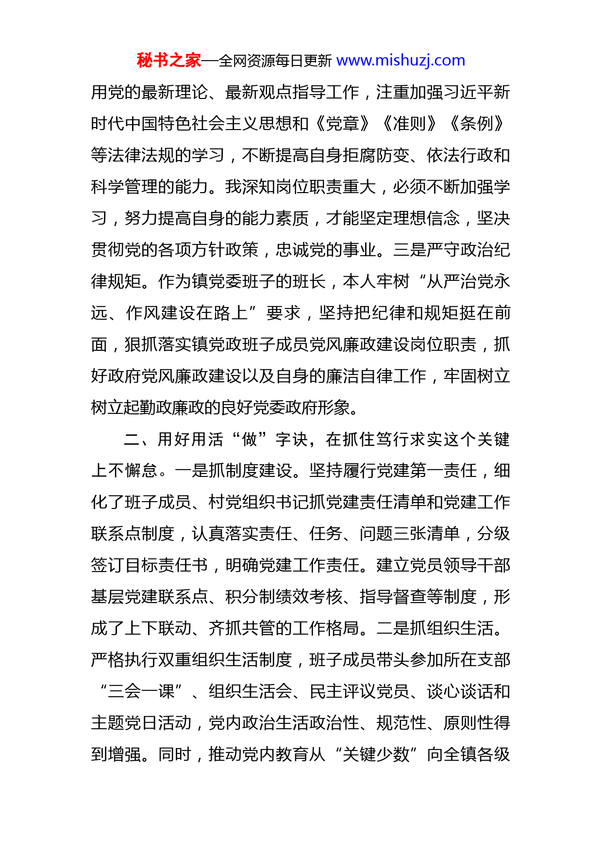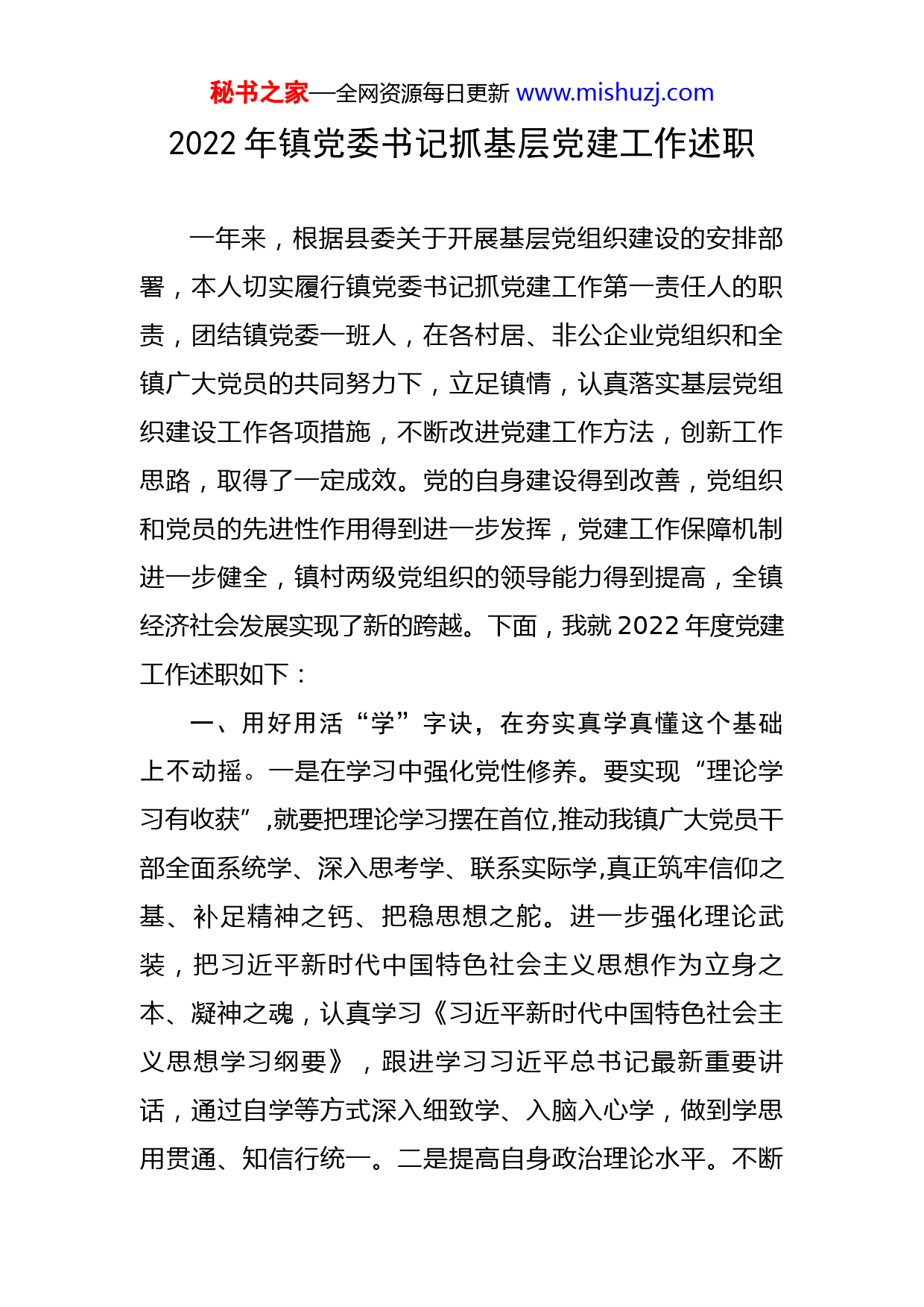 秘书之家—全网资源每日更新www.mishuzj.com2022年镇党委书记抓基层党建工作述职一年来,根据县委关于开展基层党组织建设的安排部署,本人切实履行镇党委书记抓党建工作第一责任人的职责,团结镇党委一班人,在各村居、非公企业党组织和全镇广大党员的共同努力下,立足镇情,认真落实基层党组织建设工作各项措施,不断改进党建工作方法,创新工作思路,取得了一定成效。党的自身建设得到改善,党组织和党员的先进性作用得到进一步发挥,党建工作保障机制进一步健全,镇村两级党组织的领导能力得到提高,全镇经济社会发展实现了新的跨越。下面,我就2022年度党建工作述职如下:一、用好用活“学”字诀,在夯实真学真懂这个基础上不动摇。一是在学习中强化党性修养。要实现“理论学习有收获”,就要把理论学习摆在首位,推动我镇广大党员干部全面系统学、深入思考学、联系实际学,真正筑牢信仰之基、补足精神之钙、把稳思想之舵。进一步强化理论武装,把习近平新时代中国特色社会主义思想作为立身之本、凝神之魂,认真学习《习近平新时代中国特色社会主义思想学习纲要》,跟进学习习近平总书记最新重要讲话,通过自学等方式深入细致学、入脑入心学,做到学思用贯通、知信行统一。二是提高自身政治理论水平。不断秘书之家—全网资源每日更新www.mishuzj.com用党的最新理论、最新观点指导工作,注重加强习近平新时代中国特色社会主义思想和《党章》《准则》《条例》等法律法规的学习,不断提高自身拒腐防变、依法行政和科学管理的能力。我深知岗位职责重大,必须不断加强学习,努力提高自身的能力素质,才能坚定理想信念,坚决贯彻党的各项方针政策,忠诚党的事业。三是严守政治纪律规矩。作为镇党委班子的班长,本人牢树“从严治党永远、作风建设在路上”要求,坚持把纪律和规矩挺在前面,狠抓落实镇党政班子成员党风廉政建设岗位职责,抓好政府党风廉政建设以及自身的廉洁自律工作,牢固树立树立起勤政廉政的良好党委政府形象。二、用好用活“做”字诀,在抓住笃行求实这个关键上不懈怠。一是抓制度建设。坚持履行党建第一责任,细化了班子成员、村党组织书记抓党建责任清单和党建工作联系点制度,认真落实责任、任务、问题三张清单,分级签订目标责任书,明确党建工作责任。建立党员领导干部基层党建联系点、积分制绩效考核、指导督查等制度,形成了上下联动、齐抓共管的工作格局。二是抓组织生活。严格执行双重组织生活制度,班子成员带头参加所在支部“三会一课”、组织生活会、民主评议党员、谈心谈话和主题党日活动,党内政治生活政治性、规范性、原则性得到增强。同时,推动党内教育从“关键少数”向全镇各级秘书之家—全网资源每日更新www.mishuzj.com党员拓展、从集中性教育向经常性教育延伸,把全面从严治党要求落实到每名党员,全镇广大党员干部奋发进取、干事创业的精气神得到激发,为贯彻落实五大发展理念提供坚强组织保证。三是抓工作实效。本人着眼于既定的工作目标,在抓好党建的同时,紧紧围绕中心工作,紧扣发展主题,坚持发展是第一要务这个主题,奋力推进XX镇经济社会高质量发展。引导企业加大技术改造力度,提升装备水平,通过完善招商网络、改进招商方式、加大招商力度。坚持抓环境整治,对农村环境整治进行考核,采取月查季评、以奖代补的方法,建立起镇村联动、社会参与的运行机制。三、用好用活“领”字诀,在强化以上率下牵引上不落空。一是抓牢主体责任。认真落实《党委(党组)落实全面从严治党主体责任规定》《中共中央关于加强对“一把手”和领导班子监督的意见》,严格落实“一岗双责”,把党风廉政建设与经济、民生、疫情防控等工作同研究、同部署、同推进、同落实。二是抓勤常态化提醒。开展廉政党课、座谈研讨、主题活动、警示教育等系列活动,通过反面警示和正面引导,不断加强党性锻炼,永葆清正廉洁的政治本色。三是抓严干部纪律管理。针对“压力传导不够,干部作风漂浮”的问题,修订完善了《XX镇重点工作考核管理办法》、《XX镇干部管理制度》等制秘书之家—全网资源每日更新www.mishuzj.com度,要求党政班子领导干部带头弘扬正气,自觉抵制错误政治思潮和谣言信息,结合全面从严治党要求,加大明察暗访力度,对干部日常考勤、任务落实、纪律作风实行常态化监督。四、用好用活“促”字诀,在聚焦担当作为这个标杆上不停步。一是在服务中强化宗旨意识。始终坚持以人民为中心的发展思想,始终把人民利益摆在至高无上的地位,多做对群众有利的事情,努力为群众解难题、办实事,真正做到与群众面对面、心贴心的交流沟通,及时掌握群众需求,及时回应群众关切,真正做到问计于民、问智于民、问需于民,以实际行动密切党群干群关系。始终把保障和改善民生作为执政行政的根本目标,实施好民生实事项目,使人民获得感、幸福感更加充实、更有保障、更可持续。二是在担当中增强行动自觉。习近平总书记曾以“四个不容易”告诫全党,这“不容易”的背后是对新形势新任务的深刻判断,是对管党治党的深刻理解,是对自我革命与社会革命的深刻把握。如果在一片喝彩声、赞扬声中丧失革命精神和斗志,就会“一篙松劲退千寻”;时刻保持