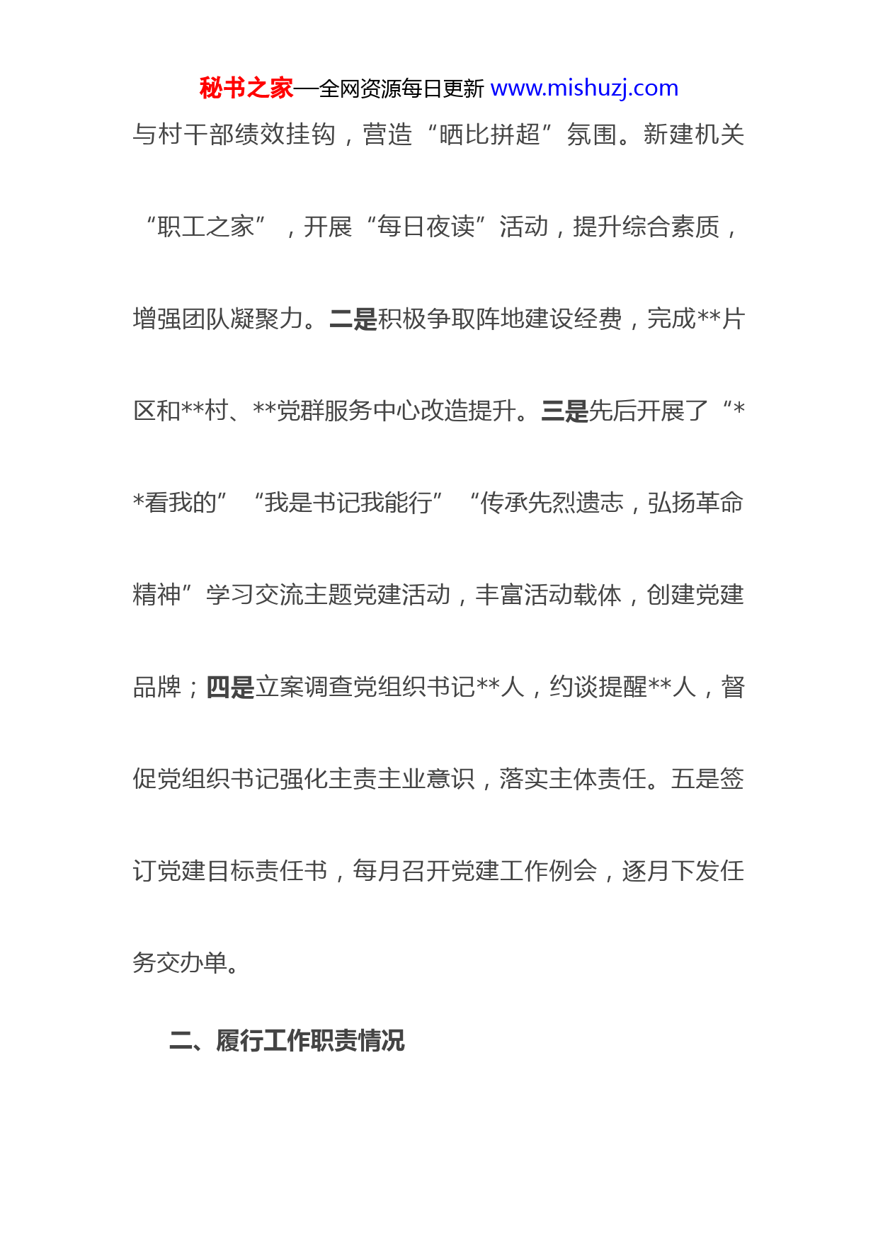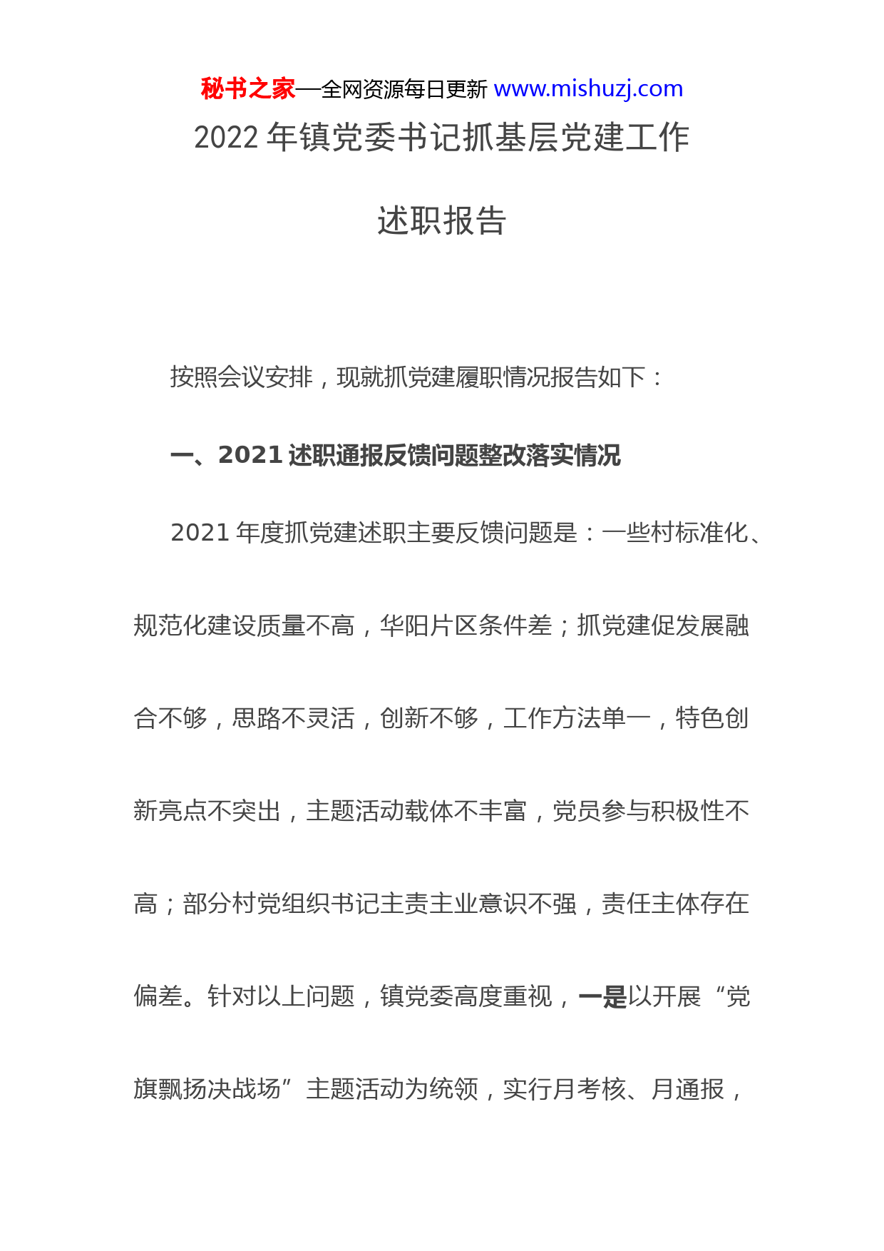 秘书之家—全网资源每日更新www.mishuzj.com2022年镇党委书记抓基层党建工作述职报告按照会议安排,现就抓党建履职情况报告如下:一、2021述职通报反馈问题整改落实情况2021年度抓党建述职主要反馈问题是:一些村标准化、规范化建设质量不高,华阳片区条件差;抓党建促发展融合不够,思路不灵活,创新不够,工作方法单一,特色创新亮点不突出,主题活动载体不丰富,党员参与积极性不高;部分村党组织书记主责主业意识不强,责任主体存在偏差。针对以上问题,镇党委高度重视,一是以开展“党旗飘扬决战场”主题活动为统领,实行月考核、月通报,秘书之家—全网资源每日更新www.mishuzj.com与村干部绩效挂钩,营造“晒比拼超”氛围。新建机关“职工之家”,开展“每日夜读”活动,提升综合素质,增强团队凝聚力。二是积极争取阵地建设经费,完成片区和村、党群服务中心改造提升。三是先后开展了“看我的”“我是书记我能行”“传承先烈遗志,弘扬革命精神”学习交流主题党建活动,丰富活动载体,创建党建品牌;四是立案调查党组织书记人,约谈提醒人,督促党组织书记强化主责主业意识,落实主体责任。五是签订党建目标责任书,每月召开党建工作例会,逐月下发任务交办单。二、履行工作职责情况秘书之家—全网资源每日更新www.mishuzj.com2022年,镇党委以“党旗飘扬战场”主题活、统领,认真履行党委主体责任和党委书记第一责任人职责,全镇各项工作扎实有序推进。(一)强化责任担当。一是积极履行党委书记第一责任人职责,压实班子成员“一岗双责”。全年组织召开党委会次,其中涉及党建议题个。二是坚持“书记抓、抓书记”。全面落实党委书记党支部联系点制度,在联系点村一支部讲党课次。围绕“政务处分法”讲党课次,组织召开村党组织书记述职大会次,进一步夯实主体责任。三是坚持严考实督。在全镇开展“党旗飘扬决战场”主题活动,对党组织书记、第一书记、驻村工作队进行秘书之家—全网资源每日更新www.mishuzj.com“月考核、月通报”,与村级干部绩效工资挂钩,罚后三名,奖前三名,激励“支部冲在前,党员干在先”,有力地推动了党建、乡村振兴、防汛抢险、改厕等重点工作。(二)强化思想铸魂。一是坚持带头学理论、学政策。以习近平新时代中国特色社会主义思想和习近平总书记来陕考察重要讲话和重要指示精神为重点,全年共召开理论中心组学习次,认真组织党的二十大精神学习宣讲。通过“”微信公众号,宣讲党的方针、政策,巩固题教育成果。二是加强党员学习教育。为机关图书室充实图书余册,积极开展“每日夜读”活动,号召全体党员干部,利用业余时间学习提升,振奋精神,改正作风。三是与师秘书之家—全网资源每日更新www.mishuzj.com院宣传部开展“送理论到基层”党建手拉手活动,不断提升基层干部理论水平。(三)强化组织建设。一是强化基层党建工作保障。建成使用平方的镇级党群服务中心,高标准打造村、桥村、村等省、市标准示范点,提升镇域服务党员群众水平。二是强化干部队伍建设。全年发展入党积极分子名,接收预备党员名,转正名。建立后备干部台账,推行“两委”成员联系培养和“传帮带”机制。三是做好社区党建工作。新建社区党委、社区党支部以及小区、五栋楼两个小区党支部,高标准打造社区组织阵地;坚持共驻共建联席会制度,镇机关和辖区站所党员到社区报秘书之家—全网资源每日更新www.mishuzj.com到,开展活动次。四是扎实开展村、村软弱唤散基层党组织整顿。通过政策理论宣讲、基础设施改造、调整充实干部、加强村干部业务培训、开展针对性谈心谈话等方式,使软弱换散基层党组织战斗力整体提升,得到了巡视组、市委组织部和市委组织部的充分肯定。(四)强化党建引领。一是党建引领助力乡村振兴。完成实施基础设施项目个,产业项目个,户人全面实现脱贫。建立镇消费扶贫专馆,通过立体化线上线下平台,确保扶贫产品销路畅通。二是党建引领抓好疫情防控。建立党员志愿战斗队支,动员余名党员干部参与全镇疫情防控工作,名党员自愿捐款元。疫情期间,秘书之家—全网资源每日更新www.mishuzj.com将辖区菜农果农产品集中收购,统一配送各村、社区的做法,解决了“买难卖难”问题,化解封村管控矛盾。“镇菜园子搬进菜篮子”在卫视等媒体播报推广。三是党建引领防汛减灾工作。动员全镇党员干部连续奋战余天防汛抗灾,转移安置群众户人,确保辖区支流安澜,及沿山村社无人员伤亡。四是党建引领美丽乡村建设。开展“我是书记我能行”公开承诺,夯实环境卫生主体责任。累计出动大型机械台次,农用车辆余辆,投入人力人次,对我镇环境卫生进行集中整治。完成综合市场户违建拆除和道路拓宽,夜市得到全面提升工程,秘书之家—全网资源每日更新www.mishuzj.com解决了多年顽疾。完成改厕总户数户,完成率超过%,顺利通过省、市验收。(五)强化执纪问责。强化党委主体责任,全年围绕疫情防控、乡村振兴、防汛抢险、人居环境等中心工作开展监督检查余次,严肃查处态度不认真、工作不扎实、责任不落实等不作为、慢作为问题。截至目前,共初核各类案件线索件,立案件,结案件,给予党纪政务处分人,诚勉谈话人,约谈提醒人。三、存在问题及原因分析(一)存在问题1.责任传导不到位。有的