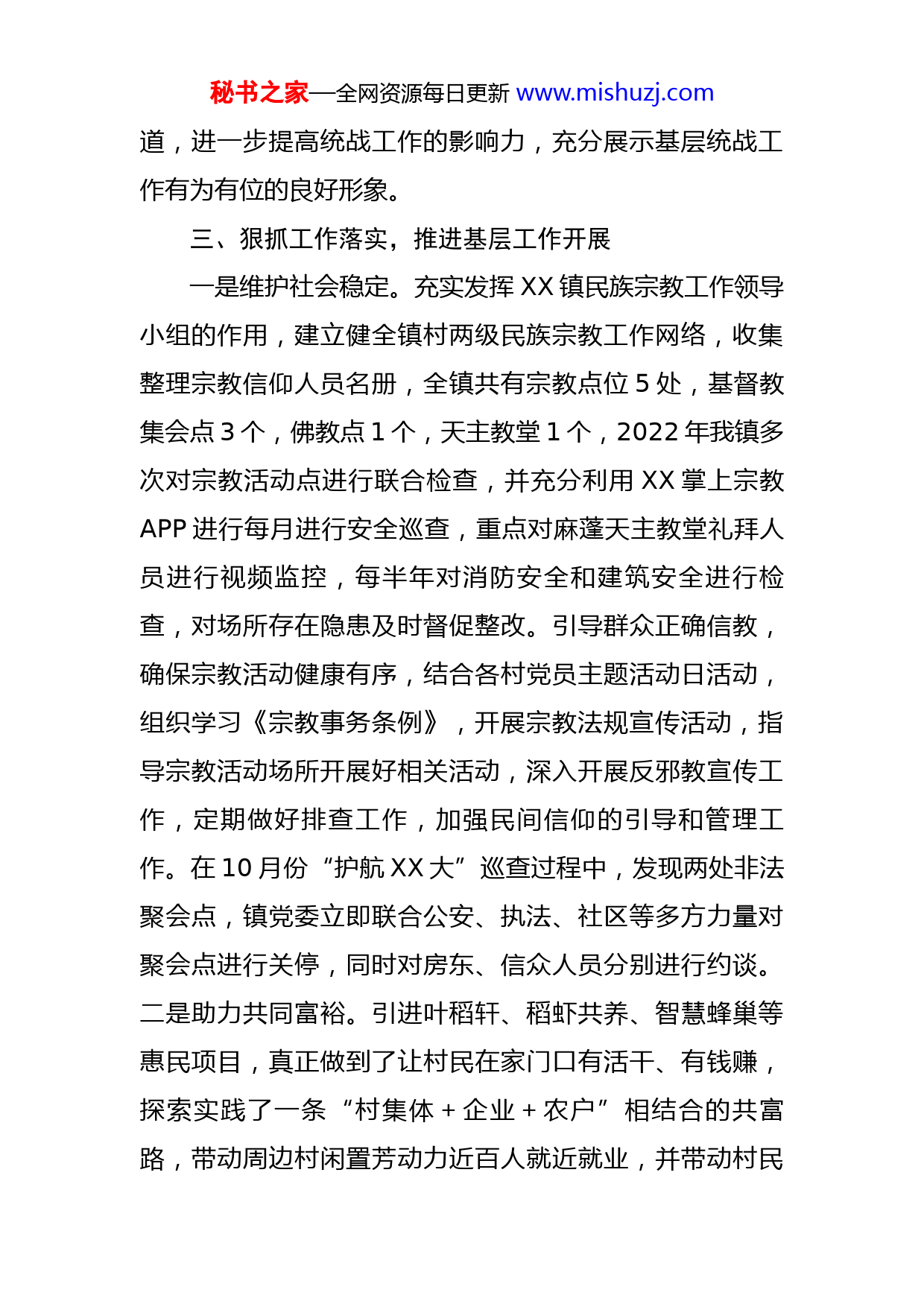秘书之家—全网资源每日更新www.mishuzj.com2022年镇统战工作总结及2023年工作思路一、提高思想认识,加强政策宣传2022年,我镇统战工作得到了党委的高度重视,将统战工作纳入到党委年度工作计划,利用班子会、理论中心组学习会等契机,组织班子学习《中国共产党统一战线工作条例》《习近平出席中央统战工作会议并发表重要讲话》等。全年党委会集体听取统战工作汇报和研究统战2次,将统战政策理论列入班子成员学习计划,认真组织学习相关政策法规,2022年,镇党委会召开会议研究统战工作4次,主要领导坚持每个季度听取统战工作汇报1次。二、加强组织领导,提升队伍能力建设党委书记任统战领导组组长,由党委副书记分管统战,及时调整充实统战干事,各村(社区)基层支部设立统战联络员,同时加强对村干部的培训,培养了一支具有统战观念、真懂统战政策、会做统战工作的干部队伍,真正成为统战宗教工作的“行家里手”。落实好归侨、侨眷相关政策,强化对宗教场所的监管,完成对宗教活动场所摸底工作,做好突发事件应急预案,服务和谐稳定大局。另外,指定一名宣传干事负责统战宣传工作,积极做好统战工作调研、信息上报以及宣传工作,利用媒体网站、简报信息等手段加强统战理论知识、基层工作动态的宣传报秘书之家—全网资源每日更新www.mishuzj.com道,进一步提高统战工作的影响力,充分展示基层统战工作有为有位的良好形象。三、狠抓工作落实,推进基层工作开展一是维护社会稳定。充实发挥XX镇民族宗教工作领导小组的作用,建立健全镇村两级民族宗教工作网络,收集整理宗教信仰人员名册,全镇共有宗教点位5处,基督教集会点3个,佛教点1个,天主教堂1个,2022年我镇多次对宗教活动点进行联合检查,并充分利用XX掌上宗教APP进行每月进行安全巡查,重点对麻蓬天主教堂礼拜人员进行视频监控,每半年对消防安全和建筑安全进行检查,对场所存在隐患及时督促整改。引导群众正确信教,确保宗教活动健康有序,结合各村党员主题活动日活动,组织学习《宗教事务条例》,开展宗教法规宣传活动,指导宗教活动场所开展好相关活动,深入开展反邪教宣传工作,定期做好排查工作,加强民间信仰的引导和管理工作。在10月份“护航XX大”巡查过程中,发现两处非法聚会点,镇党委立即联合公安、执法、社区等多方力量对聚会点进行关停,同时对房东、信众人员分别进行约谈。二是助力共同富裕。引进叶稻轩、稻虾共养、智慧蜂巢等惠民项目,真正做到了让村民在家门口有活干、有钱赚,探索实践了一条“村集体+企业+农户”相结合的共富路,带动周边村闲置芳动力近百人就近就业,并带动村民秘书之家—全网资源每日更新www.mishuzj.com在家附近做起小生意增收。村集体通过出租闲置房屋和流转土地,每年可以获得八十多万元的收入。结对帮扶XX、XX、XX、XX村低收入农户共计8户,为他们提供就业机会,同时拿出部分土地打造共富龙虾池,按批次让村内低收入农户认领,通过公司养殖、农户分红的模式培育“共富”龙虾,让低收入农户充分享受红利,带动村民共富。三是抓好乡贤工作,2022年以来,XX镇始终坚持“大团结大联合”的宗旨,以“望得见山,看得见水,记得住乡愁”为桥梁纽带,广泛联络XX乡贤,为其搭建交流平台,扩大交流、互促发展,合力推进村庄建设。XX乡贤已逐渐成为XX组织体系建设、重点工作推进、招商引资、经济社会发展、山水XX建设的重要组成部分和骨干力量。四、2023年统战工作思路2023年,我镇将正视以往工作中存在的问题与不足,继续加大力度,全面推进我镇统战工作。一是加强统战理论的学习与宣传,充分发挥统战领导组的作用,全面做好统战工作,更好推进我镇经济社会建设;二是加强对民族宗教人士、港澳台及海外人士的摸底与引导服务工作,继续支持配合各民主党派开展的社会服务以及调查研究活动,鼓励开展公益事业活动。三是继续完善村级统战组织,发挥村级联络员的作用,健全与完善村级统战对象基础台账,及时梳理基层统战对象的利益诉求,掌握其基本秘书之家—全网资源每日更新www.mishuzj.com情况。四是加强对宗教集会点的日常监管与引导,进一步开展好管理,为维护社会稳定打好基础。