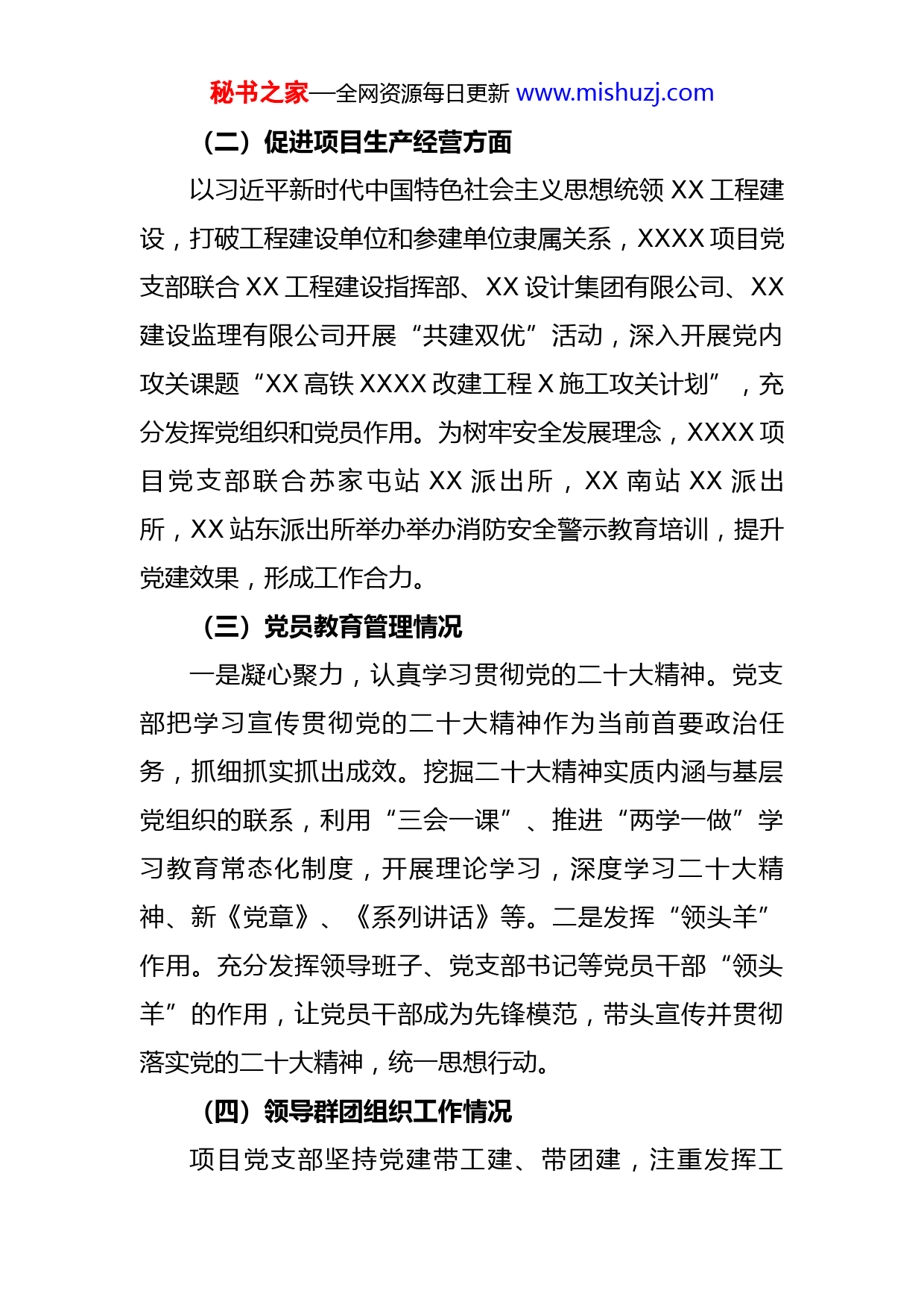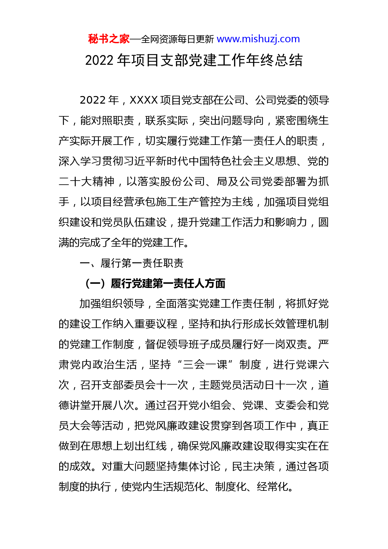 秘书之家—全网资源每日更新www.mishuzj.com2022年项目支部党建工作年终总结2022年,XXXX项目党支部在公司、公司党委的领导下,能对照职责,联系实际,突出问题导向,紧密围绕生产实际开展工作,切实履行党建工作第一责任人的职责,深入学习贯彻习近平新时代中国特色社会主义思想、党的二十大精神,以落实股份公司、局及公司党委部署为抓手,以项目经营承包施工生产管控为主线,加强项目党组织建设和党员队伍建设,提升党建工作活力和影响力,圆满的完成了全年的党建工作。一、履行第一责任职责(一)履行党建第一责任人方面加强组织领导,全面落实党建工作责任制,将抓好党的建设工作纳入重要议程,坚持和执行形成长效管理机制的党建工作制度,督促领导班子成员履行好一岗双责。严肃党内政治生活,坚持“三会一课”制度,进行党课六次,召开支部委员会十一次,主题党员活动日十一次,道德讲堂开展八次。通过召开党小组会、党课、支委会和党员大会等活动,把党风廉政建设贯穿到各项工作中,真正做到在思想上划出红线,确保党风廉政建设取得实实在在的成效。对重大问题坚持集体讨论,民主决策,通过各项制度的执行,使党内生活规范化、制度化、经常化。秘书之家—全网资源每日更新www.mishuzj.com(二)促进项目生产经营方面以习近平新时代中国特色社会主义思想统领XX工程建设,打破工程建设单位和参建单位隶属关系,XXXX项目党支部联合XX工程建设指挥部、XX设计集团有限公司、XX建设监理有限公司开展“共建双优”活动,深入开展党内攻关课题“XX高铁XXXX改建工程X施工攻关计划”,充分发挥党组织和党员作用。为树牢安全发展理念,XXXX项目党支部联合苏家屯站XX派出所,XX南站XX派出所,XX站东派出所举办举办消防安全警示教育培训,提升党建效果,形成工作合力。(三)党员教育管理情况一是凝心聚力,认真学习贯彻党的二十大精神。党支部把学习宣传贯彻党的二十大精神作为当前首要政治任务,抓细抓实抓出成效。挖掘二十大精神实质内涵与基层党组织的联系,利用“三会一课”、推进“两学一做”学习教育常态化制度,开展理论学习,深度学习二十大精神、新《党章》、《系列讲话》等。二是发挥“领头羊”作用。充分发挥领导班子、党支部书记等党员干部“领头羊”的作用,让党员干部成为先锋模范,带头宣传并贯彻落实党的二十大精神,统一思想行动。(四)领导群团组织工作情况项目党支部坚持党建带工建、带团建,注重发挥工秘书之家—全网资源每日更新www.mishuzj.com会、共青团组织的作用。XXXX党支部党员和青年团员开展了“争做党员先锋,义务清扫村落”的服务群众活动。进一步增强了项目党支部与街道群众的凝聚力和团结感,真正践行了央企的社会责任。“十一”期间,党支部和工会积极分子开展多项文体活动,活跃项目部文化氛围,增强集体凝聚力,达到了预期的目的,收到了良好的效果。二、全面推进从严治党向纵深发展,巩固风清气正的政治生态(一)高度重视党风廉政建设党支部认真执行党风廉政建设,严格落实“两个责任”,班子成员认真履行“一岗双责”,严格遵守廉洁自律的准则,认真落实中央“八项规定”、局和公司“三十二条具体规定”,严格遵守《中国共产党廉洁自律准则》和《中国共产党纪律处分条例》,始终保持共产党人的本色。在反腐倡廉学习方面,不断加强自身修养,严格遵守各项规章制度,做到以大局和单位利益为重。(二)扎实做好重点领域廉政风险防控工作定期梳理排查本单位重点岗位廉政风险点,分类制定和完善了防控方案,推进廉政风险防控工作长效机制建设。严格落实民主集中制中制,进一步规范“三重一大”决策议事程序,规范权力运行,建立了突发事件应急管理机制,不断提高了对突发事件快速准确的处置能力。秘书之家—全网资源每日更新www.mishuzj.com三、落实主体责任清单强化意识形态工作(一)思想高度统一,责任分工明确意识形态工作方面,在党支部的领导下,班子成员能够根据意识形态工作职责分工,按照“一岗双责”要求,全年在意识形态工作方面未发生任何问题。在形势任务教育方面,把抓好形势任务教育放在思想政治工作首位,通过专题会议、道德讲堂、“三会一课”等多种形式,以及宣传栏、微信等平台和载体,对局、公司的重要会议精神进行再传达。全年共发布公众号15篇,全方位展示职工良好的精神面貌,省部级媒体及中央级媒体均有报道。(二)加强思想引领,深化理想信念教育扎实开展党史学习教育、“不忘初心、牢记使命”主题教育、“二十大学习专题教育”。将意识形态工作纳入党支部支委会学习、党员干部培训的重要内容。教育广大党员做到“四讲四有”即讲政治、有信念,讲规矩、有纪律,讲道德、有品行,讲奉献、有作为。加强支部理论学习,示范引领学习习近平总书记系列重要讲话精神,学习党章党规,学习中国特色社会主义理论体系。将意识形态工作纳入党建、党风廉政建设和干部职工年度岗位责任制考核范围,坚决守好用好意识形态阵地,加强对意识形态工作的领导、检查和考核。(三)深入调查研究,及时掌握思想动态秘书之家—全网资源每日更新www.mishuzj.com积极开展调查研究,及时了解掌握职工的思想动态,解决问题,化解矛盾。把落实党支部关于意识形态工作决策部署情