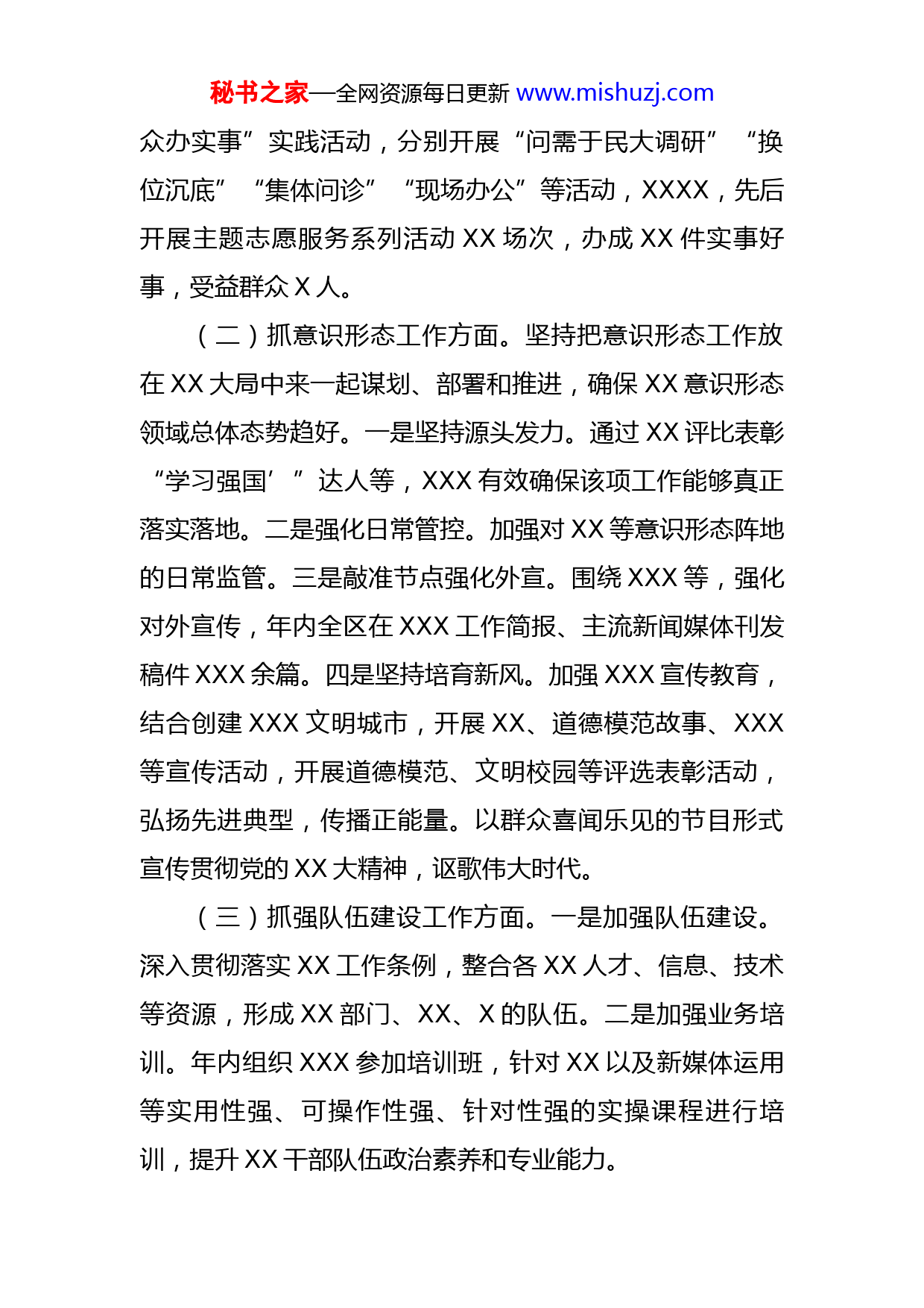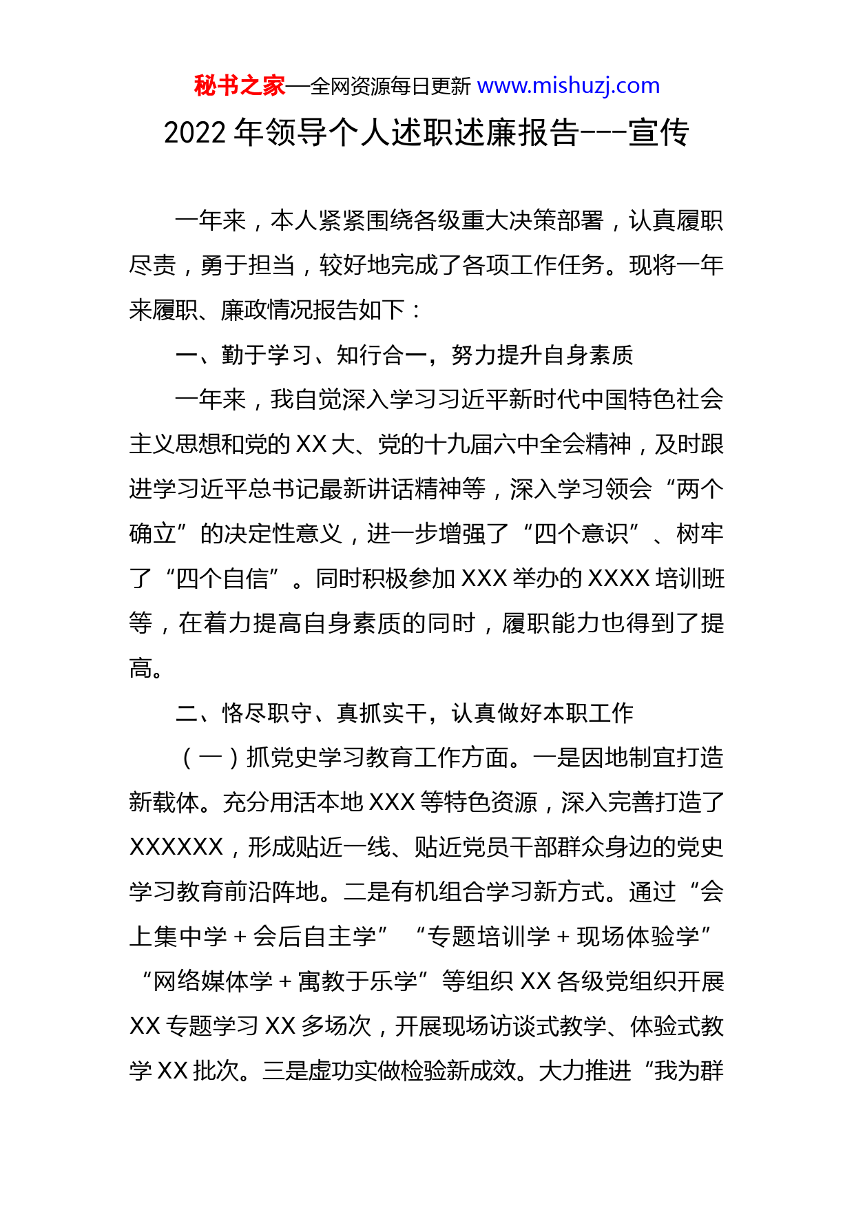 秘书之家—全网资源每日更新www.mishuzj.com2022年领导个人述职述廉报告---宣传一年来,本人紧紧围绕各级重大决策部署,认真履职尽责,勇于担当,较好地完成了各项工作任务。现将一年来履职、廉政情况报告如下:一、勤于学习、知行合一,努力提升自身素质一年来,我自觉深入学习习近平新时代中国特色社会主义思想和党的XX大、党的十九届六中全会精神,及时跟进学习近平总书记最新讲话精神等,深入学习领会“两个确立”的决定性意义,进一步增强了“四个意识”、树牢了“四个自信”。同时积极参加XXX举办的XXXX培训班等,在着力提高自身素质的同时,履职能力也得到了提高。二、恪尽职守、真抓实干,认真做好本职工作(一)抓党史学习教育工作方面。一是因地制宜打造新载体。充分用活本地XXX等特色资源,深入完善打造了XXXXXX,形成贴近一线、贴近党员干部群众身边的党史学习教育前沿阵地。二是有机组合学习新方式。通过“会上集中学+会后自主学”“专题培训学+现场体验学”“网络媒体学+寓教于乐学”等组织XX各级党组织开展XX专题学习XX多场次,开展现场访谈式教学、体验式教学XX批次。三是虚功实做检验新成效。大力推进“我为群秘书之家—全网资源每日更新www.mishuzj.com众办实事”实践活动,分别开展“问需于民大调研”“换位沉底”“集体问诊”“现场办公”等活动,XXXX,先后开展主题志愿服务系列活动XX场次,办成XX件实事好事,受益群众X人。(二)抓意识形态工作方面。坚持把意识形态工作放在XX大局中来一起谋划、部署和推进,确保XX意识形态领域总体态势趋好。一是坚持源头发力。通过XX评比表彰“学习强国’”达人等,XXX有效确保该项工作能够真正落实落地。二是强化日常管控。加强对XX等意识形态阵地的日常监管。三是敲准节点强化外宣。围绕XXX等,强化对外宣传,年内全区在XXX工作简报、主流新闻媒体刊发稿件XXX余篇。四是坚持培育新风。加强XXX宣传教育,结合创建XXX文明城市,开展XX、道德模范故事、XXX等宣传活动,开展道德模范、文明校园等评选表彰活动,弘扬先进典型,传播正能量。以群众喜闻乐见的节目形式宣传贯彻党的XX大精神,讴歌伟大时代。(三)抓强队伍建设工作方面。一是加强队伍建设。深入贯彻落实XX工作条例,整合各XX人才、信息、技术等资源,形成XX部门、XX、X的队伍。二是加强业务培训。年内组织XXX参加培训班,针对XX以及新媒体运用等实用性强、可操作性强、针对性强的实操课程进行培训,提升XX干部队伍政治素养和专业能力。秘书之家—全网资源每日更新www.mishuzj.com(四)抓XXX工作方面。根据XX工作安排,由我牵头负责XXX考核指标。一是XXX。二是XXX。三是XXX三、绷紧底线、严于律已,树立务实廉洁形象本人自觉落实中央“八项规定”,认真学习并严格遵守《中国共产党纪律处分条例》等党内法规及制度规定,积极参加警示教育,严格落实领导干部办公用房标准,严格按照规定使用公务用车,不存在违反规定收送礼金、公务宴请活动有关规定,不存在利用名贵特产类特殊资源谋取私利的情况,年内没有被巡视组约谈和群众反映问题的情况。一年来,本人切实把党风廉政建设同分管工作同部署、同检查、同考核。回顾一年来的工作,深感与组织的期望还有差距,我将进一步解放思想、忠诚履职,积极努力提升自己的综合素质,为XXX各项发展作出自己应有的贡献。
