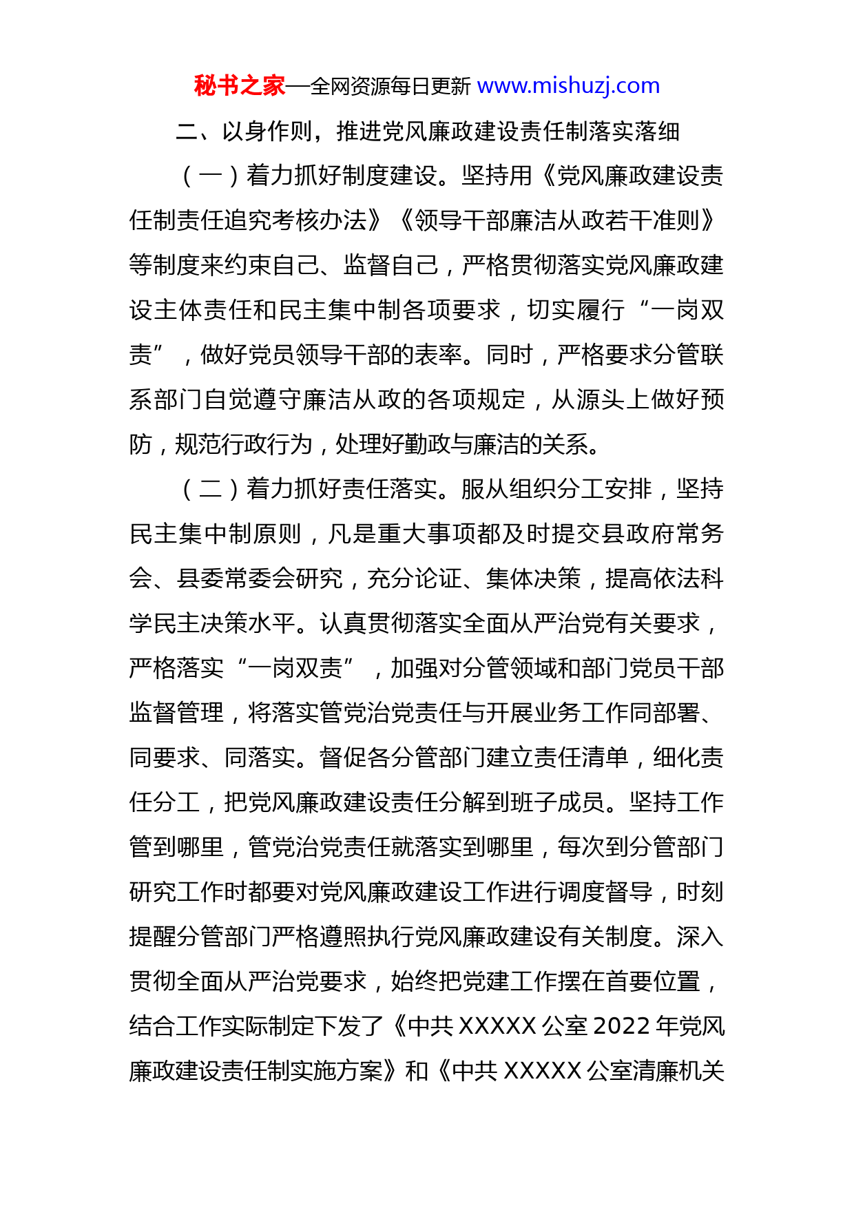 秘书之家—全网资源每日更新www.mishuzj.com2022年领导干部履行党风廉政建设责任制情况报告今年以来,我严格执行党风廉政建设责任制有关规定,认真落实“第一责任人”的职责,坚持做到“一岗双责”,牢固树立抓党风廉政建设责任制的政治责任意识,紧扣工作实际,认真组织领导,狠抓部署落实,把党风廉政建设工作贯穿到各项工作中抓牢抓实,现将有关情况报告如下:一、加强学习,切实提高对党风廉政建设的思想认识通过个人自学、参加理论中心组集中学习、组织召开干部职工会、主题党日活动等形式,深入学习贯彻习近平新时代中国特色社会主义思想,特别是习近平关于全面从严治党系列重要讲话,认真组织学习《党章》《中国共产党党内监督条例》《中国共产党廉洁自律准则》《中国共产党纪律处分条例》《关于新形势下党内政治生活的若干准则》等党内法规以及纪委全会精神,把全面从严治党的新要求贯彻落实到工作全过程,确保党风廉政建设和反腐败斗争各项工作的正确政治立场、政治方向,让全体党员干部明德守纪,筑牢党纪国法纪律防线。今年以来,共召开党员学习会XX次,讲授专题党课XX次,开展主题党日活动XX次,开展警示教育X次。秘书之家—全网资源每日更新www.mishuzj.com二、以身作则,推进党风廉政建设责任制落实落细(一)着力抓好制度建设。坚持用《党风廉政建设责任制责任追究考核办法》《领导干部廉洁从政若干准则》等制度来约束自己、监督自己,严格贯彻落实党风廉政建设主体责任和民主集中制各项要求,切实履行“一岗双责”,做好党员领导干部的表率。同时,严格要求分管联系部门自觉遵守廉洁从政的各项规定,从源头上做好预防,规范行政行为,处理好勤政与廉洁的关系。(二)着力抓好责任落实。服从组织分工安排,坚持民主集中制原则,凡是重大事项都及时提交县政府常务会、县委常委会研究,充分论证、集体决策,提高依法科学民主决策水平。认真贯彻落实全面从严治党有关要求,严格落实“一岗双责”,加强对分管领域和部门党员干部监督管理,将落实管党治党责任与开展业务工作同部署、同要求、同落实。督促各分管部门建立责任清单,细化责任分工,把党风廉政建设责任分解到班子成员。坚持工作管到哪里,管党治党责任就落实到哪里,每次到分管部门研究工作时都要对党风廉政建设工作进行调度督导,时刻提醒分管部门严格遵照执行党风廉政建设有关制度。深入贯彻全面从严治党要求,始终把党建工作摆在首要位置,结合工作实际制定下发了《中共XXXXX公室2022年党风廉政建设责任制实施方案》和《中共XXXXX公室清廉机关秘书之家—全网资源每日更新www.mishuzj.com建设实施方案》,自觉履行党风廉政建设“一岗双责”,自觉强化班子成员团结意识,带头执行民主集中制,提高班子的整体战斗力、凝聚力,切实提高办公室“三服务”水平。精简文件和会议,严格控制发文数量和篇幅,严格控制会议活动规格和规模,不断改进文风、会风以及工作作风,紧紧围绕上级党委和县委的中心工作,扎实开展督查检查。(三)着力抓好作风建设。在工作和生活中,率先垂范,以身作则,带头转变作风、弘扬正气,在广大领导干部中树立了“维护大局、团结和谐,奋发进取、争创一流,清正廉洁、依法办事,为民务实、真抓实干”的良好风气。坚持公道正派、胸怀豁达,始终倡导并自觉做到共事坦诚,工作协调、相互配合。以政道德教育、党章党纪和法律法规教育为重点,定期开展廉政警示教育,组织道德讲堂X期,学习了云南省文山州广南县原县委常委、原常务副县长XXX严重违纪违法典型案例,做到经常讲、常提醒、警钟长鸣,提高党员干部岗位廉政风险防范意识,使全体干部心往一处想、劲往一处使,推动XXX公室各项工作高效运转。(四)着力抓好风险防控。坚持把落实党风廉政建设责任制作为优化工作环境、加强机关效能建设的一项重要工作,深入抓好作风革命效能革命,严格对照党章、对照秘书之家—全网资源每日更新www.mishuzj.com廉政准则、对照改进作风要求、对照人民群众要求,主动排查存在问题,切实抓好存在问题的整改落实,着力加强党员干部党性作风修养和作风锤炼,确保县委各项决策部署不折不扣地得到贯彻执行。围绕党员干部履行“一岗双责”、廉洁自律和思想作风等情况开展“一对一”交心谈心和廉政谈话,给党员干部职工敲警钟、打预防针、注强心剂,进一步筑牢党员干部职工拒腐防变的思想防线,提高履职尽责、廉洁守法的责任意识,今年以来,与班子成员和分管联系部门负责人谈心谈话X次,开展廉政谈话X次。三、强化自觉,积极支持配合驻XX纪检组工作高度重视和支持驻XX纪检组工作,定期听取纪检组工作情况汇报,XXX领导班子和全体干部职工自觉接受纪检组的全过程监督,主动与驻XXX纪检组就如何进一步开展好落实党风廉政建设责任制和履行“一岗双责”等重点工作征求意见、建议,并在干部选拔任用、人员选调以及评先评优等方面,主动征求纪检组意见,确保纪检组监察覆盖所有重大事项、廉政风险点,不断提升全体干部的廉政意识,建设一支清正廉洁、作风过硬的办公室队伍。在履行党风廉政建设责任制过程中,虽然取得了一定成效,但仍存在一些不足:一是对党要管党从严治党的紧迫性、重要性认识还有差距,存在一定的老好