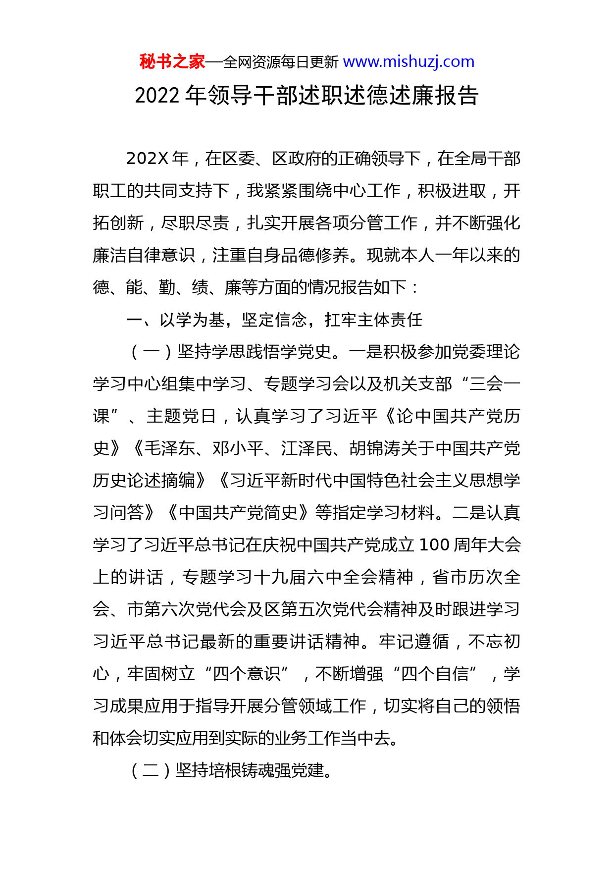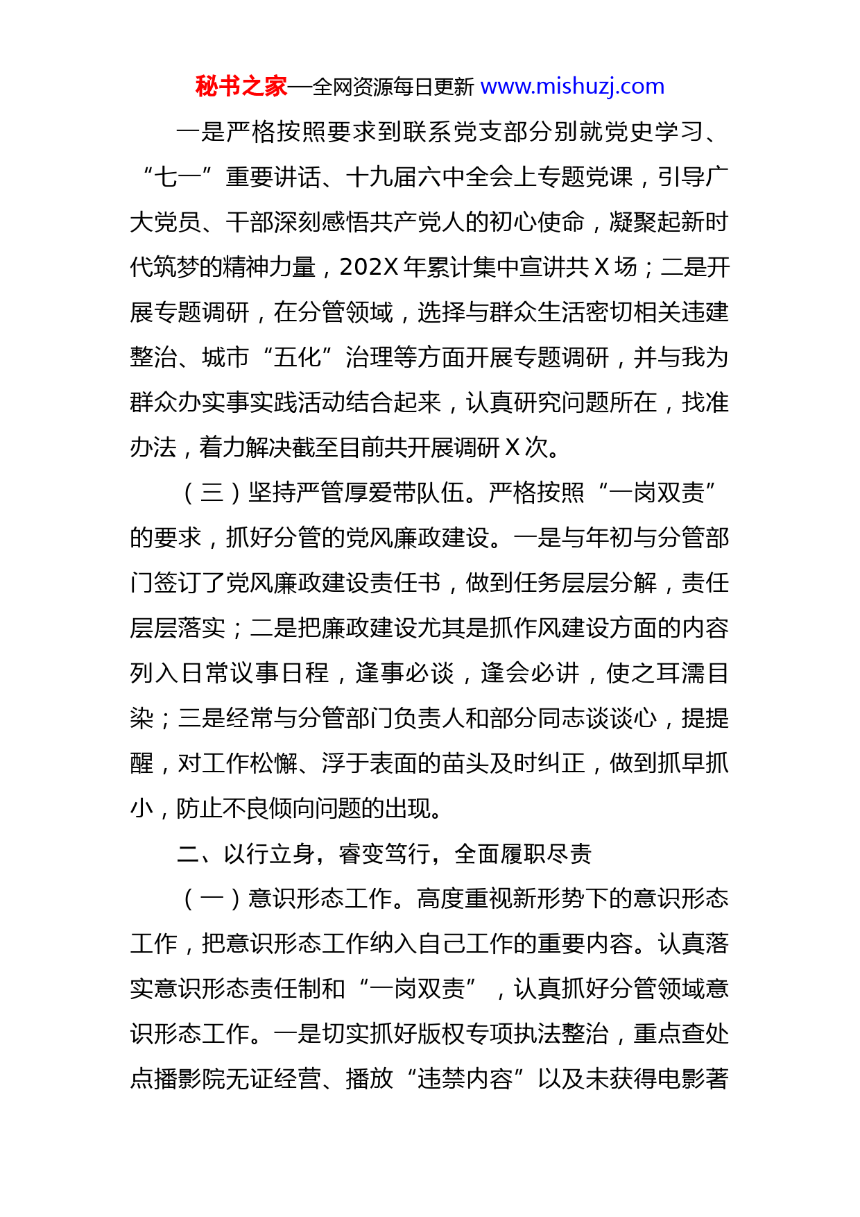 秘书之家—全网资源每日更新www.mishuzj.com2022年领导干部述职述德述廉报告202X年,在区委、区政府的正确领导下,在全局干部职工的共同支持下,我紧紧围绕中心工作,积极进取,开拓创新,尽职尽责,扎实开展各项分管工作,并不断强化廉洁自律意识,注重自身品德修养。现就本人一年以来的德、能、勤、绩、廉等方面的情况报告如下:一、以学为基,坚定信念,扛牢主体责任(一)坚持学思践悟学党史。一是积极参加党委理论学习中心组集中学习、专题学习会以及机关支部“三会一课”、主题党日,认真学习了习近平《论中国共产党历史》《毛泽东、邓小平、江泽民、胡锦涛关于中国共产党历史论述摘编》《习近平新时代中国特色社会主义思想学习问答》《中国共产党简史》等指定学习材料。二是认真学习了习近平总书记在庆祝中国共产党成立100周年大会上的讲话,专题学习十九届六中全会精神,省市历次全会、市第六次党代会及区第五次党代会精神及时跟进学习习近平总书记最新的重要讲话精神。牢记遵循,不忘初心,牢固树立“四个意识”,不断增强“四个自信”,学习成果应用于指导开展分管领域工作,切实将自己的领悟和体会切实应用到实际的业务工作当中去。(二)坚持培根铸魂强党建。秘书之家—全网资源每日更新www.mishuzj.com一是严格按照要求到联系党支部分别就党史学习、“七一”重要讲话、十九届六中全会上专题党课,引导广大党员、干部深刻感悟共产党人的初心使命,凝聚起新时代筑梦的精神力量,202X年累计集中宣讲共X场;二是开展专题调研,在分管领域,选择与群众生活密切相关违建整治、城市“五化”治理等方面开展专题调研,并与我为群众办实事实践活动结合起来,认真研究问题所在,找准办法,着力解决截至目前共开展调研X次。(三)坚持严管厚爱带队伍。严格按照“一岗双责”的要求,抓好分管的党风廉政建设。一是与年初与分管部门签订了党风廉政建设责任书,做到任务层层分解,责任层层落实;二是把廉政建设尤其是抓作风建设方面的内容列入日常议事日程,逢事必谈,逢会必讲,使之耳濡目染;三是经常与分管部门负责人和部分同志谈谈心,提提醒,对工作松懈、浮于表面的苗头及时纠正,做到抓早抓小,防止不良倾向问题的出现。二、以行立身,睿变笃行,全面履职尽责(一)意识形态工作。高度重视新形势下的意识形态工作,把意识形态工作纳入自己工作的重要内容。认真落实意识形态责任制和“一岗双责”,认真抓好分管领域意识形态工作。一是切实抓好版权专项执法整治,重点查处点播影院无证经营、播放“违禁内容”以及未获得电影著秘书之家—全网资源每日更新www.mishuzj.com作权人的授权擅自播放电影的违法行为。所分管的文旅大队共计检查点播影院X家次,成功查处X例点播影院无证经营、X例未经著作权人许可,复制、放映、通过信息网络向公众传播其作品案件;二是抓好网络执法专项整治工作,开展网络文化市场执法检查X次,排查企业网站X家、微信公众号X个,发现涉嫌违规问题X个,文旅大队成功查处首例网站音频节目中含有违背社会公德等禁止内容的案件。2021年共计开展扫黄打非执法检查X次,检查市场主体X家次,有效维护了文化和意识形态安全。(二)疫情防控工作。为确保辖区居民生产生活平稳有序,以市场领域哄抬物价、产品质量安全为重点,认真抓好行政执法工作。防控期间,我所分管的市场大队共出动检查人员X人次,车辆X辆次,检查药品药械经营单位X家次,检查综合商超、农贸市场、餐饮单位等经营主体X家次,检查其他行业X家次,屠宰场X家次;检查医院、诊所、社区卫生服务中心、美容机构X家次。对疫情防控期间发现的违法线索第一时间进行查处,共计立案X起,及时将违法苗头消灭在萌芽状态,全力保障市场秩序稳定。(三)信访维稳工作。制定《庆祝中国共产党成立100周年期间X区X局信访维稳工作方案》,把各项任务逐一分解、细化,明确具体责任领导和责任人,组织开展秘书之家—全网资源每日更新www.mishuzj.com“横到边、纵到底”的矛盾纠纷和重大风险大排查,争取把矛盾问题解决在基层,对自行排查出来涉及本行业领域内矛盾纠纷信访问题进行及时研判,积极配合属地做好稳控措施。对市局和区级交办涉及我局的信访事项,做进一步责任分解,由具体责任单位抓好工作落实,落实“七个一”包保化解责任制,全力做好化解工作。今年以来,接到上级转交办信访件X件,其中已处理完毕X件,X件还在处理中。(四)禁毒工作。一是高度重视,狠抓落实。在党委会专题安排部署禁毒工作X次,依照《禁毒重点整治工作方案》《20XX年创建省级禁毒示范区工作方案》《20XX年毒品预防宣传教育工作方案》等方案,明确任务清单及责任单位,层层压实责任,强力推动工作落到实处。二是督促法制股、各分管大队统筹抓好禁毒排查工作,在执法检查、案件办理中,深入娱乐场所、商铺、煤矿等开展涉毒违法犯罪排查工作;深入田间地块、房前屋后开展禁种铲毒踏查工作,严格落实禁种铲毒工作责任制,强化禁种铲毒精细化管控,同时在踏查过程中加大相关法律法规的宣传力度。三是要求全面落实禁毒宣传工作,结合日常巡查、执法检查等形式,利用春节期间农民工返乡、乡镇赶集、3月15日消费者权益日、虎门销烟纪念日等契机,在广场、车站、居