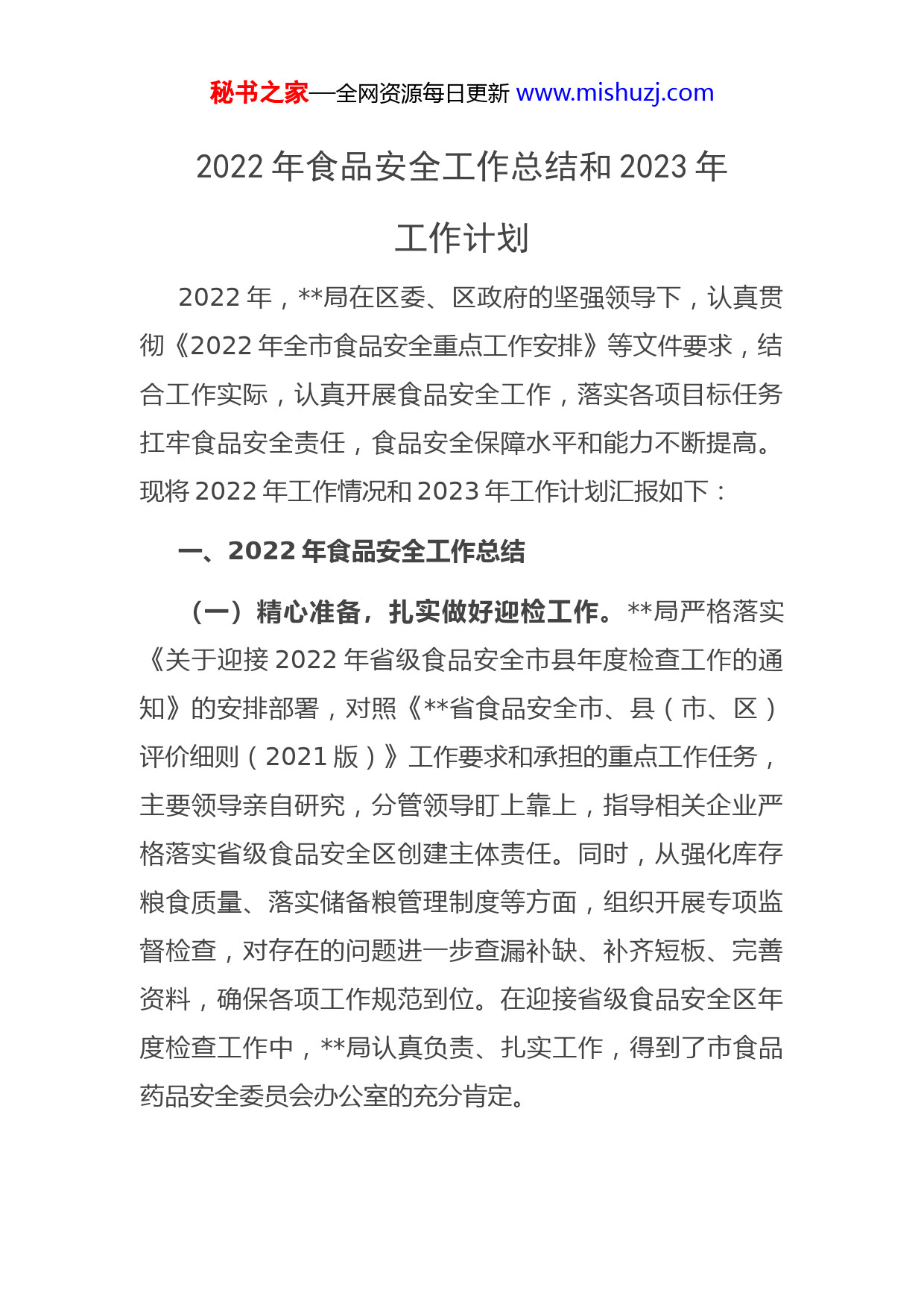 秘书之家—全网资源每日更新www.mishuzj.com2022年食品安全工作总结和2023年工作计划2022年,局在区委、区政府的坚强领导下,认真贯彻《2022年全市食品安全重点工作安排》等文件要求,结合工作实际,认真开展食品安全工作,落实各项目标任务扛牢食品安全责任,食品安全保障水平和能力不断提高。现将2022年工作情况和2023年工作计划汇报如下:一、2022年食品安全工作总结(一)精心准备,扎实做好迎检工作。局严格落实《关于迎接2022年省级食品安全市县年度检查工作的通知》的安排部署,对照《省食品安全市、县(市、区)评价细则(2021版)》工作要求和承担的重点工作任务,主要领导亲自研究,分管领导盯上靠上,指导相关企业严格落实省级食品安全区创建主体责任。同时,从强化库存粮食质量、落实储备粮管理制度等方面,组织开展专项监督检查,对存在的问题进一步查漏补缺、补齐短板、完善资料,确保各项工作规范到位。在迎接省级食品安全区年度检查工作中,局认真负责、扎实工作,得到了市食品药品安全委员会办公室的充分肯定。秘书之家—全网资源每日更新www.mishuzj.com(二)健全机制,持续规范工作行为。局根据《中华人民共和国食品安全法》《中华人民共和国农产品质量安全法》等有关规定要求,结合全区实际,制定出台了《实施方案》,从4个方面对超标粮食的界定、风险监测、处置方式和对违规收购储存、销售转化超标粮食的责任追究等工作进行了安排部署,进一步规范了超标粮食处置工作行为。对不符合食品安全标准的粮食,严格实行定向销售、定点收储、闭环处置等措施,坚决不能用作食用用途销售,有力保障了全区的粮食安全。(三)加强检测,严格把控质量关口。局严格执行国家粮食质量标准和食品安全标准,严把粮食收购、储存、销售出库质量安全关。认真落实行业监管责任,联合局,对地方储备粮进行了两次专项检查,督促各企业严格按照国家粮食质量标准存储粮食。定期开展粮食质量安全调查和品质测报工作,及时掌握全区粮食质量安全状况。截至目前,自行检测玉米样品份、小麦样品份,协助市检测中心扦样小麦份、玉米份,粮食质检能力持续增强。(四)广泛宣传,营造浓厚食安氛围。大力加强对机关干部、各粮食收储企业(库点)、应急粮油供应企业工作人员的培训学习,结合活动,制定学习计划,分批开展食品安全、业务知识等方面的培训,提高工作人员的能力秘书之家—全网资源每日更新www.mishuzj.com和水平。同时,指导各粮食收储企业(库点)、应急粮油供应企业等,通过悬挂宣传横幅、张贴宣传海报、电子显示屏幕滚动播放宣传标语等方式,持续加强食品安全法律法规、国家标准、科学知识的宣传教育,让粮食安全相关知识入脑入心,积极营造浓厚的食品安全氛围。二、存在的问题和不足一年来,局为扛牢食品安全责任,营造良好食品安全环境,做了大量工作,也取得了一定成绩,但对照先进和优秀,仍存在一些问题和不足,主要是:(一)专业水平不够高。随着人员变动、机构调整,加之部分人员年龄偏大等原因,导致有的从事质量监测工作的人员专业能力不够强、技术水平不够高,尤其是缺少高素质专业人才,一定程度上影响了质量监测的工作水平。(二)粮食质量安全监测水平还不够高。现有的粮食质量安全监测技术及信息网络监管手段先进程度不够,信息化监管设施设备配置不够齐全,导致监管效率不够高。三、2023年工作计划党的二十大报告中提出,要“全方位夯实粮食安全根基,全面落实粮食安全党政同责”“确保粮食、能源资源、重要产业链供应链安全”,为做好粮食安全各项工作进一步秘书之家—全网资源每日更新www.mishuzj.com指明了方向、明确了重点。接下来,局将牢牢把握二十大报告中提出的新思想、新判断、新部署、新要求,坚决扛牢粮食安全责任,全力做好食品安全工作。(一)加大培训力度。对质检人员进行质检操作技术培训,组织集中学习检测知识,提高检验人员的专业技术水平和能力,为从源头对粮食质量进行把关,守住质量安全红线打下良好的基础。(二)加强制度建设。积极支持以机构为主、各粮食收储企业内设质检机构为辅的粮油质检体系建设,不断提高检验检测范围和检测水平。(三)提高监测能力。充分发挥质检机构在粮食质量监管方面的技术支持和保障作用,及时对全区粮食质量进行安全调查、品质测报和监测,增强粮食质检能力,提升安全监管水平。